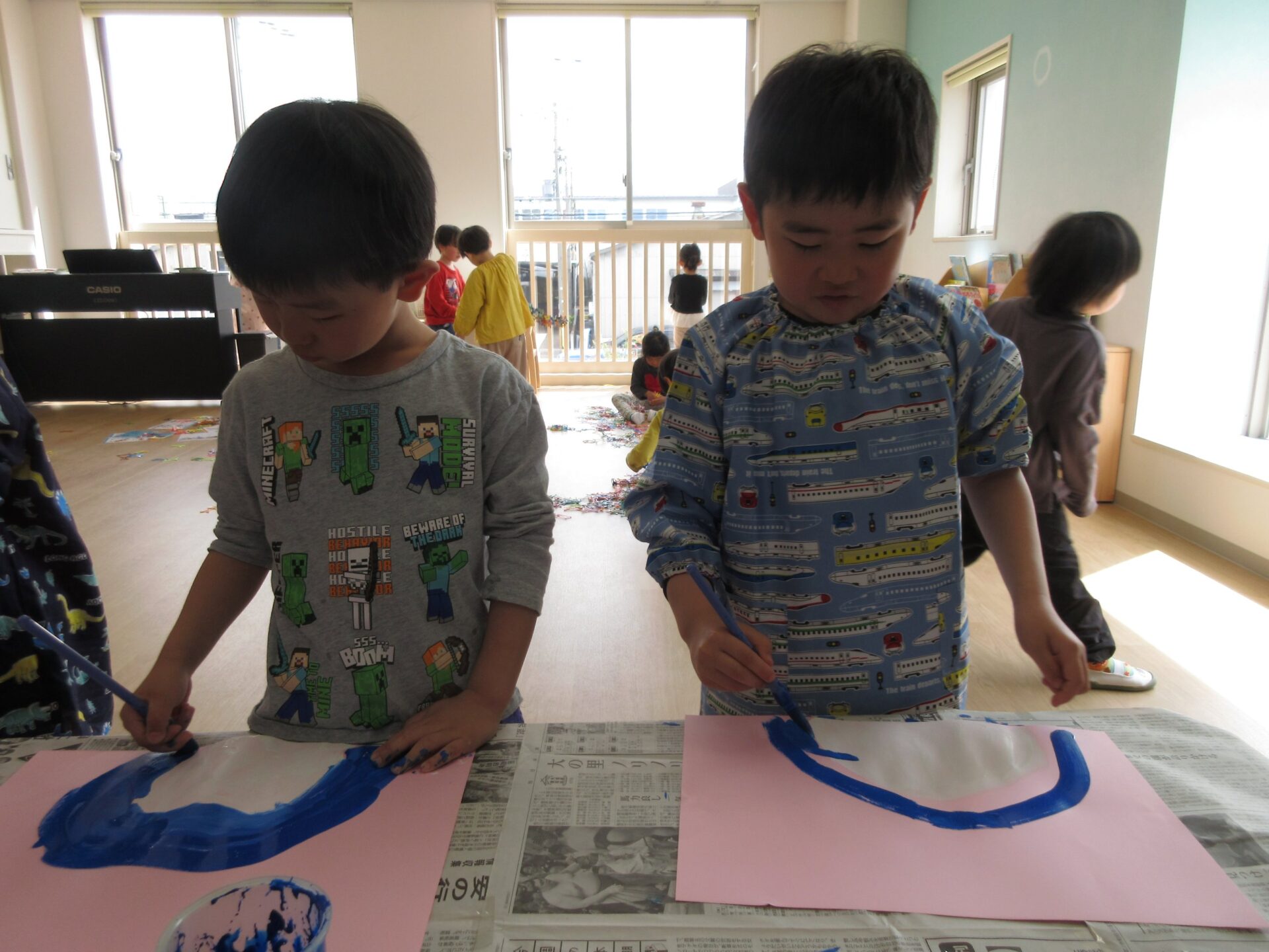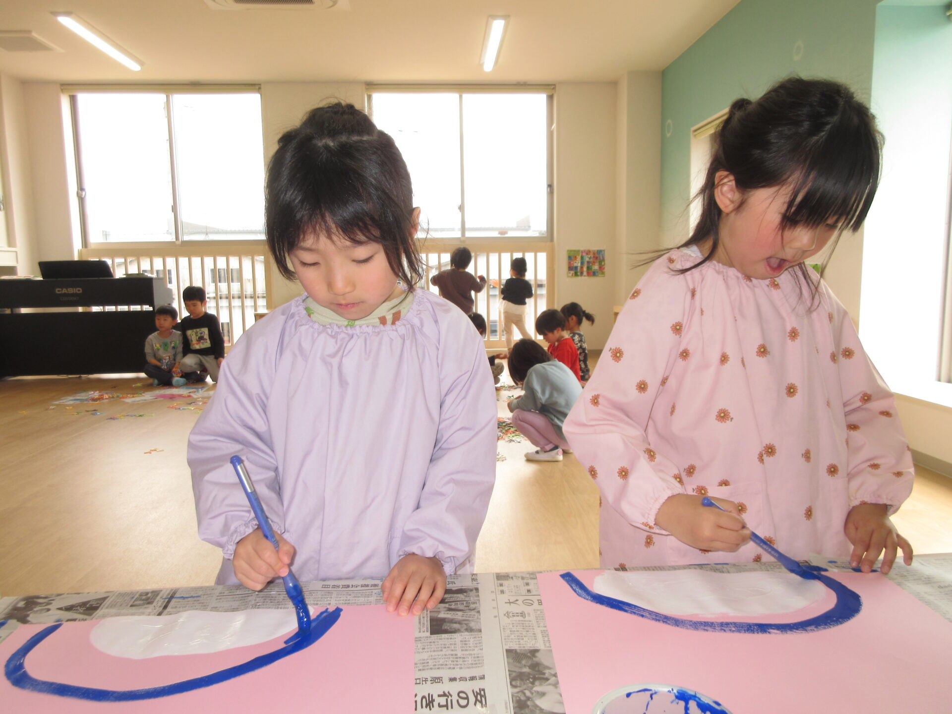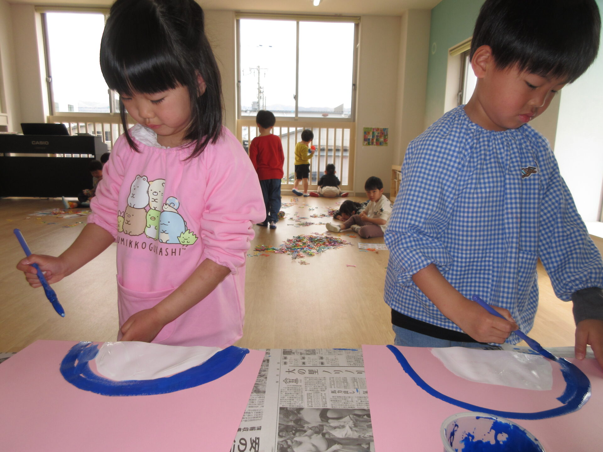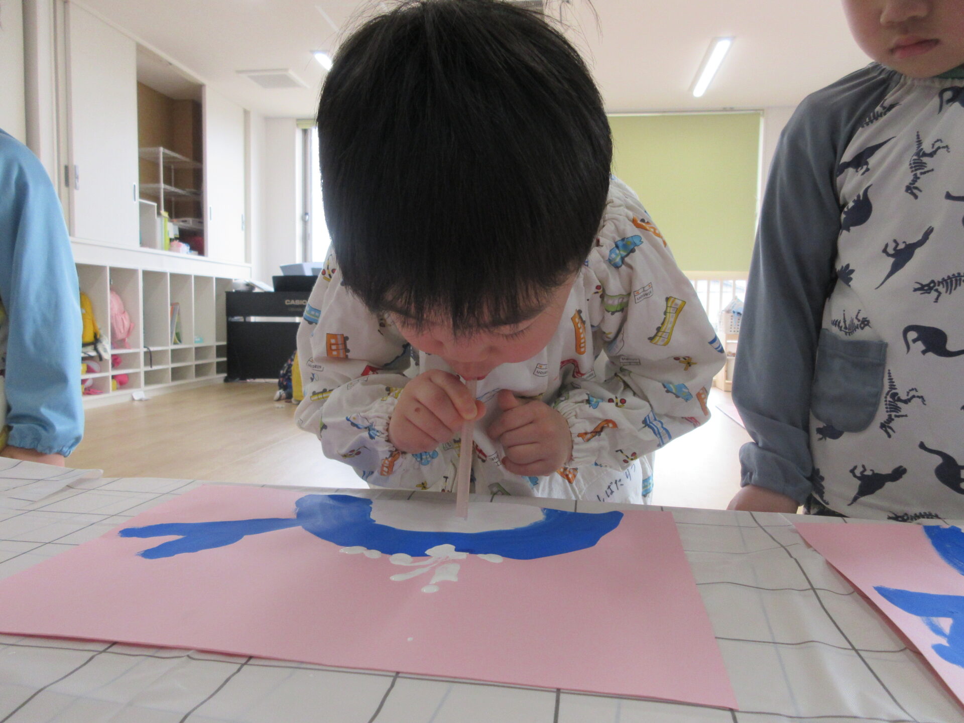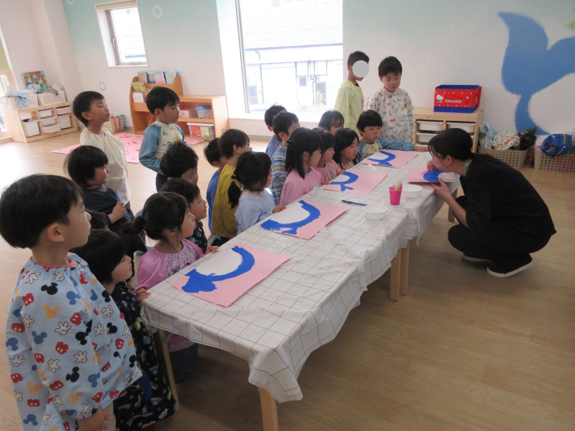 2025.04.25 お知らせ ブログ くじら組になったよ!(5歳 くじら組) 4月の製作は、進級した意味を込めて大きなくじらを絵の具で描きました! 絵具を塗ることはありましたが、今回は描くことに挑戦しました。 さすが!くじら組さん、はみ出すことなく、くじらを描いていますね! 白と青が混ざらないように丁寧に描いていきます✨ 次は、くじらの潮を吹き絵で表現していきます。先生にお手本を見せてもらったら… ふーっ!!!! さすがくじら組さん、上手です♪ この後、顔を描いたりキラキラの折り紙で飾り付けをして素敵な作品が出来上がりました! 4月、全員揃った日に写真を撮りました。これからくじら組の楽しい思い出をたくさん作ろうね! 一覧へ戻る