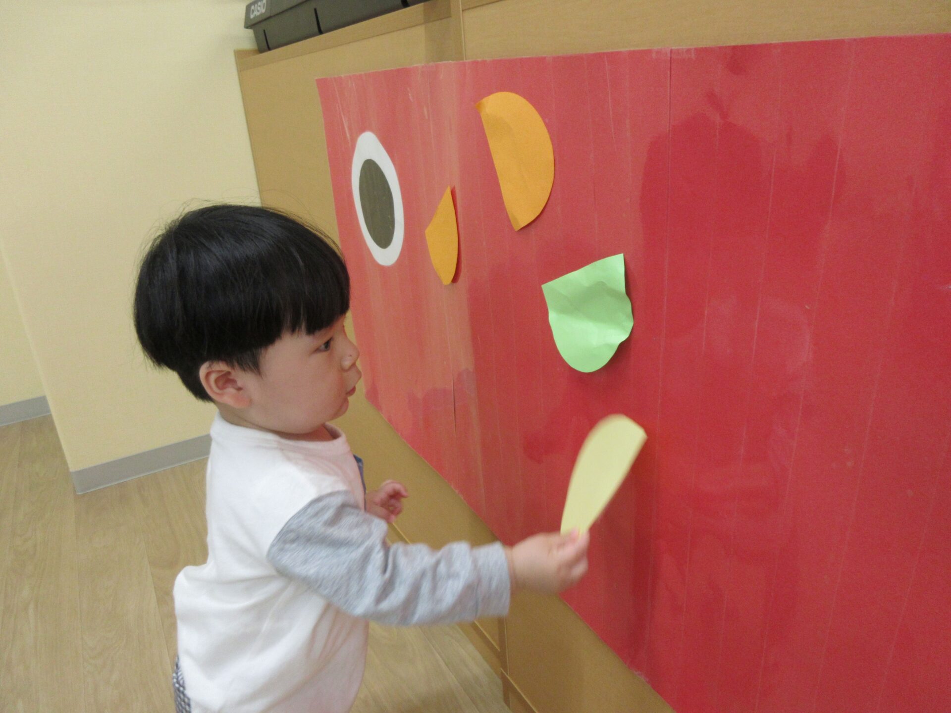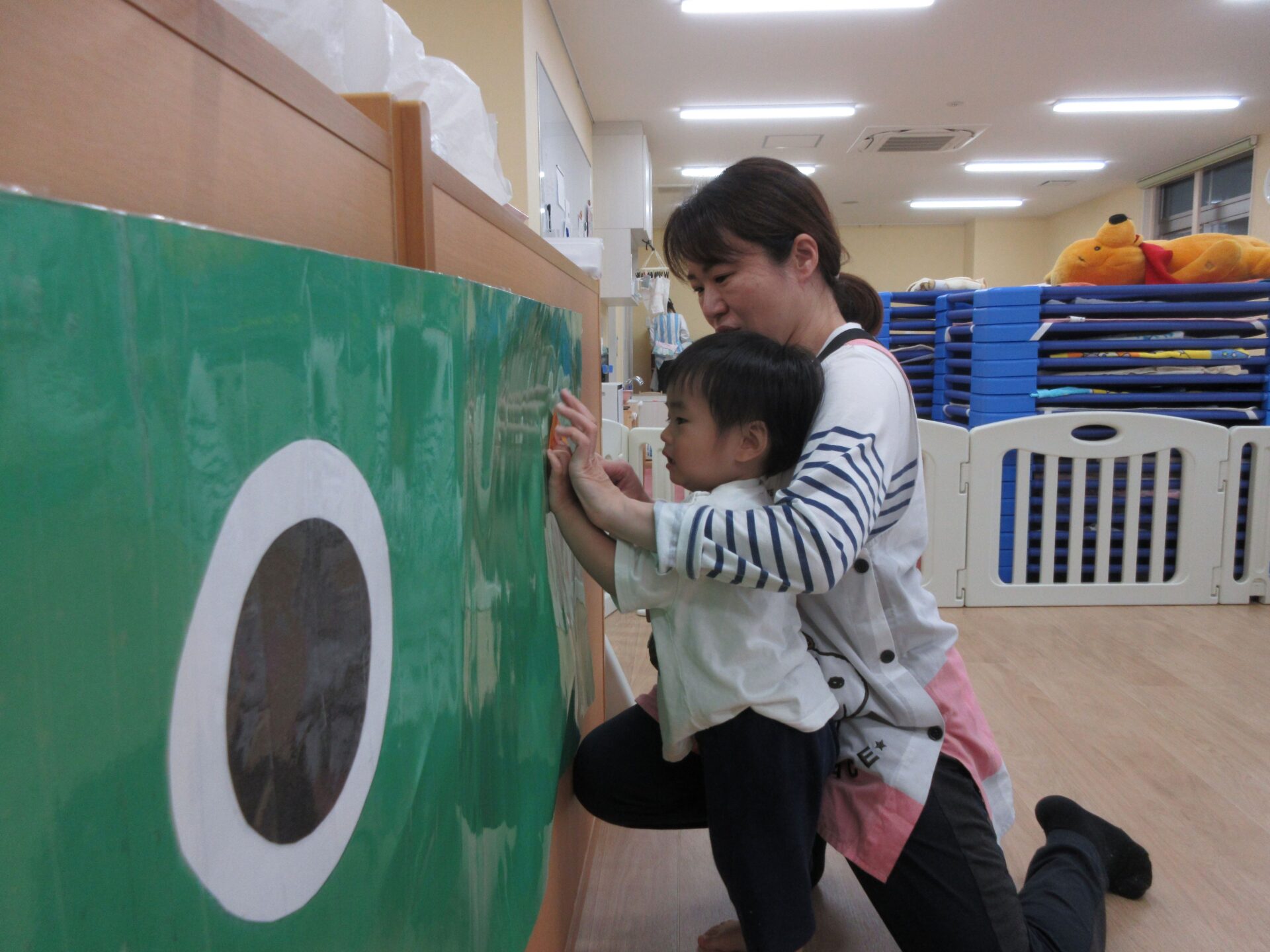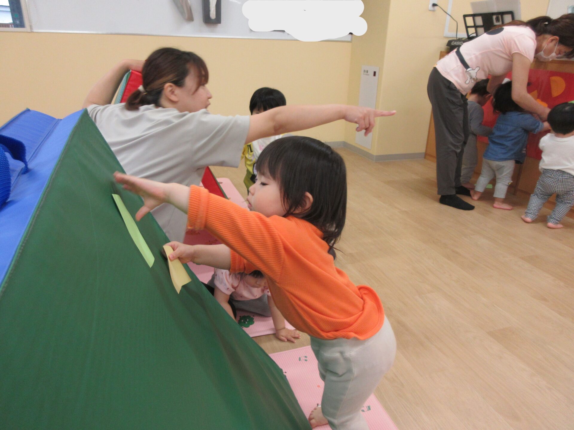2025.05.09 お知らせ ブログ ぺたぺた♪こいのぼり(1歳だいち組) 5月2日 こどもの日にちなんで、大きなこいのぼりに画用紙のうろこを貼りました♪ お魚のお洋服、どこかな、どこかな‐~ ここじゃないな、、、 ここかな、、、 あった!そーっとはがして貼りに行くよ♪ 先生と一緒にぺったん! 1人でも上手に貼れたよ! 一覧へ戻る
