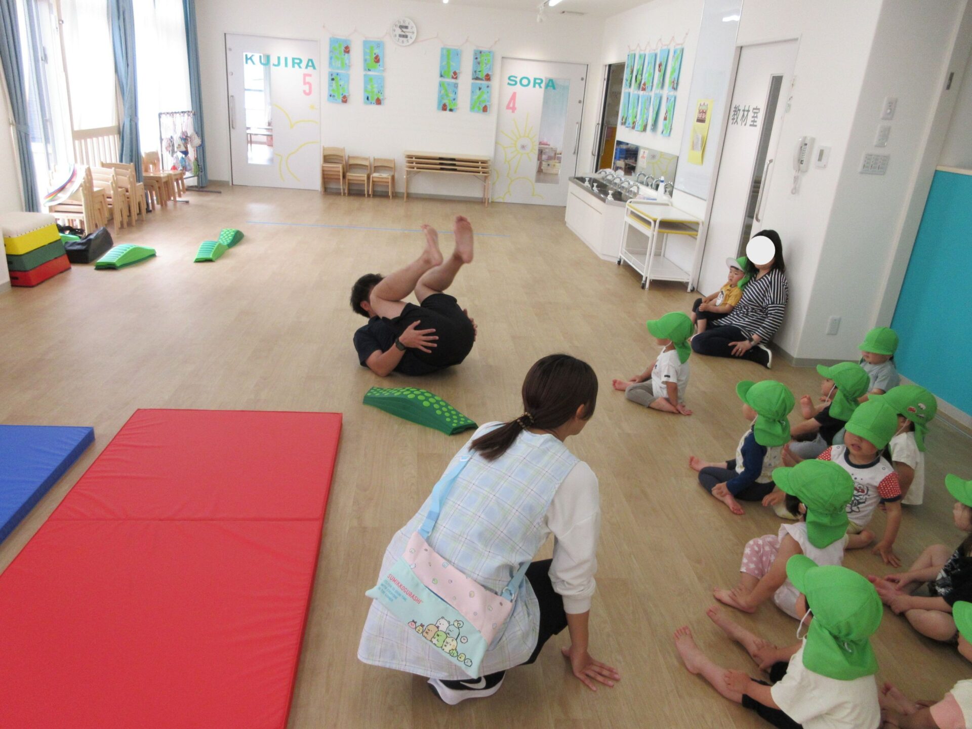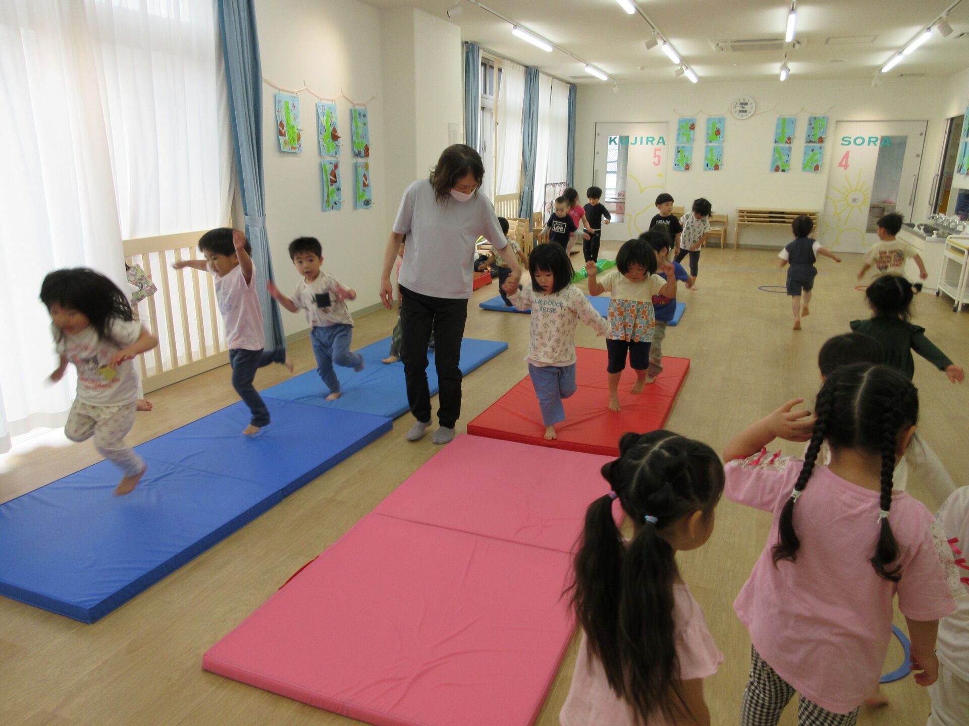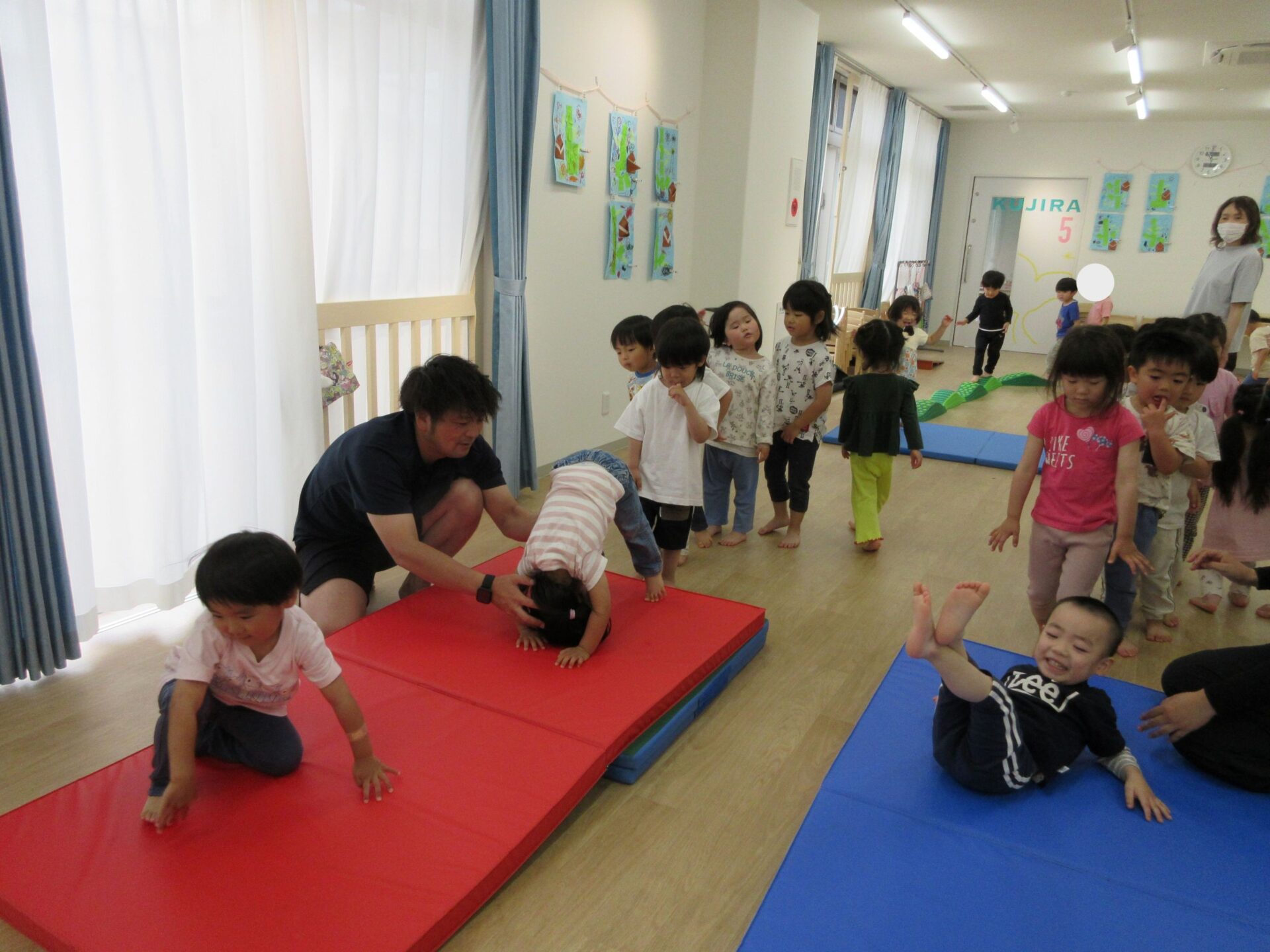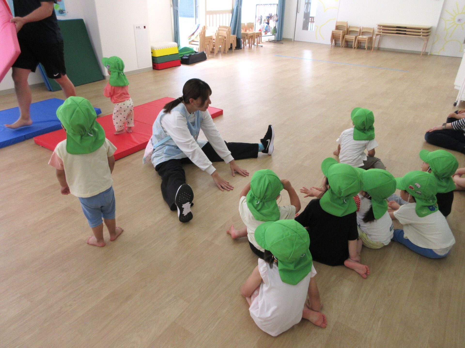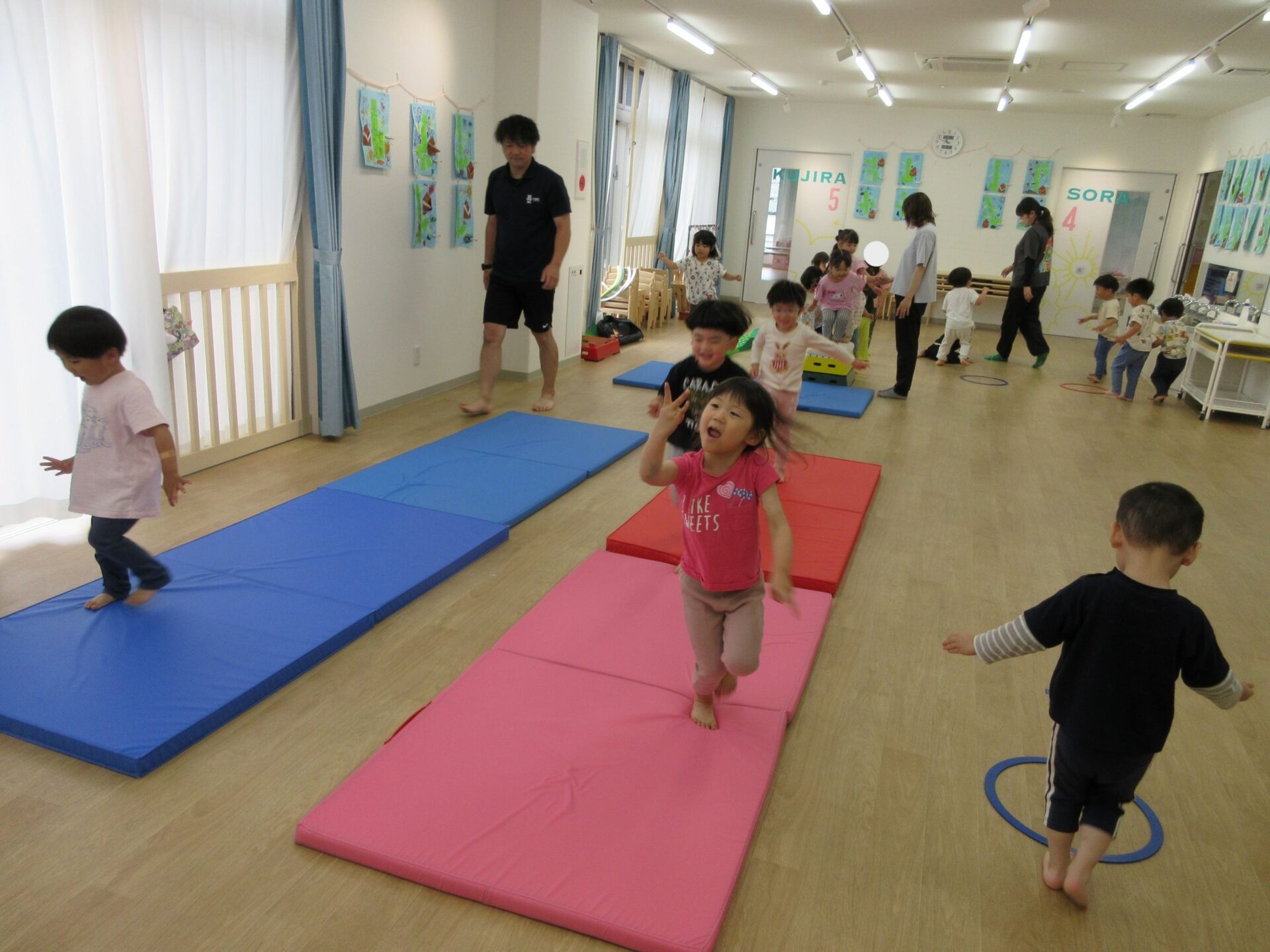 2025.05.26 お知らせ ブログ 運動あそび教室(2,3歳)でした 5月16日(金)、2階ランチルームで運動あそびをしました。 10時からは、2歳あめ組です。はじめは先生とストレッチ。 開脚のストレッチも。 ゴロンとでんぐり返り。 みんな上手にできていますね。 跳び箱からのジャンプや一本橋渡り。マットの上で、横に回りました。 それっ、ジャンプ! クマさん歩きもしましたよ。 10時半からは、3歳にじ組です。 元気いっぱい。 楽しんでいますね。 楽しみながら、いろいろな動きに挑戦です。 ジャンプ!! それっ! 運動の先生のお話も、しっかりと聞けていました。 お友だちのお手本も、しっかりと見て、拍手! そして、また再開。 手でうまくバランスをとって・・。 今日は前回りにも挑戦。 みんな楽しくできていましたね。 一覧へ戻る