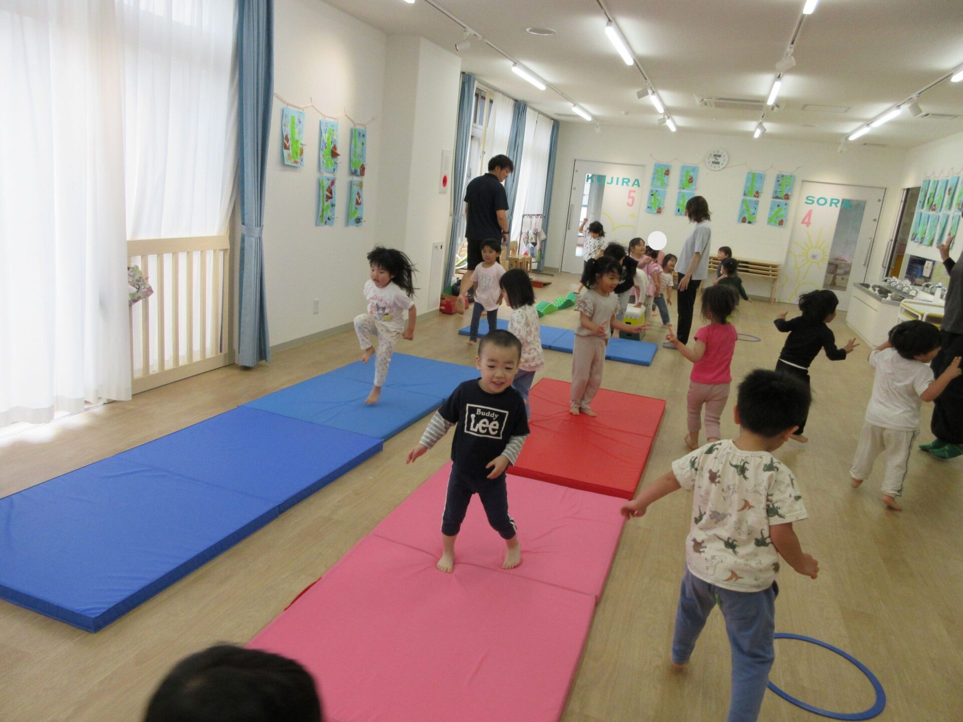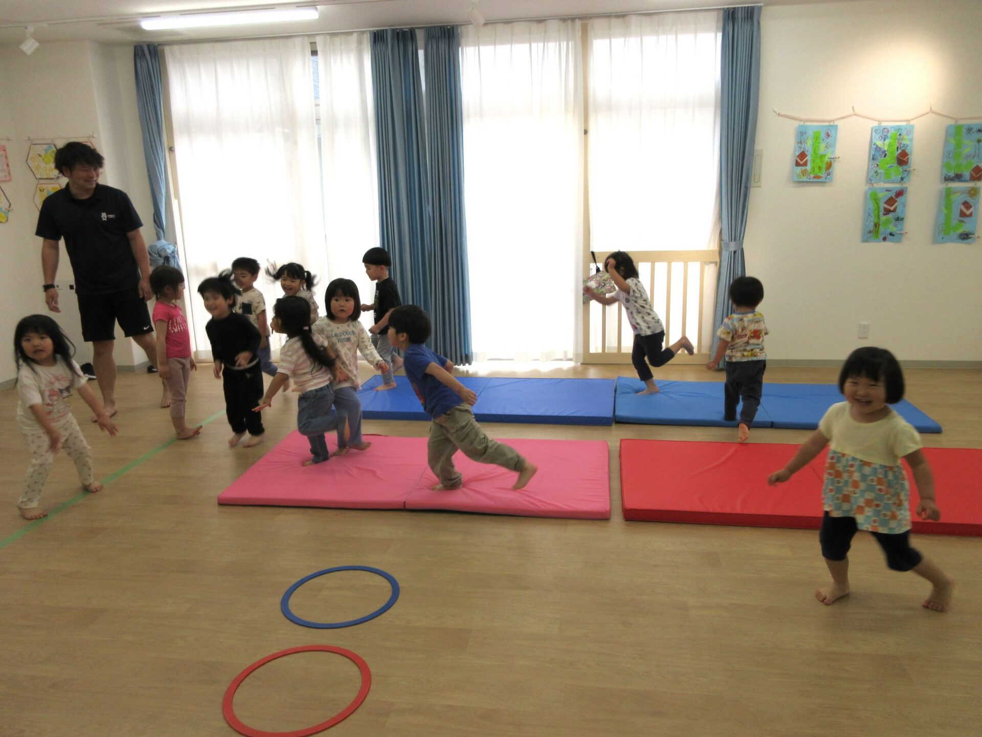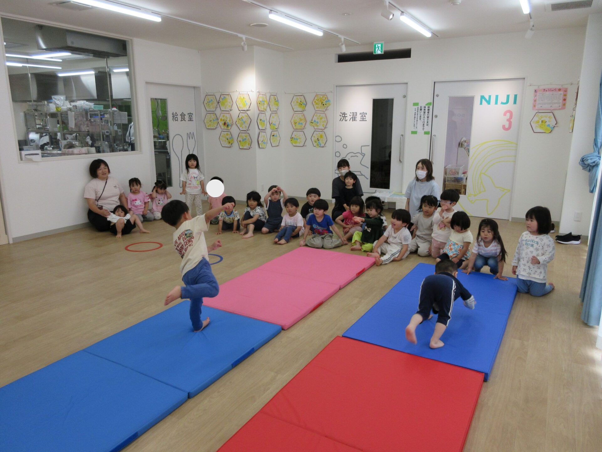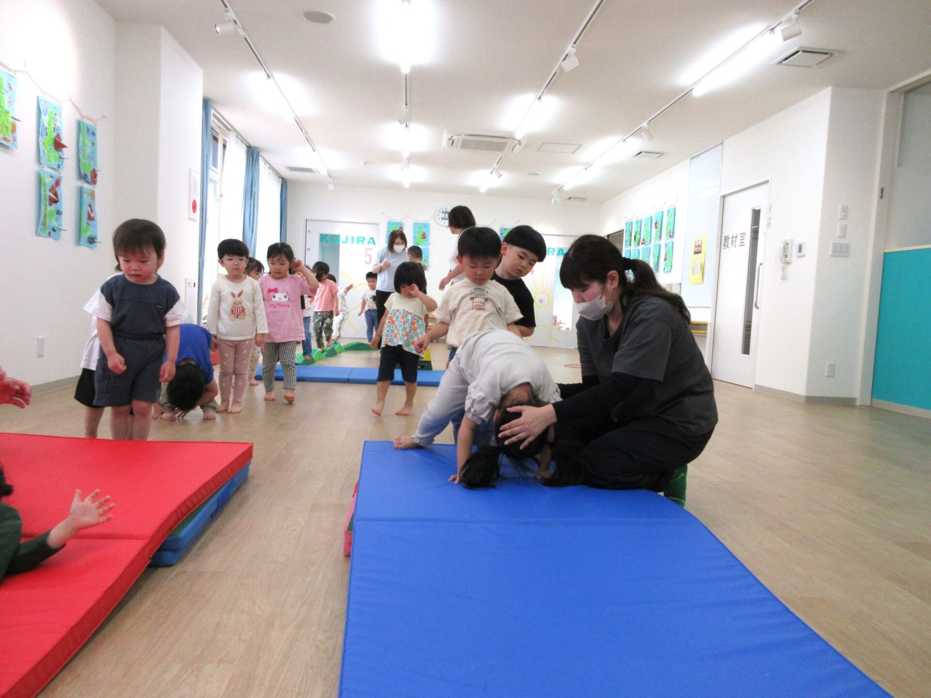 2025.05.26 お知らせ ブログ 運動あそび教室(2,3歳)でした 5月16日(金)、2階ランチルームで運動あそびをしました。 10時からは、2歳あめ組です。はじめは先生とストレッチ。 開脚のストレッチも。 ゴロンとでんぐり返り。 みんな上手にできていますね。 跳び箱からのジャンプや一本橋渡り。マットの上で、横に回りました。 それっ、ジャンプ! クマさん歩きもしましたよ。 10時半からは、3歳にじ組です。 元気いっぱい。 楽しんでいますね。 楽しみながら、いろいろな動きに挑戦です。 ジャンプ!! それっ! 運動の先生のお話も、しっかりと聞けていました。 お友だちのお手本も、しっかりと見て、拍手! そして、また再開。 手でうまくバランスをとって・・。 今日は前回りにも挑戦。 みんな楽しくできていましたね。 一覧へ戻る