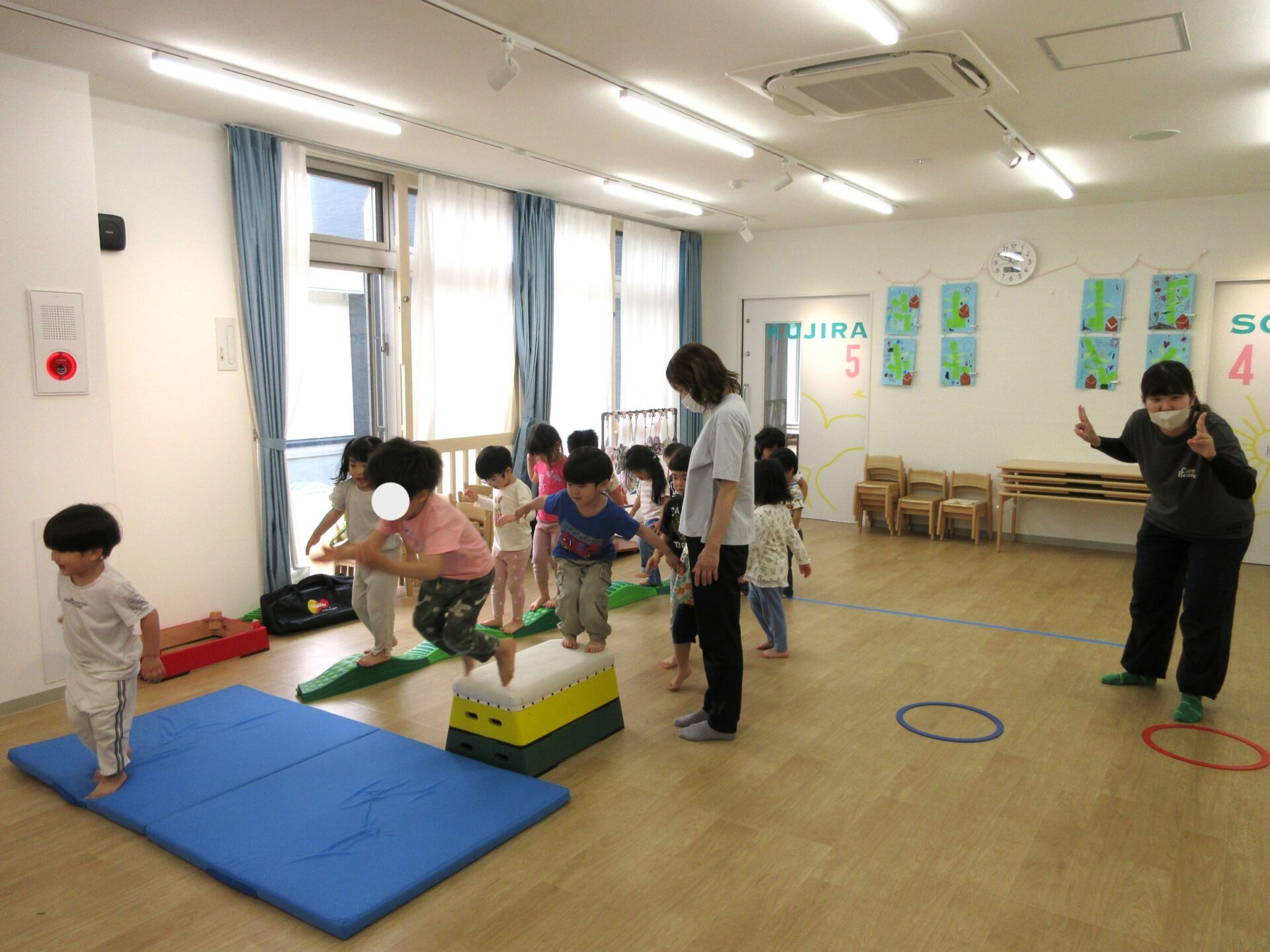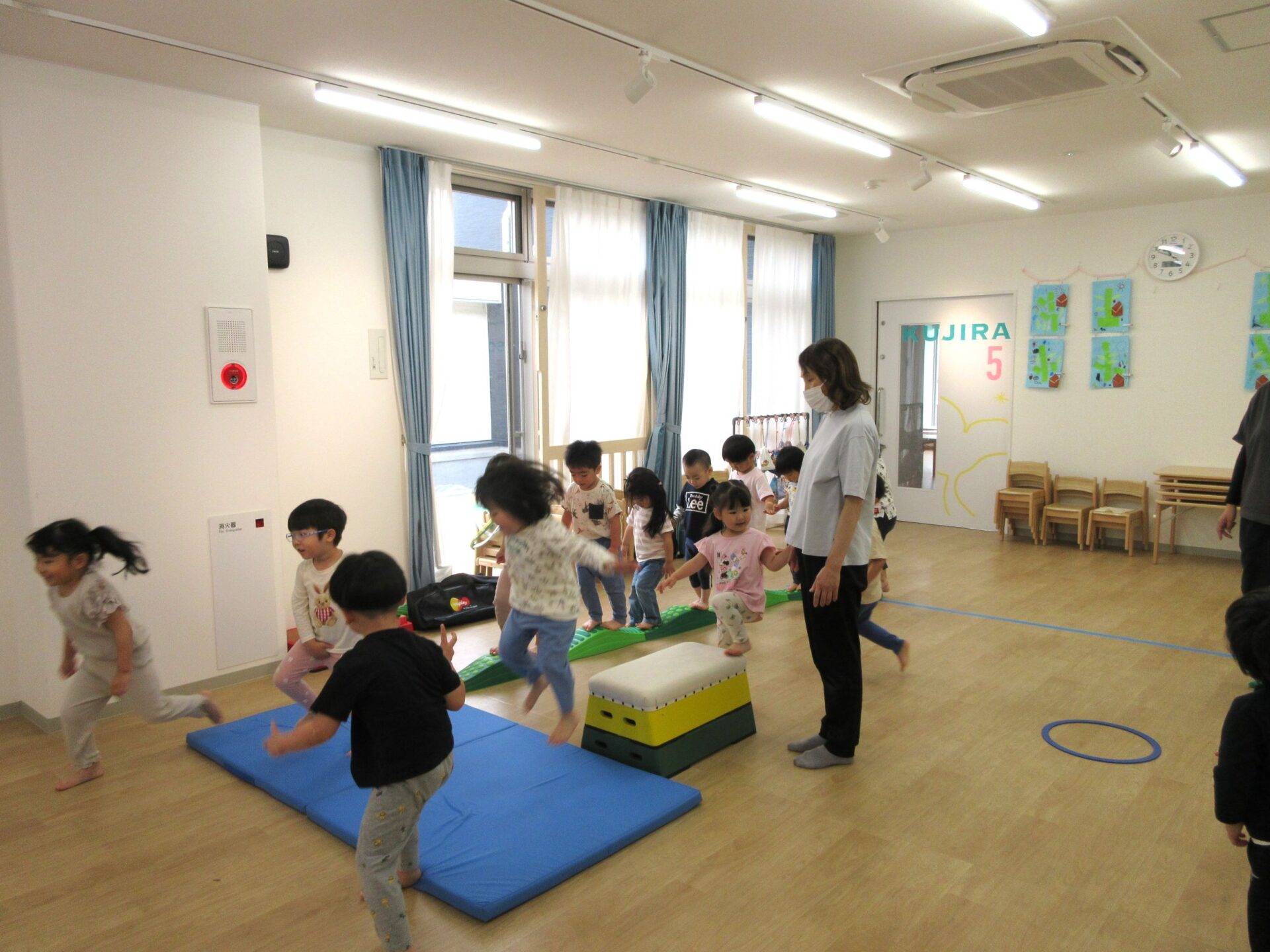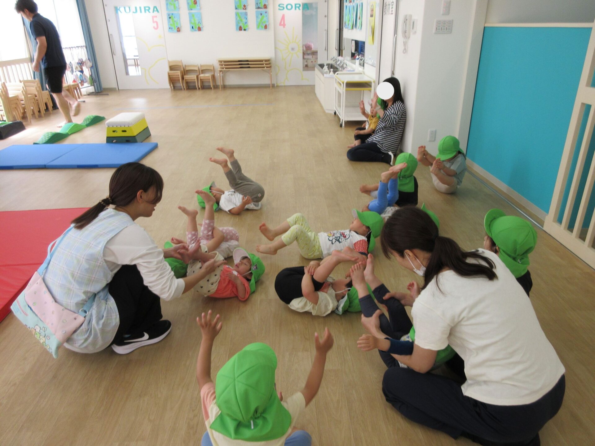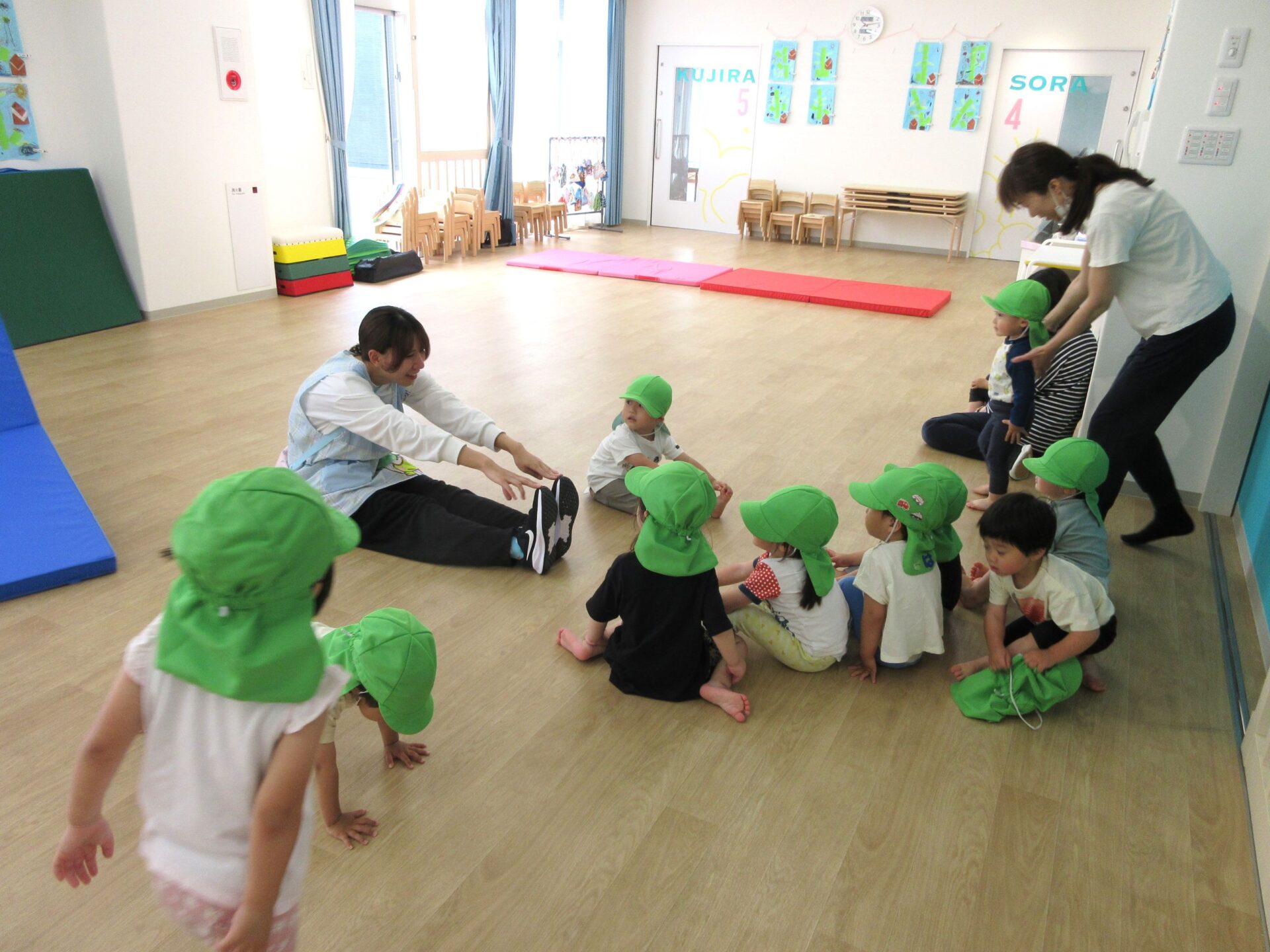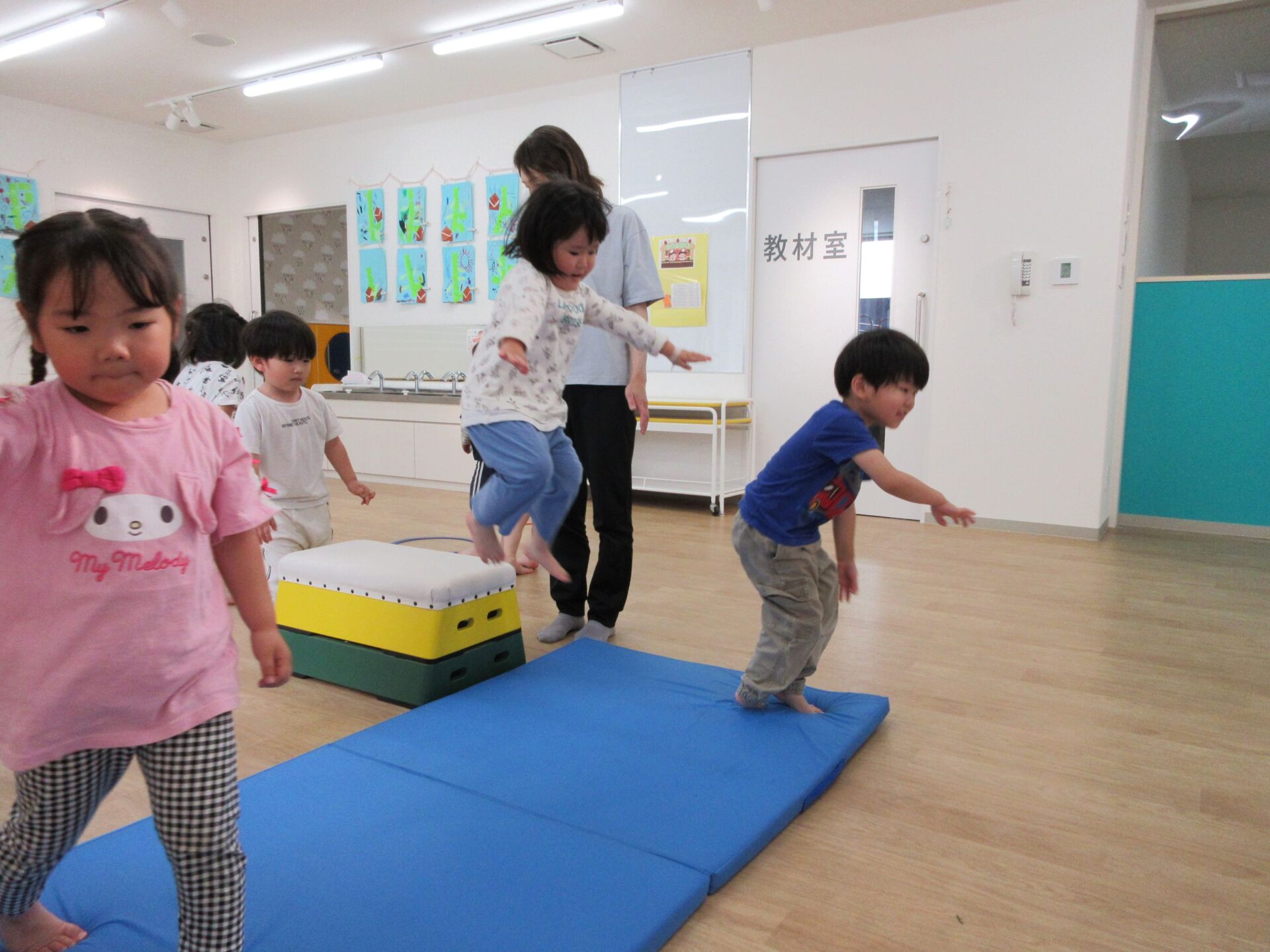 2025.05.26 お知らせ ブログ 運動あそび教室(2,3歳)でした 5月16日(金)、2階ランチルームで運動あそびをしました。 10時からは、2歳あめ組です。はじめは先生とストレッチ。 開脚のストレッチも。 ゴロンとでんぐり返り。 みんな上手にできていますね。 跳び箱からのジャンプや一本橋渡り。マットの上で、横に回りました。 それっ、ジャンプ! クマさん歩きもしましたよ。 10時半からは、3歳にじ組です。 元気いっぱい。 楽しんでいますね。 楽しみながら、いろいろな動きに挑戦です。 ジャンプ!! それっ! 運動の先生のお話も、しっかりと聞けていました。 お友だちのお手本も、しっかりと見て、拍手! そして、また再開。 手でうまくバランスをとって・・。 今日は前回りにも挑戦。 みんな楽しくできていましたね。 一覧へ戻る
