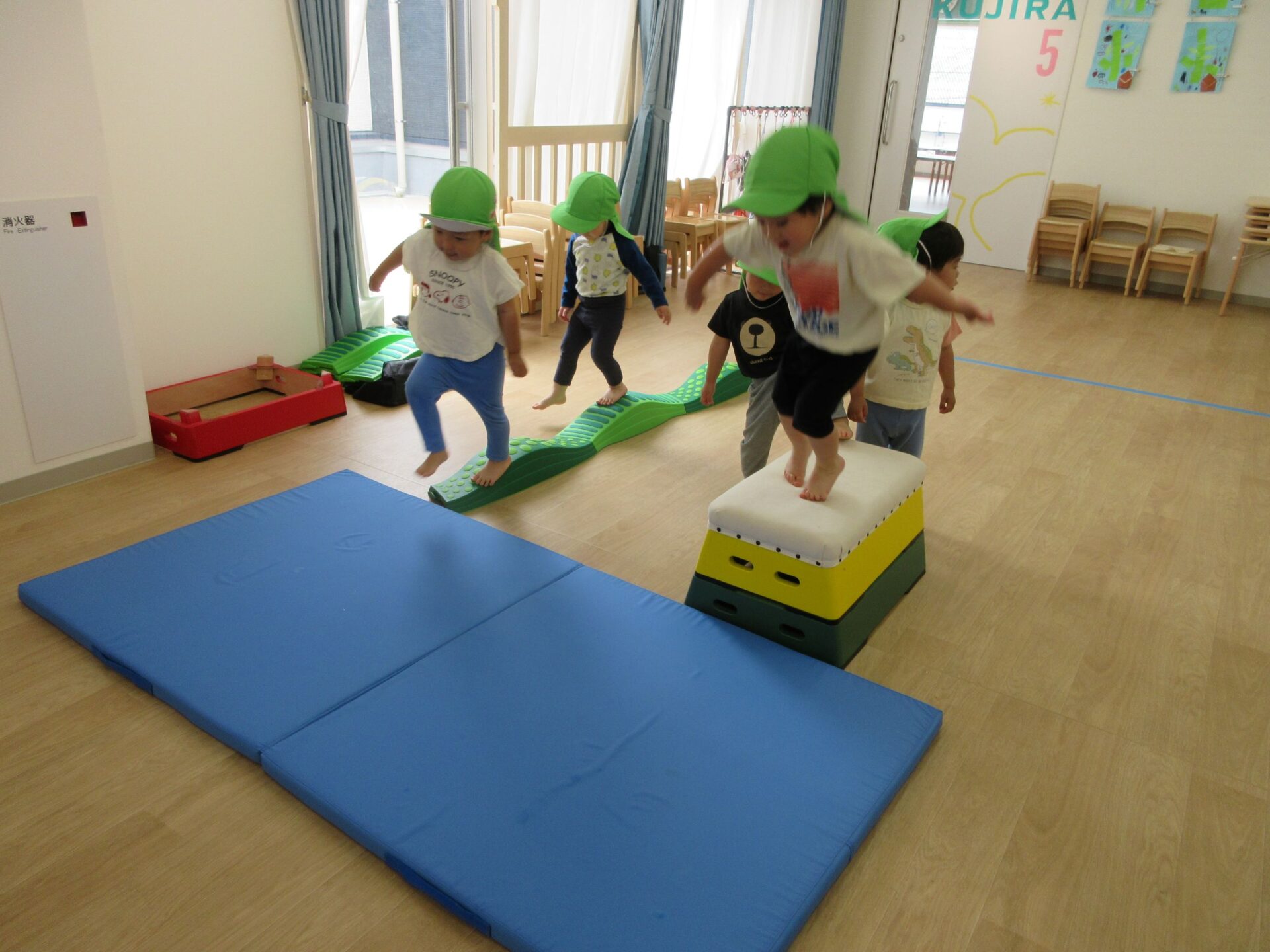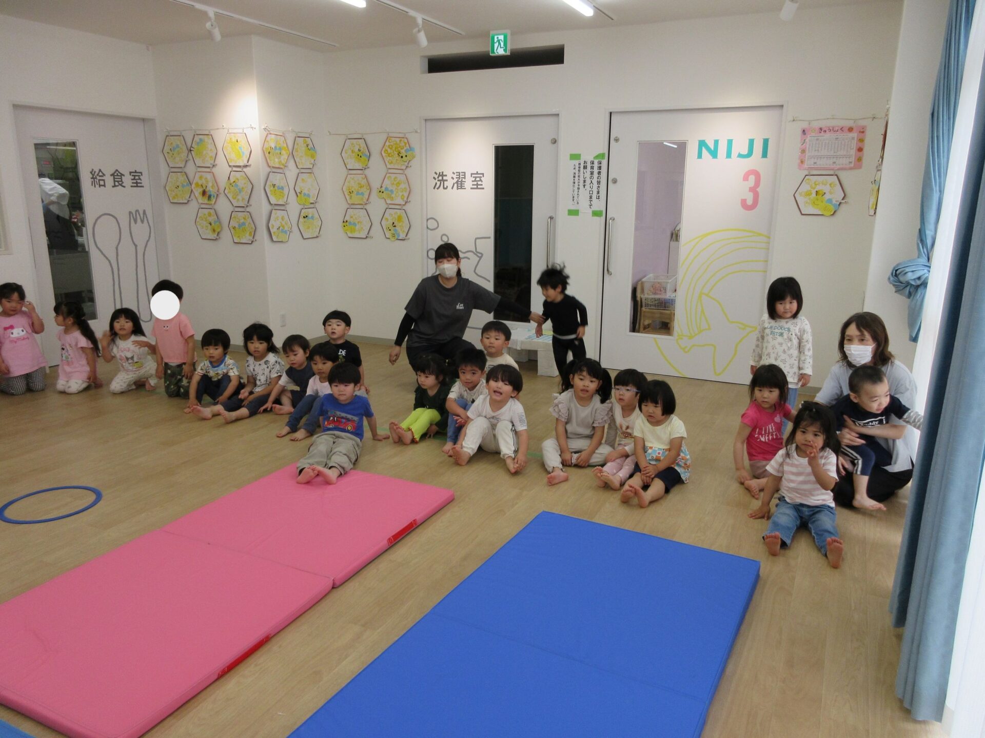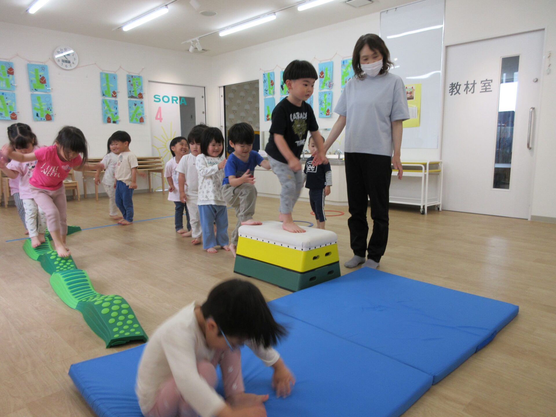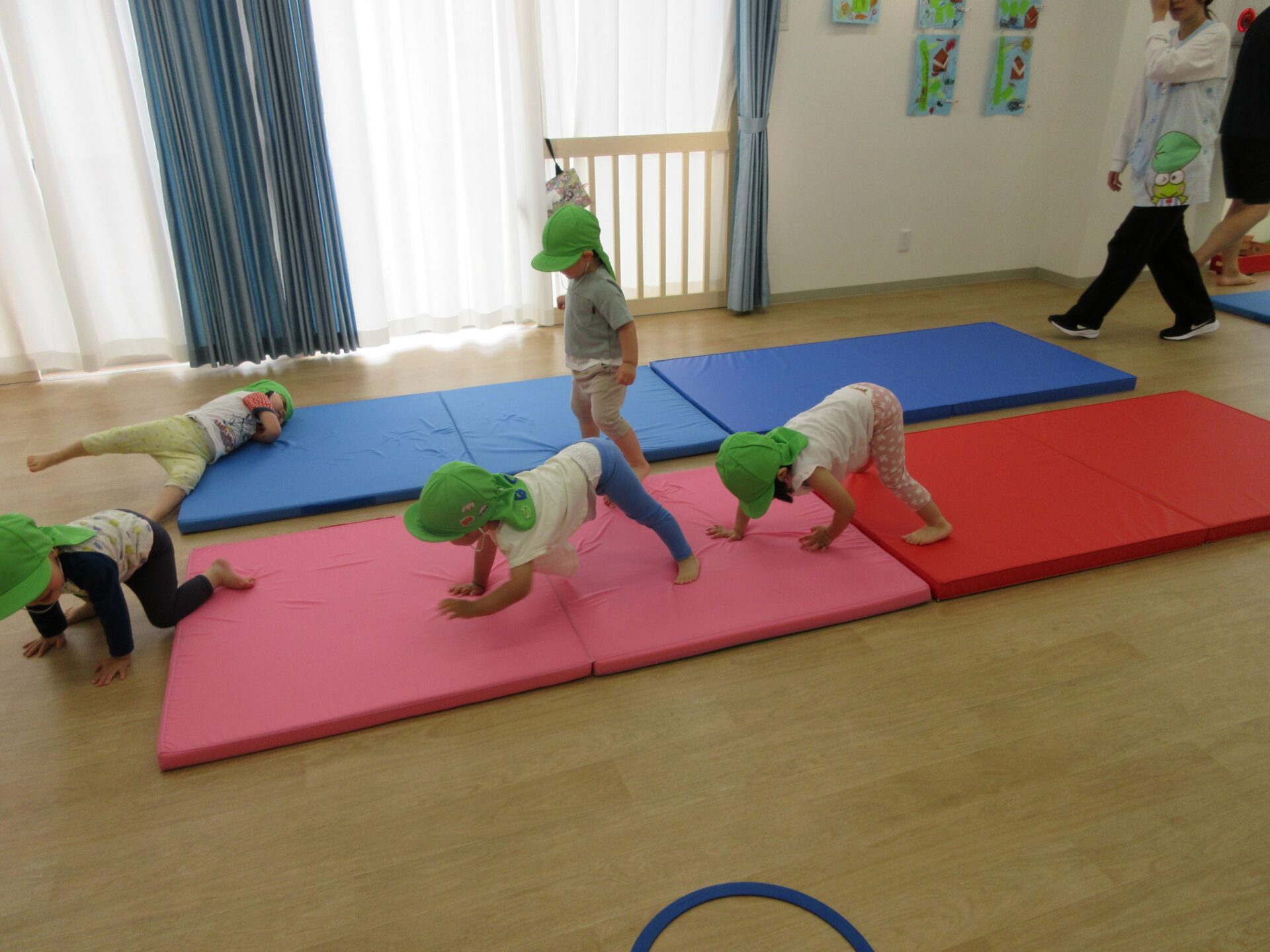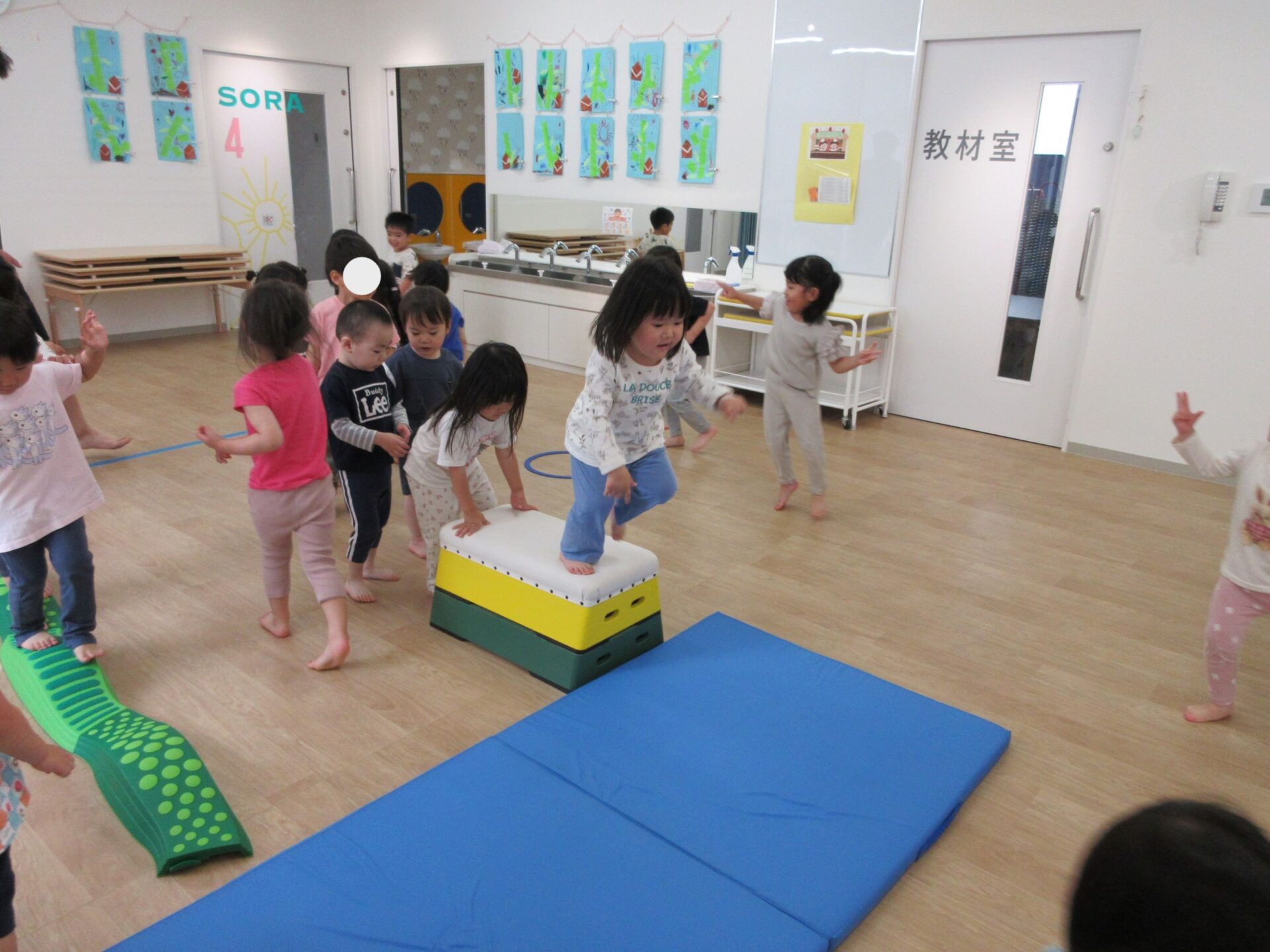 2025.05.26 お知らせ ブログ 運動あそび教室(2,3歳)でした 5月16日(金)、2階ランチルームで運動あそびをしました。 10時からは、2歳あめ組です。はじめは先生とストレッチ。 開脚のストレッチも。 ゴロンとでんぐり返り。 みんな上手にできていますね。 跳び箱からのジャンプや一本橋渡り。マットの上で、横に回りました。 それっ、ジャンプ! クマさん歩きもしましたよ。 10時半からは、3歳にじ組です。 元気いっぱい。 楽しんでいますね。 楽しみながら、いろいろな動きに挑戦です。 ジャンプ!! それっ! 運動の先生のお話も、しっかりと聞けていました。 お友だちのお手本も、しっかりと見て、拍手! そして、また再開。 手でうまくバランスをとって・・。 今日は前回りにも挑戦。 みんな楽しくできていましたね。 一覧へ戻る