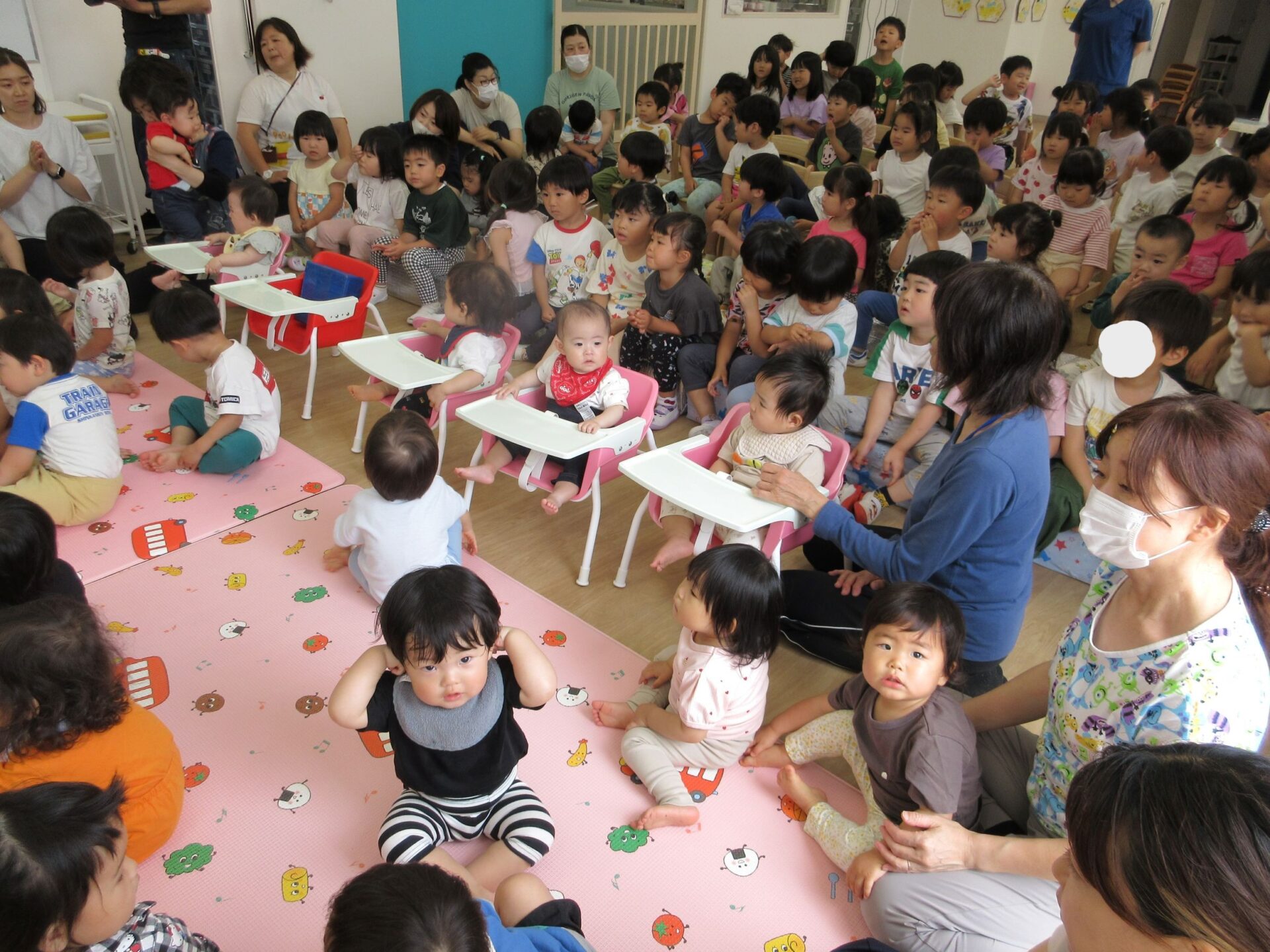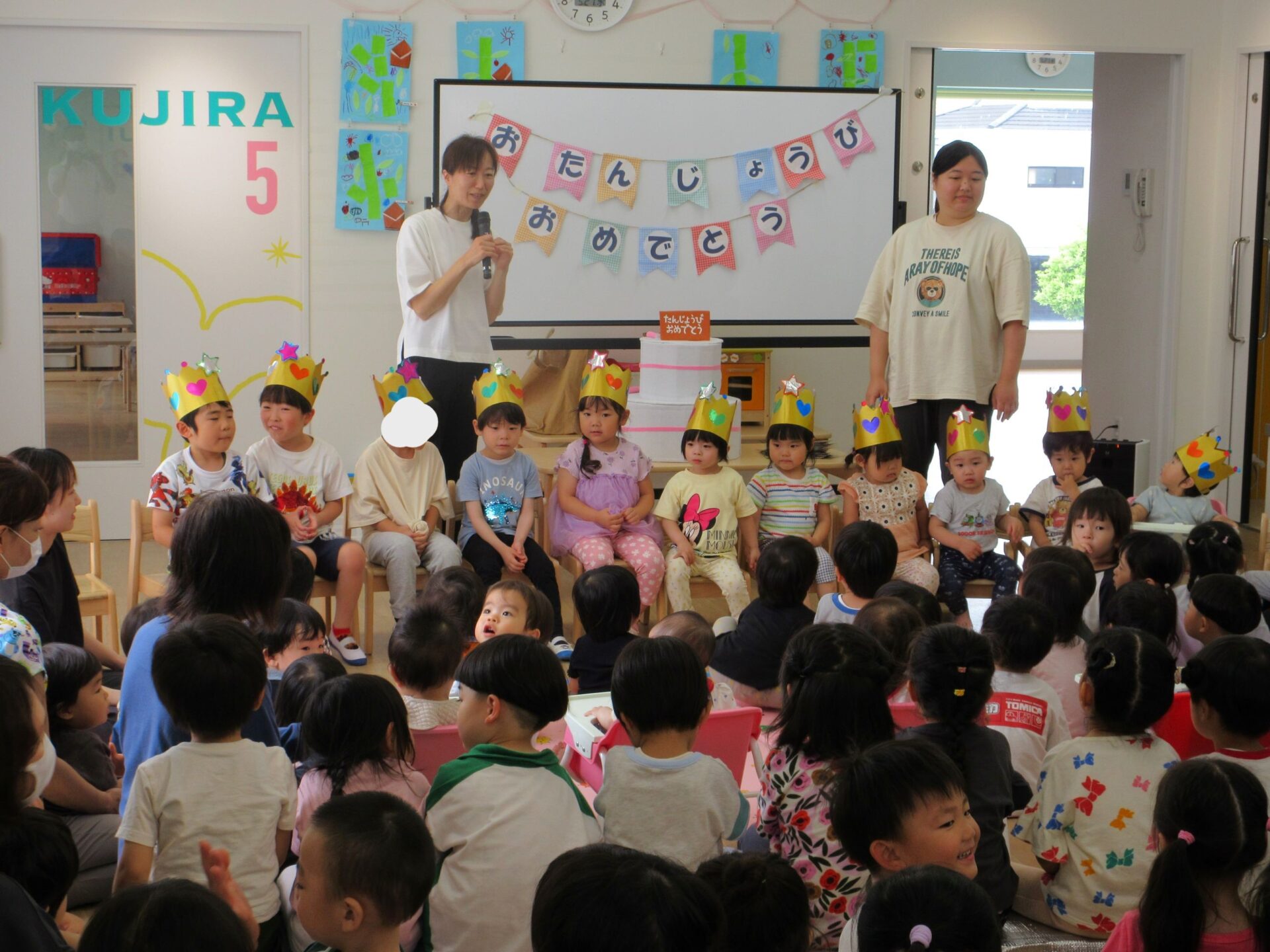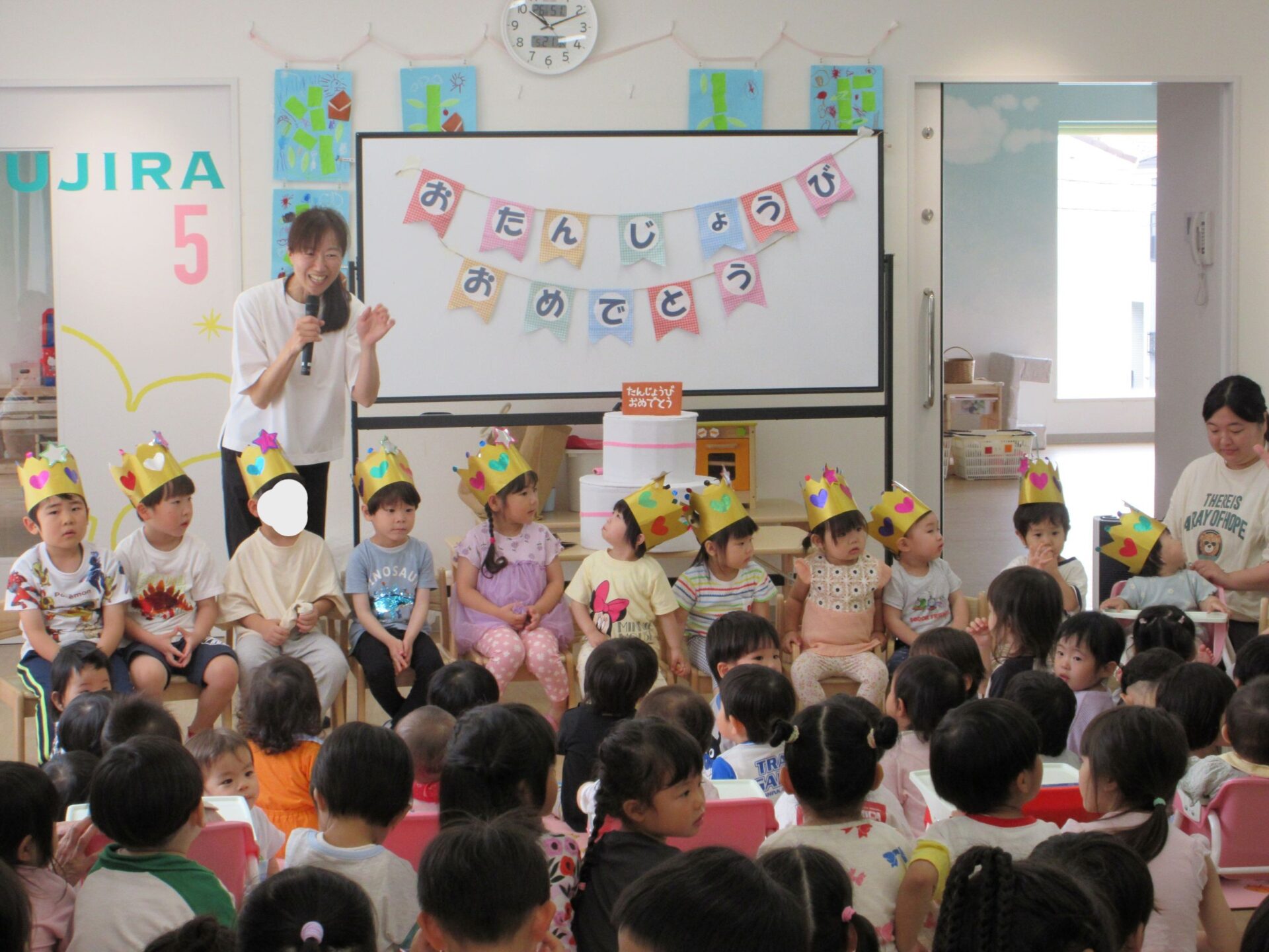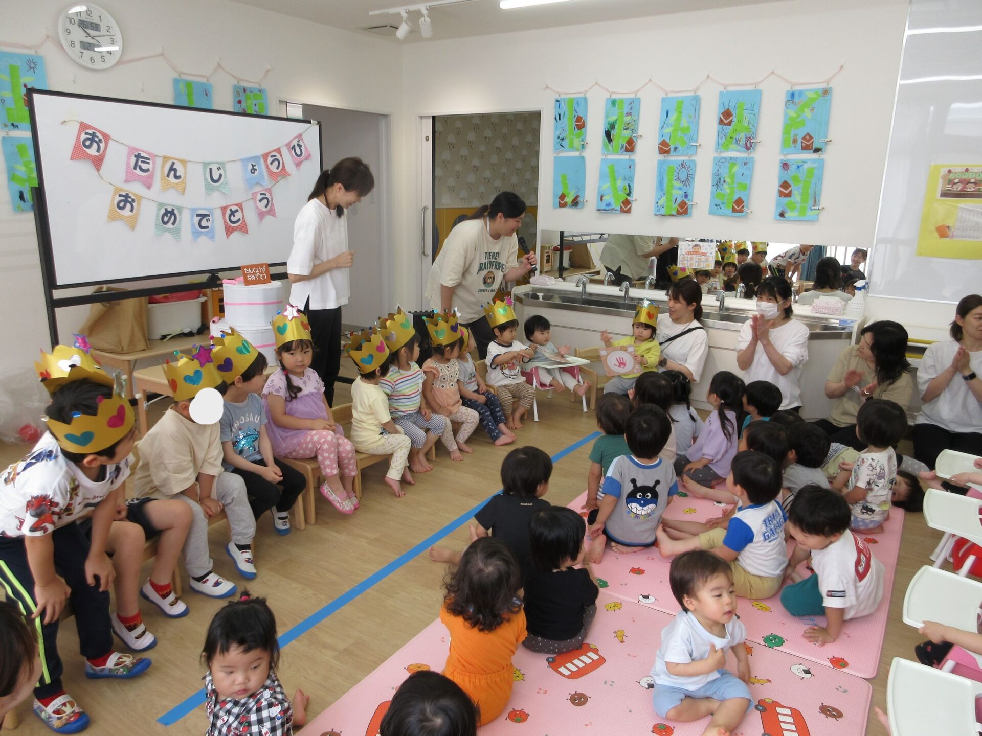 2025.05.26 お知らせ ブログ 5月の誕生会 5月21日(水)、ランチルームで5月のお誕生会をしました。 今月は、たくさんのお友だちが誕生月です。 一人ずつ紹介してもらいます。 「お名前は?」「何歳になりますか?」 「好きな食べ物は?」「大きくなったら何になりたいですか?」 ケーキのろうそくを吹き消します。 人数が多かったので、2つのグループに分かれて行いました。「フーっ!」 先生の出し物、今月は「おいしいカレーライス」です。 音楽に合わせて、食材を入れ、調味料も。 すると・・・、おいしいカレーライスができあがりました! 来月はどんな出し物か、楽しみです。 一覧へ戻る