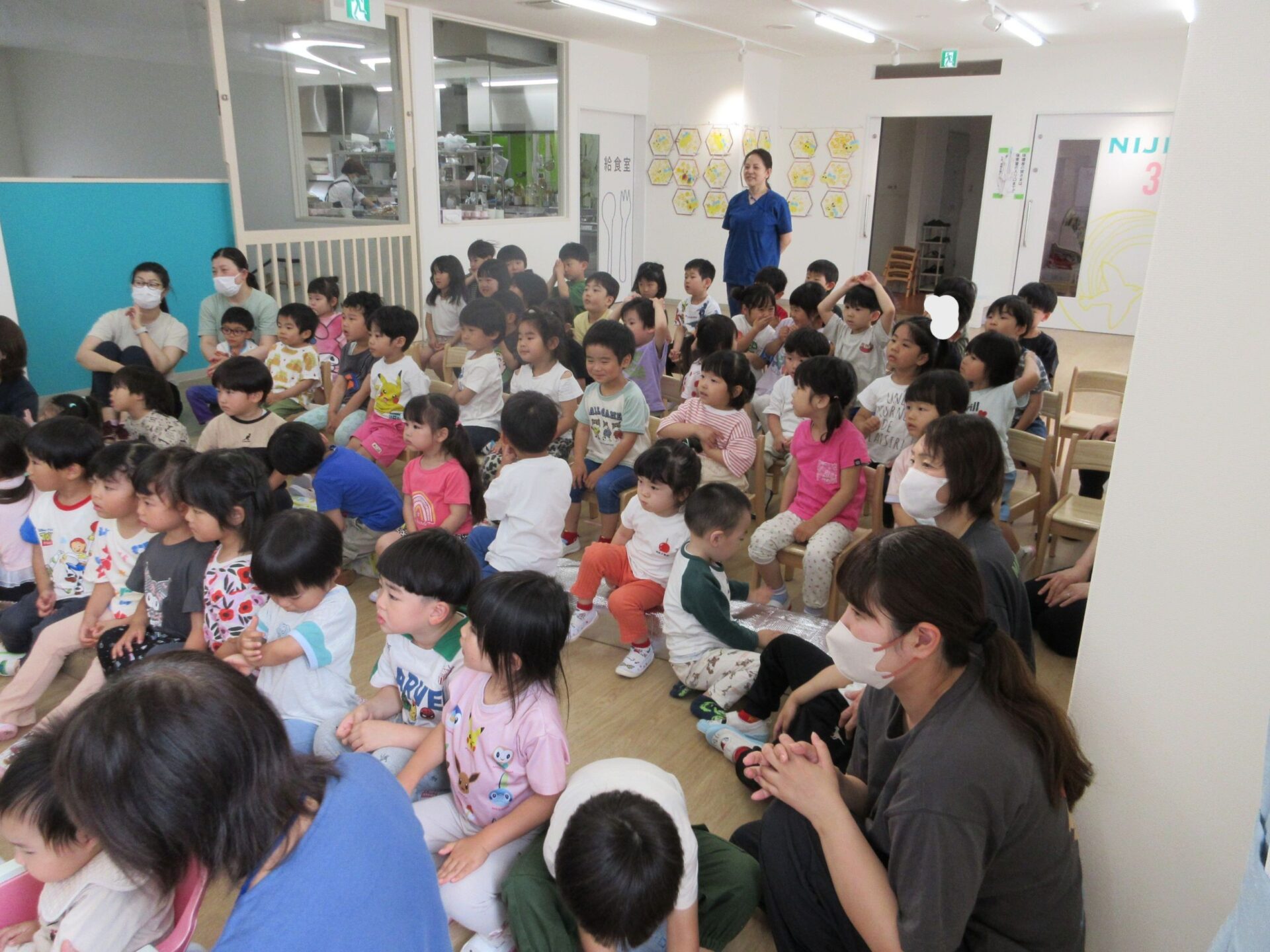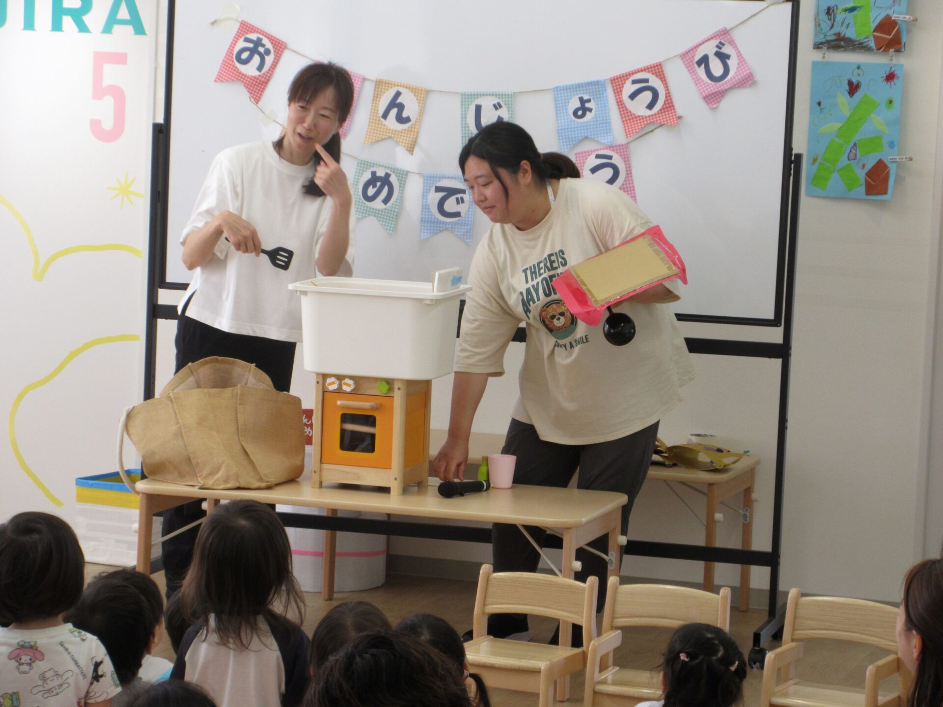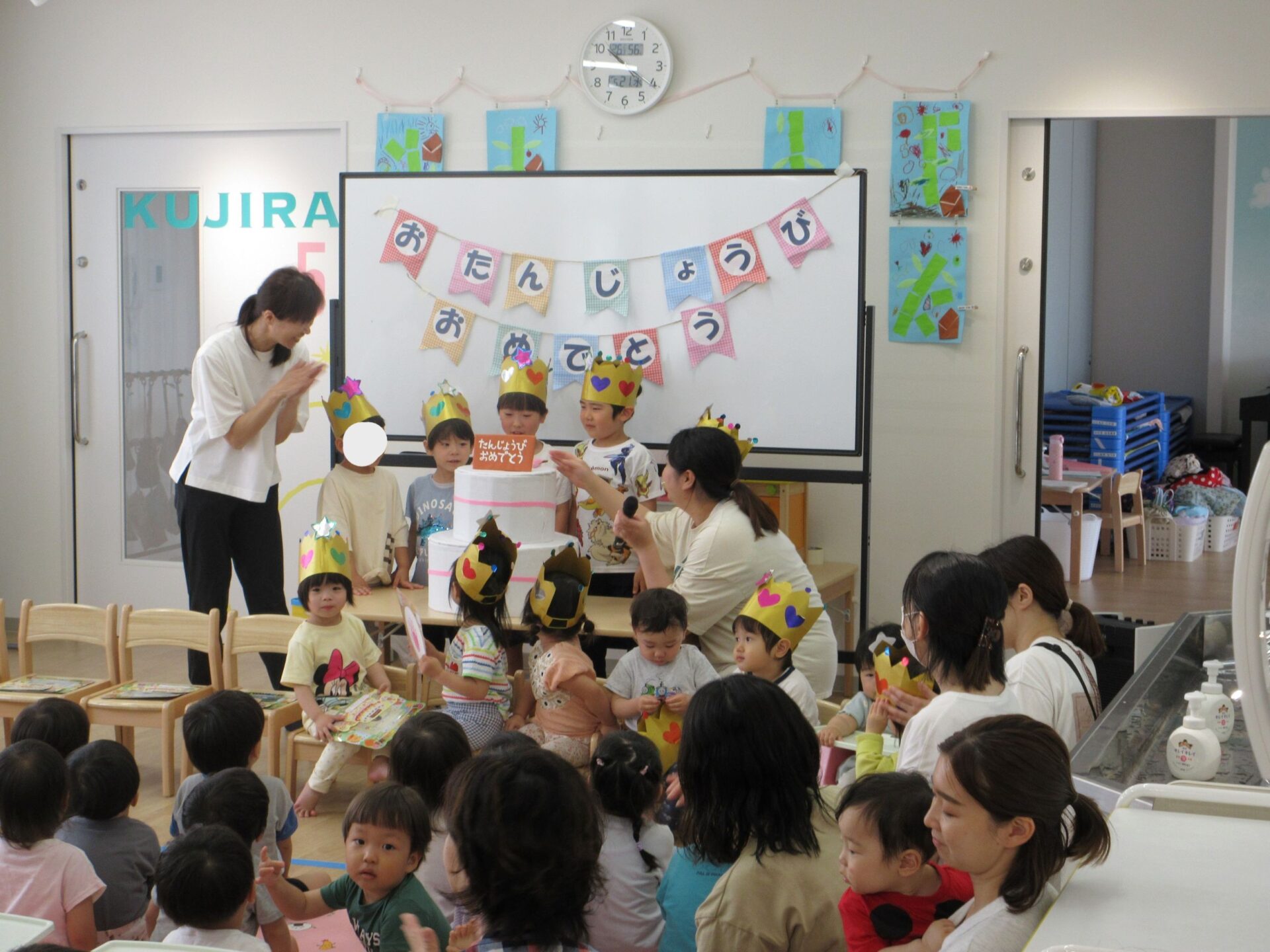 2025.05.26 お知らせ ブログ 5月の誕生会 5月21日(水)、ランチルームで5月のお誕生会をしました。 今月は、たくさんのお友だちが誕生月です。 一人ずつ紹介してもらいます。 「お名前は?」「何歳になりますか?」 「好きな食べ物は?」「大きくなったら何になりたいですか?」 ケーキのろうそくを吹き消します。 人数が多かったので、2つのグループに分かれて行いました。「フーっ!」 先生の出し物、今月は「おいしいカレーライス」です。 音楽に合わせて、食材を入れ、調味料も。 すると・・・、おいしいカレーライスができあがりました! 来月はどんな出し物か、楽しみです。 一覧へ戻る