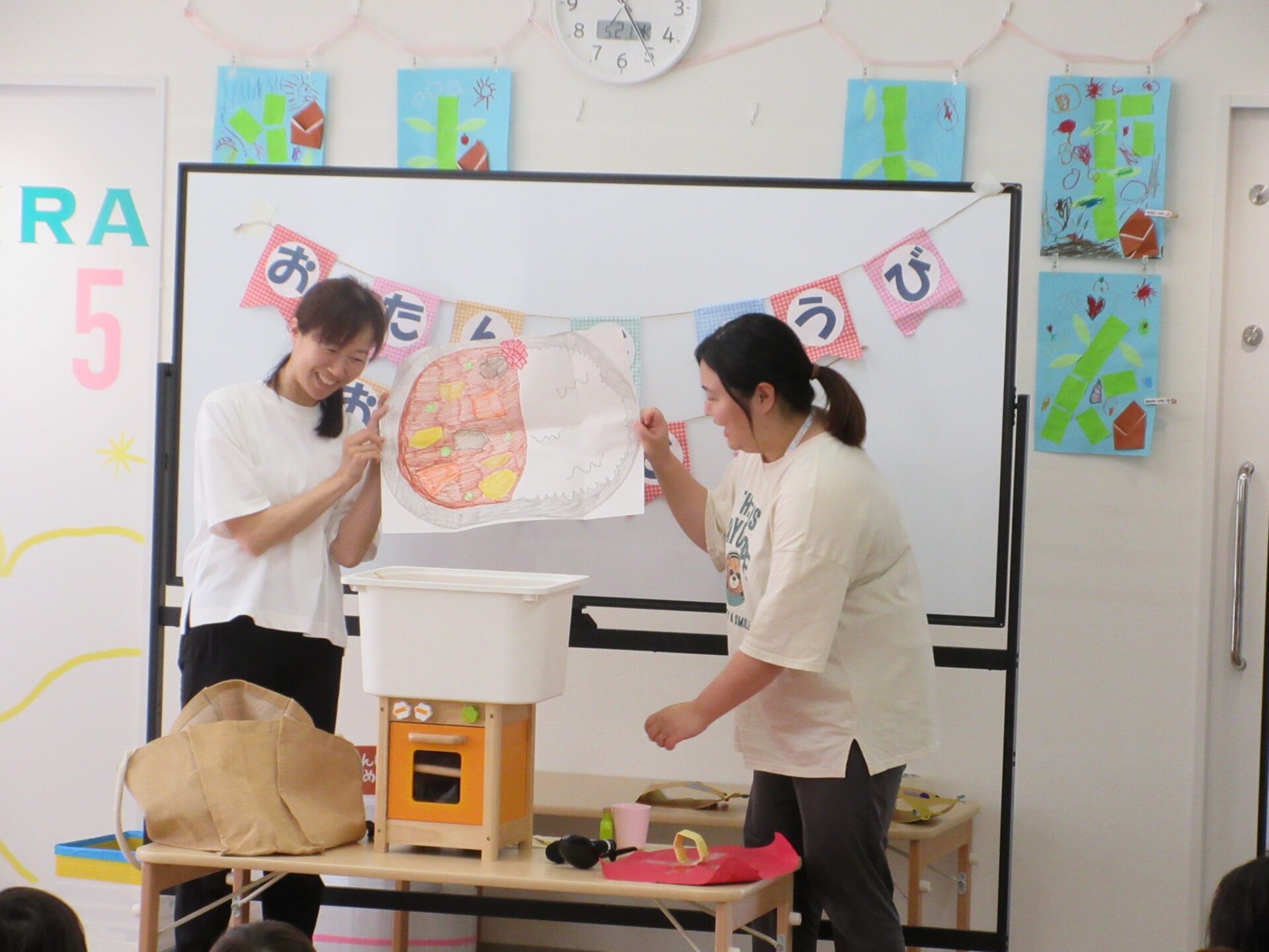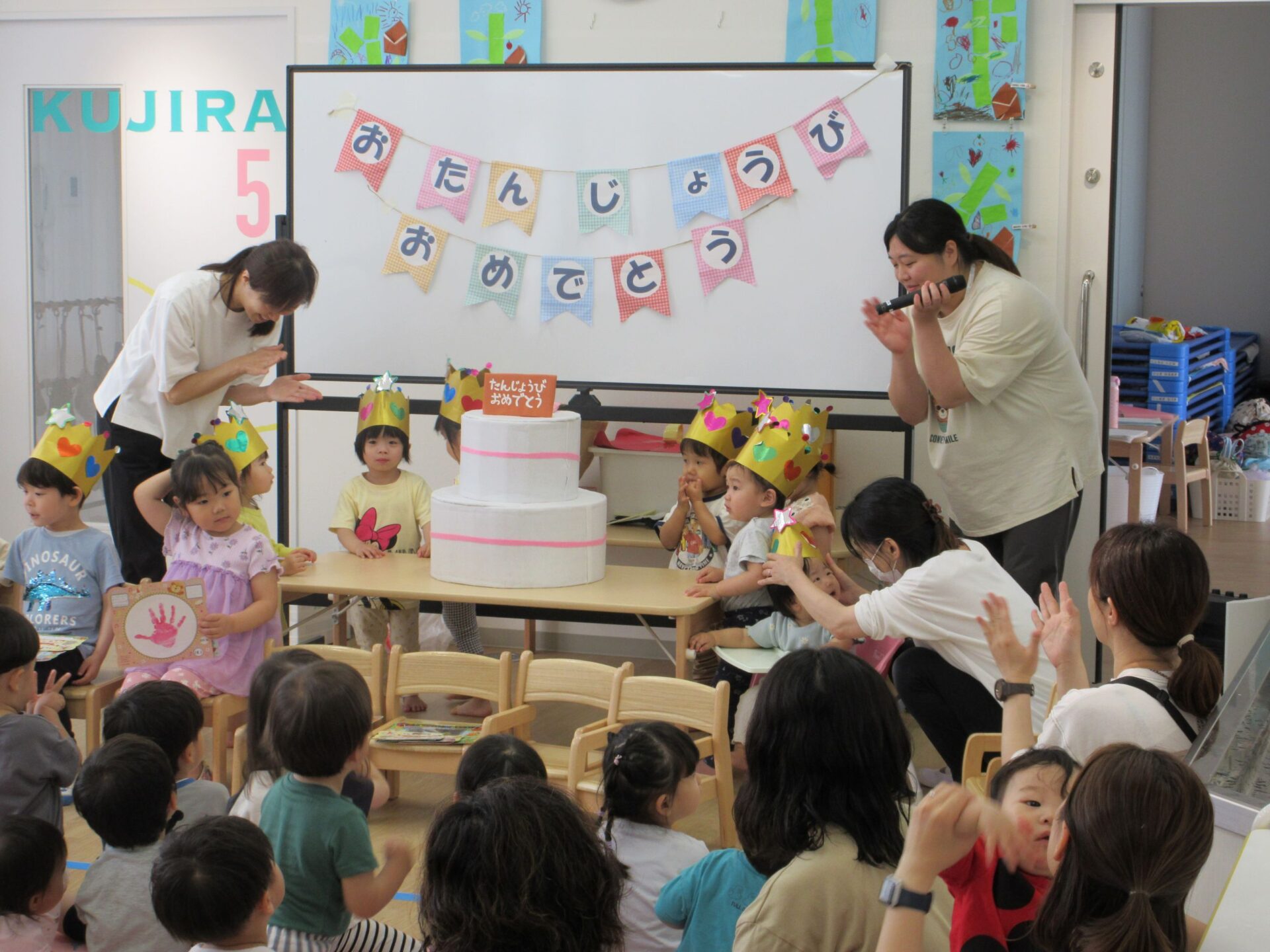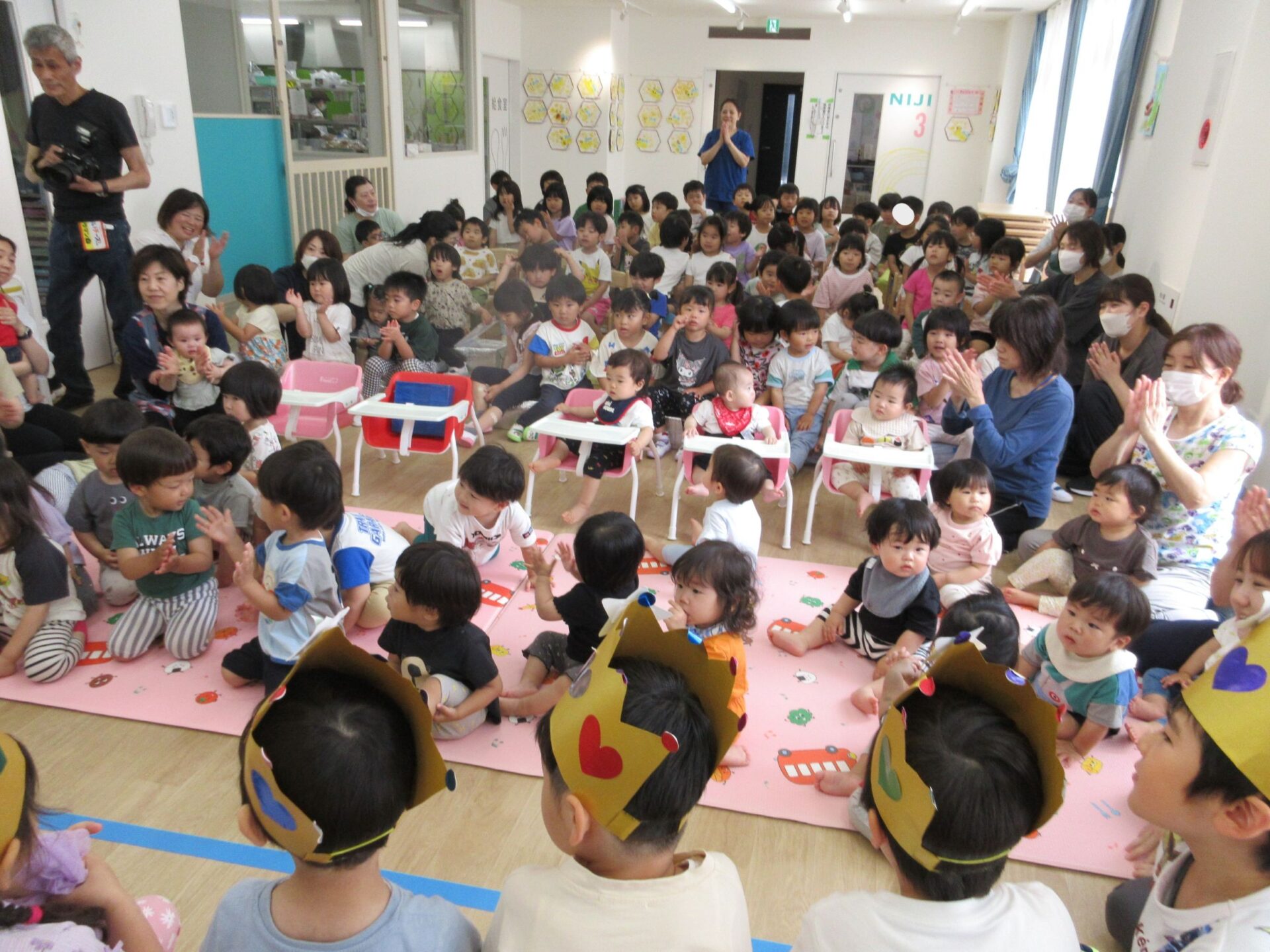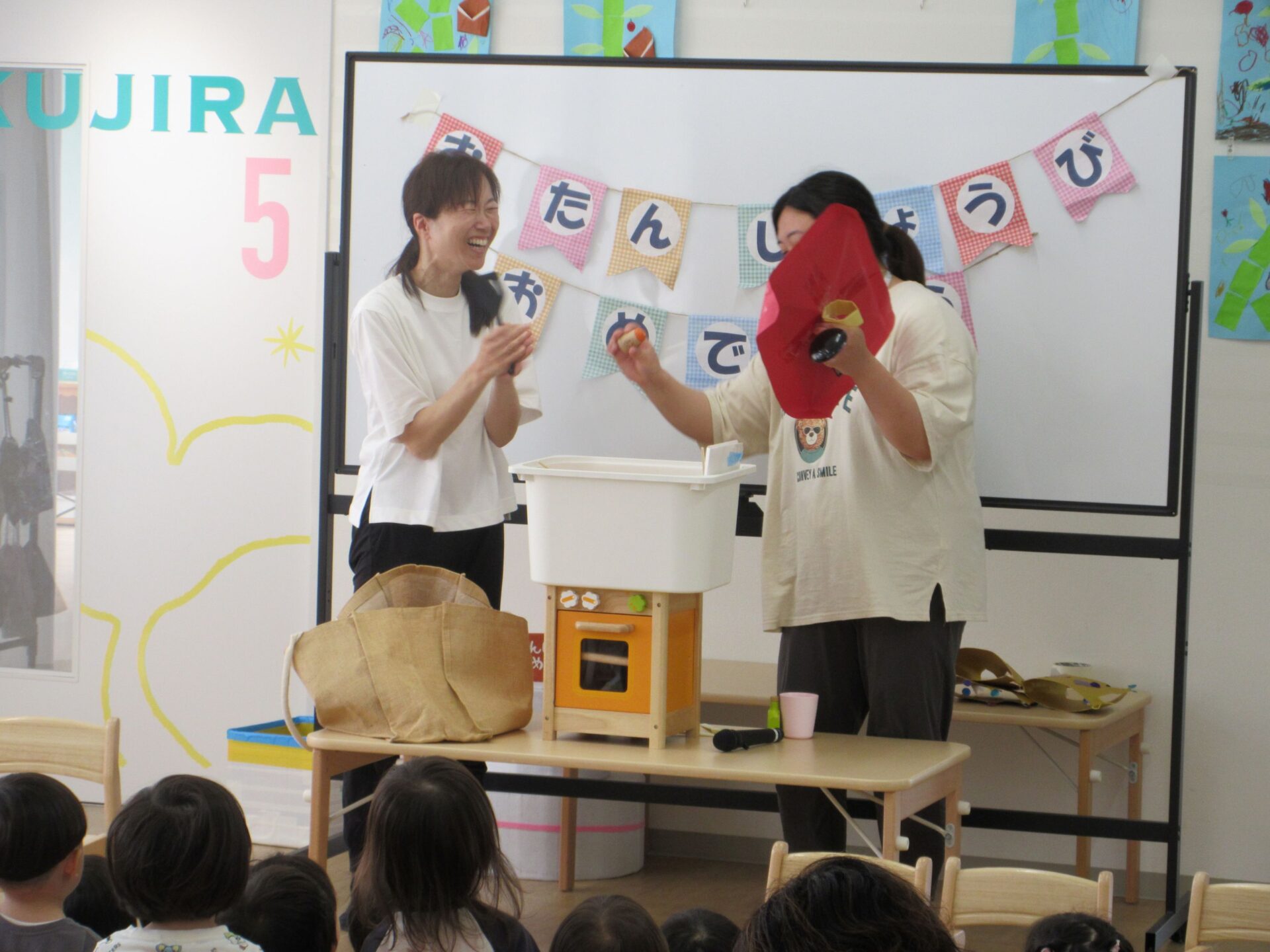 2025.05.26 お知らせ ブログ 5月の誕生会 5月21日(水)、ランチルームで5月のお誕生会をしました。 今月は、たくさんのお友だちが誕生月です。 一人ずつ紹介してもらいます。 「お名前は?」「何歳になりますか?」 「好きな食べ物は?」「大きくなったら何になりたいですか?」 ケーキのろうそくを吹き消します。 人数が多かったので、2つのグループに分かれて行いました。「フーっ!」 先生の出し物、今月は「おいしいカレーライス」です。 音楽に合わせて、食材を入れ、調味料も。 すると・・・、おいしいカレーライスができあがりました! 来月はどんな出し物か、楽しみです。 一覧へ戻る