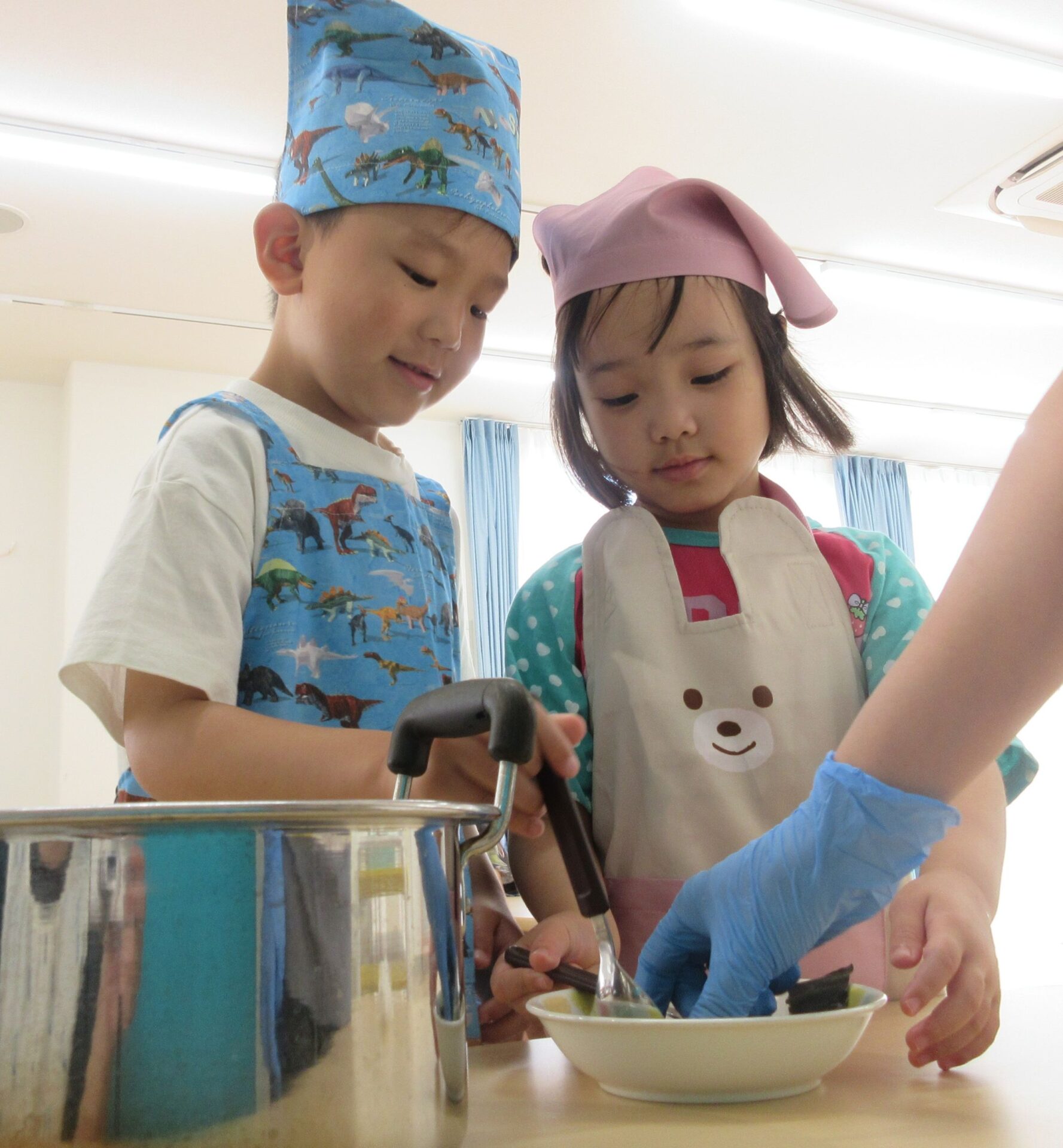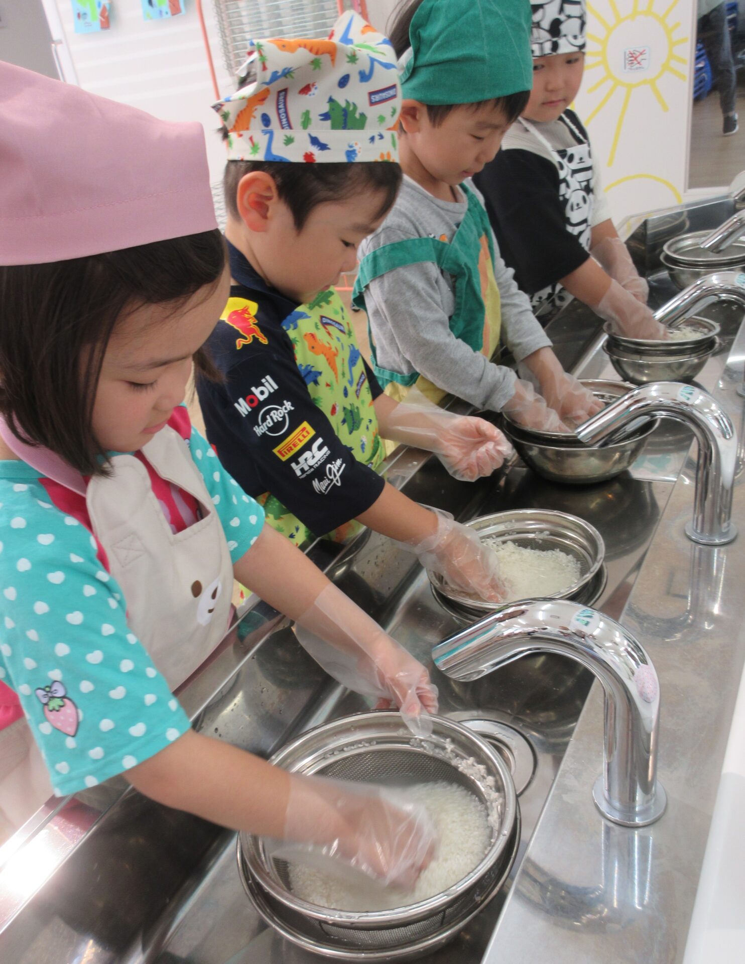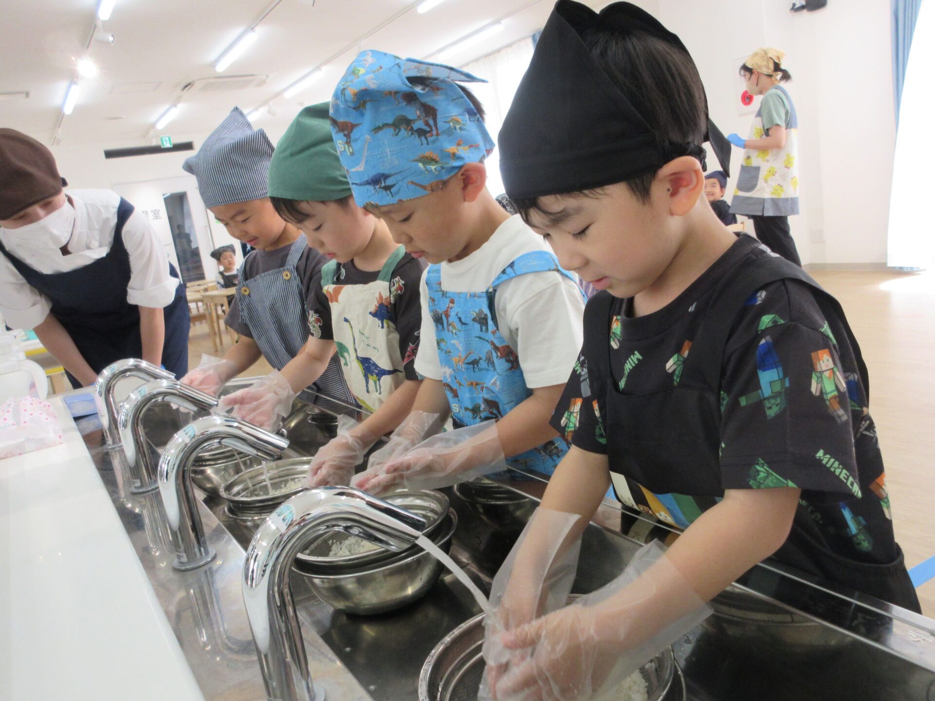 くじら組の第1回目のクッキングは、おにぎりとみそ汁作りです!お米を洗うところから始めます。