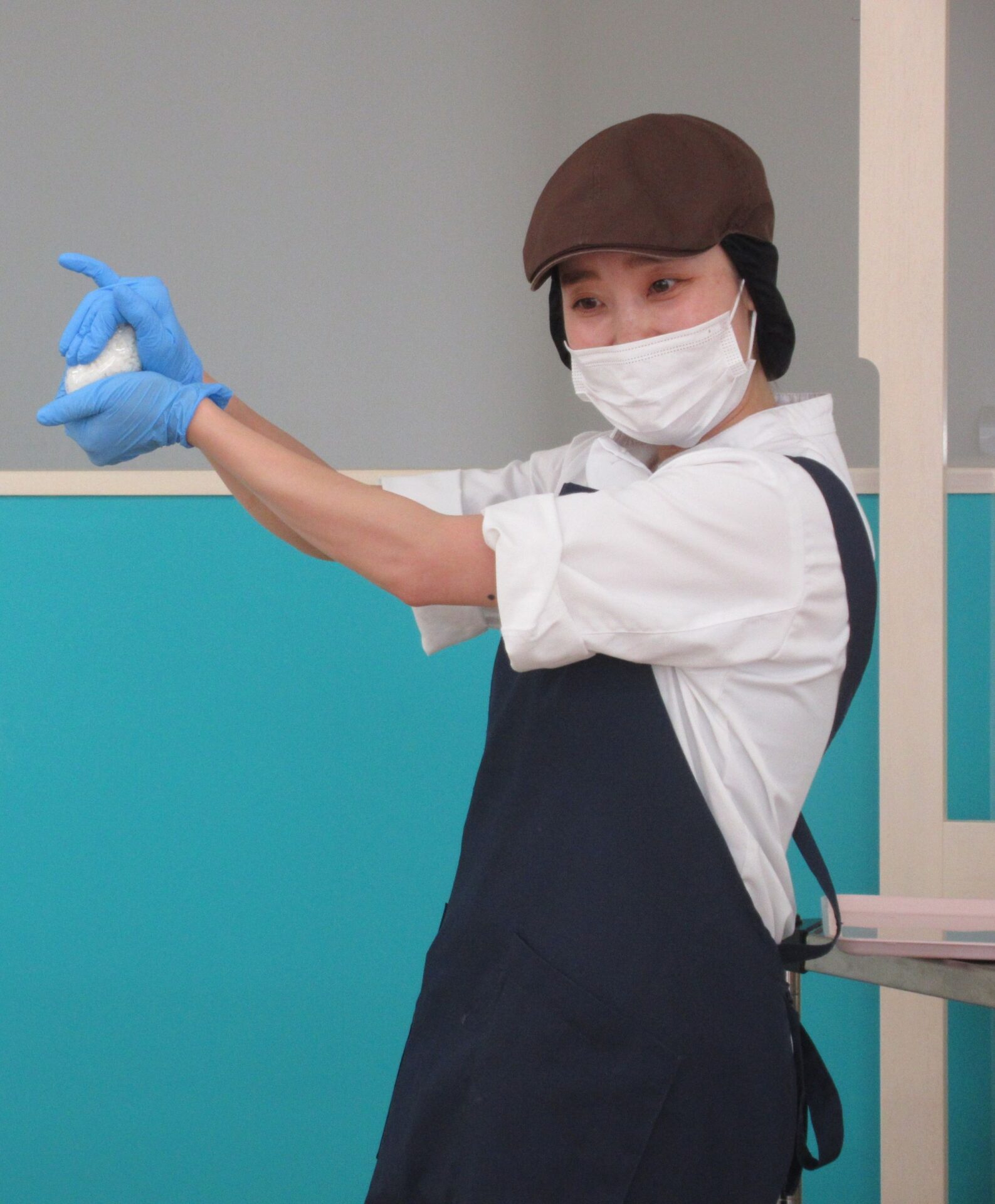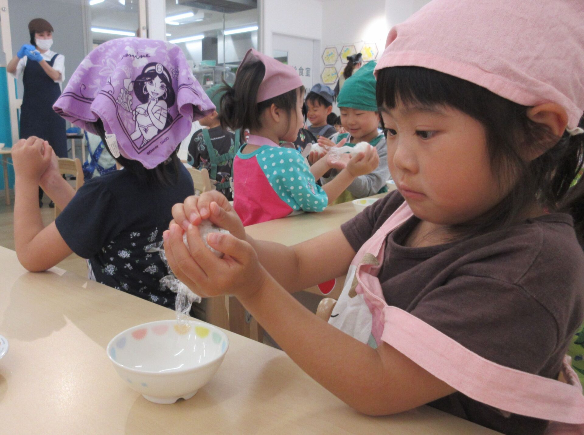 次はおにぎり作り!給食の宮本さんに、おにぎりを三角に握るコツを教えてもらいました。