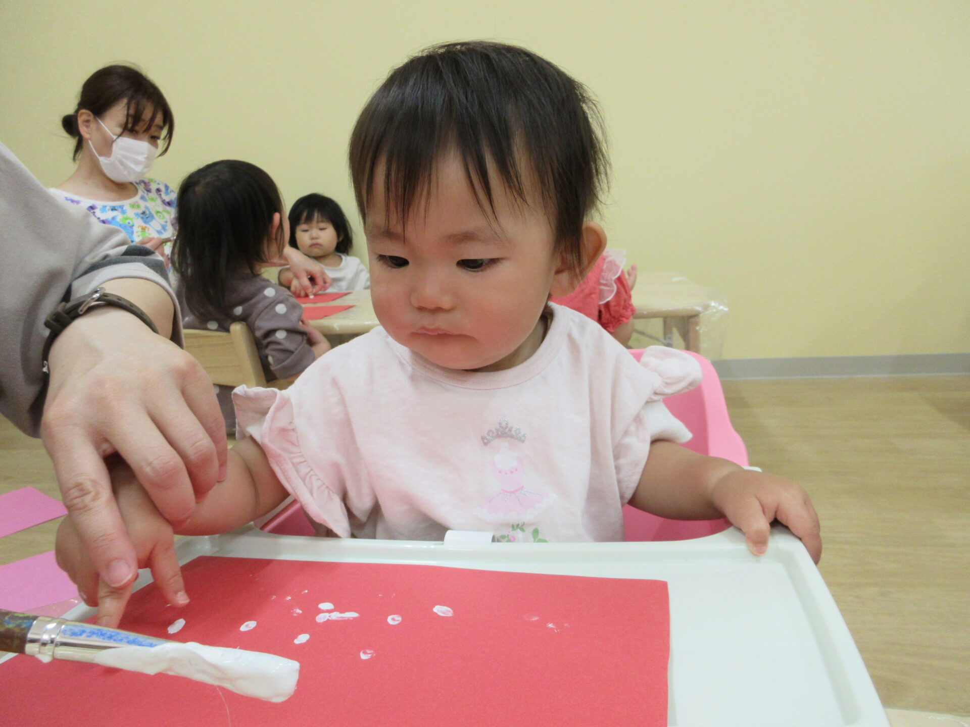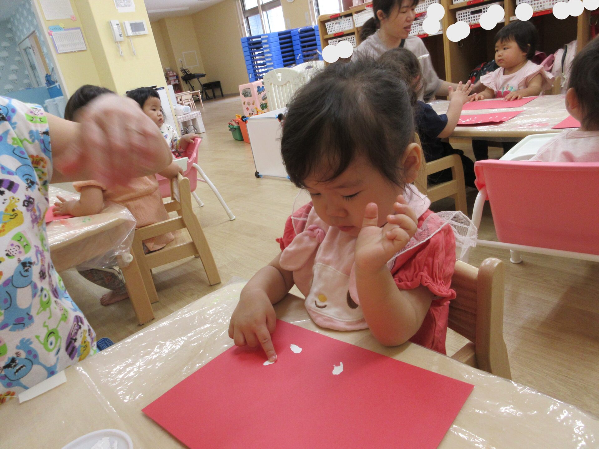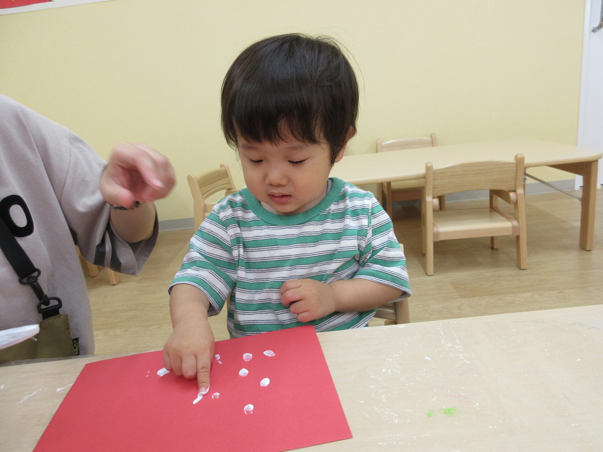 2025.05.26 お知らせ ブログ ペタペタ♪製作(1歳だいち組) イチゴの粒を白色の絵の具で見立てて、指スタンプをしました! 初めて絵の具を使う子どもたちは、不思議そうに見ながら、担任に絵の具を指につけてもらっています。 ドキドキ!! そーっと、そーっと・・・ ペッタン、ペッタン♪ ダイナミックに指スタンプを楽しんでいました☆ 一覧へ戻る