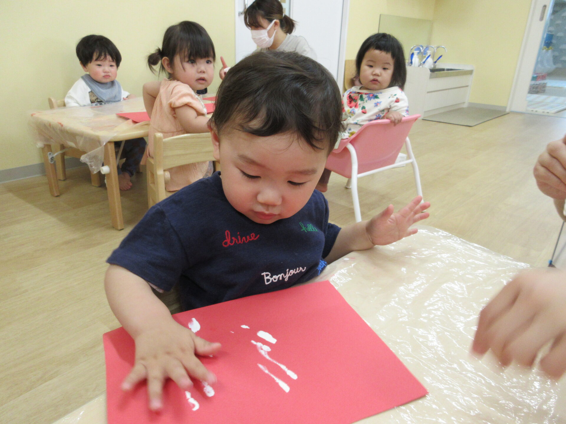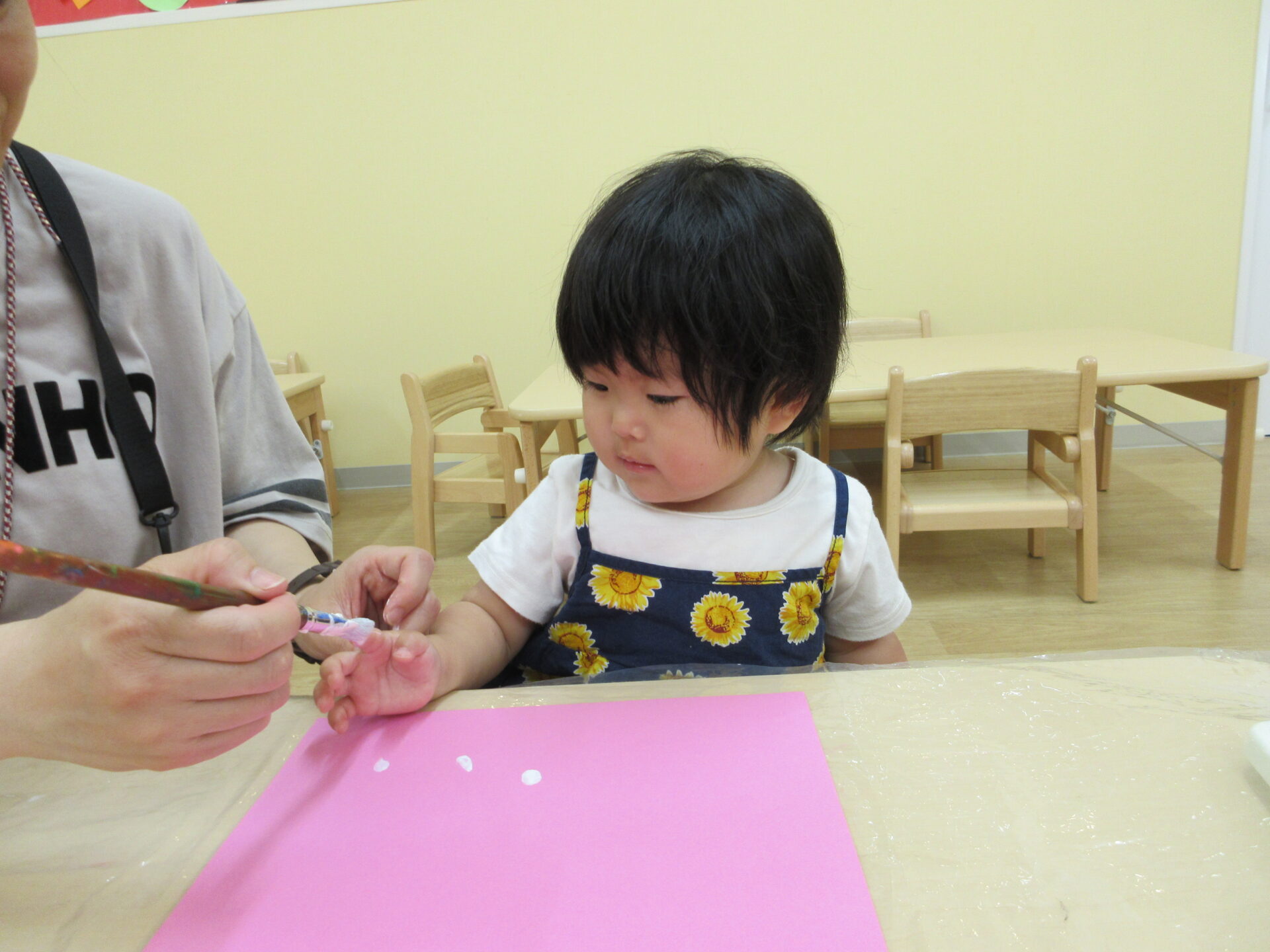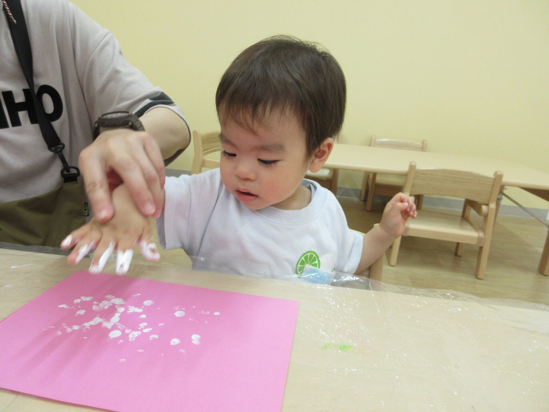 2025.05.26 お知らせ ブログ ペタペタ♪製作(1歳だいち組) イチゴの粒を白色の絵の具で見立てて、指スタンプをしました! 初めて絵の具を使う子どもたちは、不思議そうに見ながら、担任に絵の具を指につけてもらっています。 ドキドキ!! そーっと、そーっと・・・ ペッタン、ペッタン♪ ダイナミックに指スタンプを楽しんでいました☆ 一覧へ戻る