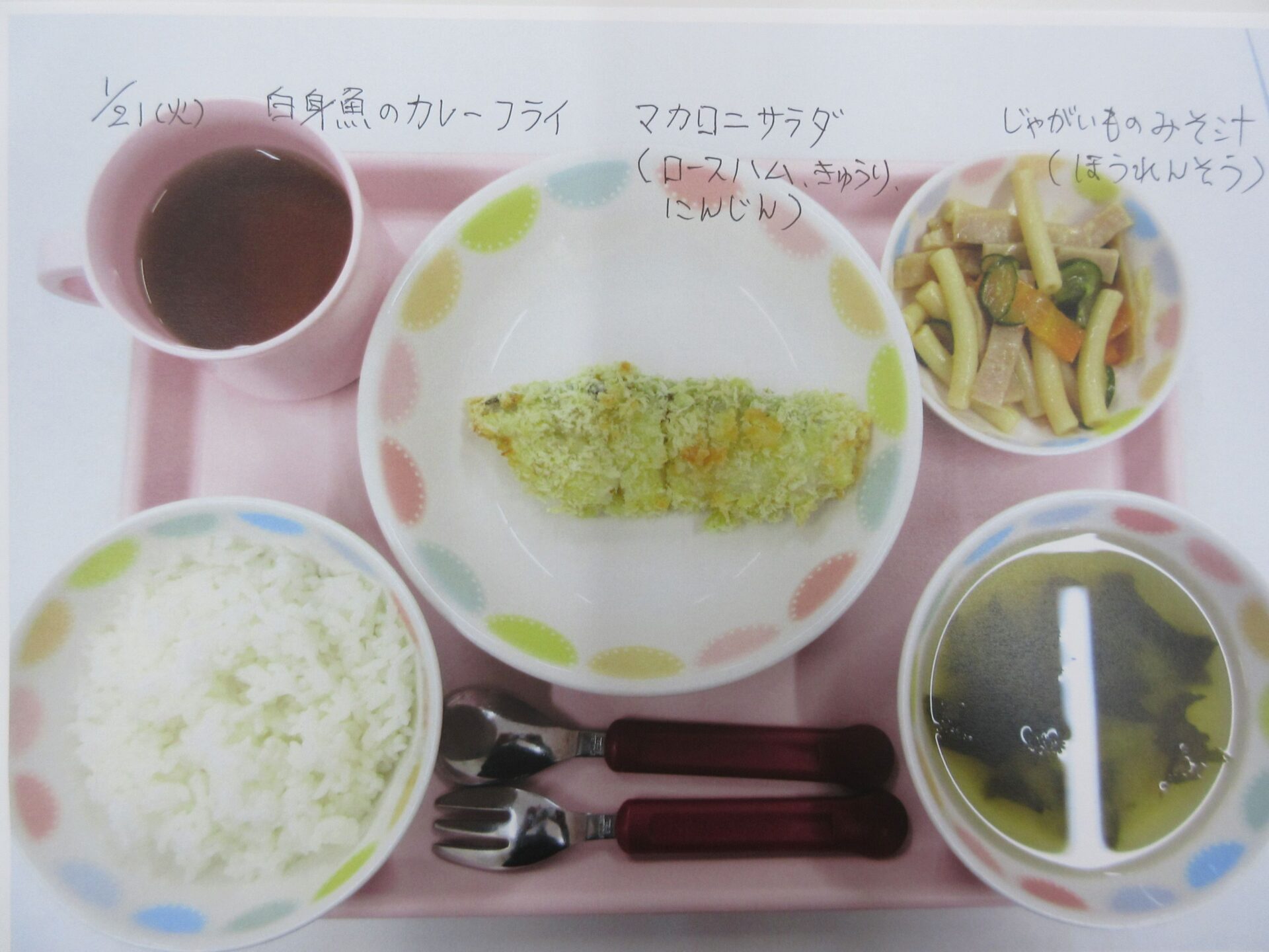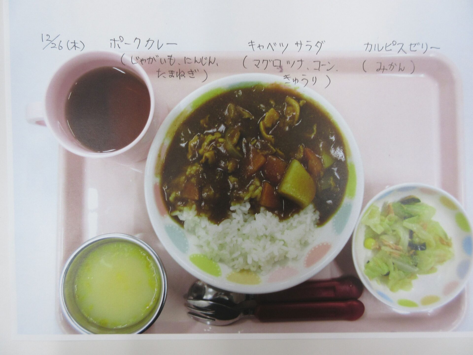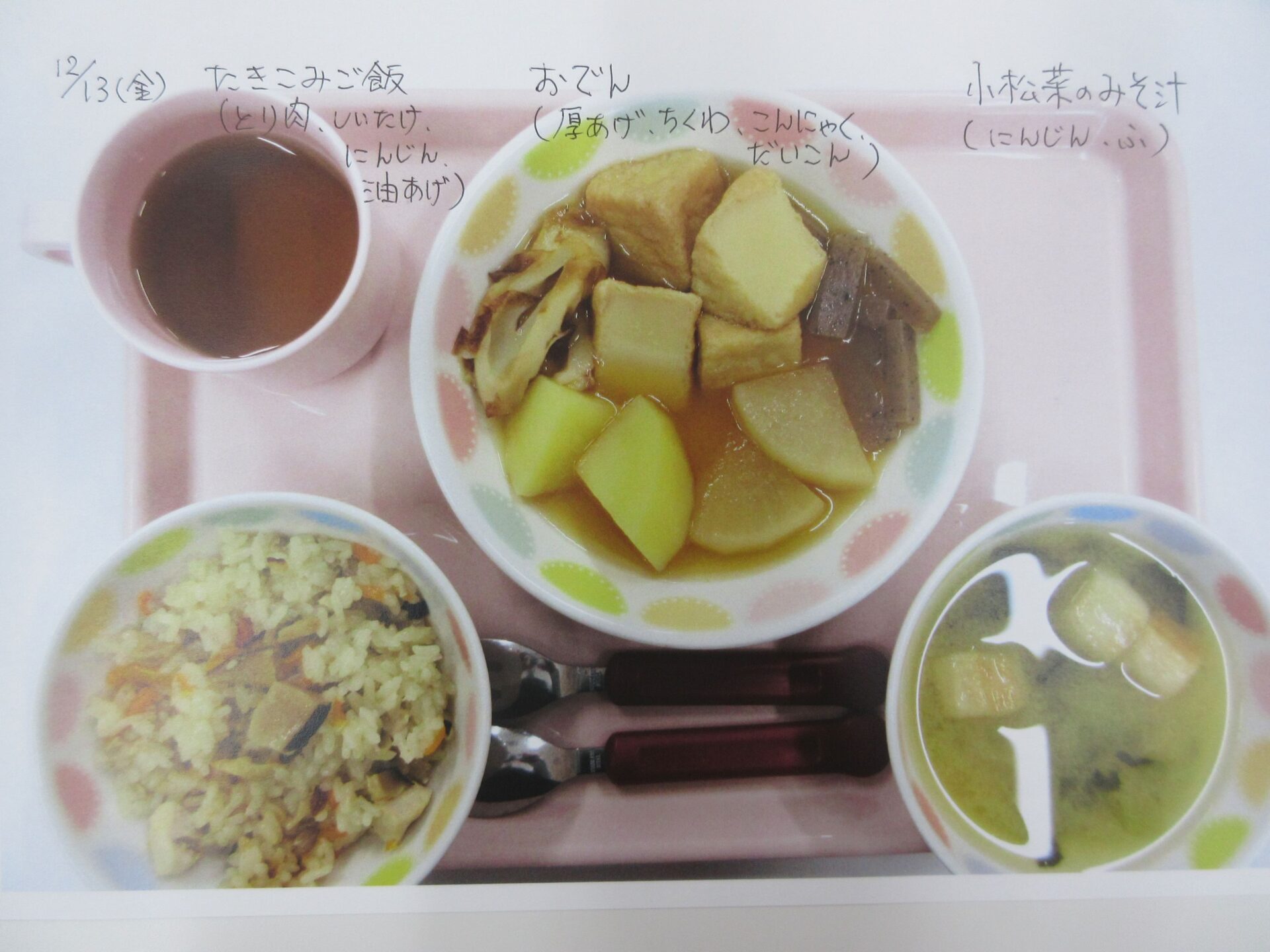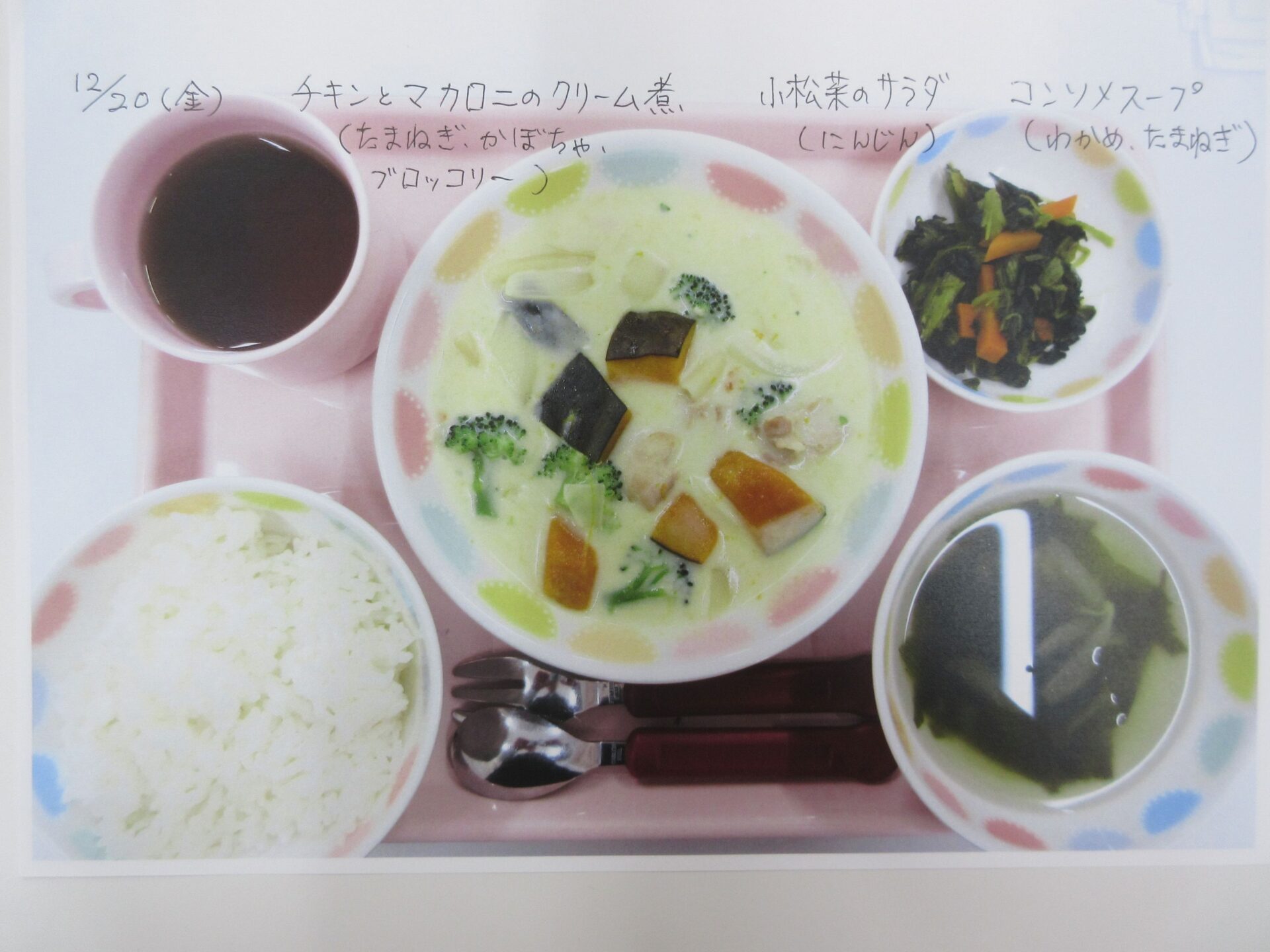 2025.05.28 お知らせ ブログ 給食献立ランキング ベスト20! 昨年12月から3月の献立の人気献立ベスト20を報告します。(1位から20位は、決めていません。) まず、何と言っても大人気、カレーライス!今回は、ポークカレー。チキンカレーの時もありますよ。 これから、とり肉シリーズ。これも人気の「唐揚げ」です。 とり肉のパン粉焼きも、なかなかの美味。ベーコンピラフもうれしい♪ 「とり肉のケチャップ和え」もおいしかったですね。 とり肉シリーズの次は、「照り焼き」です。今回のピラフは、コーンツナピラフでした。 「トマト煮」も、なかなかおいしかったです。とり肉も、いろいろなお料理があるんですね。 「クリームシチュー」もよかったです。パンも、月に1~2回出てきます。 よく似ているけど、こちらは「クリーム煮」。違いは、・・・。(よく似ていました♪) 続いて、どんぶりシリーズ。マーボー丼です。辛さ控えめの優しいお味です。 これは、「中華丼」。どちらの丼もおいしくて、順位をつけがたい。 次に、めん類シリーズ。「みそラーメン」。麺もお出汁も、抜群でした。 「あんかけうどん」、寒い季節には温まりますね。 「スパゲティミートソース」も大好き!ポテサラも、うれしかった。 ここからは、お魚料理シリーズ。「鮭フライのタルタルソース」。タルタルソース、大好き!いろいろなものにかけて食べたいな♪ 「サバのみそ煮」。和風の献立ですね。 「揚げ魚のみぞれ煮」、大根でさっぱり味になっていました。 「白身魚のカレーフライ」。おいしかったけど、カレーライスが食べたくなりました。 寒い季節に、温かい「おでん」。最高です。炊き込みご飯も、おいしかったですよ。 「煮込みハンバーグ」、とても美味しかったです。次は、もう少し大きいのがいいな~♪ 最後は、「ホイコーロー」。ご飯が進む、いいお味でした。調理員の皆さん、いつもおいしい給食、ありがとうございます! 一覧へ戻る