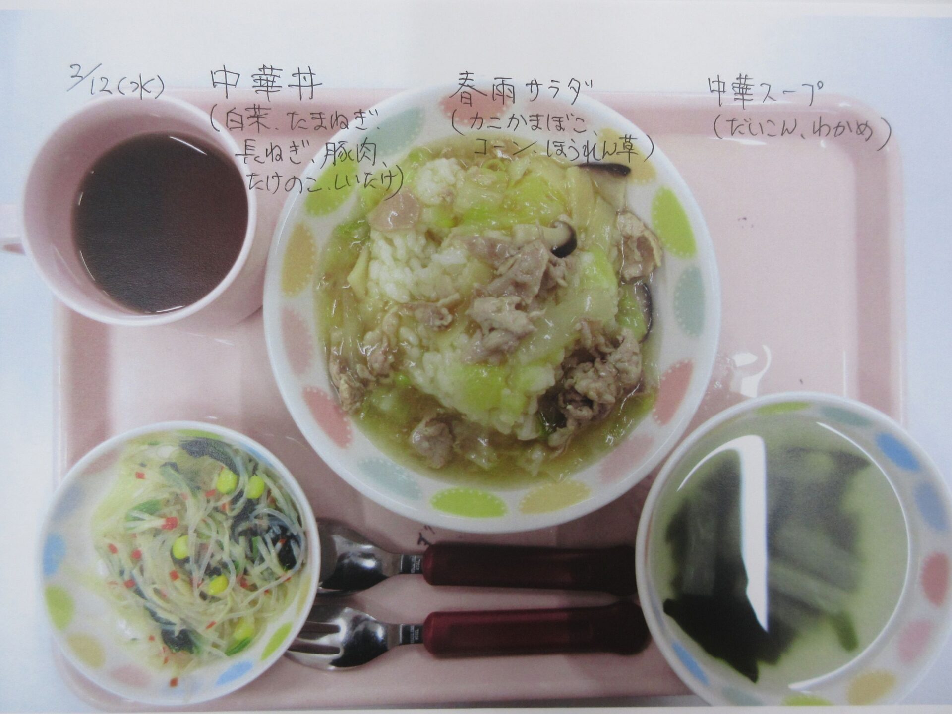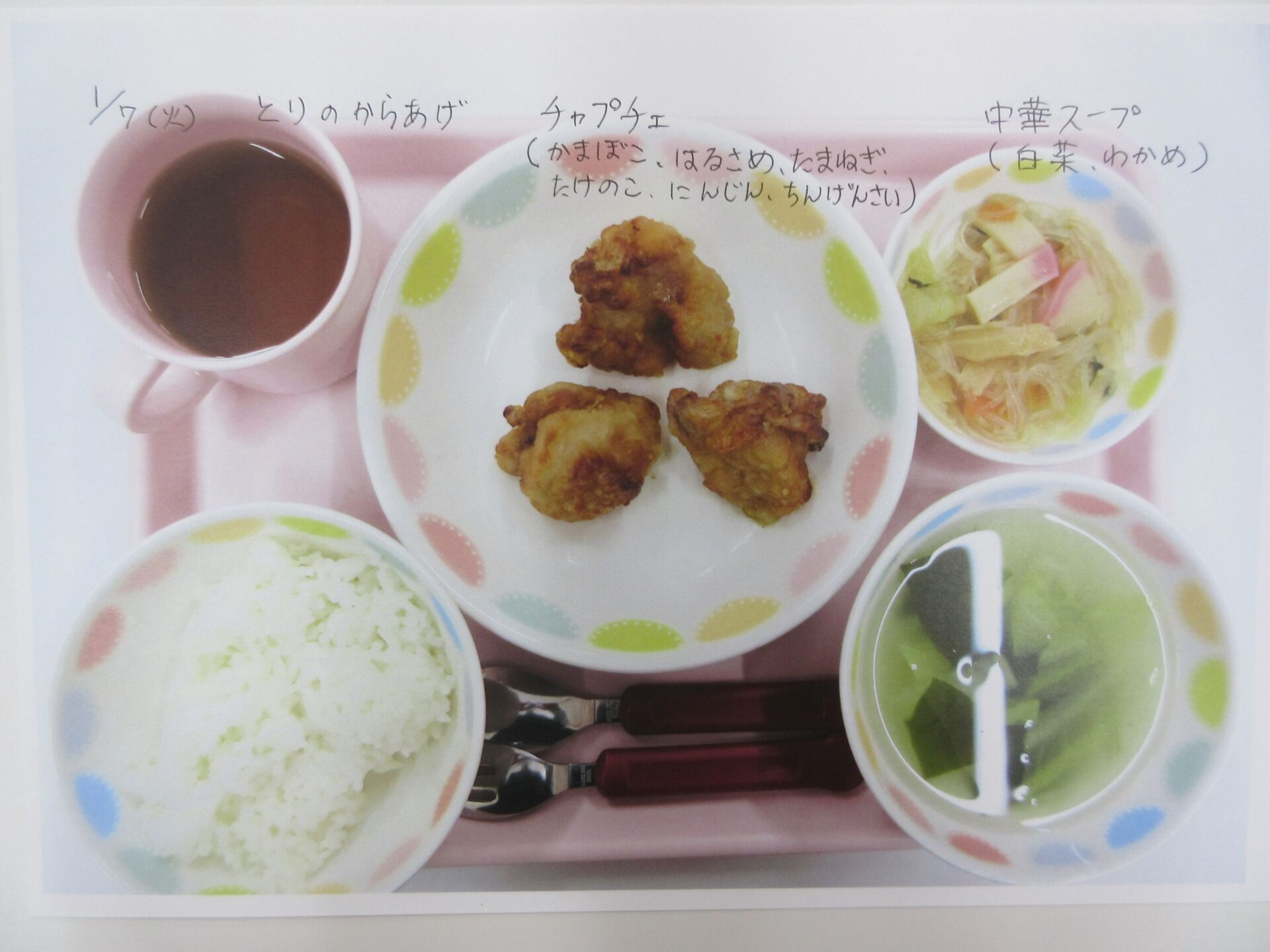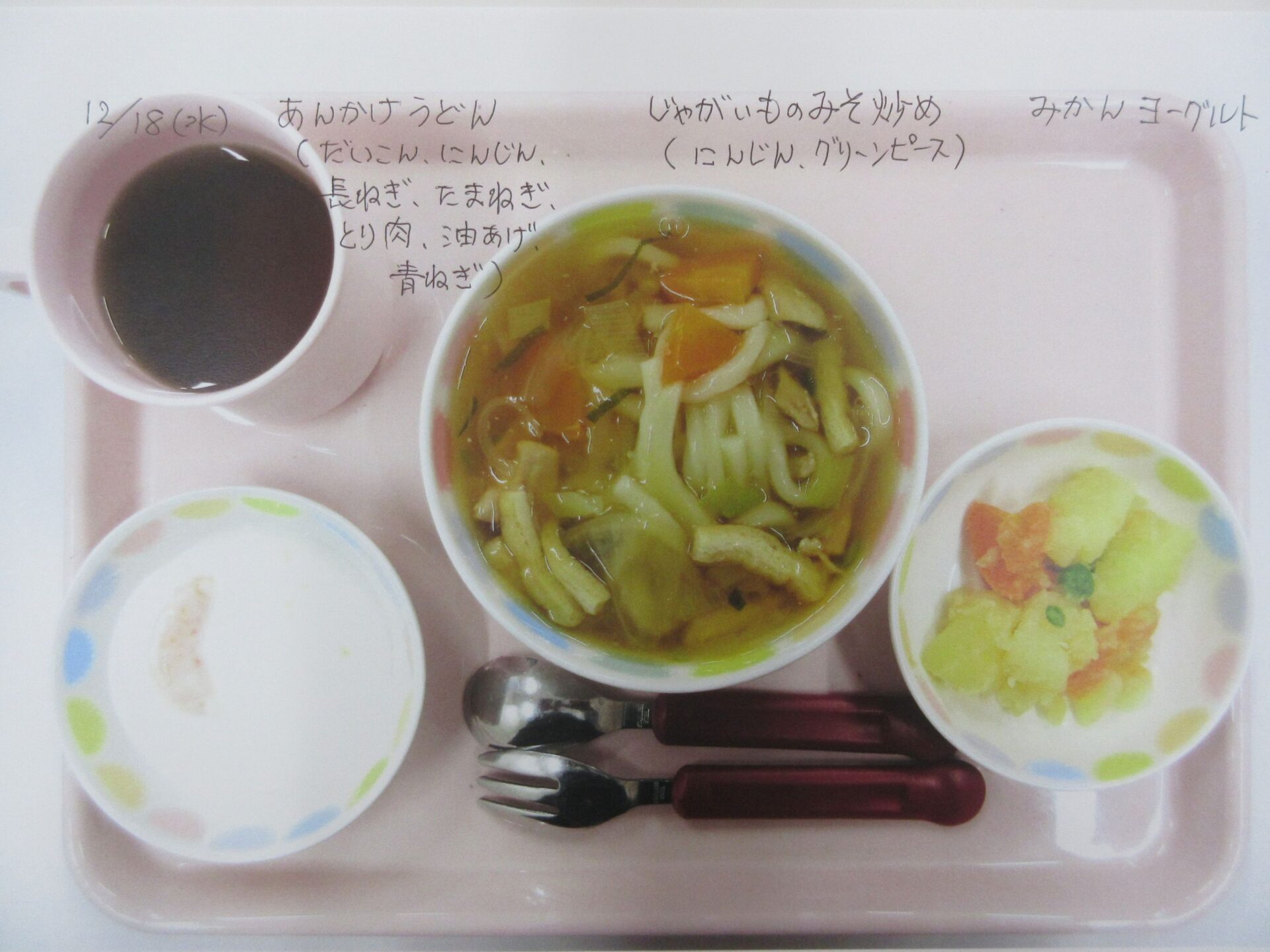 2025.05.28 お知らせ ブログ 給食献立ランキング ベスト20! 昨年12月から3月の献立の人気献立ベスト20を報告します。(1位から20位は、決めていません。) まず、何と言っても大人気、カレーライス!今回は、ポークカレー。チキンカレーの時もありますよ。 これから、とり肉シリーズ。これも人気の「唐揚げ」です。 とり肉のパン粉焼きも、なかなかの美味。ベーコンピラフもうれしい♪ 「とり肉のケチャップ和え」もおいしかったですね。 とり肉シリーズの次は、「照り焼き」です。今回のピラフは、コーンツナピラフでした。 「トマト煮」も、なかなかおいしかったです。とり肉も、いろいろなお料理があるんですね。 「クリームシチュー」もよかったです。パンも、月に1~2回出てきます。 よく似ているけど、こちらは「クリーム煮」。違いは、・・・。(よく似ていました♪) 続いて、どんぶりシリーズ。マーボー丼です。辛さ控えめの優しいお味です。 これは、「中華丼」。どちらの丼もおいしくて、順位をつけがたい。 次に、めん類シリーズ。「みそラーメン」。麺もお出汁も、抜群でした。 「あんかけうどん」、寒い季節には温まりますね。 「スパゲティミートソース」も大好き!ポテサラも、うれしかった。 ここからは、お魚料理シリーズ。「鮭フライのタルタルソース」。タルタルソース、大好き!いろいろなものにかけて食べたいな♪ 「サバのみそ煮」。和風の献立ですね。 「揚げ魚のみぞれ煮」、大根でさっぱり味になっていました。 「白身魚のカレーフライ」。おいしかったけど、カレーライスが食べたくなりました。 寒い季節に、温かい「おでん」。最高です。炊き込みご飯も、おいしかったですよ。 「煮込みハンバーグ」、とても美味しかったです。次は、もう少し大きいのがいいな~♪ 最後は、「ホイコーロー」。ご飯が進む、いいお味でした。調理員の皆さん、いつもおいしい給食、ありがとうございます! 一覧へ戻る
