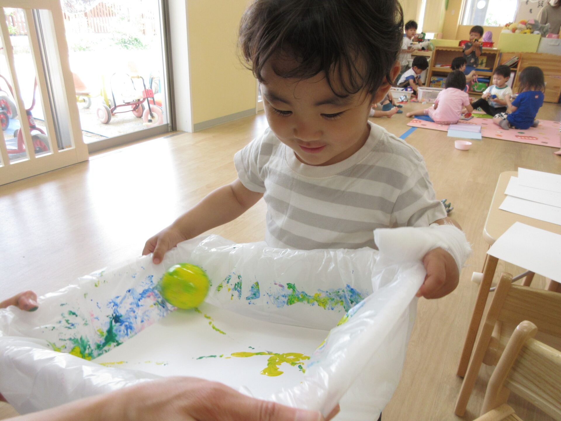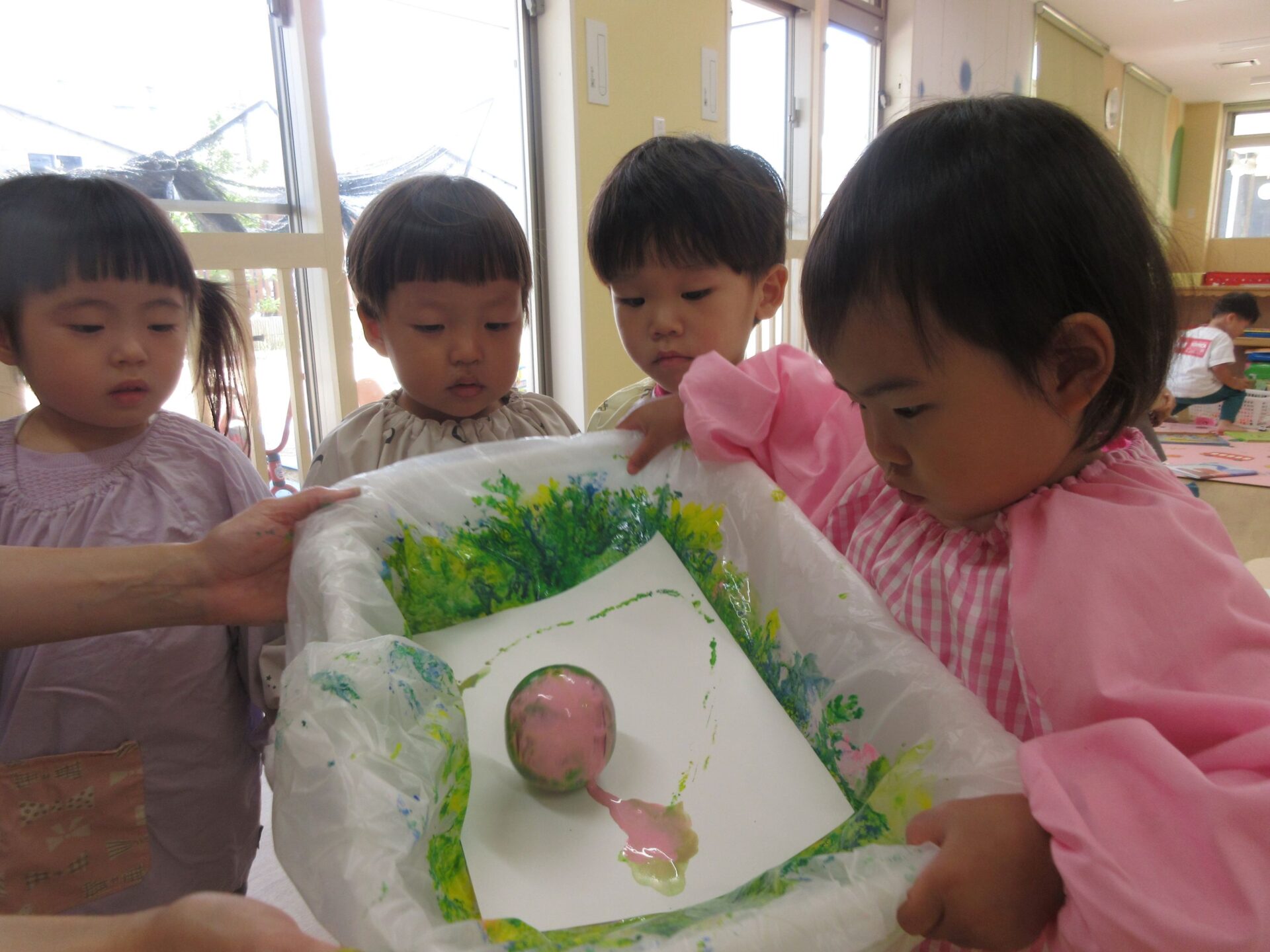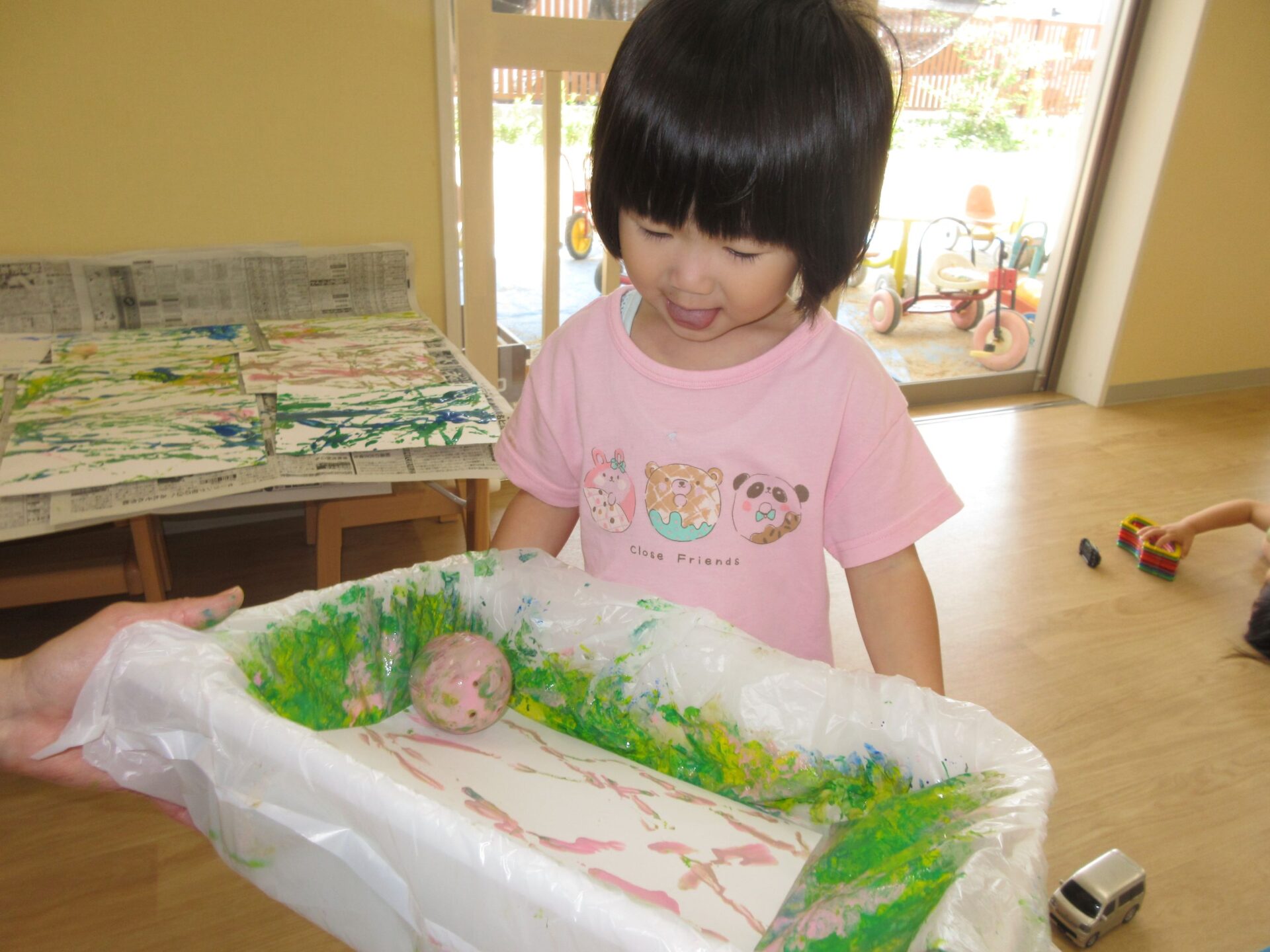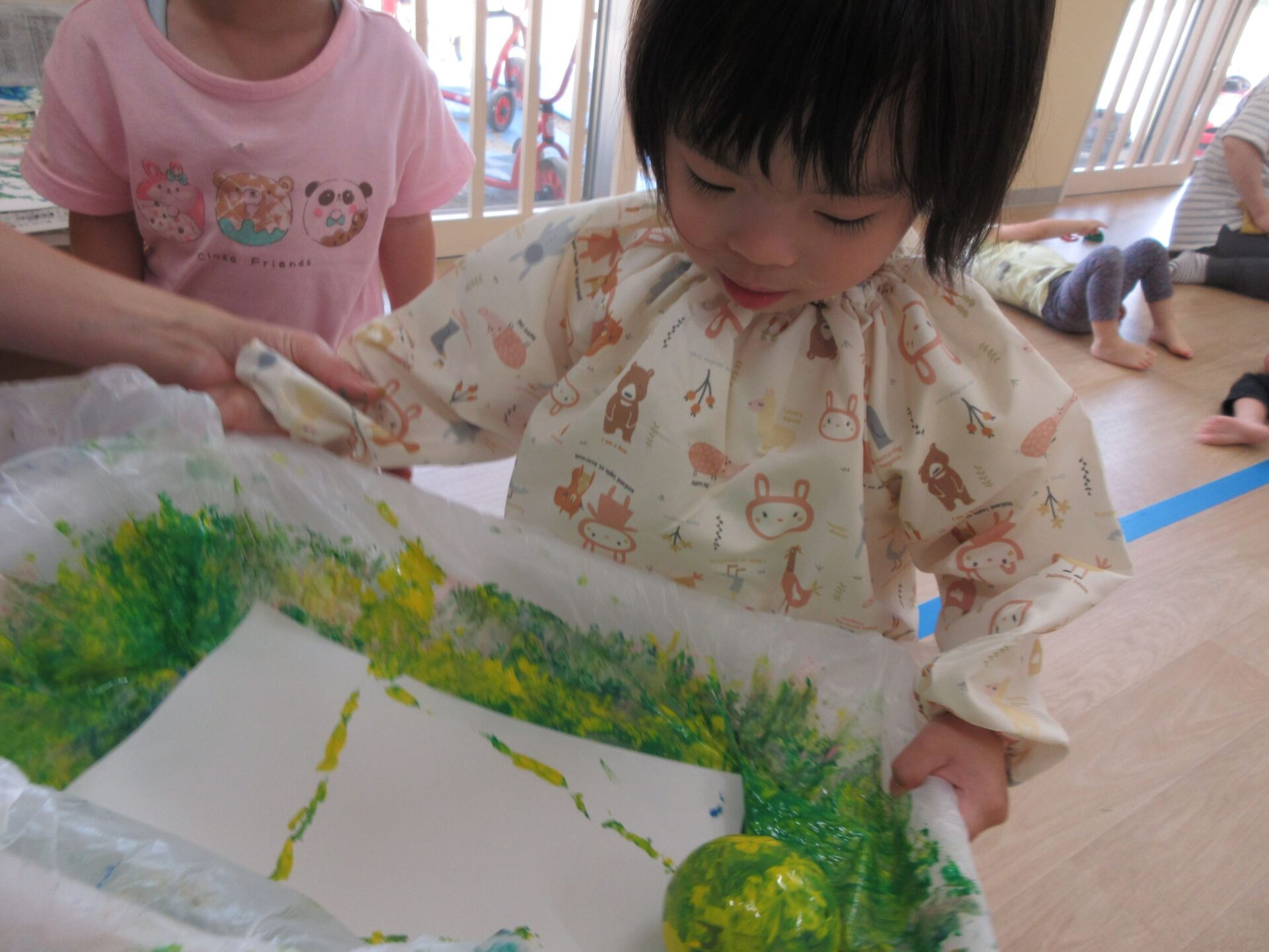2025.05.30 お知らせ ブログ ころころしたよ!(2歳あめ組) 5月20日(火曜日)大きな箱とガチャガチャのカプセルを使って、ころころ製作をしました! きいろ、みどり、あお、ピンク・・・その中から自分で好きな色を選びました! 箱の中からカプセルが落っこちないようにコロコロ~ なかなか転がらなくて大きく傾けてみたり・・・ カラフルな模様ができてきて、嬉しそうな子どもたち😊 真剣に製作をしていると・・・👀 順番待ちしている友だちがたくさん集まってきました😆 たくさんころころできたね! 今回の製作も楽しかったね!これからもいろんな製作を楽しもうね🤩 一覧へ戻る