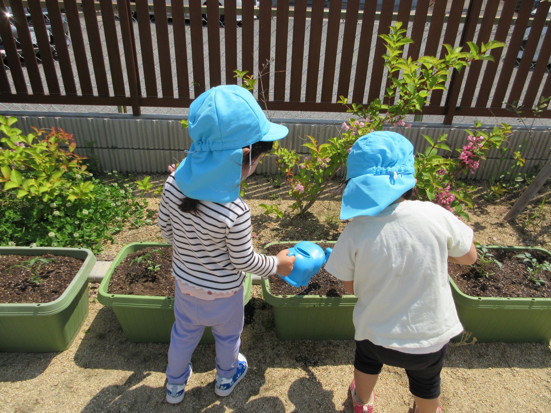 毎日子どもたちから、「おみずやりしよー」と声があがります(⌒∇⌒)