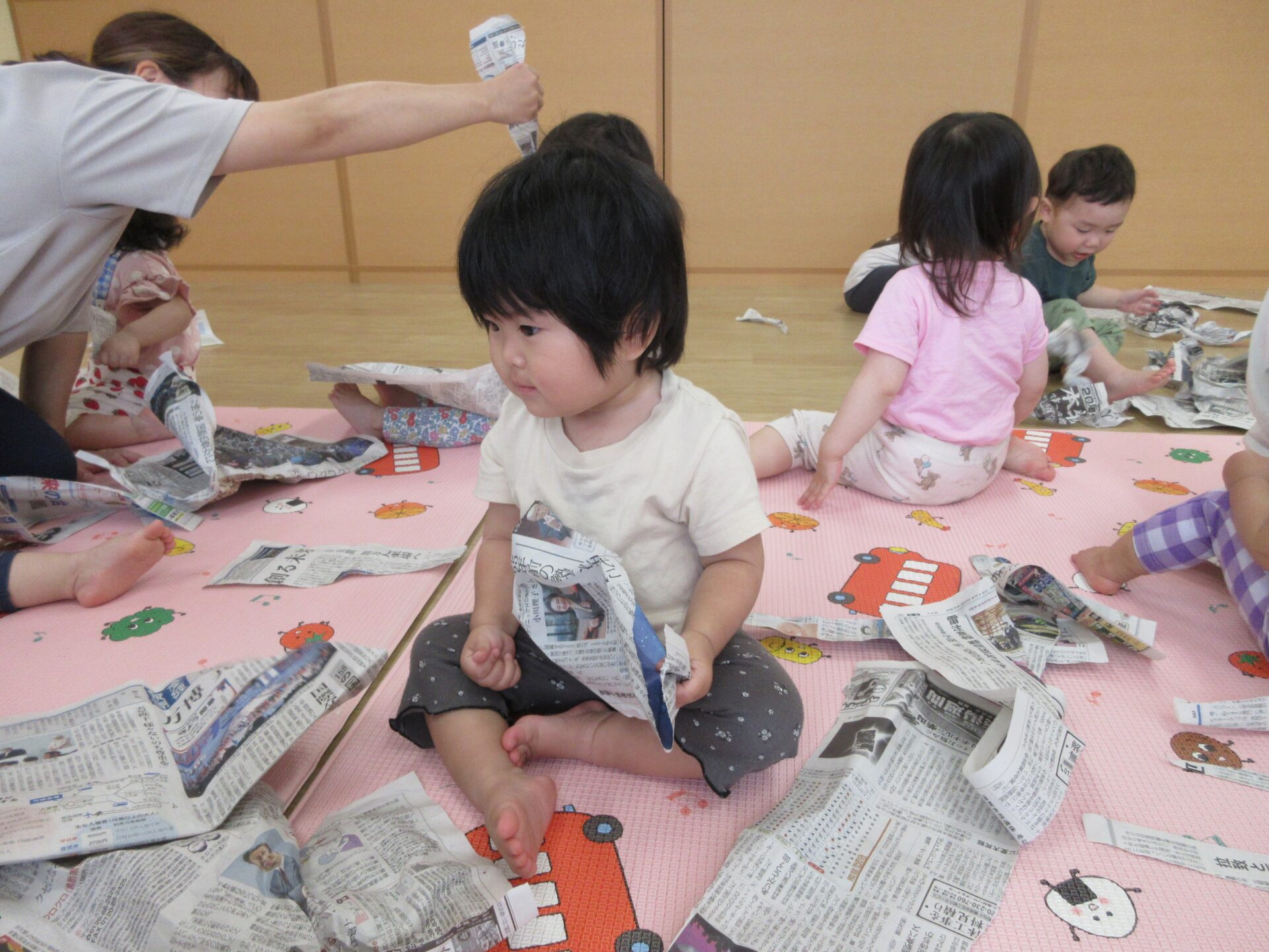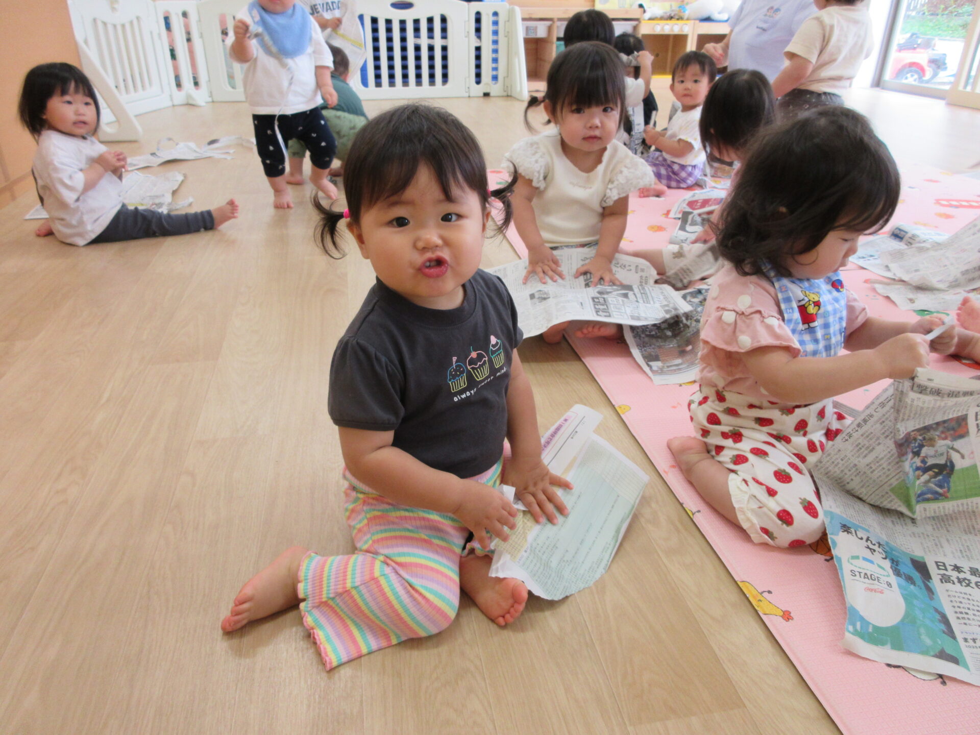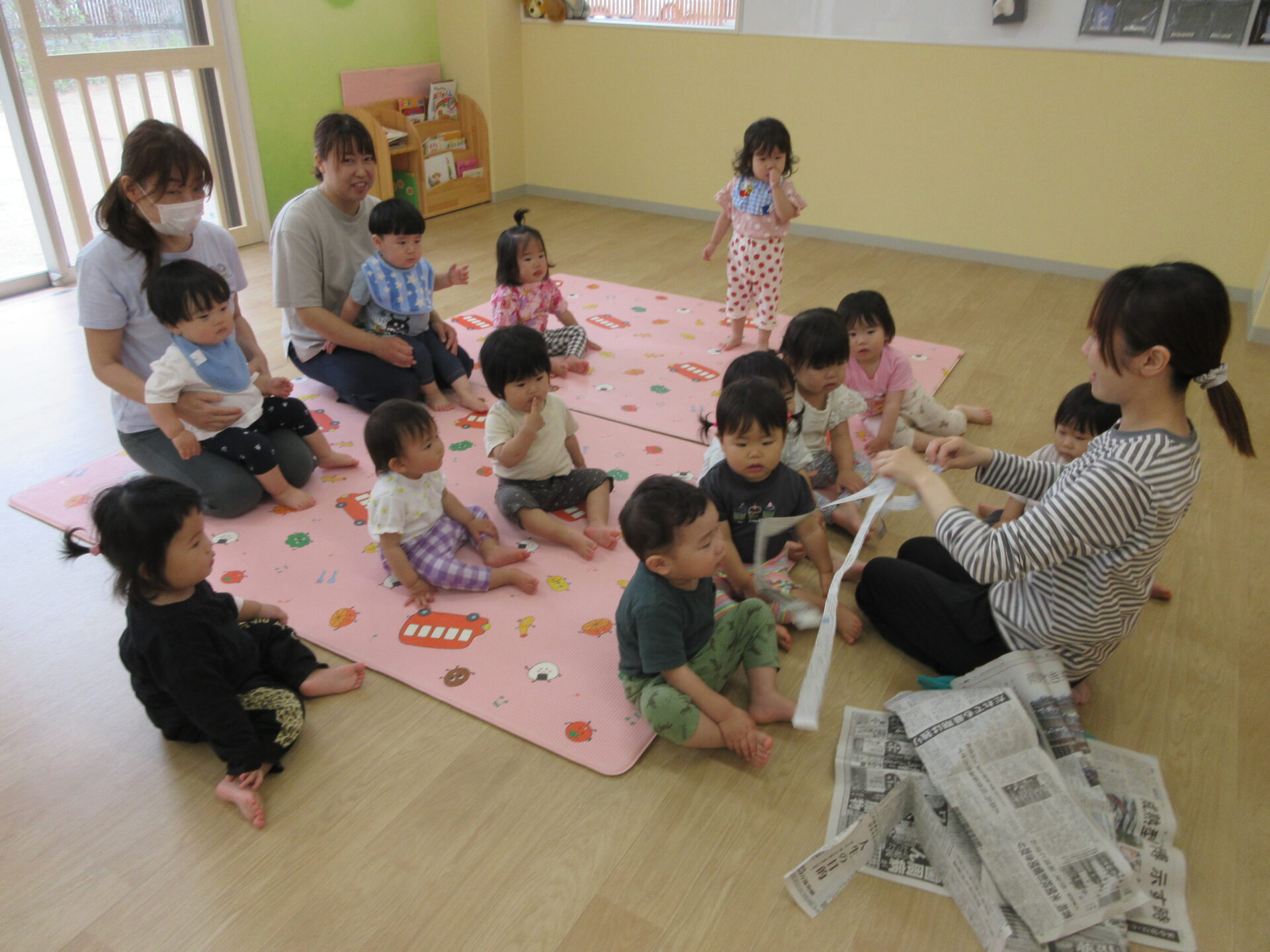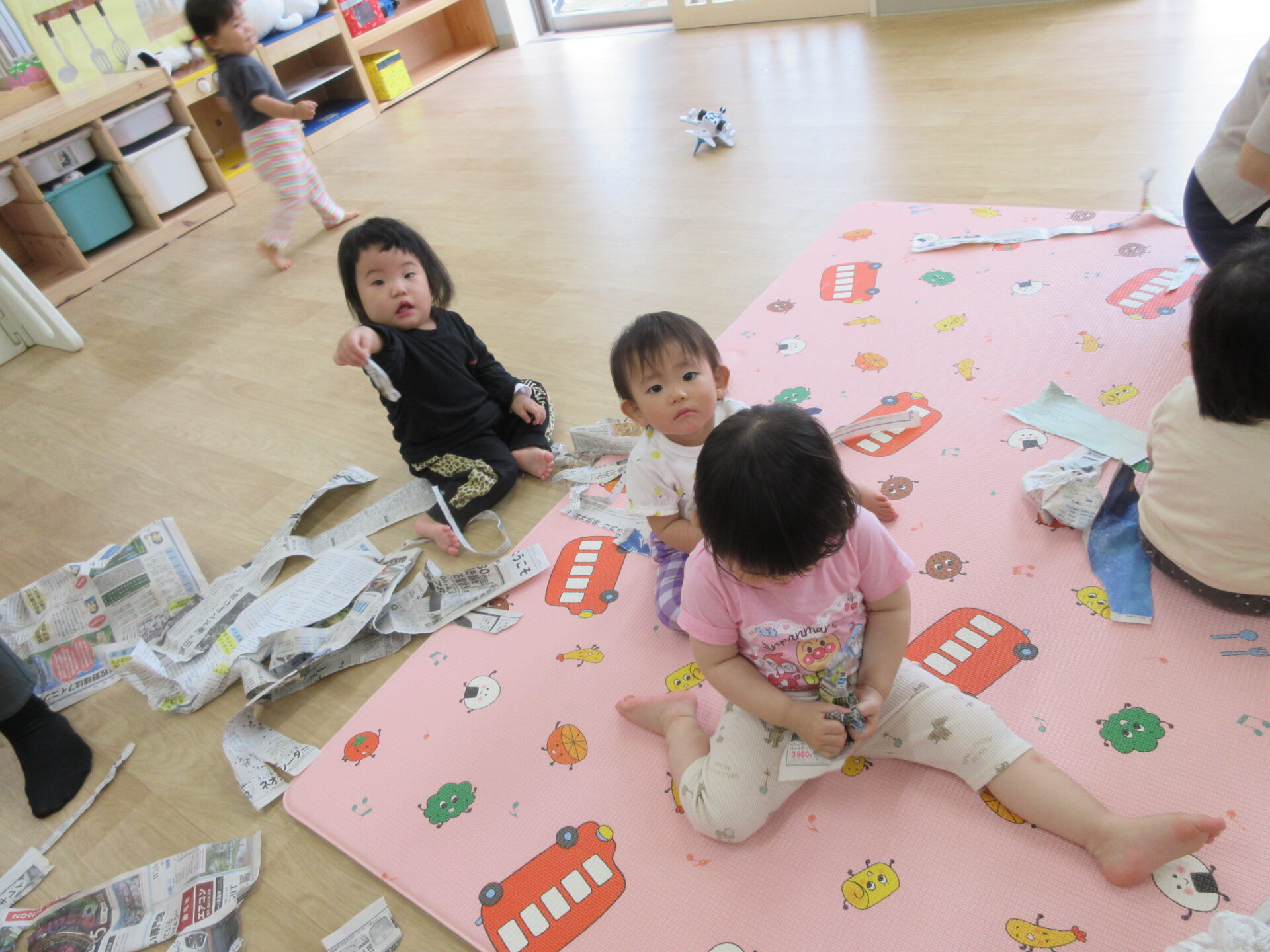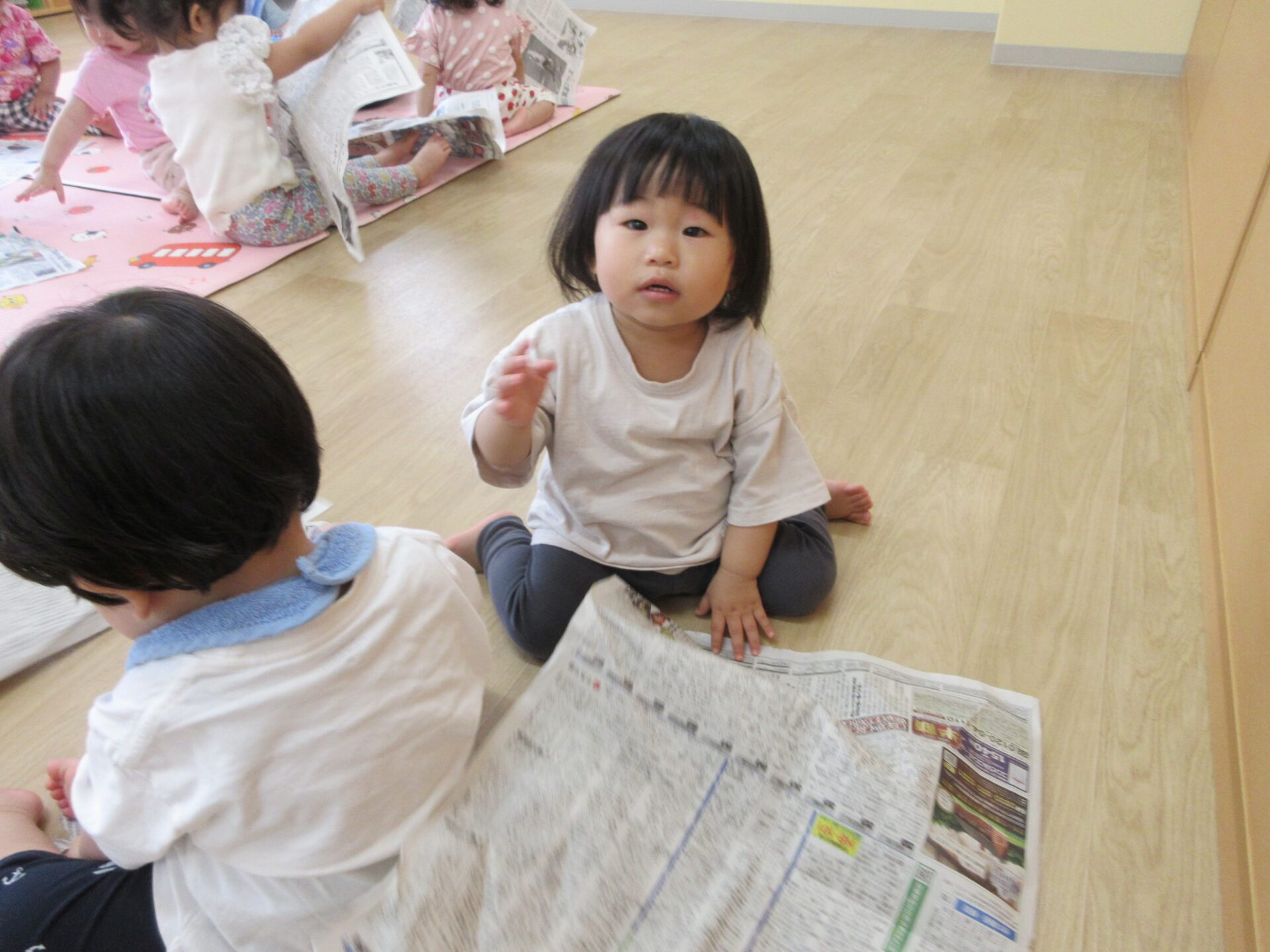 2025.06.04 お知らせ ブログ ビリビリ☆新聞紙遊び (1歳 だいちぐみ) 6月3日(火)雨が降っている日は室内で過ごしているので、新聞紙遊びをしました!先生の話を聞いて新聞紙に興味津々な様子の子どもたち。 先生、見ててね~ ビリビリビリ~ 見て見て~!何か書いているよ~! 手を使って、くるくると丸めることもできます! 新聞紙を蛇に見立てて子どもたちに見せると、大喜び!「待て待て~」と追いかけていましたよ♪ リボンを作って、つけてもらったよ☆ 楽しく遊びましたよ♪ 一覧へ戻る
