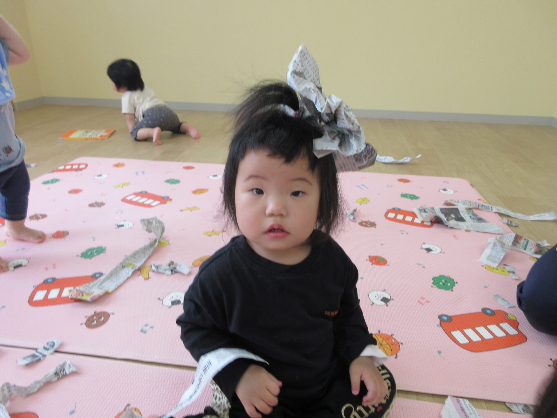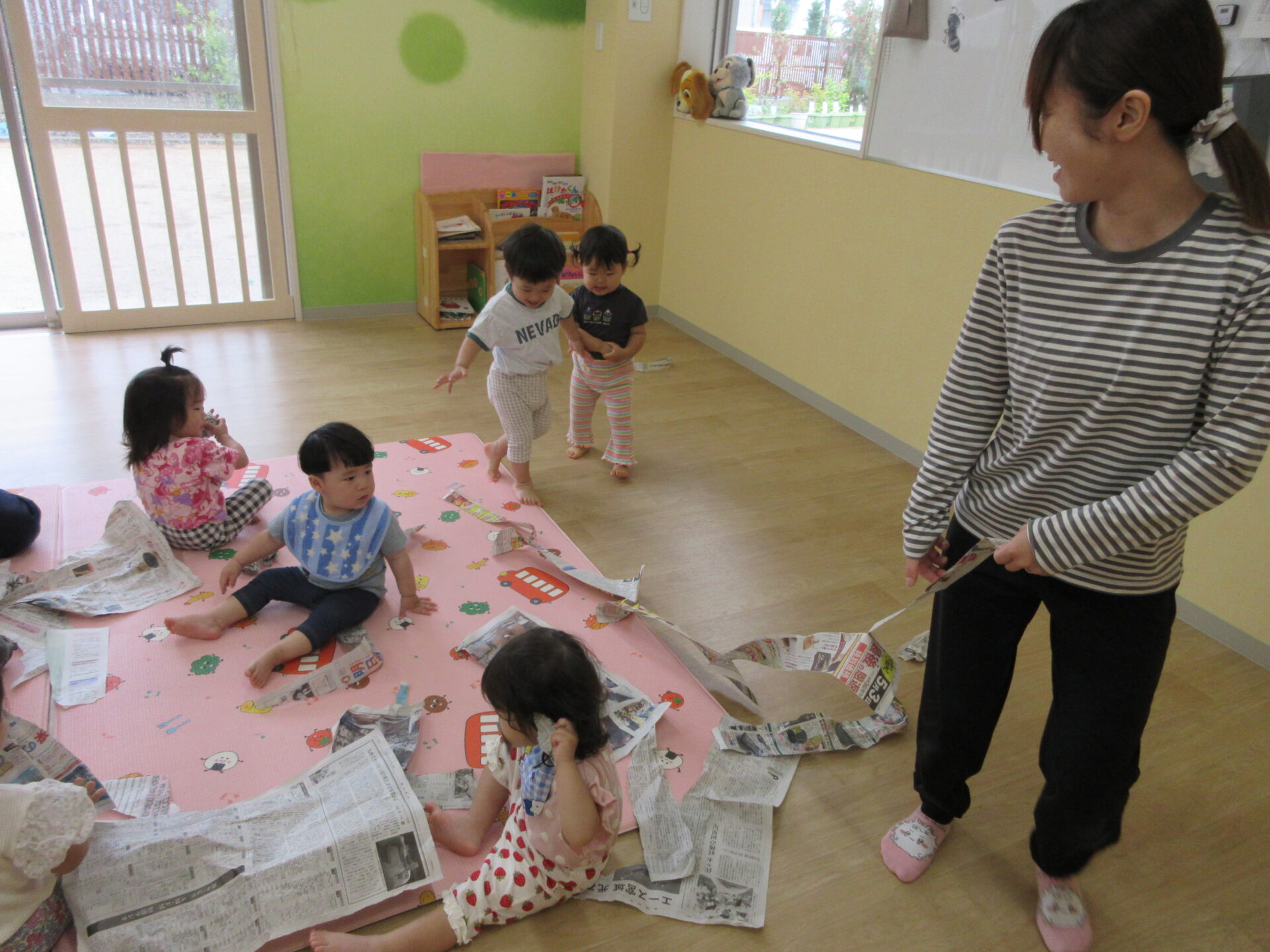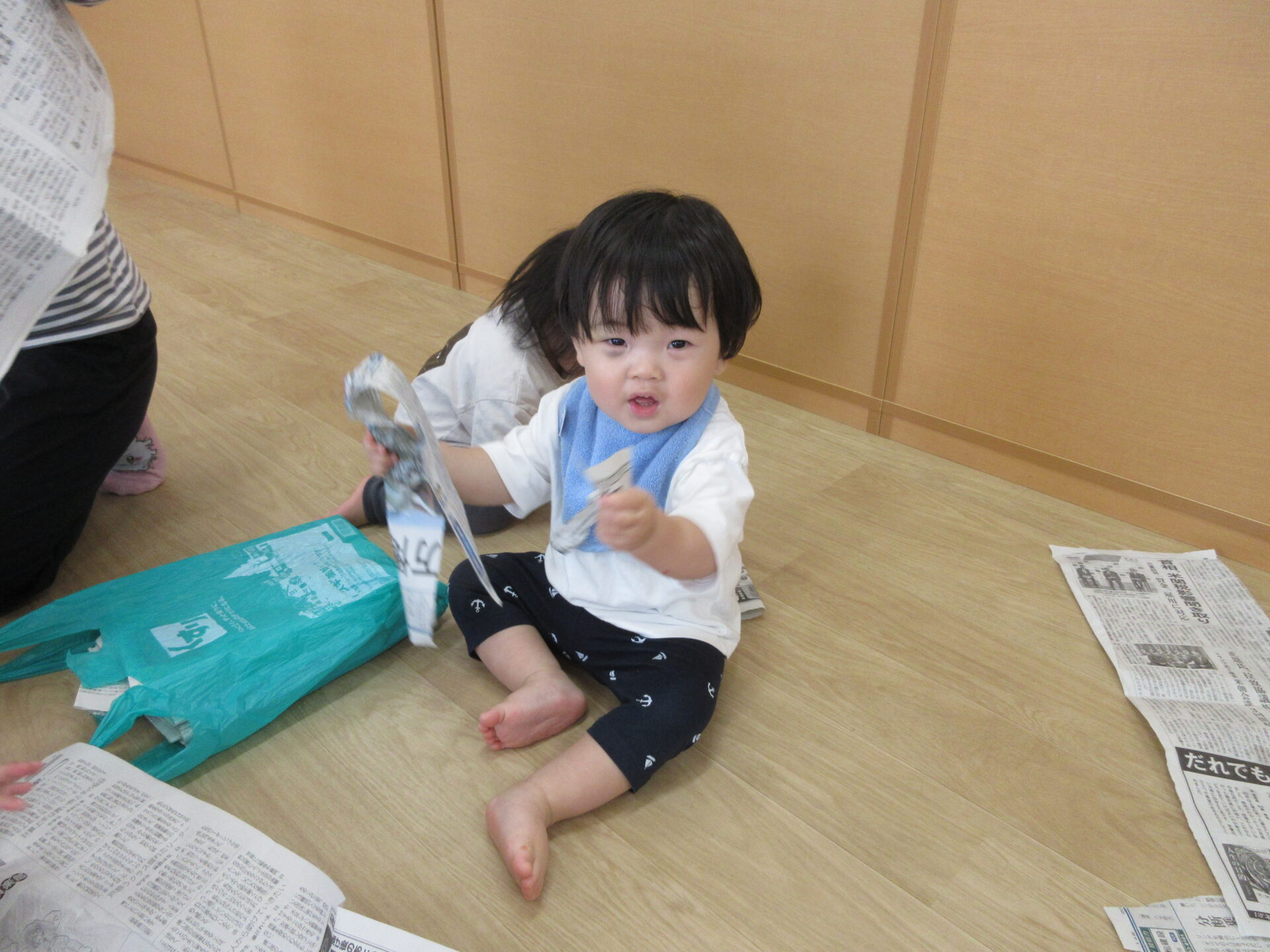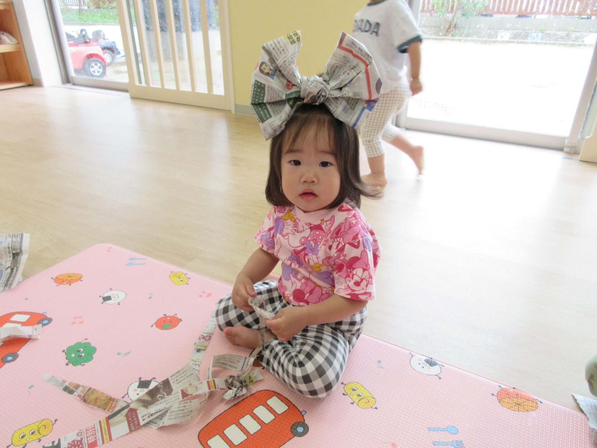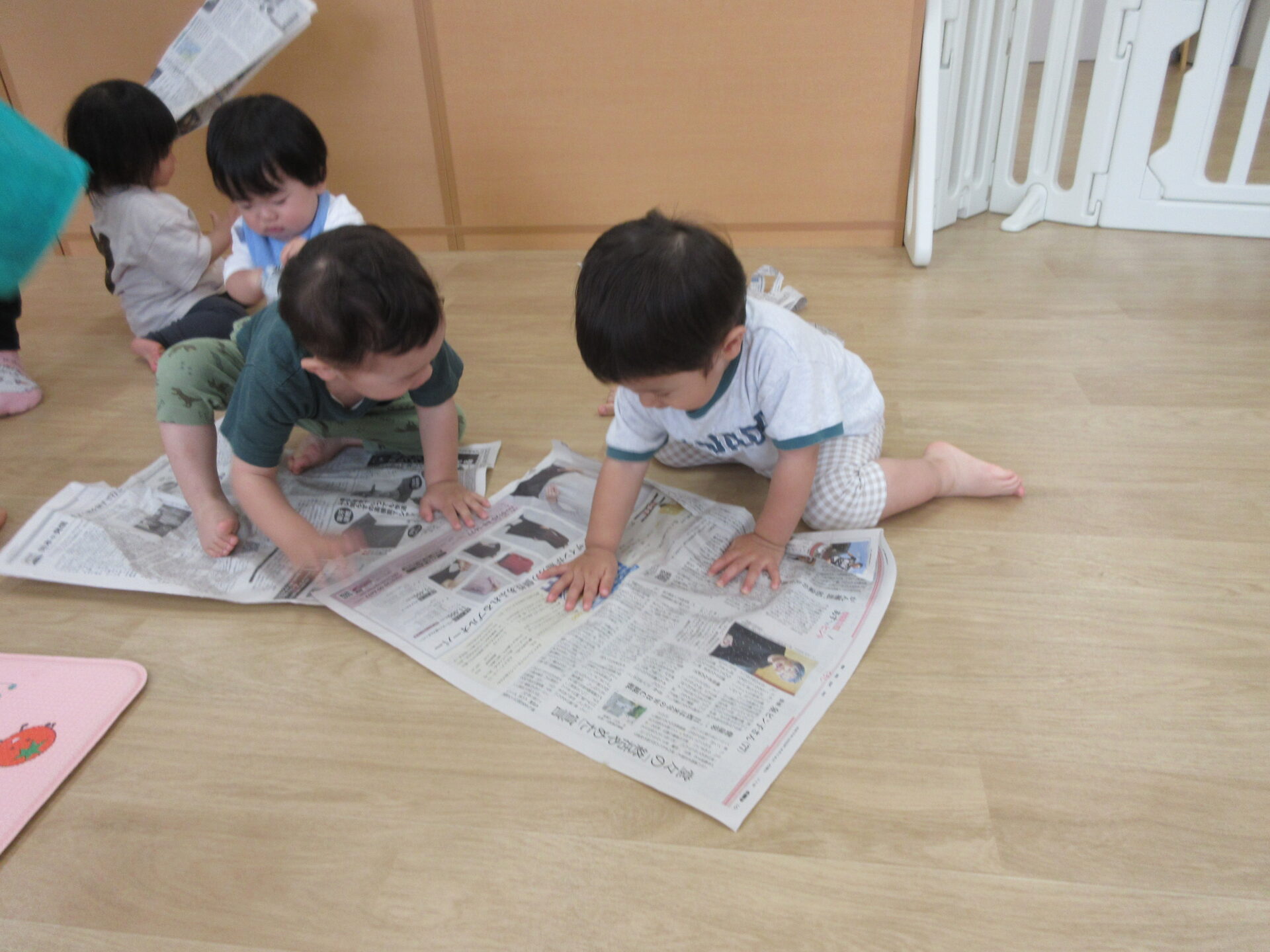2025.06.04 お知らせ ブログ ビリビリ☆新聞紙遊び (1歳 だいちぐみ) 6月3日(火)雨が降っている日は室内で過ごしているので、新聞紙遊びをしました!先生の話を聞いて新聞紙に興味津々な様子の子どもたち。 先生、見ててね~ ビリビリビリ~ 見て見て~!何か書いているよ~! 手を使って、くるくると丸めることもできます! 新聞紙を蛇に見立てて子どもたちに見せると、大喜び!「待て待て~」と追いかけていましたよ♪ リボンを作って、つけてもらったよ☆ 楽しく遊びましたよ♪ 一覧へ戻る