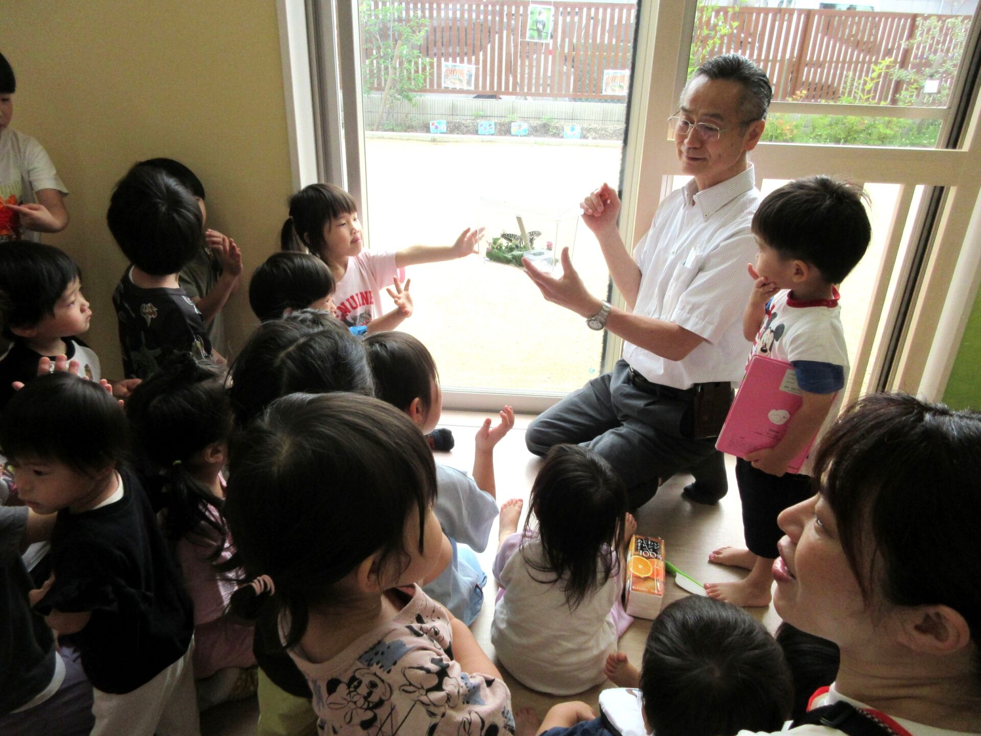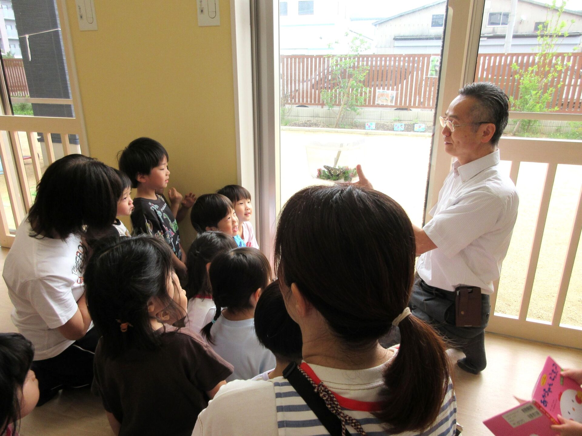2025.06.13 お知らせ ブログ アゲハチョウを放したよ♪ アゲハチョウの幼虫をいただいて育てていました。あおむし→さなぎ→アゲハチョウになりました。みんな、びっくり! 雨が続いていたので、ケースの中で育てていましたが、雨が止んだ6月12日(木)の朝、外へ放しました。 朝の合同保育の時間に、1歳だいち組のお部屋で。 みんなで、「さようなら、元気でね。」とお別れを言いました。 元気に飛んでいきました。 元気でね! 一覧へ戻る
