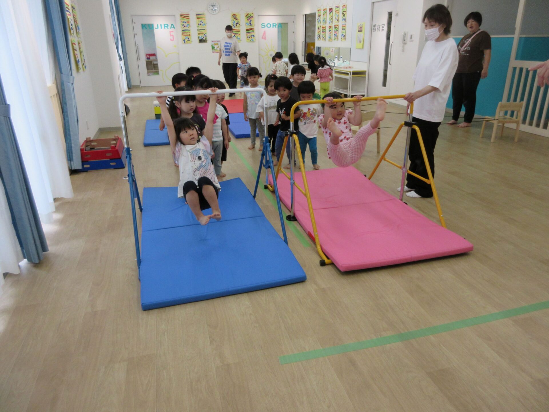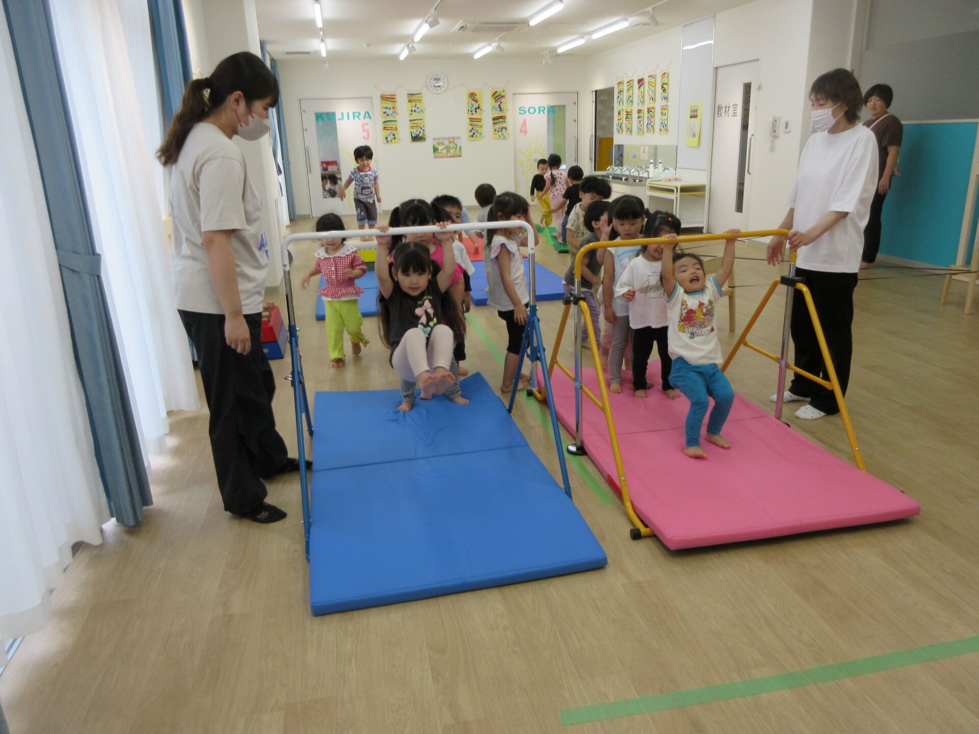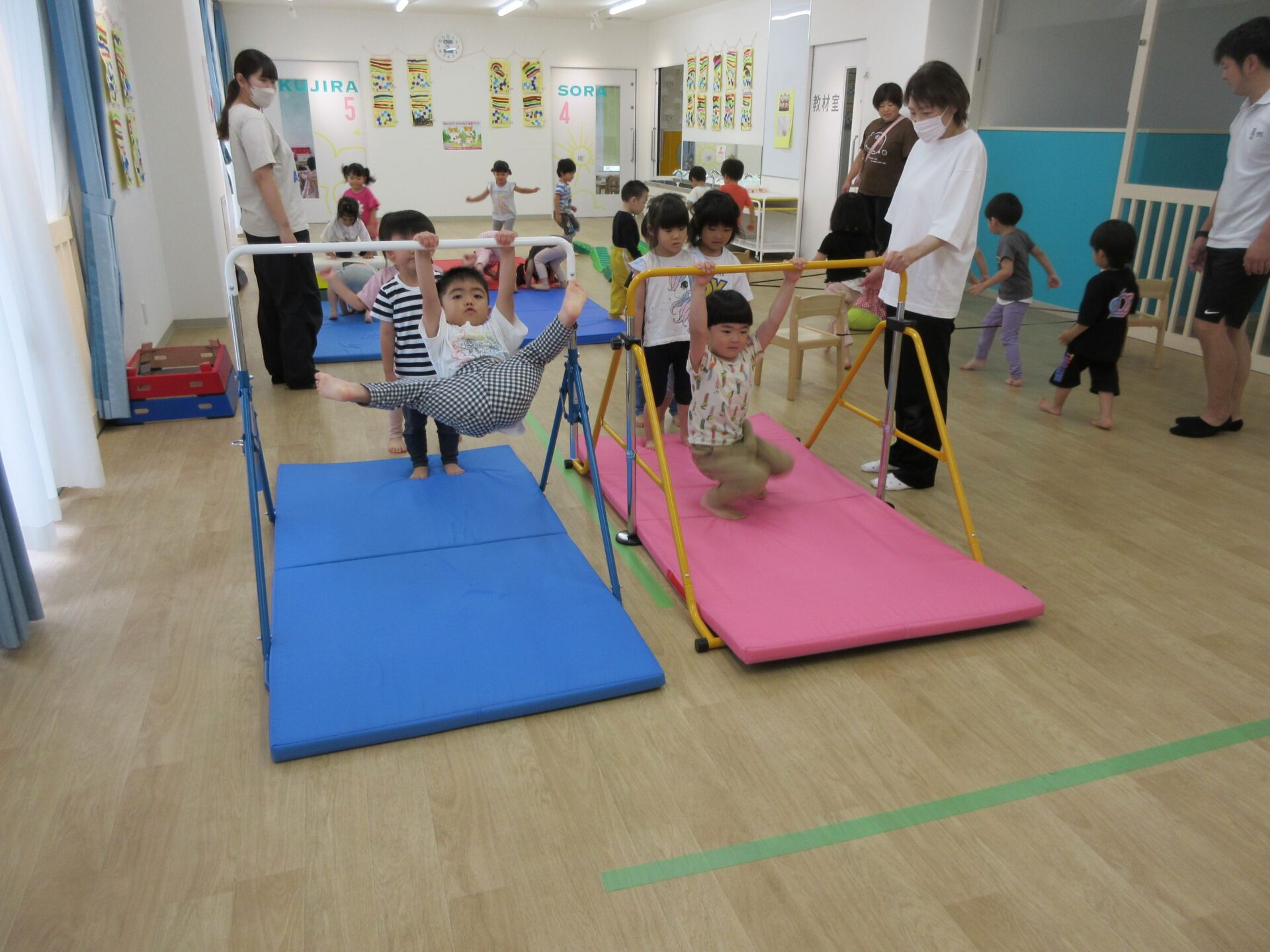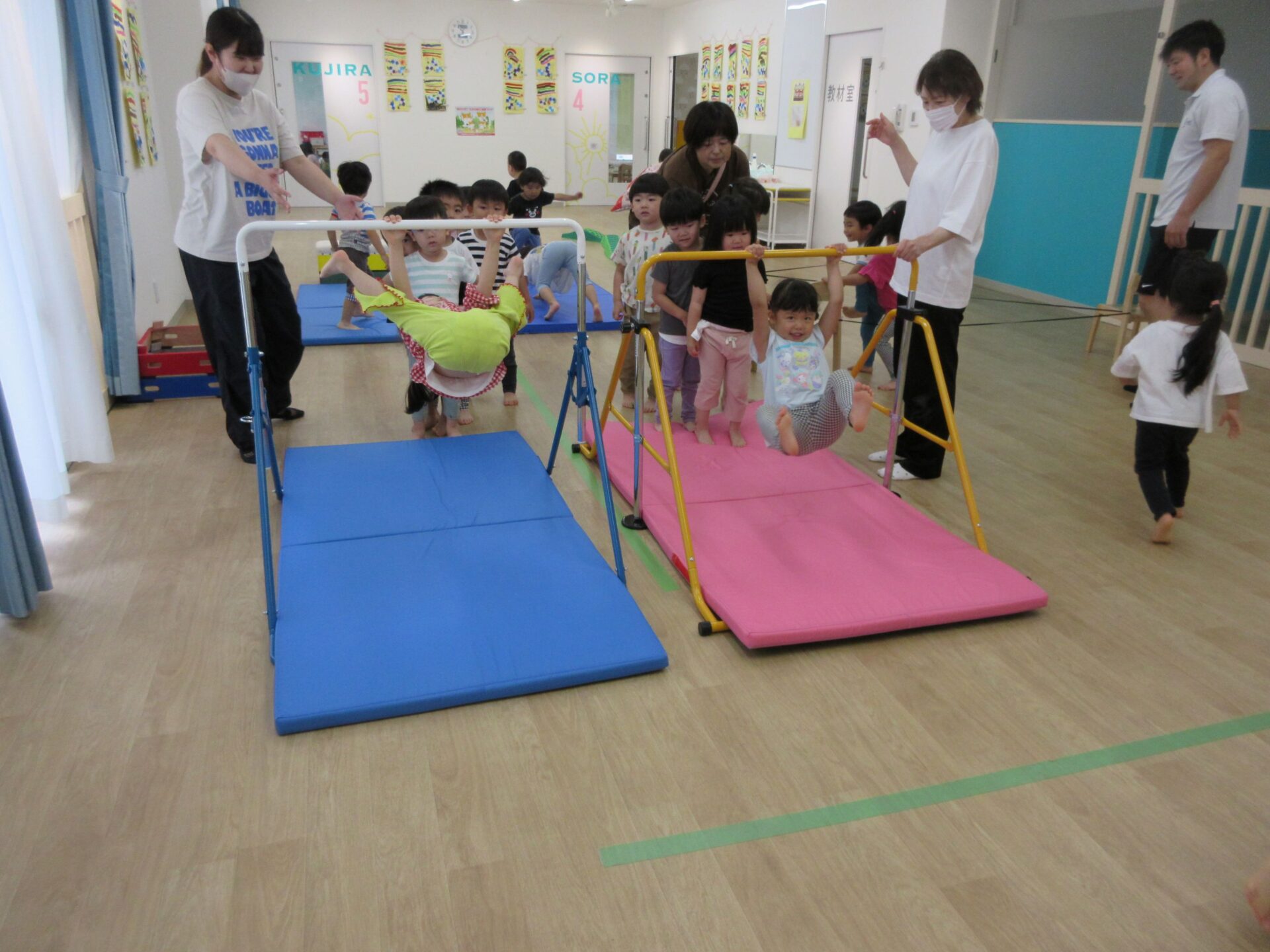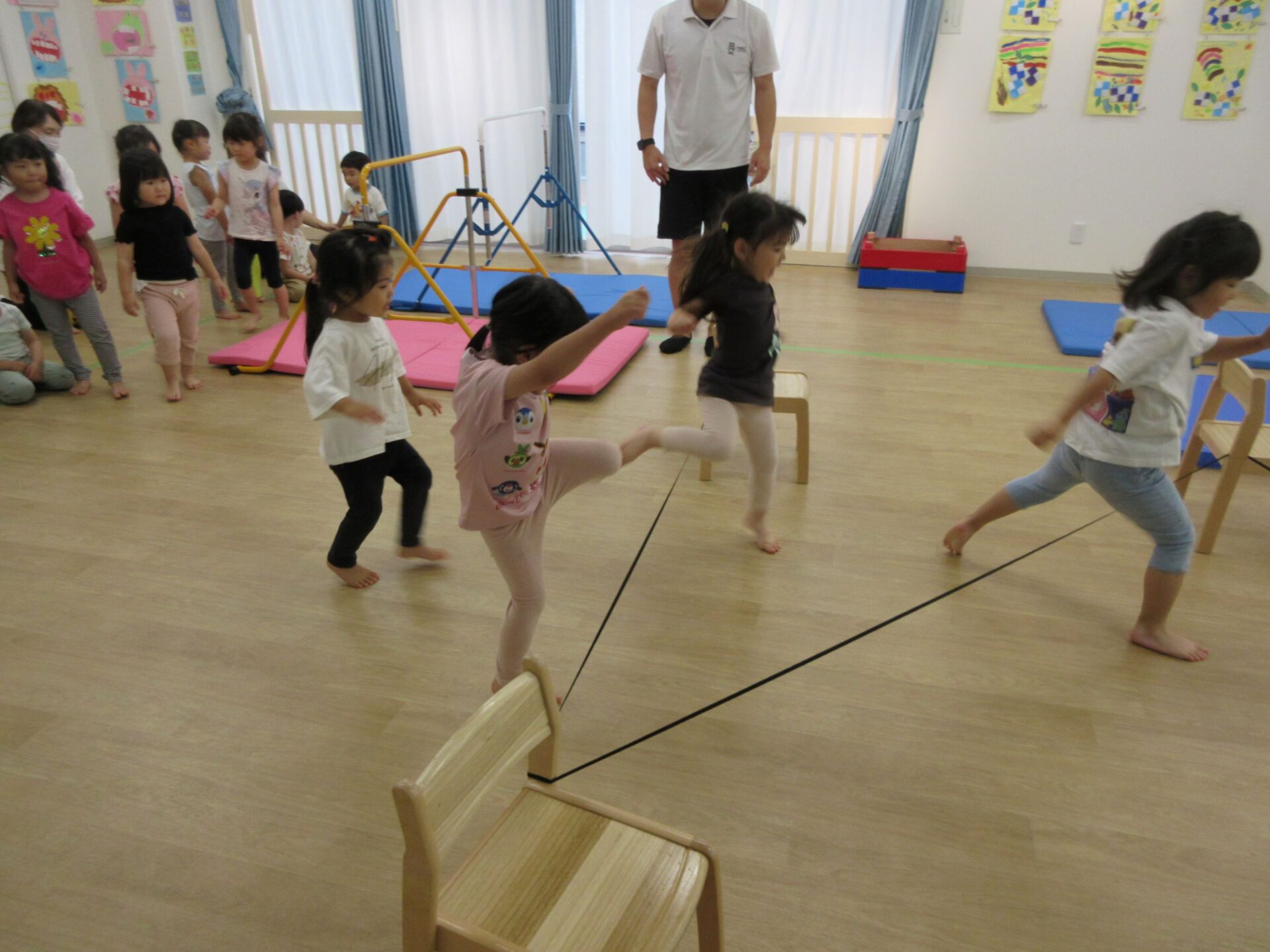 2025.06.16 お知らせ ブログ 6月の運動あそび(2歳あめ組、3歳にじ組) 6月11日(水)、朝から村上先生に来ていただいて運動遊び教室をしました。 前半は、2歳あめ組です。 鉄棒遊びの説明を聞いています。 ゴムの障害物をくぐって進みます。 かなりのスピードでした!「みんな、速いね♪」 バランスをとりながら一本橋渡り。マットは、後ろ向きでのくまさん歩き、跳び箱からのジャンプ! 3回目とは思えない上手さです! しっかりと、つかまって・・。 脚をバタバタ。 何度も楽しみます。 楽しくできていましたよ。 先生もお手本を見せてくれました。すごく注目です。 後半の3歳にじ組がスタート。 お友だちがお手本です。 ゴムの障害物を跳び越えます。 上手に跳び越えています。 ちゃんと並んで、順番を待ちます。 しっかりとバランスがとれていますね。 それっ!ジャ~ンプ! しっかりとぶらさがれていますよ。 みんなの前で、お手本です。 そして、そのあと、再開。 ジャ~ンプ! なんども繰り返して、楽しみました。 一覧へ戻る