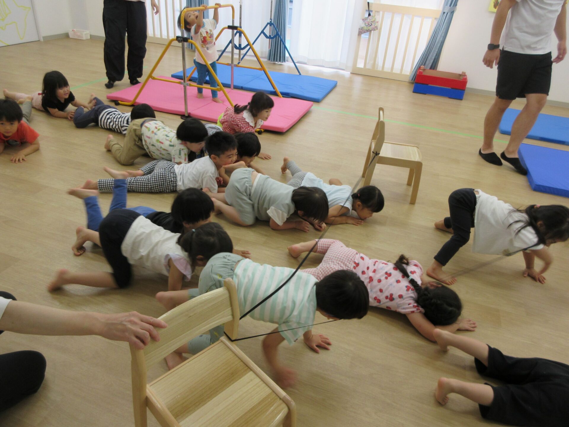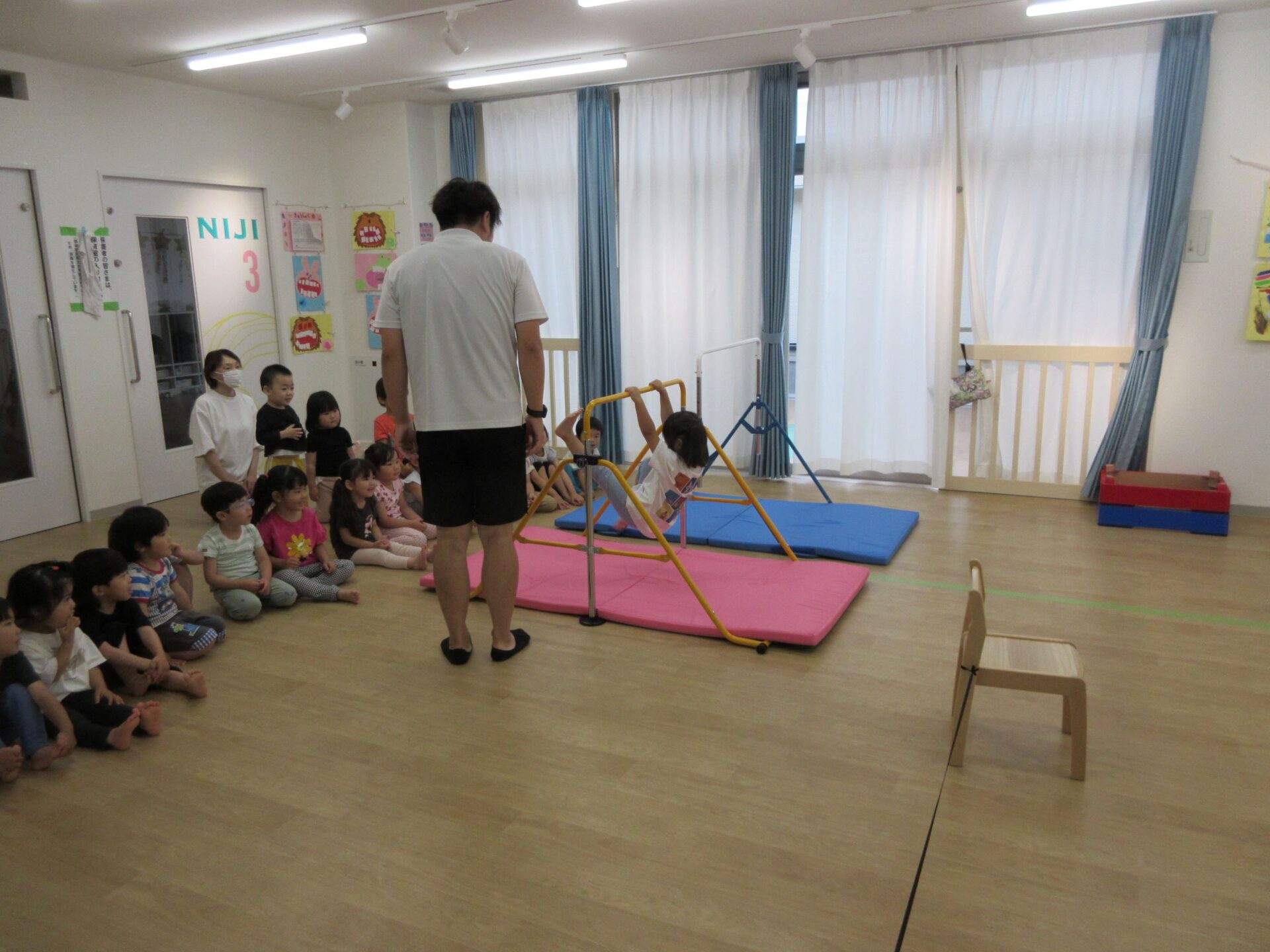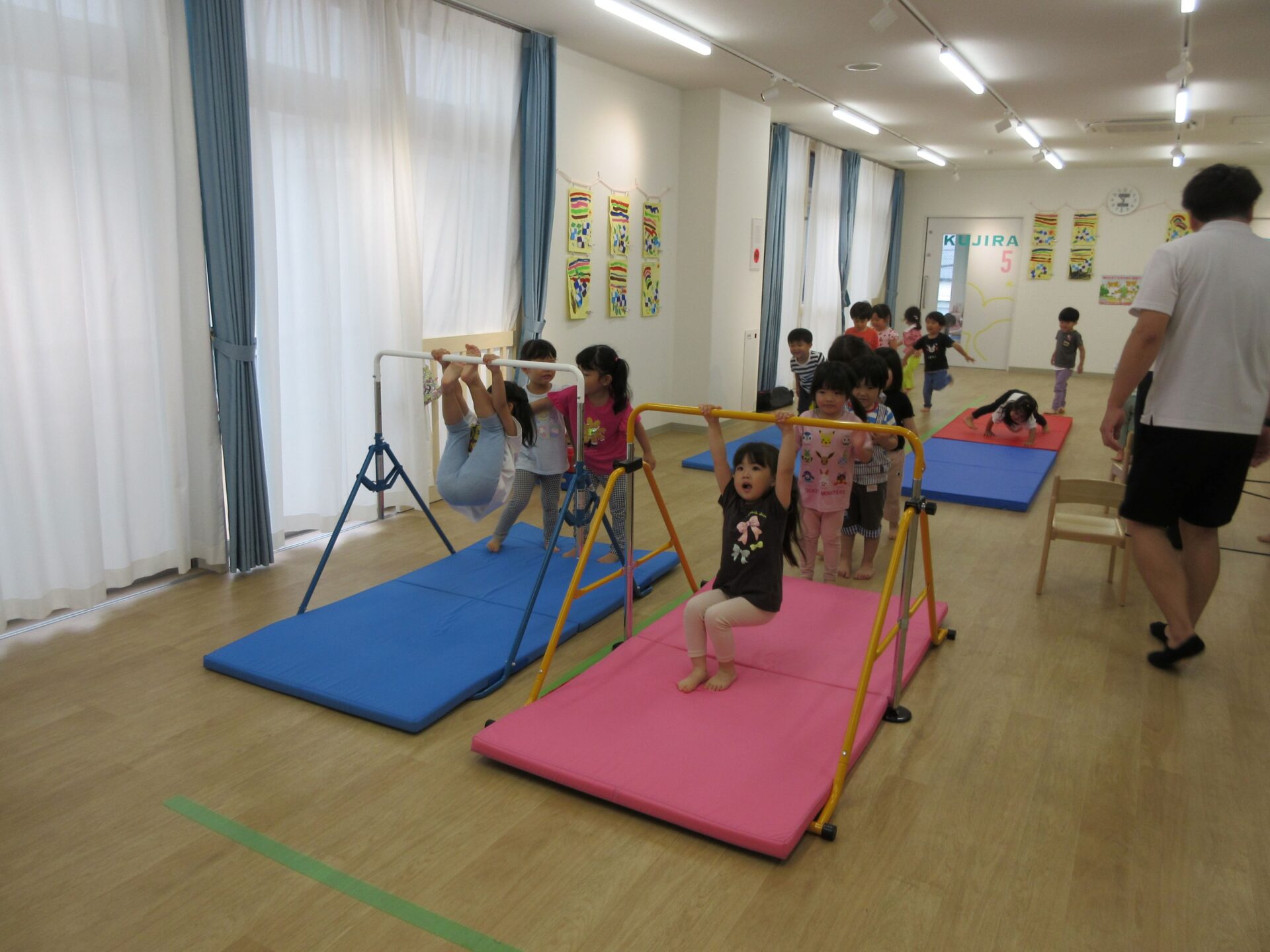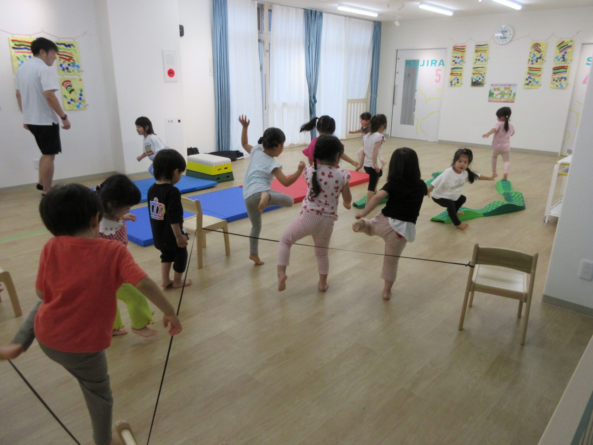 2025.06.16 お知らせ ブログ 6月の運動あそび(2歳あめ組、3歳にじ組) 6月11日(水)、朝から村上先生に来ていただいて運動遊び教室をしました。 前半は、2歳あめ組です。 鉄棒遊びの説明を聞いています。 ゴムの障害物をくぐって進みます。 かなりのスピードでした!「みんな、速いね♪」 バランスをとりながら一本橋渡り。マットは、後ろ向きでのくまさん歩き、跳び箱からのジャンプ! 3回目とは思えない上手さです! しっかりと、つかまって・・。 脚をバタバタ。 何度も楽しみます。 楽しくできていましたよ。 先生もお手本を見せてくれました。すごく注目です。 後半の3歳にじ組がスタート。 お友だちがお手本です。 ゴムの障害物を跳び越えます。 上手に跳び越えています。 ちゃんと並んで、順番を待ちます。 しっかりとバランスがとれていますね。 それっ!ジャ~ンプ! しっかりとぶらさがれていますよ。 みんなの前で、お手本です。 そして、そのあと、再開。 ジャ~ンプ! なんども繰り返して、楽しみました。 一覧へ戻る