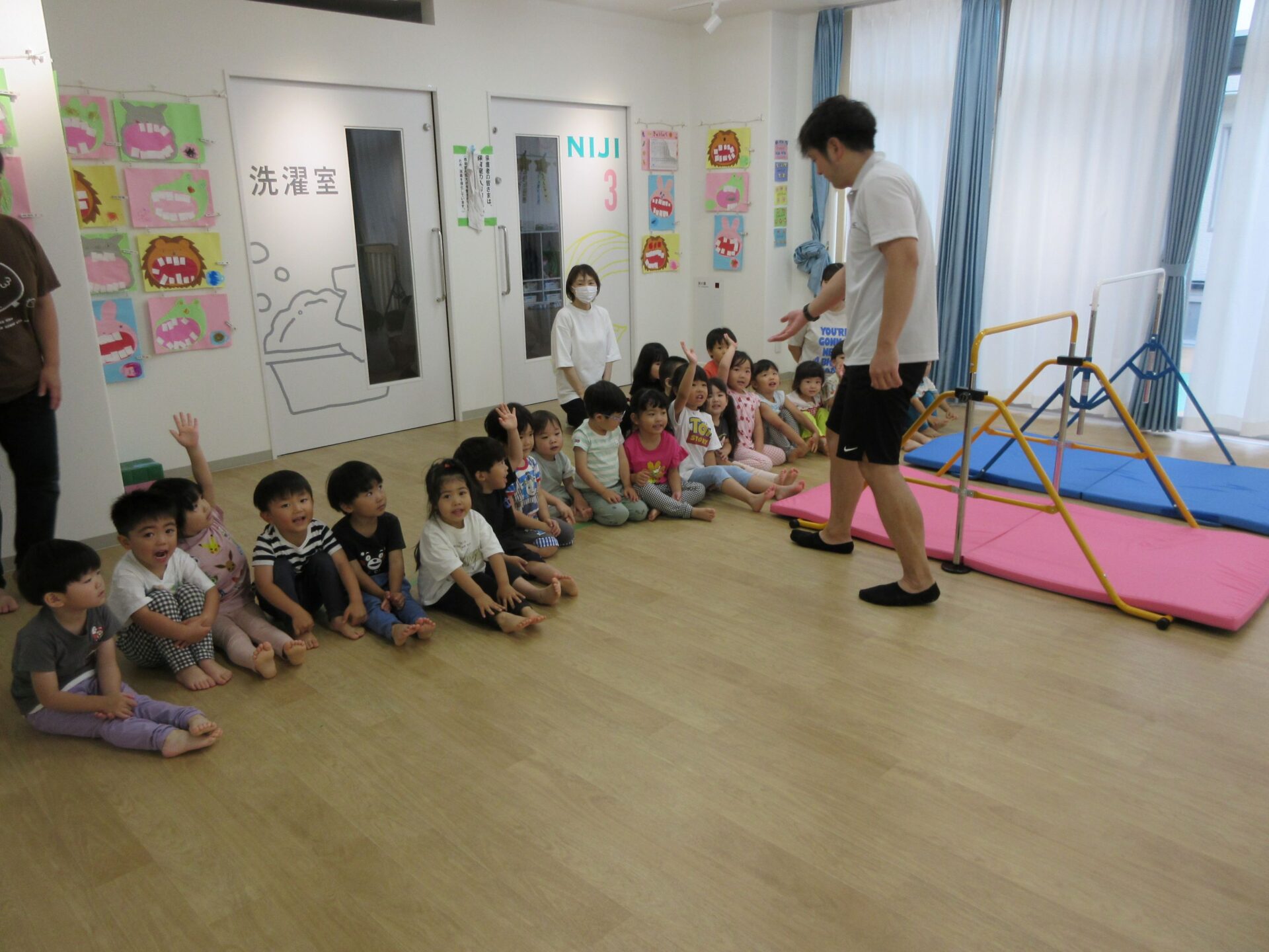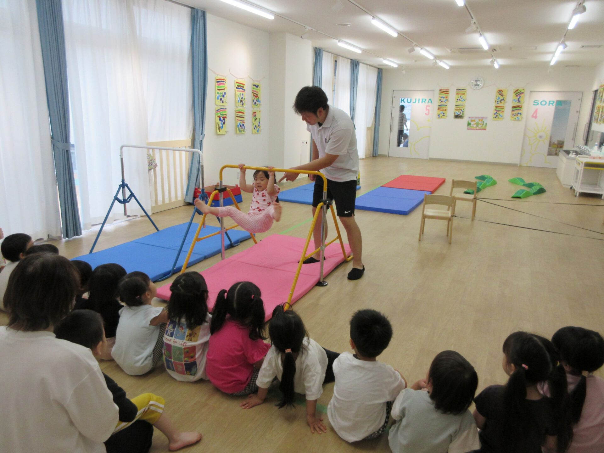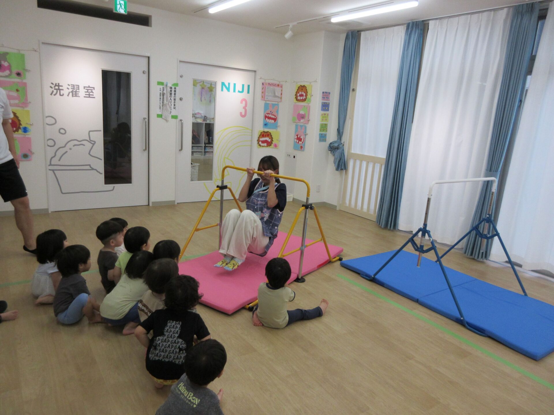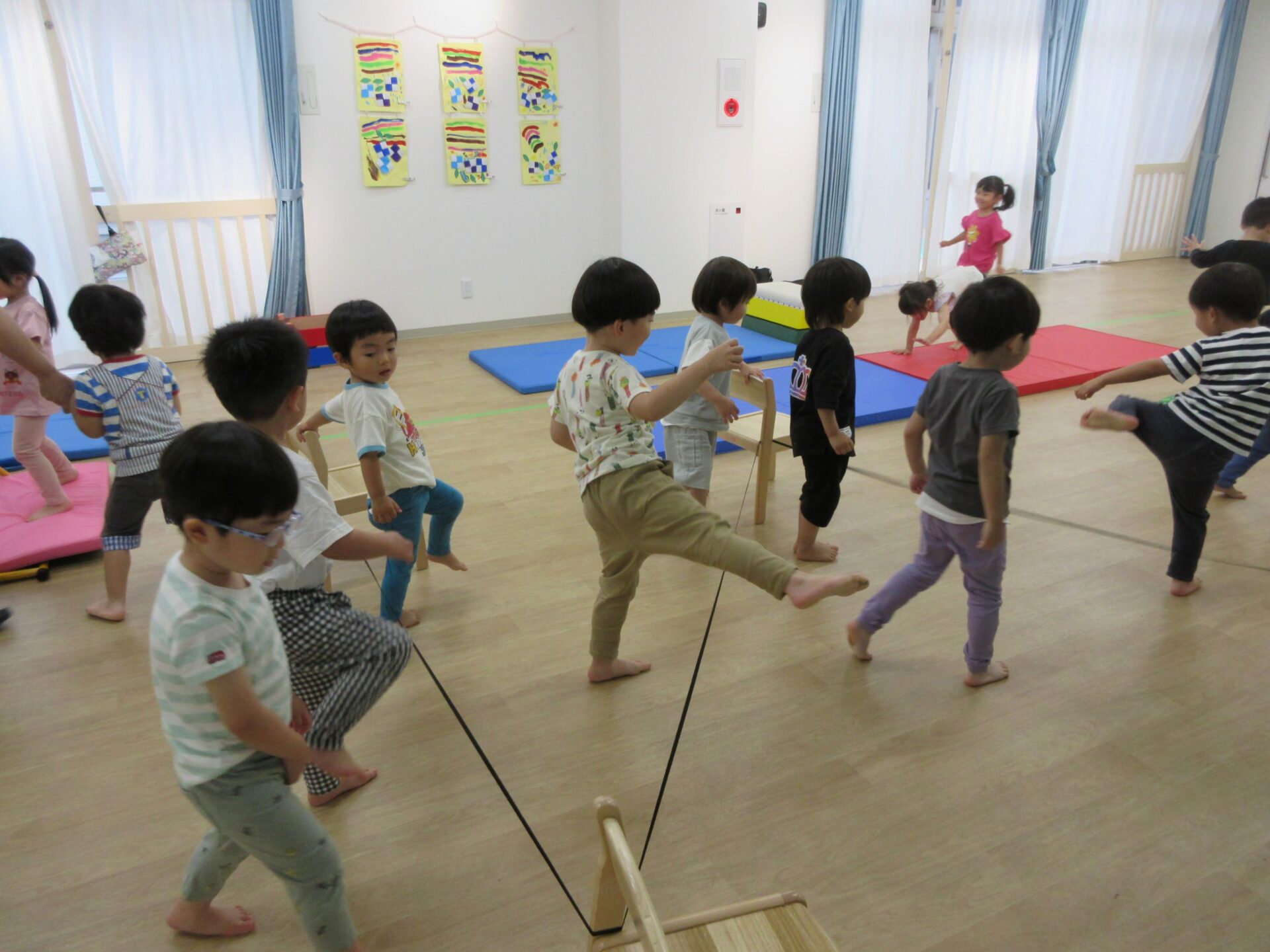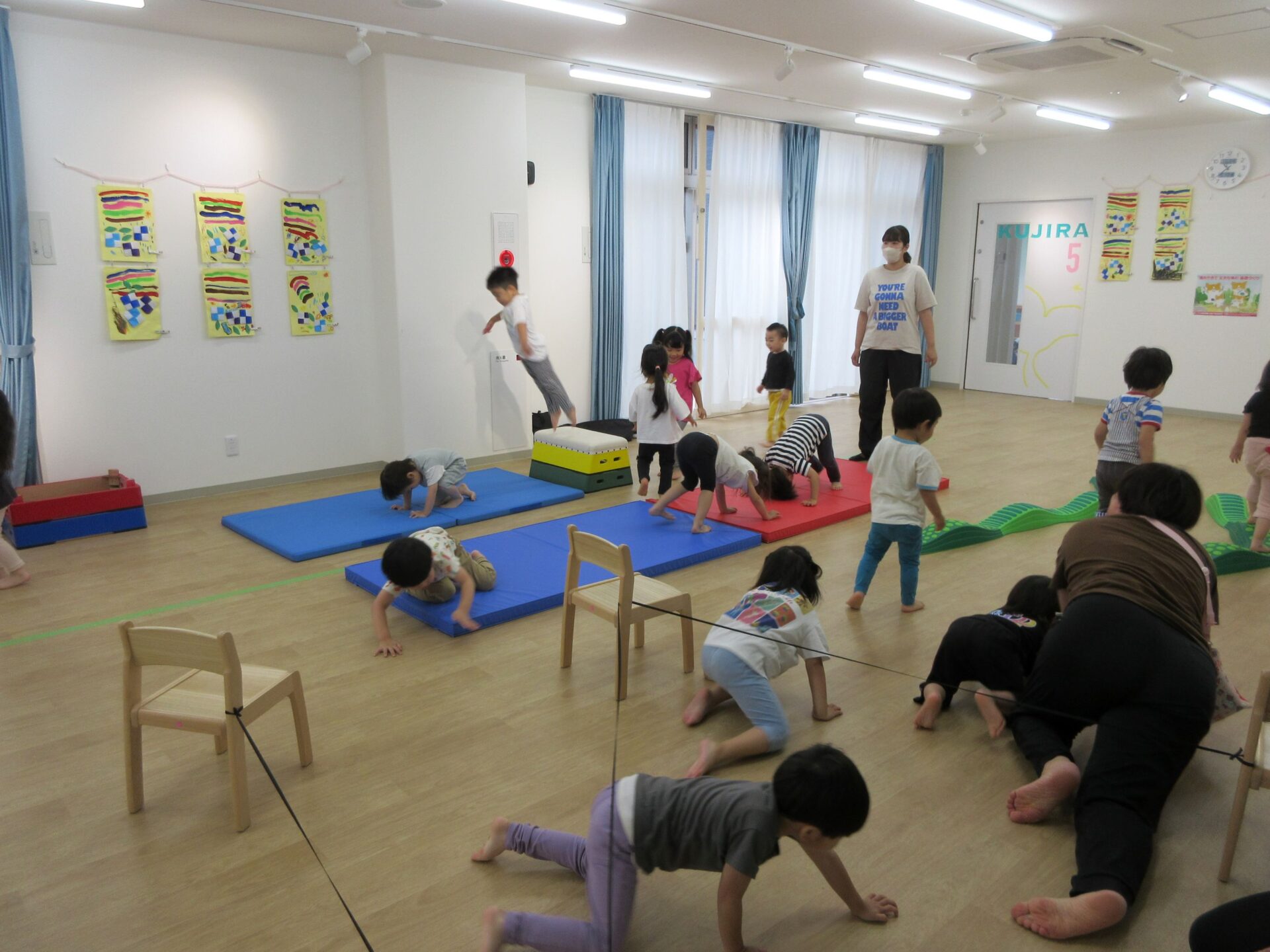 2025.06.16 お知らせ ブログ 6月の運動あそび(2歳あめ組、3歳にじ組) 6月11日(水)、朝から村上先生に来ていただいて運動遊び教室をしました。 前半は、2歳あめ組です。 鉄棒遊びの説明を聞いています。 ゴムの障害物をくぐって進みます。 かなりのスピードでした!「みんな、速いね♪」 バランスをとりながら一本橋渡り。マットは、後ろ向きでのくまさん歩き、跳び箱からのジャンプ! 3回目とは思えない上手さです! しっかりと、つかまって・・。 脚をバタバタ。 何度も楽しみます。 楽しくできていましたよ。 先生もお手本を見せてくれました。すごく注目です。 後半の3歳にじ組がスタート。 お友だちがお手本です。 ゴムの障害物を跳び越えます。 上手に跳び越えています。 ちゃんと並んで、順番を待ちます。 しっかりとバランスがとれていますね。 それっ!ジャ~ンプ! しっかりとぶらさがれていますよ。 みんなの前で、お手本です。 そして、そのあと、再開。 ジャ~ンプ! なんども繰り返して、楽しみました。 一覧へ戻る