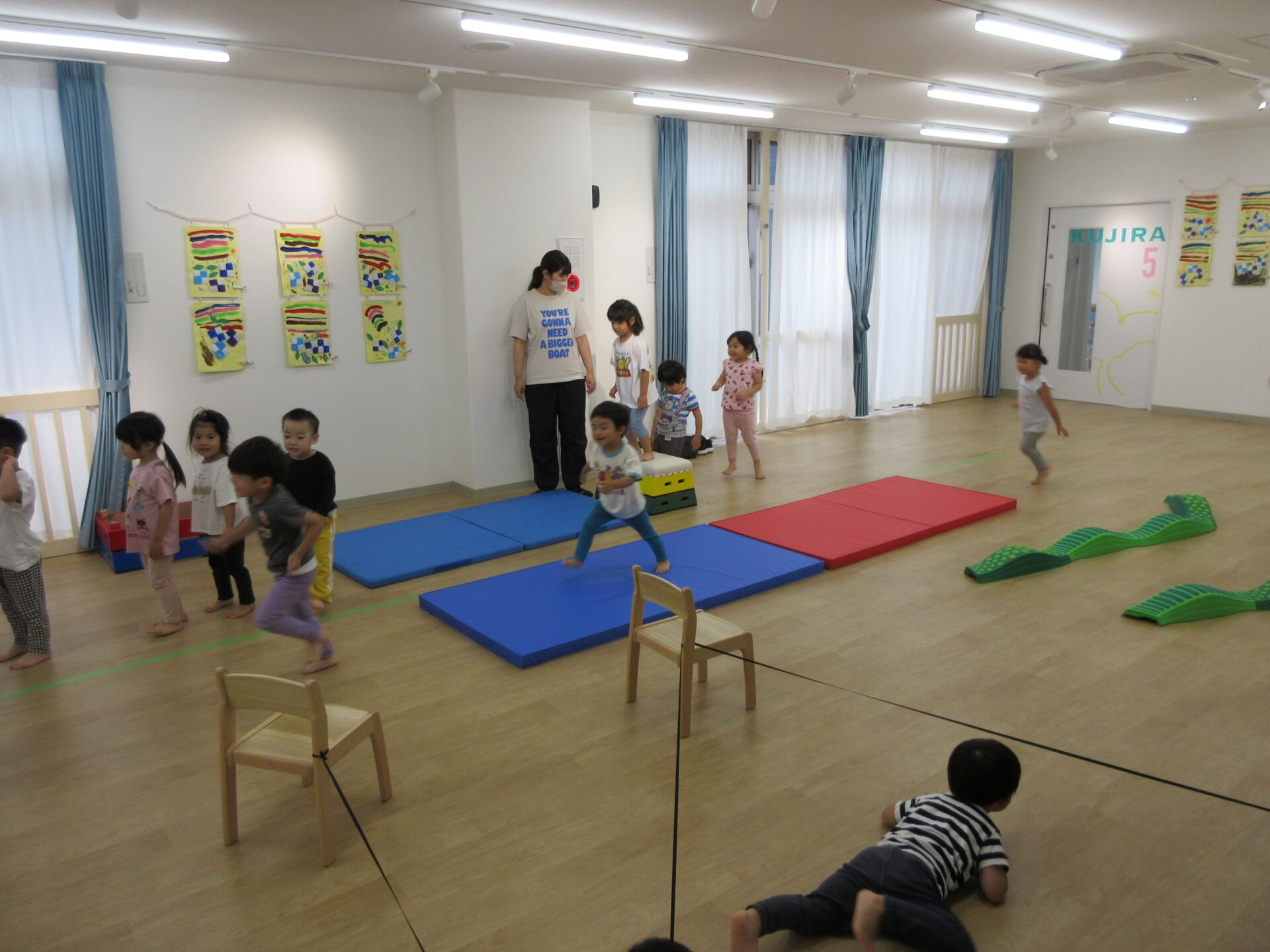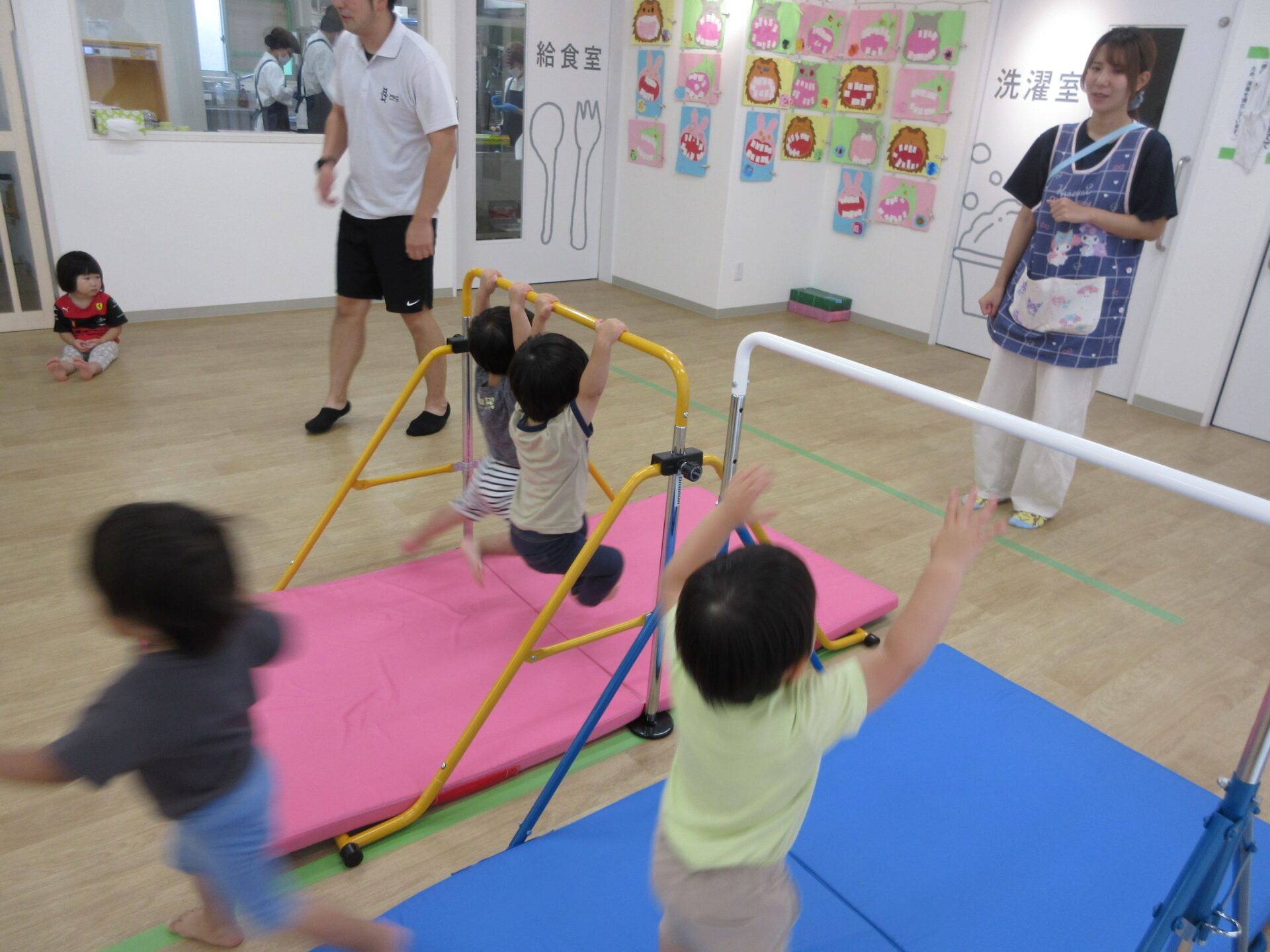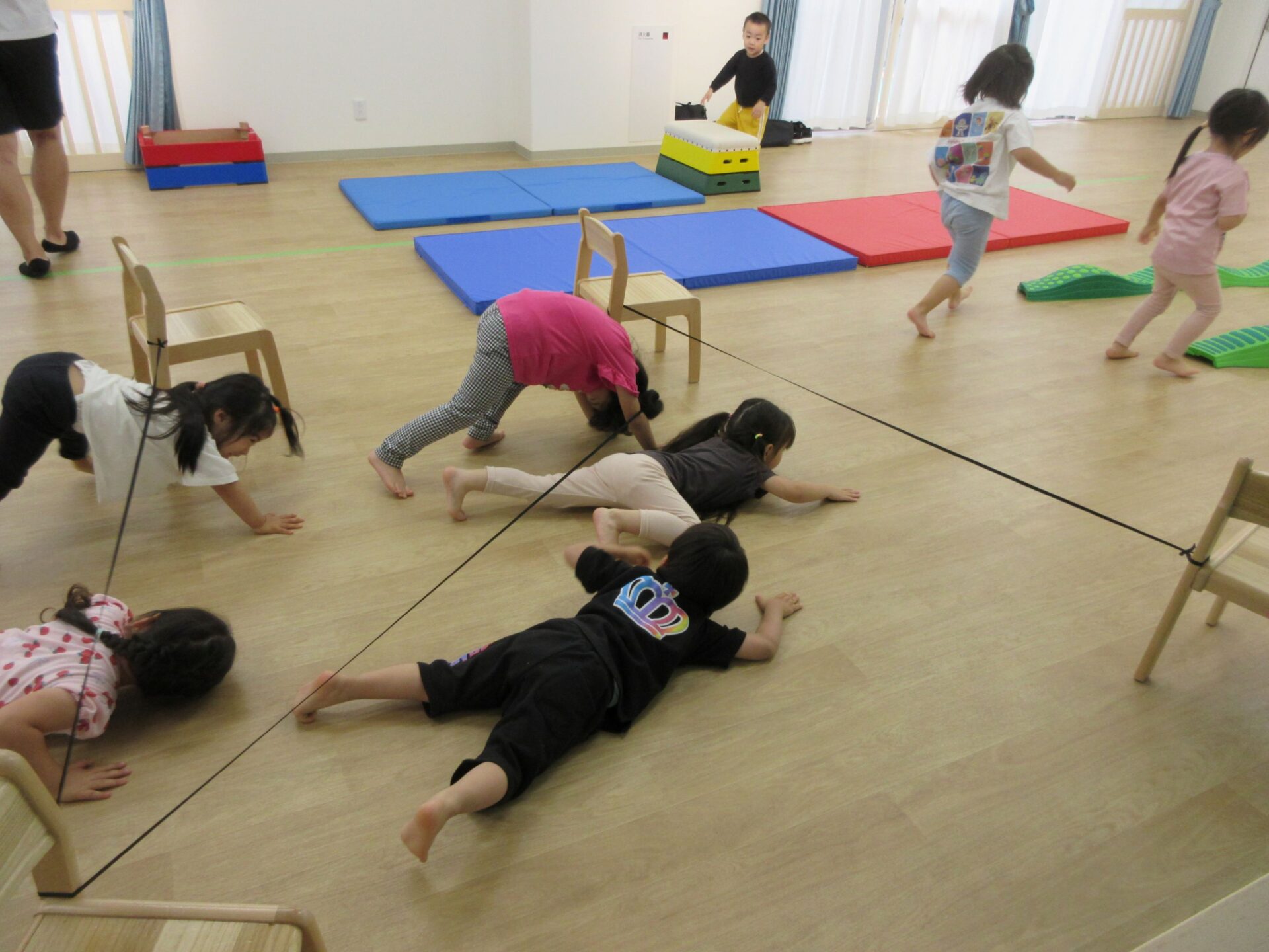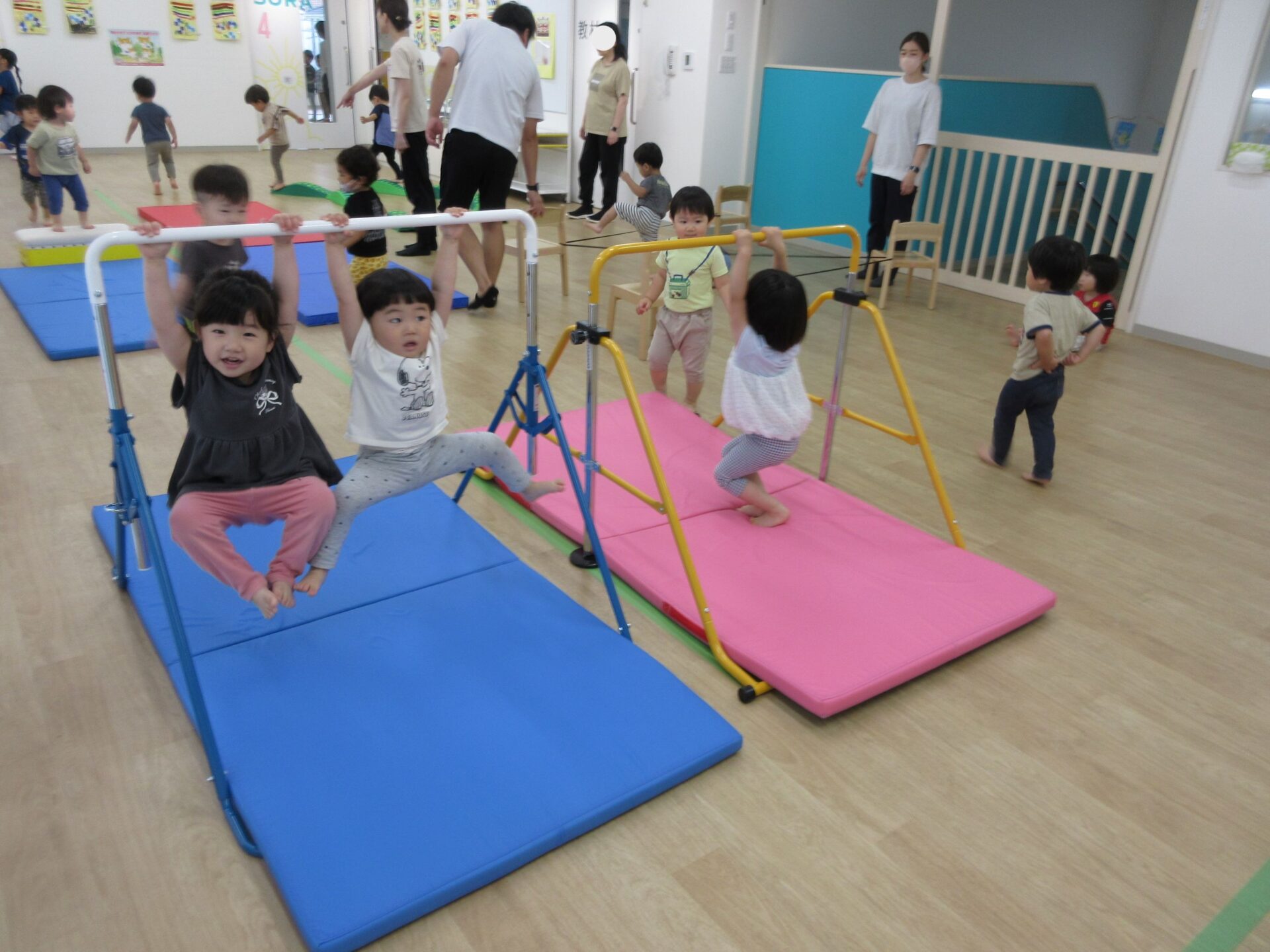 2025.06.16 お知らせ ブログ 6月の運動あそび(2歳あめ組、3歳にじ組) 6月11日(水)、朝から村上先生に来ていただいて運動遊び教室をしました。 前半は、2歳あめ組です。 鉄棒遊びの説明を聞いています。 ゴムの障害物をくぐって進みます。 かなりのスピードでした!「みんな、速いね♪」 バランスをとりながら一本橋渡り。マットは、後ろ向きでのくまさん歩き、跳び箱からのジャンプ! 3回目とは思えない上手さです! しっかりと、つかまって・・。 脚をバタバタ。 何度も楽しみます。 楽しくできていましたよ。 先生もお手本を見せてくれました。すごく注目です。 後半の3歳にじ組がスタート。 お友だちがお手本です。 ゴムの障害物を跳び越えます。 上手に跳び越えています。 ちゃんと並んで、順番を待ちます。 しっかりとバランスがとれていますね。 それっ!ジャ~ンプ! しっかりとぶらさがれていますよ。 みんなの前で、お手本です。 そして、そのあと、再開。 ジャ~ンプ! なんども繰り返して、楽しみました。 一覧へ戻る