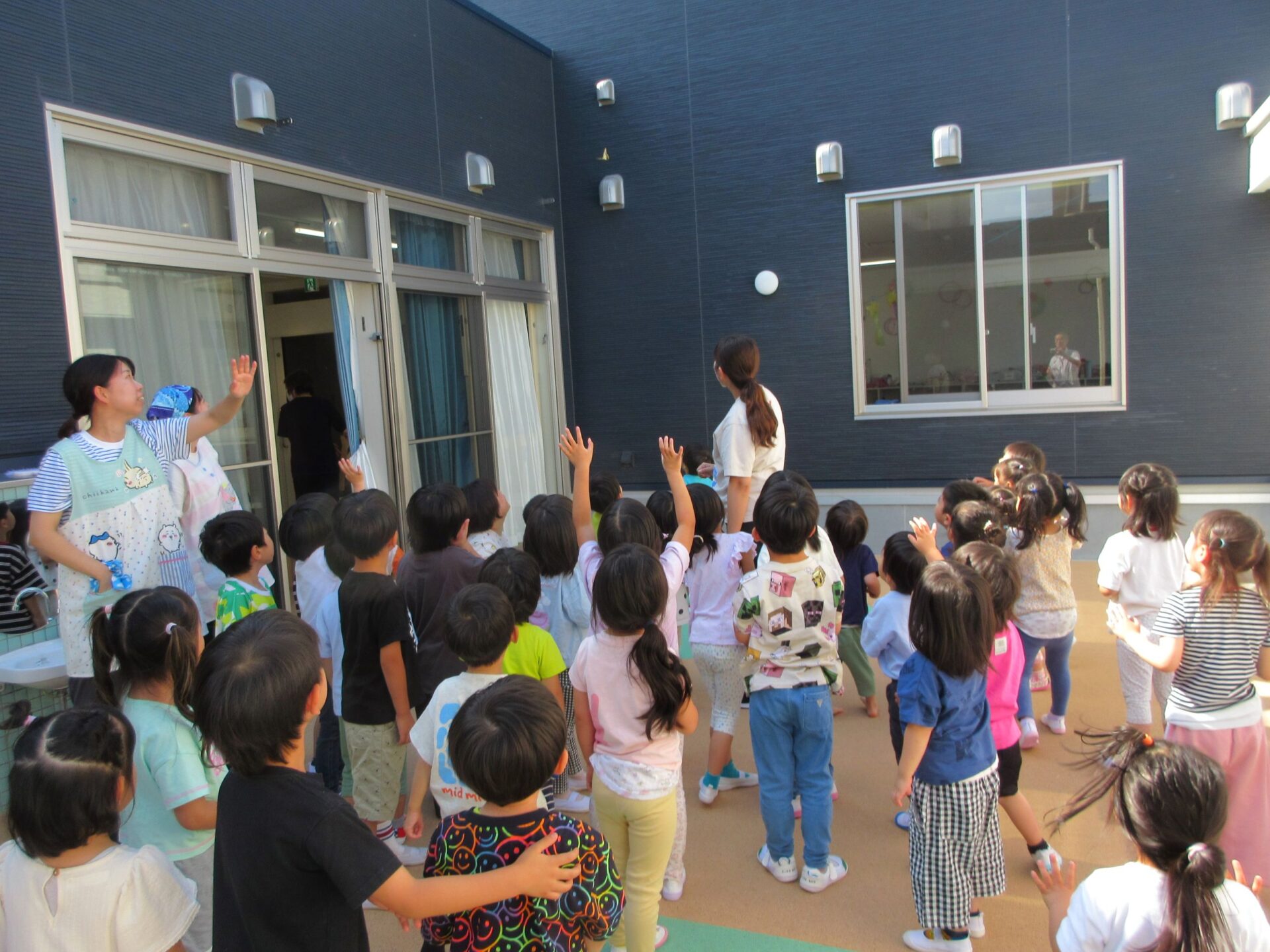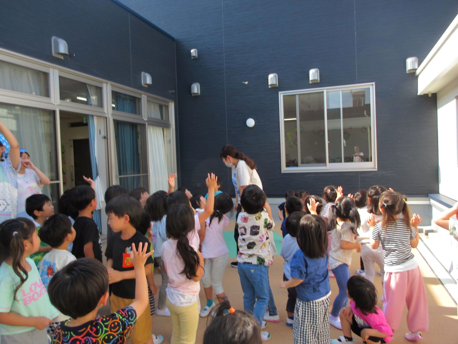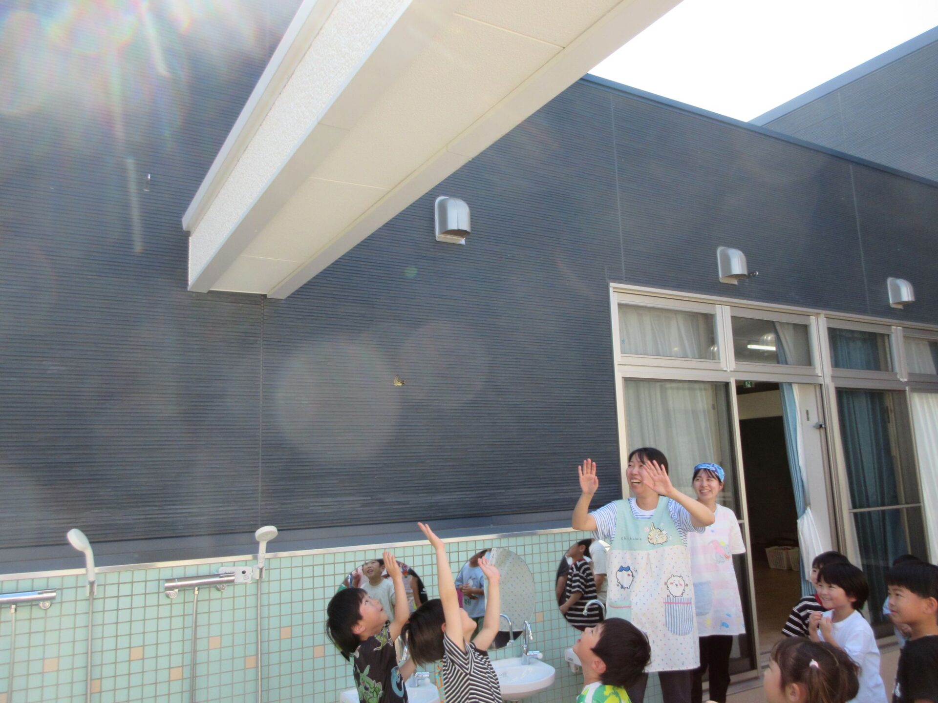 2025.06.16 お知らせ ブログ アゲハチョウを放したよ♪つづき もう1匹のアゲハチョウのさなぎが、羽化して、アゲハチョウになりました。 13日(金)に、3、4、5歳クラスで、アゲハチョウを外へ放しました。 2階ランチルーム横の中庭で、「さようなら」をして、放しました。小さく羽をひろげて飛んでいます。 少し高い塀に囲まれているせいか、なかなか外へ飛んでいきませんでした。 また、みんなの近くへもどってきました・・・。 「がんばって、飛んでいってね。」 みんなで応援して、お別れしました。 「元気でね~!」 一覧へ戻る