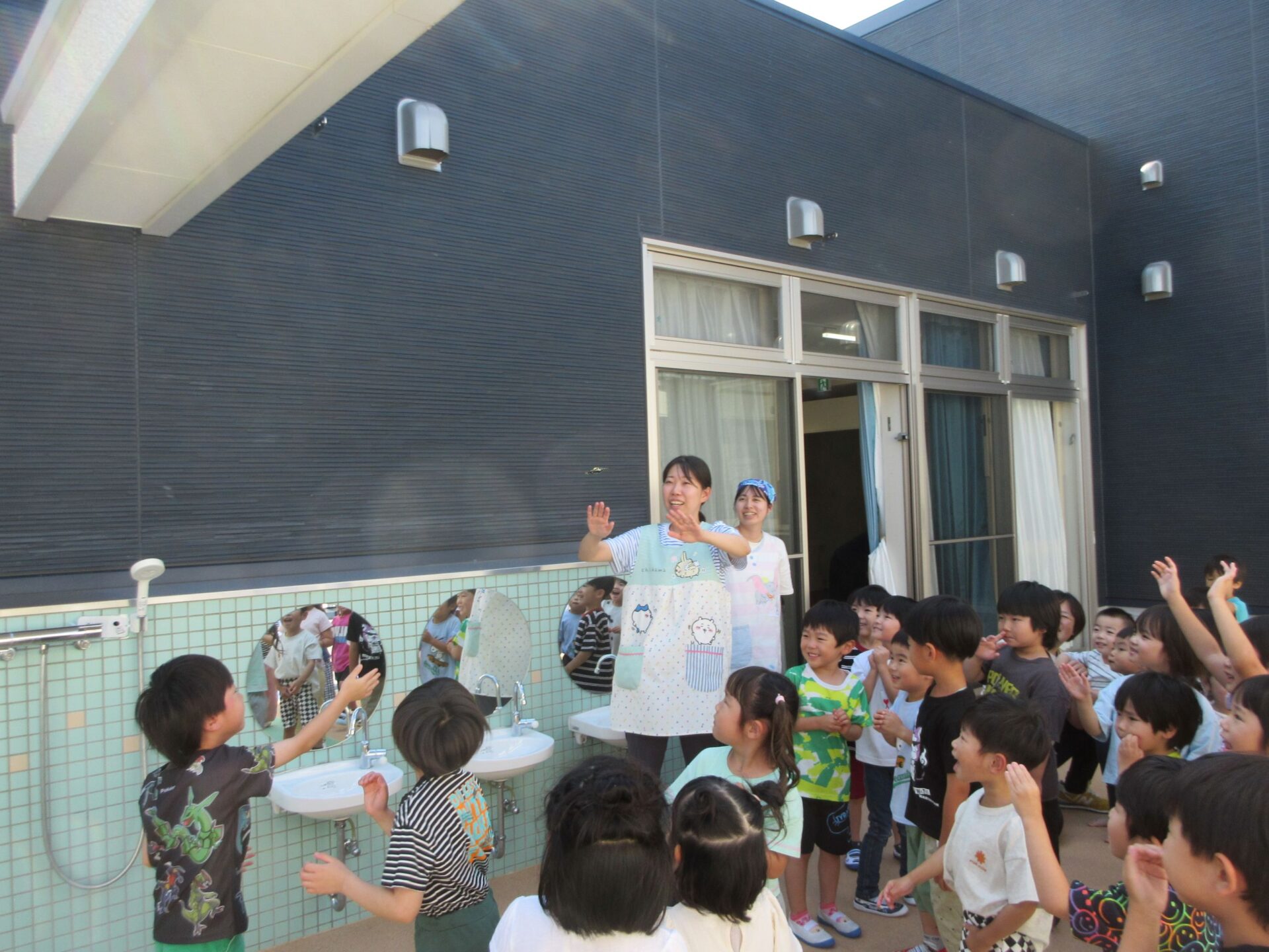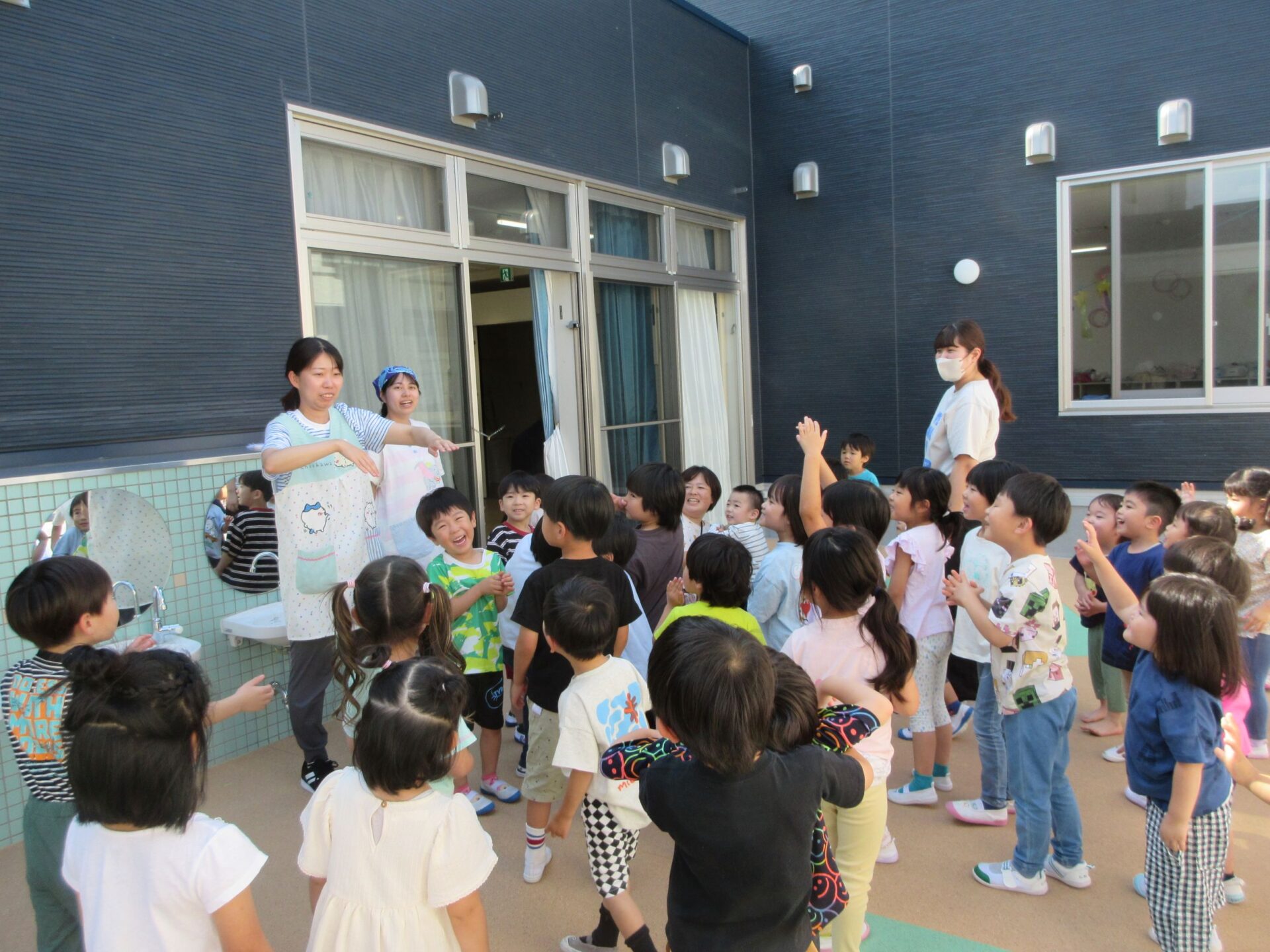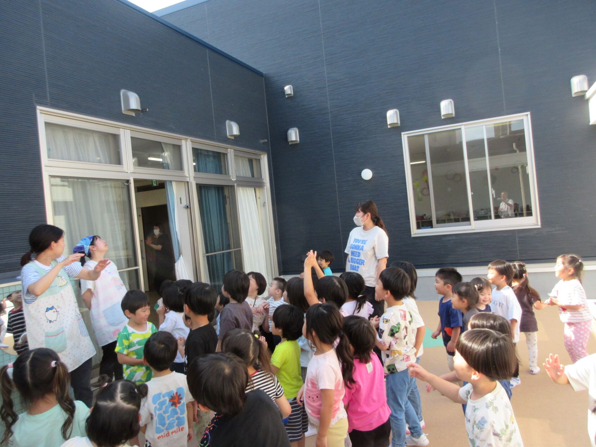2025.06.16 お知らせ ブログ アゲハチョウを放したよ♪つづき もう1匹のアゲハチョウのさなぎが、羽化して、アゲハチョウになりました。 13日(金)に、3、4、5歳クラスで、アゲハチョウを外へ放しました。 2階ランチルーム横の中庭で、「さようなら」をして、放しました。小さく羽をひろげて飛んでいます。 少し高い塀に囲まれているせいか、なかなか外へ飛んでいきませんでした。 また、みんなの近くへもどってきました・・・。 「がんばって、飛んでいってね。」 みんなで応援して、お別れしました。 「元気でね~!」 一覧へ戻る