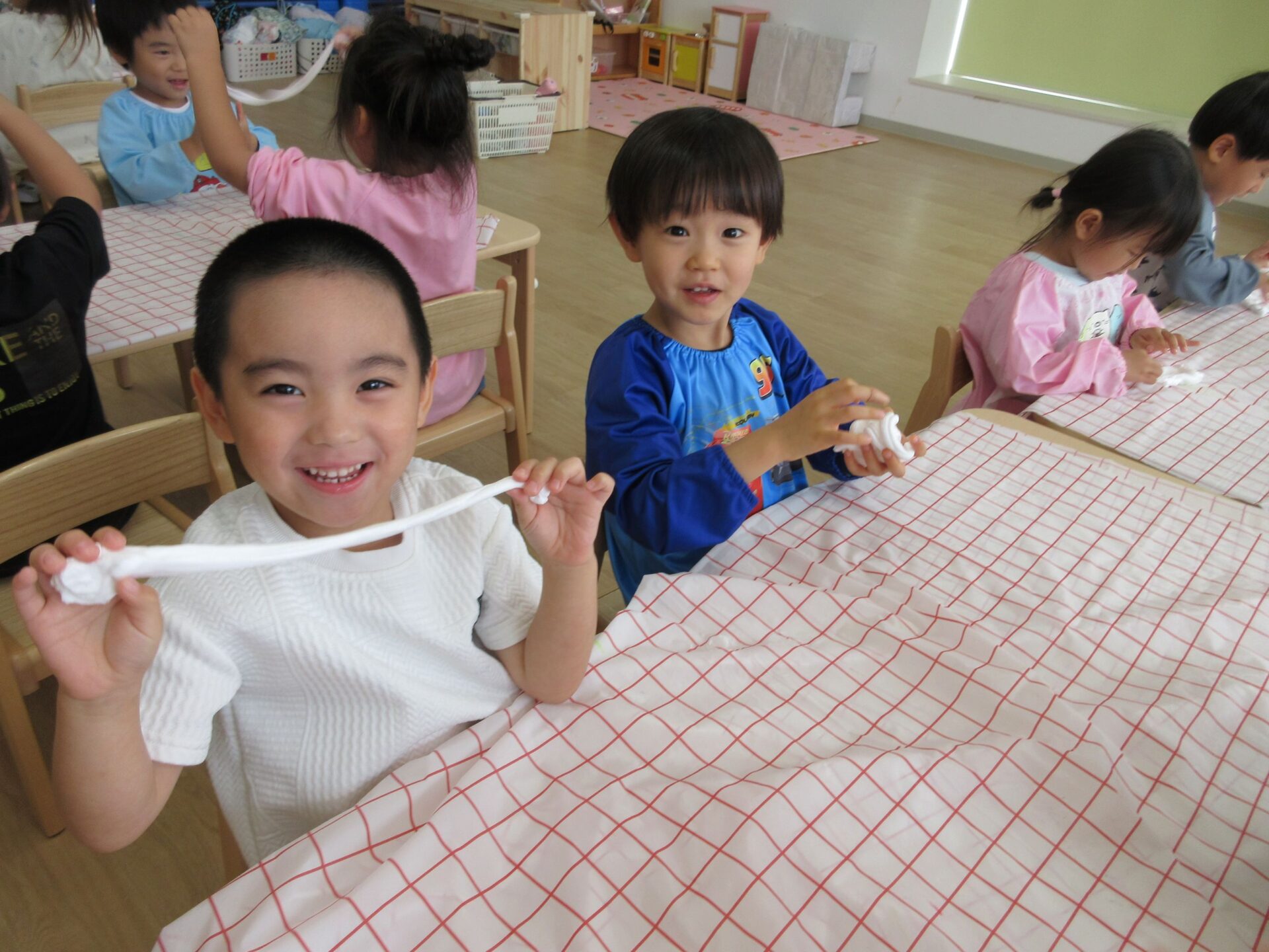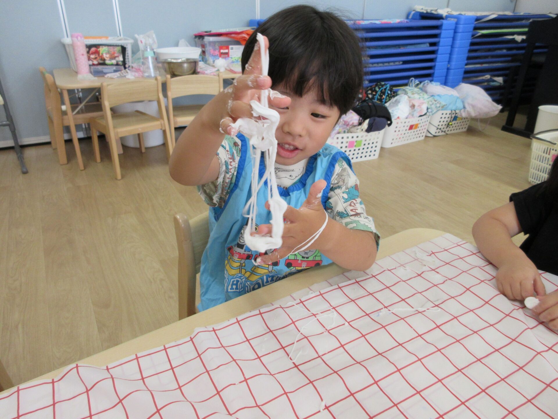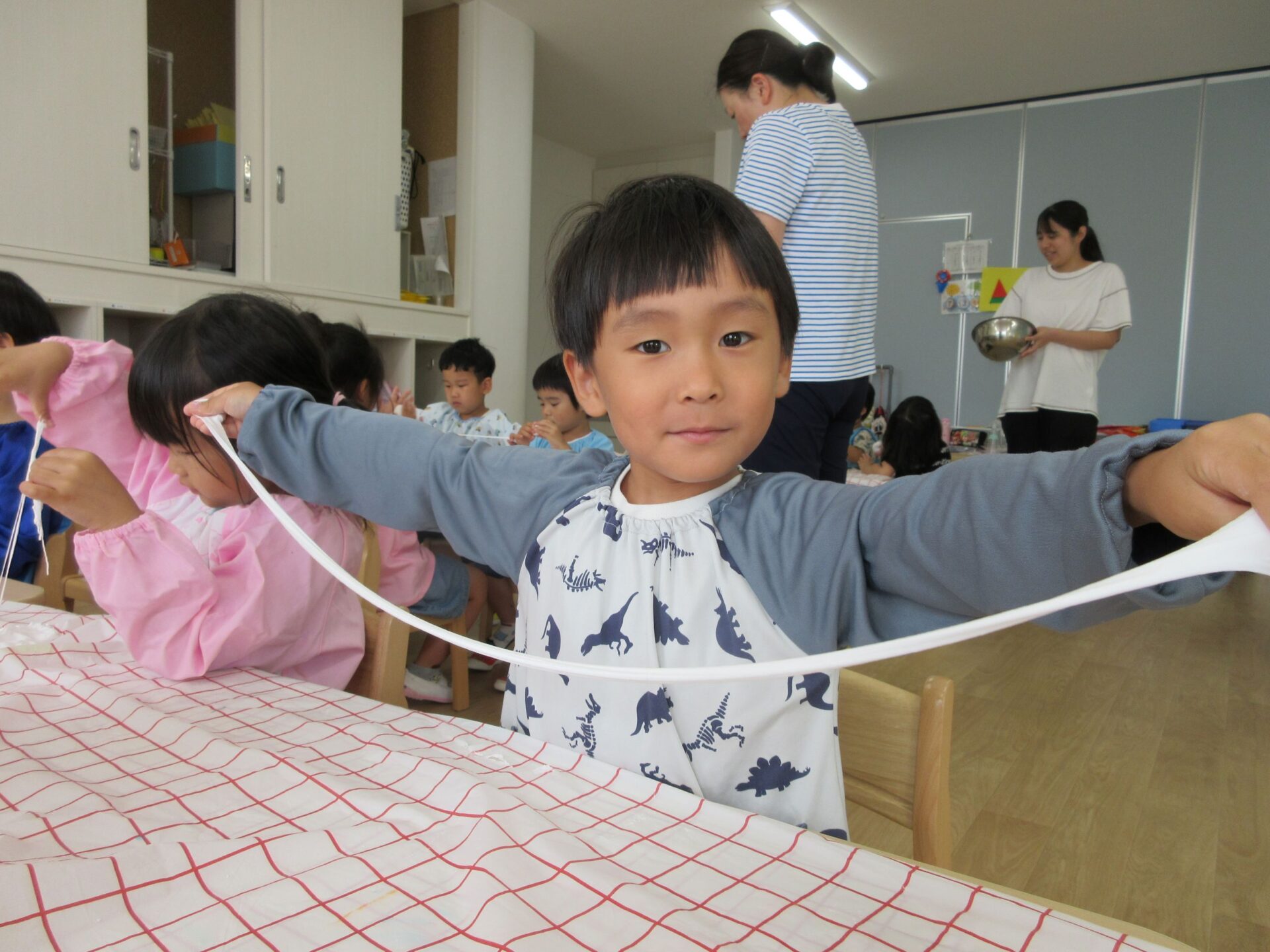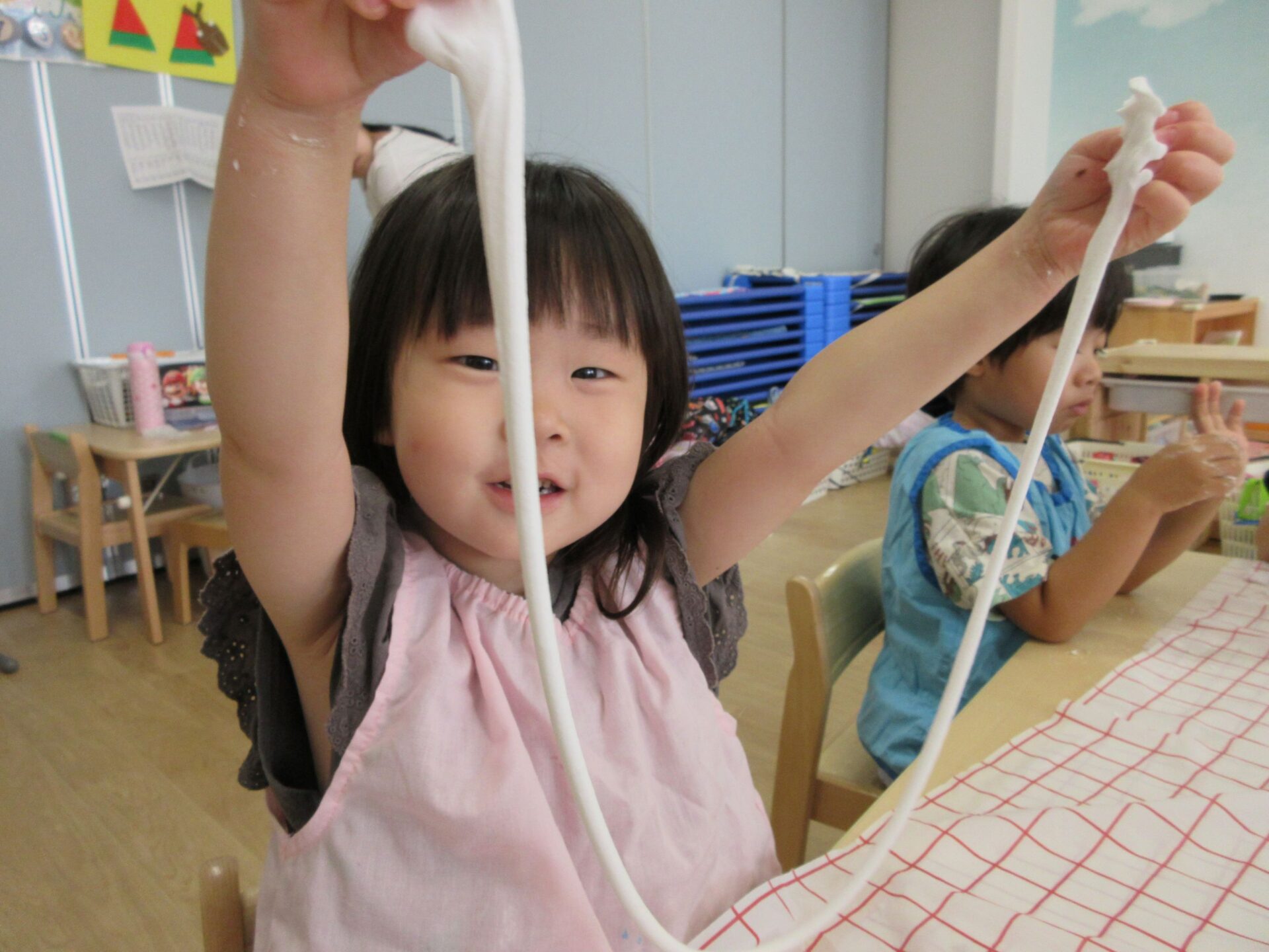 2025.07.23 お知らせ ブログ とろとろ♪ネバネバ!感触遊びをしたよ♪(4歳そら組) 7月3日(木)、先生が何か面白いものを見せてくれました。ネバネバ、トロトロ・・・。 みんなに配ってもらって。 「なんだか不思議な感触‥。」 自然に笑顔がこぼれます♪ ビヨーン! ビヨーン!! ピヨーン!ながーい! いい笑顔ですね。 スライムっておもしろい! こんなに長くなったよ♪ 楽しいスライムの感触遊びでした。 一覧へ戻る