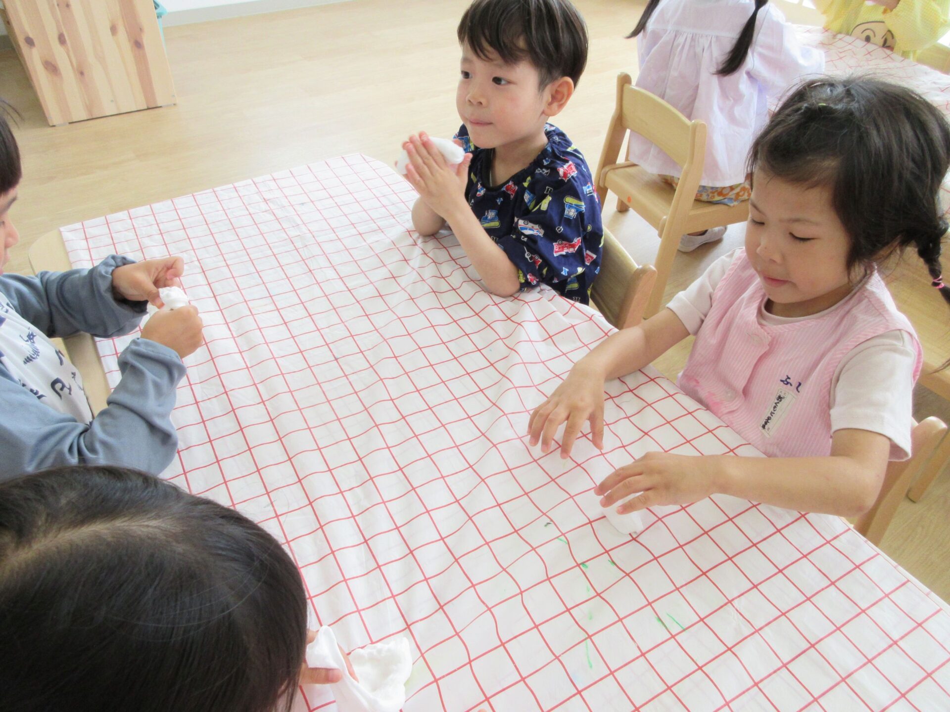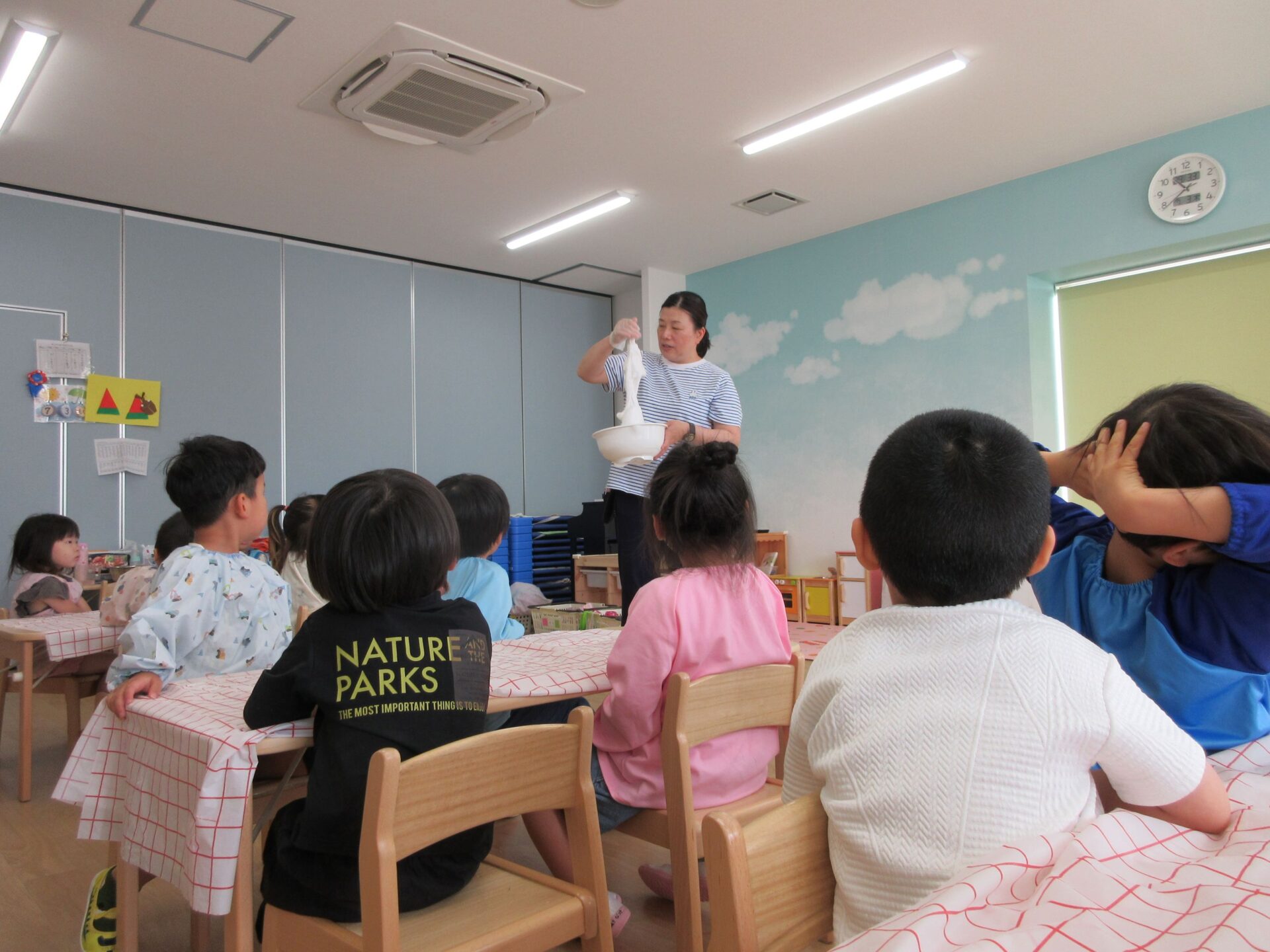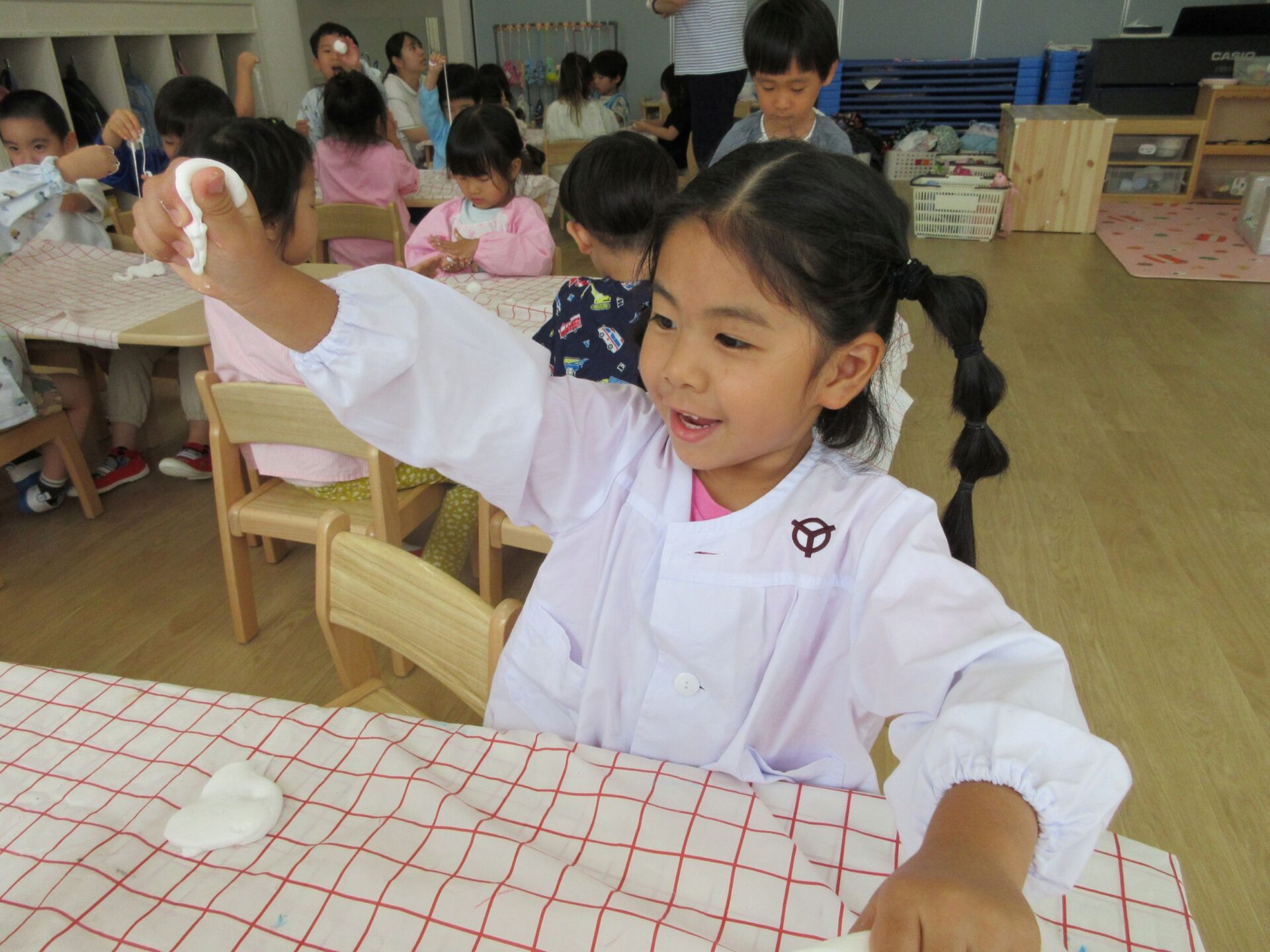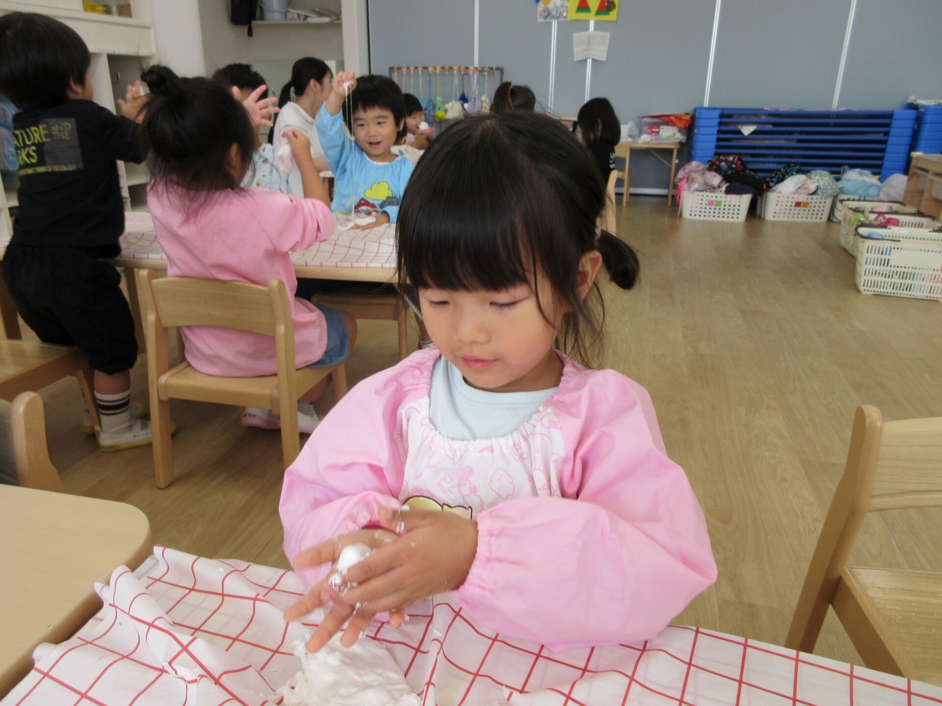 2025.07.23 お知らせ ブログ とろとろ♪ネバネバ!感触遊びをしたよ♪(4歳そら組) 7月3日(木)、先生が何か面白いものを見せてくれました。ネバネバ、トロトロ・・・。 みんなに配ってもらって。 「なんだか不思議な感触‥。」 自然に笑顔がこぼれます♪ ビヨーン! ビヨーン!! ピヨーン!ながーい! いい笑顔ですね。 スライムっておもしろい! こんなに長くなったよ♪ 楽しいスライムの感触遊びでした。 一覧へ戻る