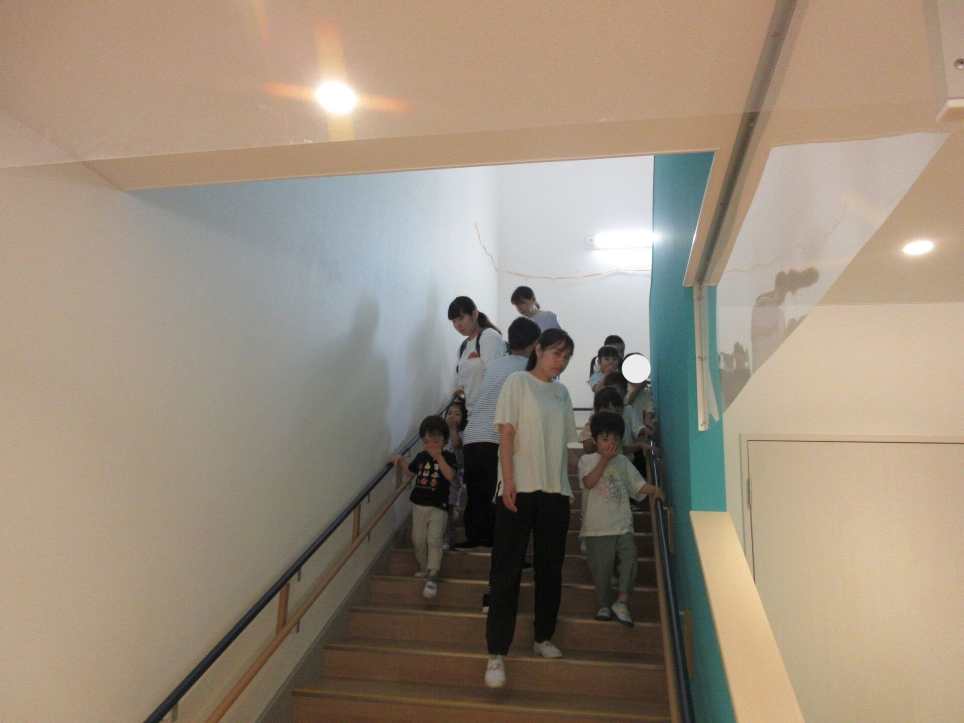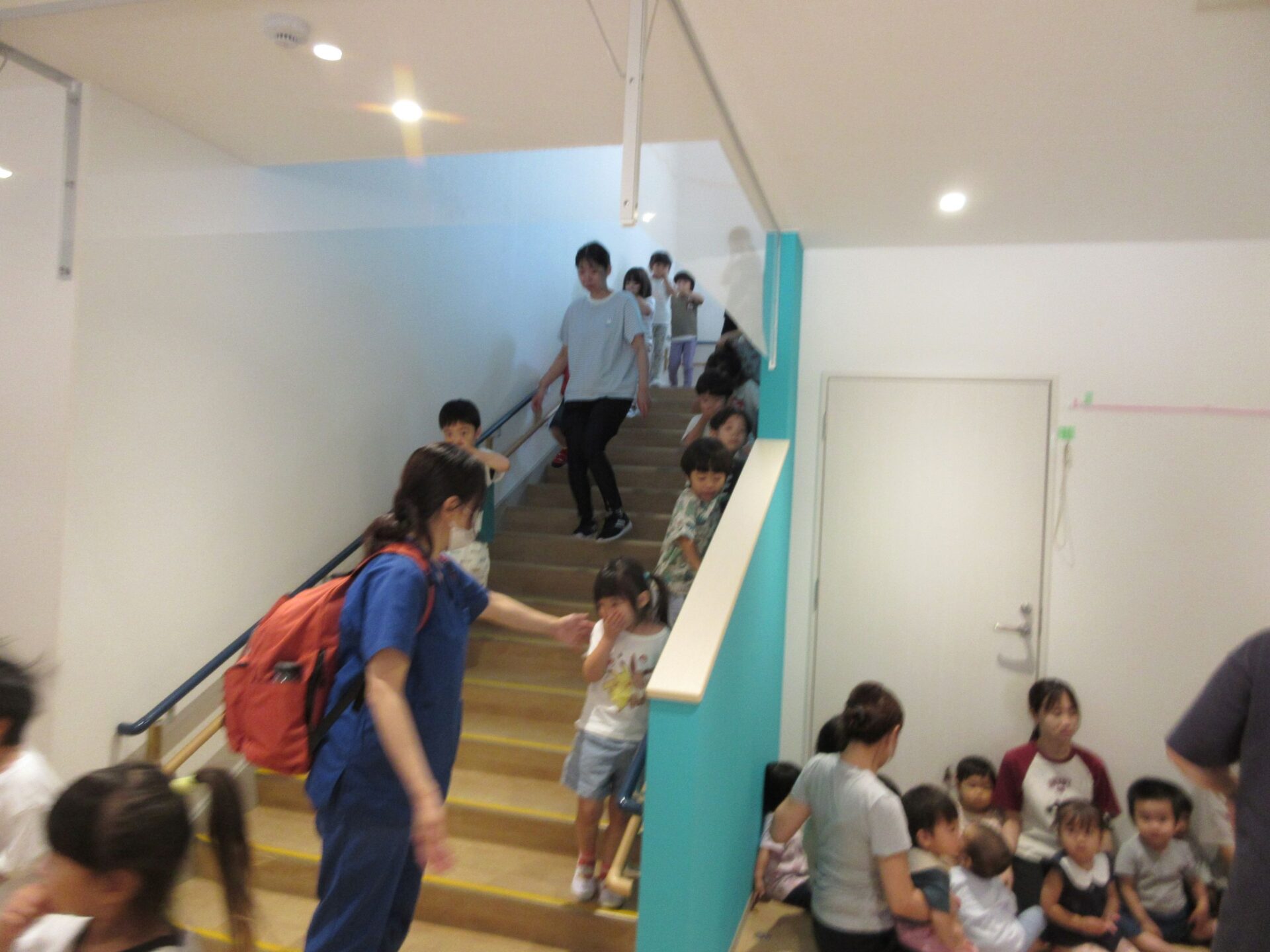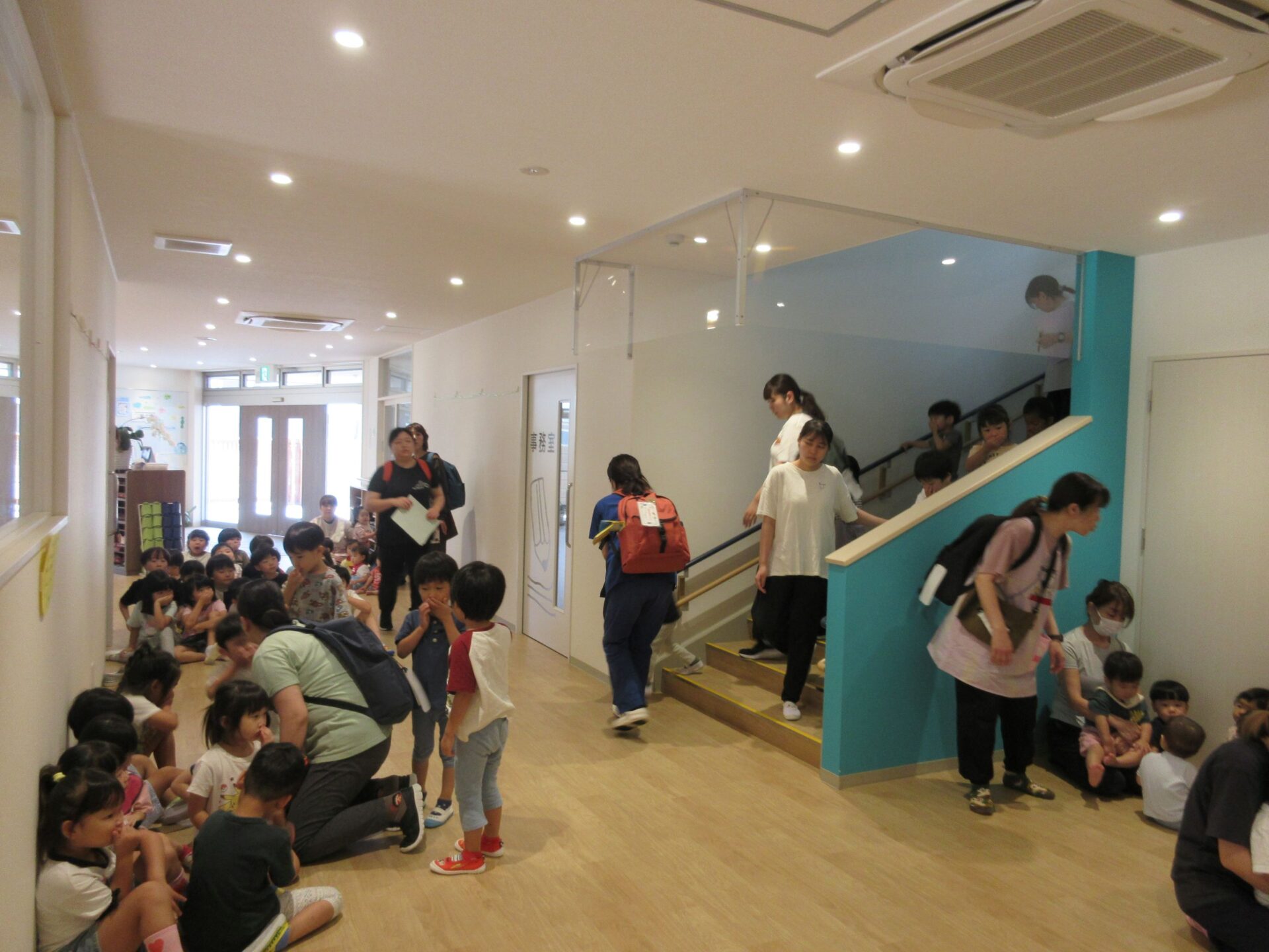 2025.07.25 お知らせ ブログ 7月の避難訓練(火事) 7月24日(木)、避難訓練を行いました。今回の想定は、火事。熱中症防止のため、避難後の集合場所は、1階のエントランスです。 幼児クラスは、今回は中階段を使って1階へ降りました。 とても素早く移動できていました。 だんだんと集まってきました。 担当の先生のお話です。 「『お・は・し・も』の『お』は、押さない!」 煙を吸わないように気をつけて・・・。 「もどってはいけません!」 「お約束!」 説明もしっかりと聞けていましたよ♪ 一覧へ戻る