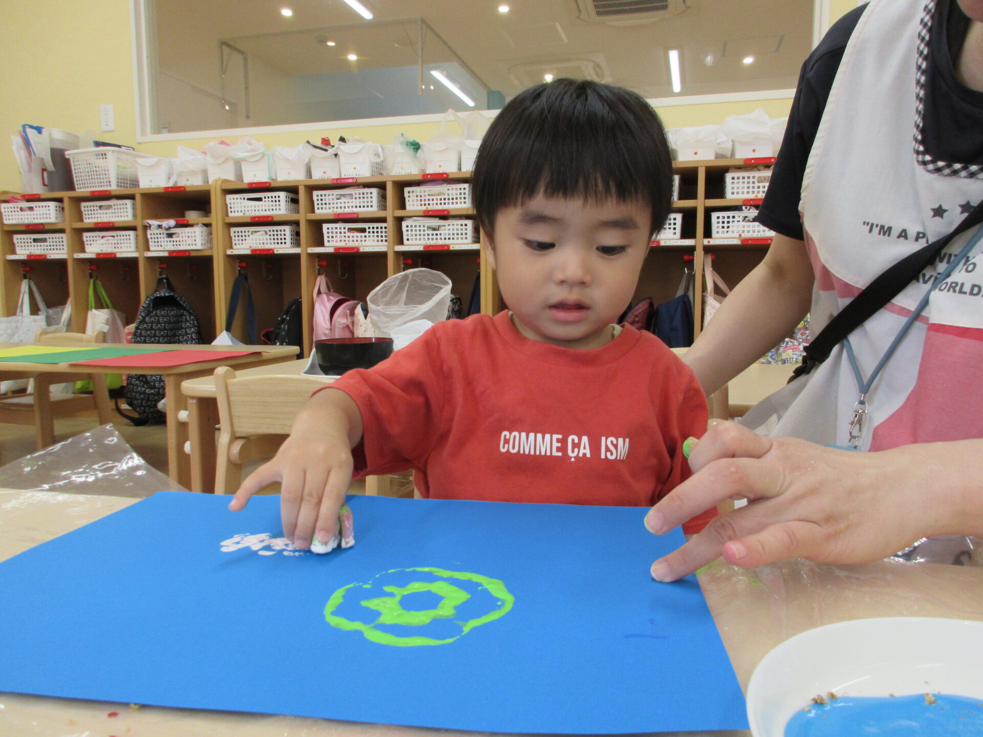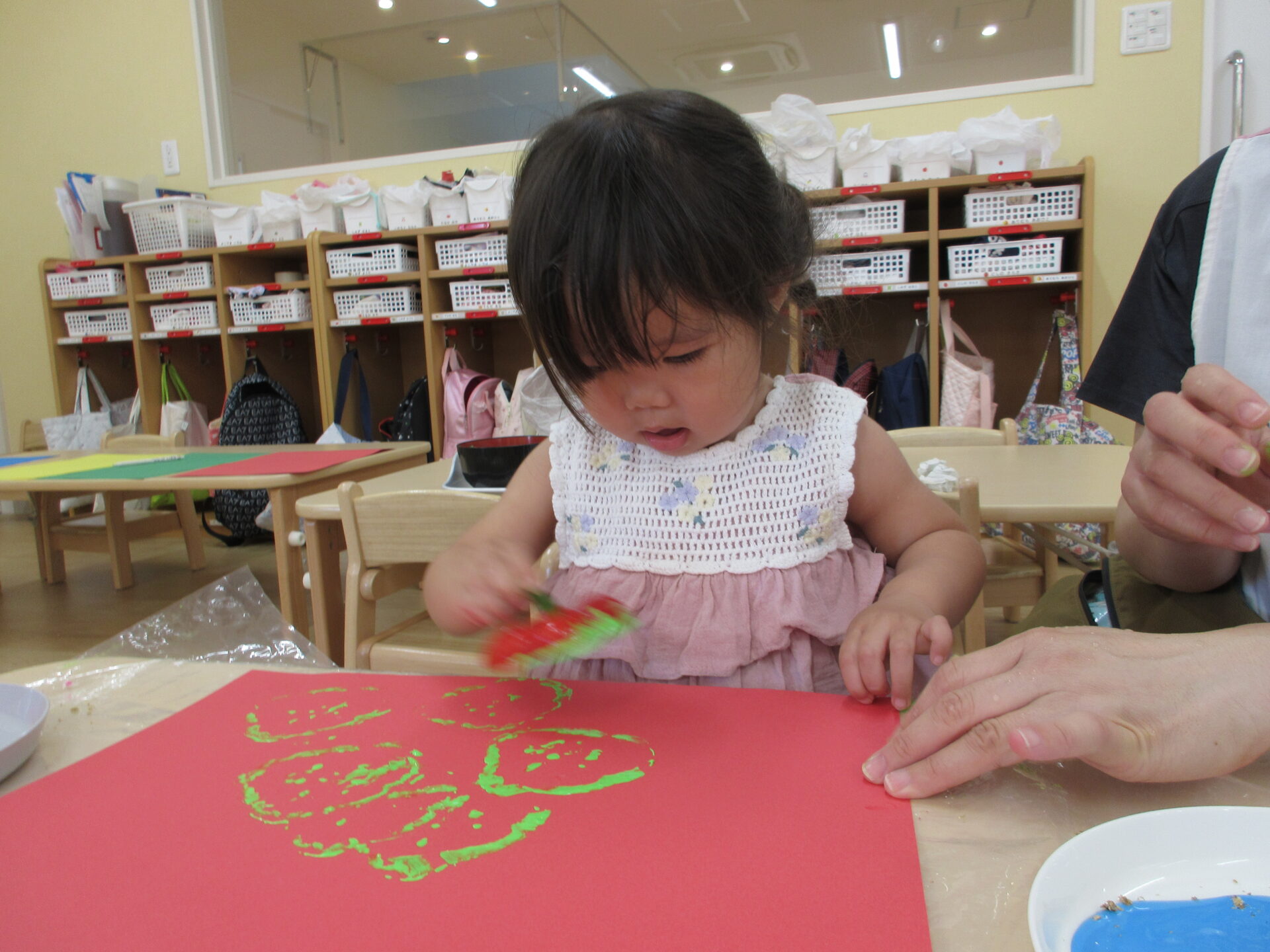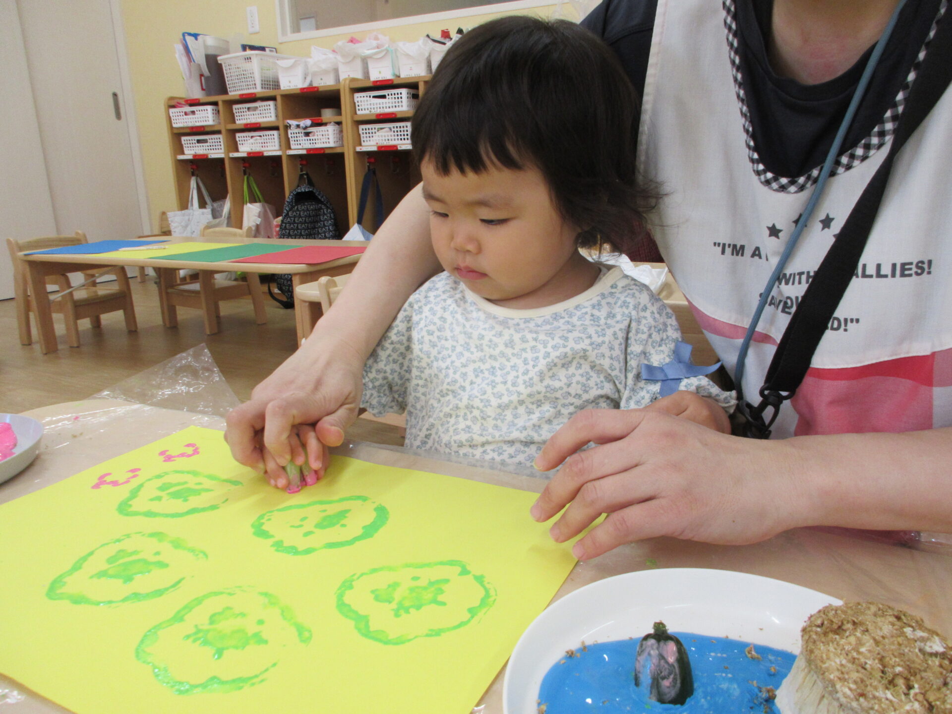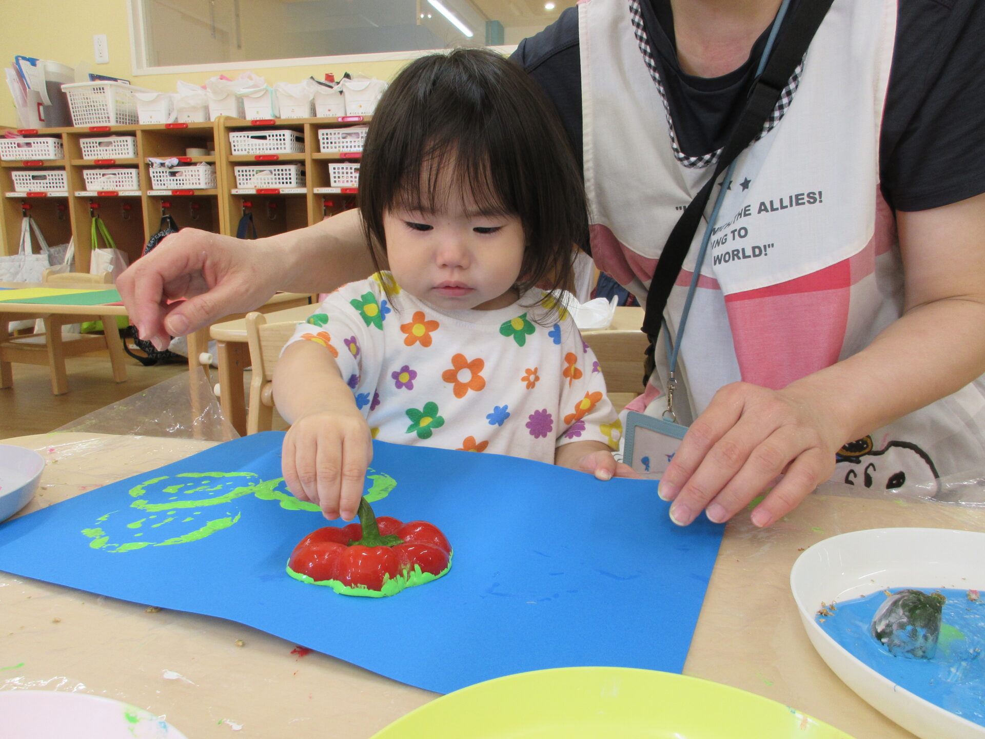2025.08.04 お知らせ ブログ ペタペタ♪野菜スタンプ (1歳 だいちぐみ) 7月29日、野菜スタンプをしました☆キュウリやピーマン、パプリカ、エノキ、小松菜の断面を見たり、触ったりと興味津々の子どもたち。 慎重にそーっと、そーっと触ろうとしています😊 ピーマンはどんな模様になるかな~ ぺったんぺったん! お花みたいな形がいっぱいできました🌸 「これはみどりー!」と色の名前を言いながらスタンプをする子も♪ 夏ならではの野菜スタンプ、子どもたちも夢中になっていました! 一覧へ戻る