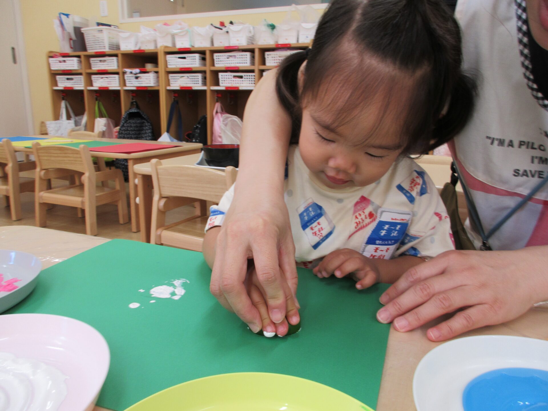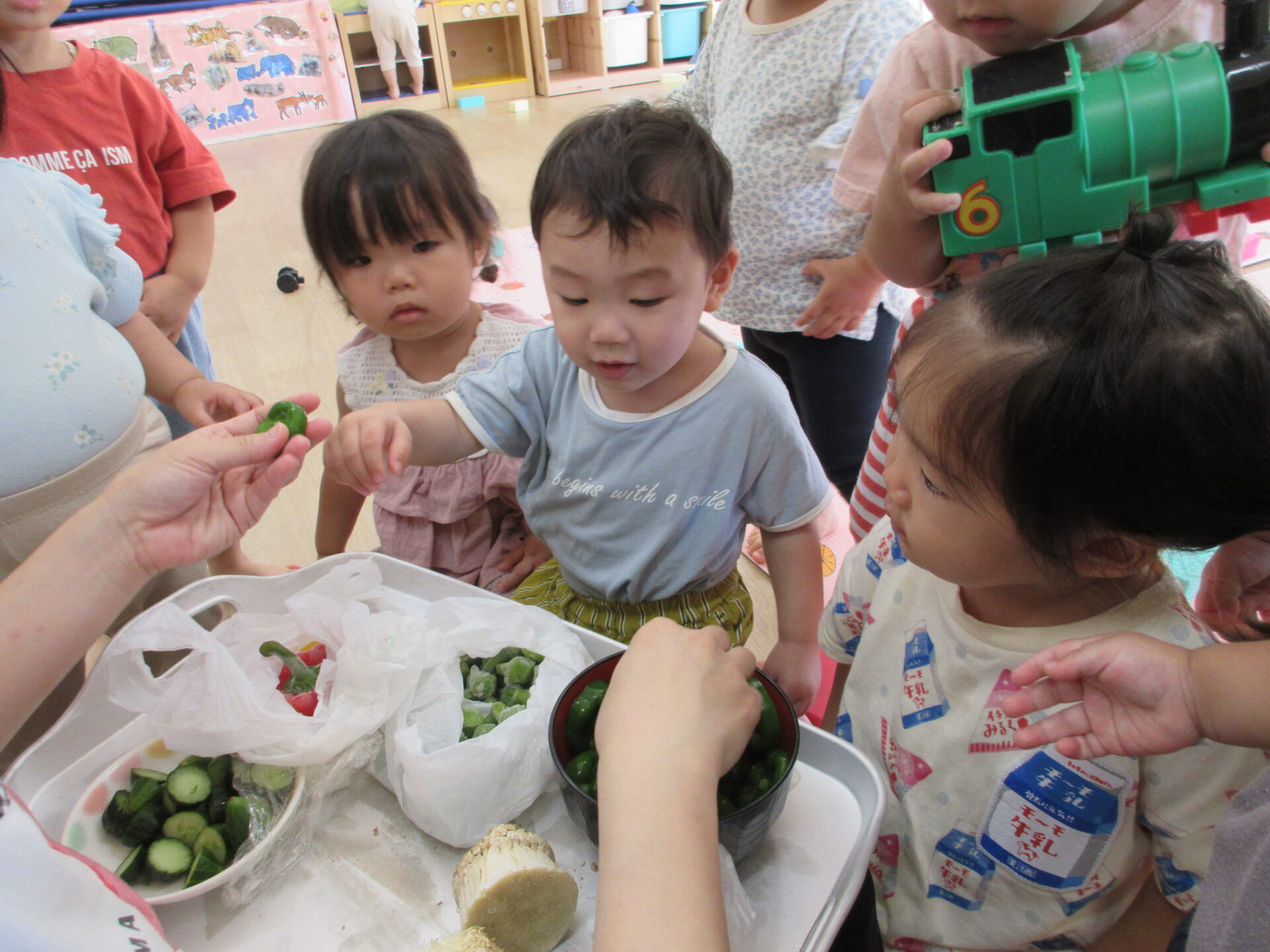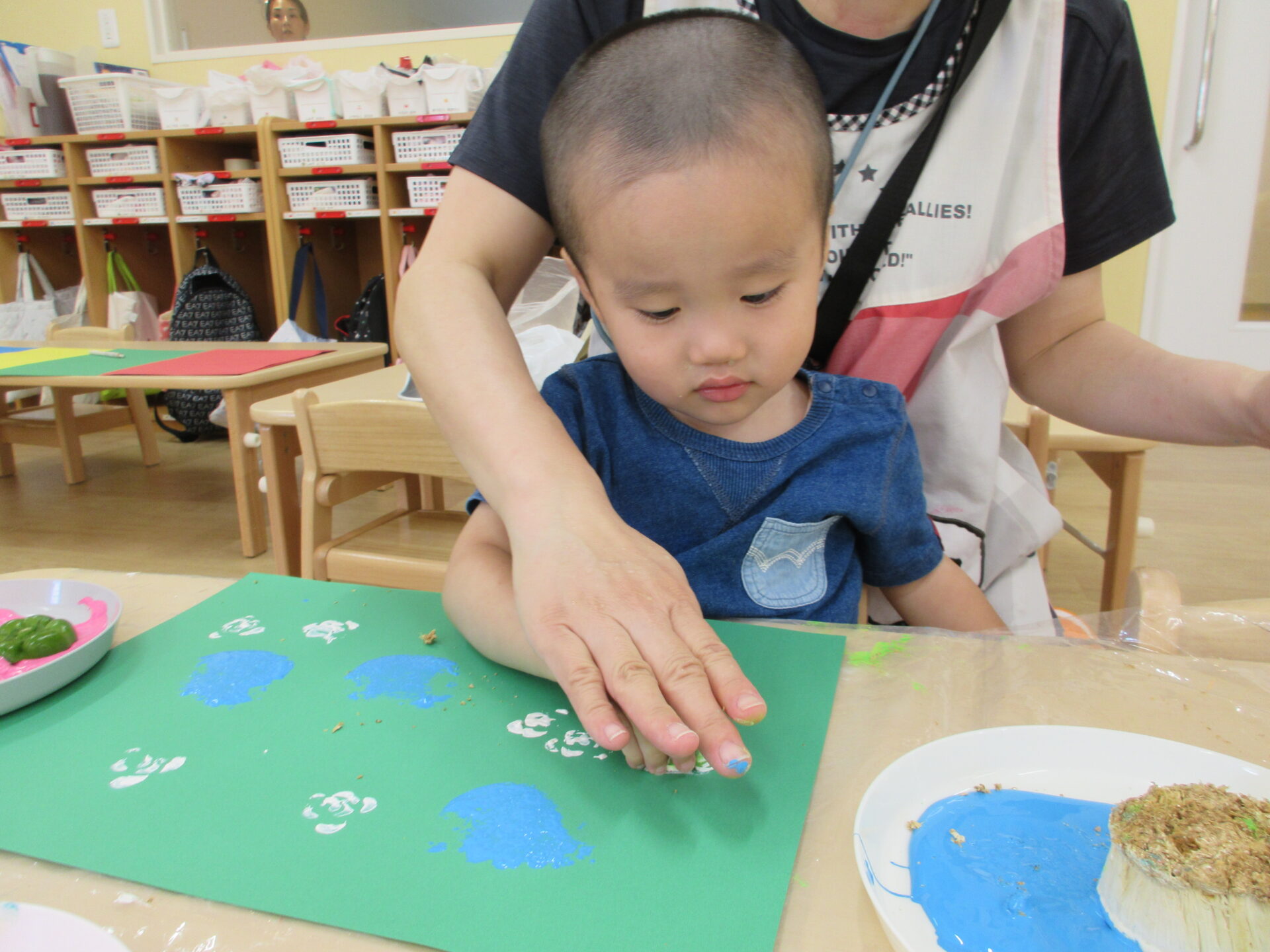 2025.08.04 お知らせ ブログ ペタペタ♪野菜スタンプ (1歳 だいちぐみ) 7月29日、野菜スタンプをしました☆キュウリやピーマン、パプリカ、エノキ、小松菜の断面を見たり、触ったりと興味津々の子どもたち。 慎重にそーっと、そーっと触ろうとしています😊 ピーマンはどんな模様になるかな~ ぺったんぺったん! お花みたいな形がいっぱいできました🌸 「これはみどりー!」と色の名前を言いながらスタンプをする子も♪ 夏ならではの野菜スタンプ、子どもたちも夢中になっていました! 一覧へ戻る