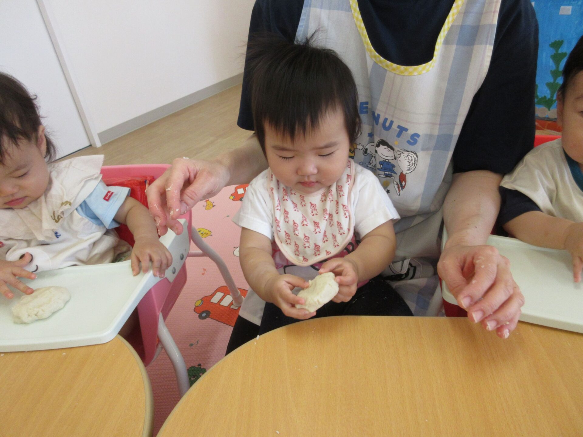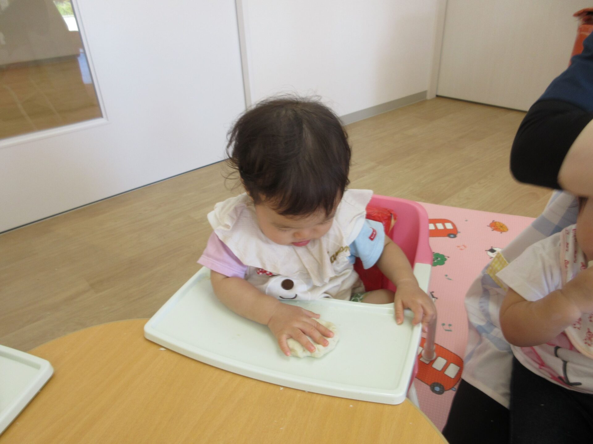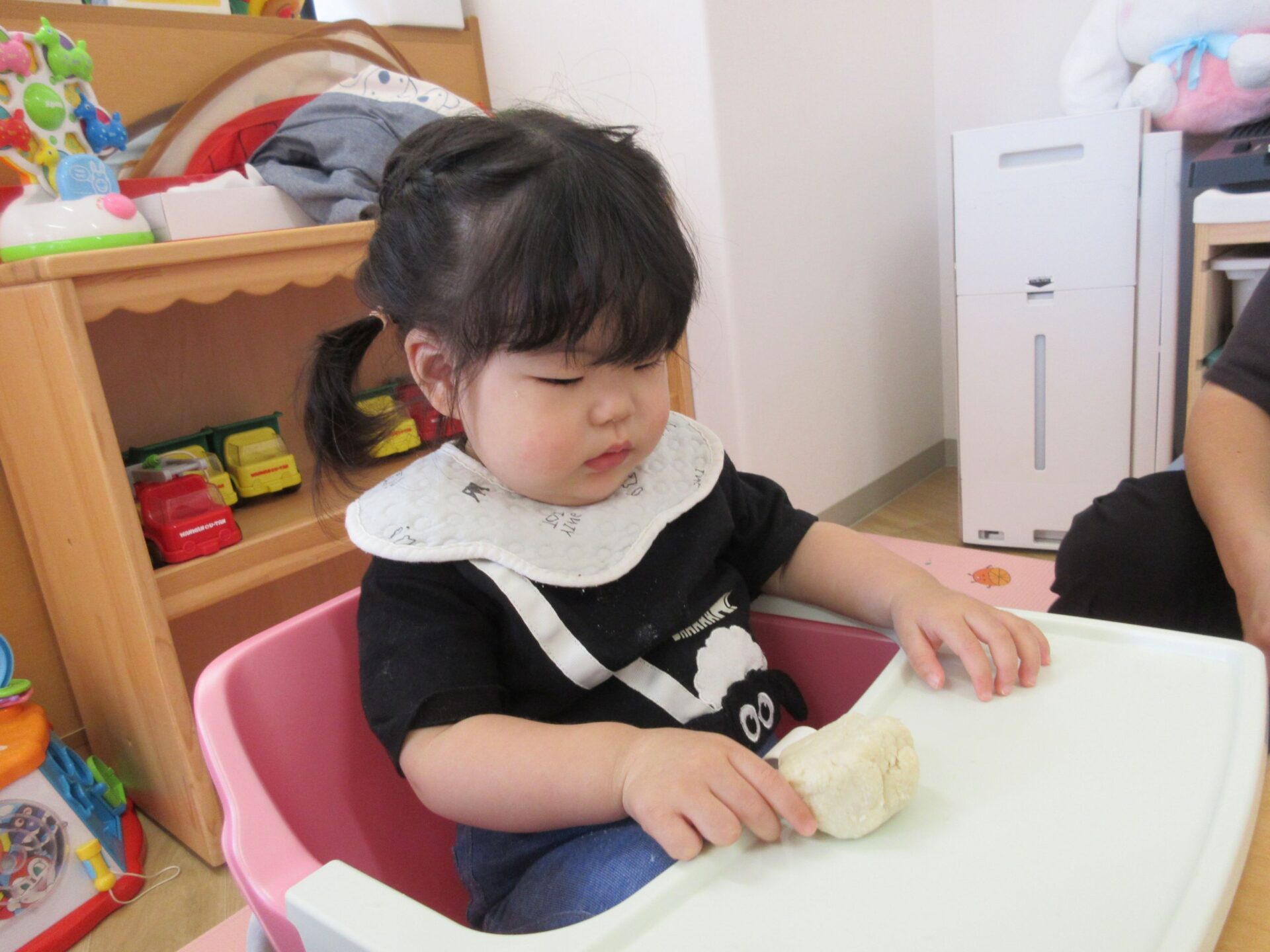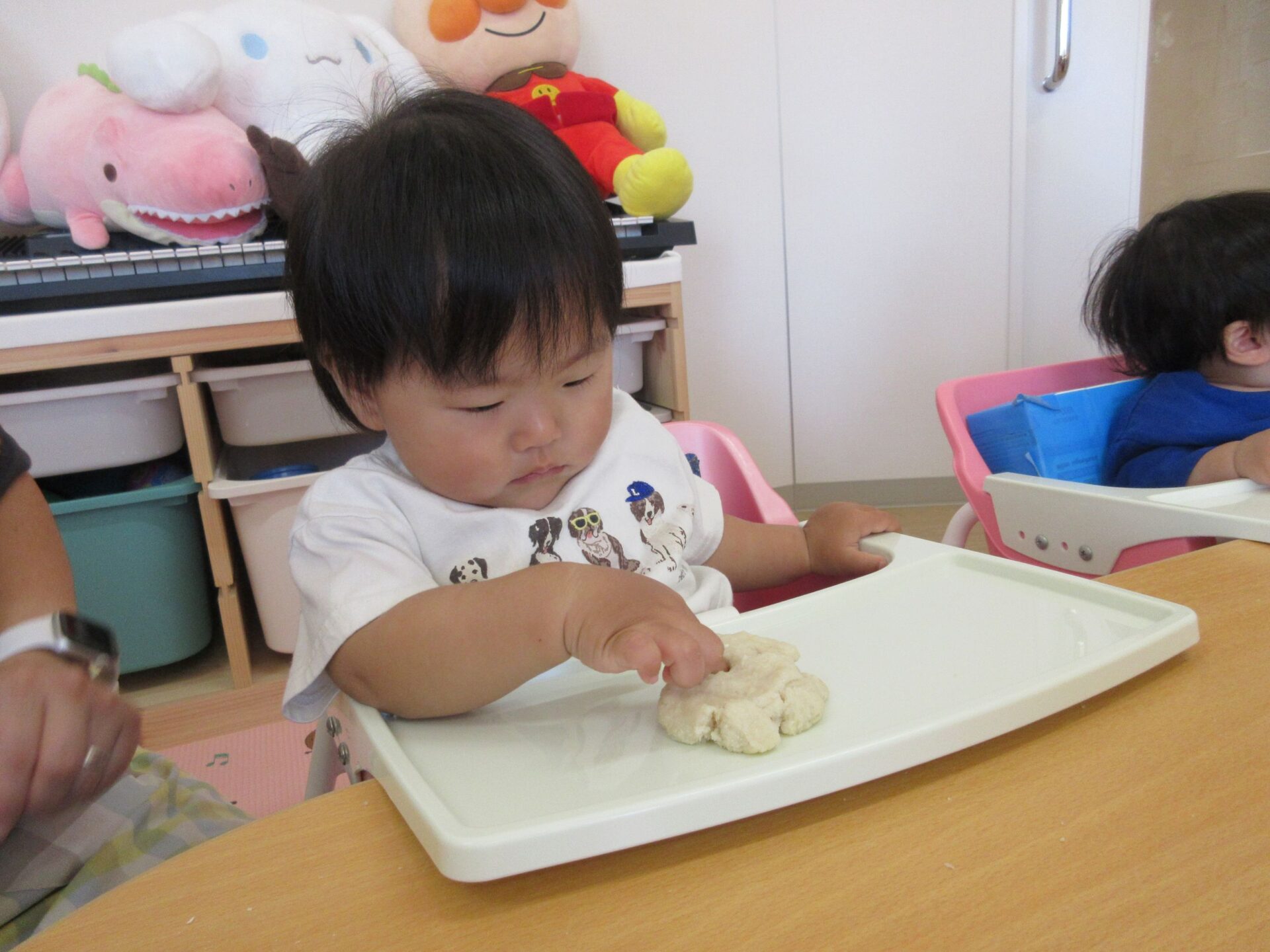 2025.08.01 お知らせ ブログ パン粉粘土で遊んだよ♪(0歳 うみ組) 手の平で触ってみよう! おててで持てたよ♪ どんな触り心地かな~⁉ 触るの楽しいよ♪ あれ⁉ 指についちゃった~‼ ポンポンポン!楽しいな~♪ 触るの・・・ドキドキ! よ~し!指で押してみよう‼ パン粉うどんの出来上がり!初めてのパン粉粘土、みんな興味津々で触っていました♪ 一覧へ戻る