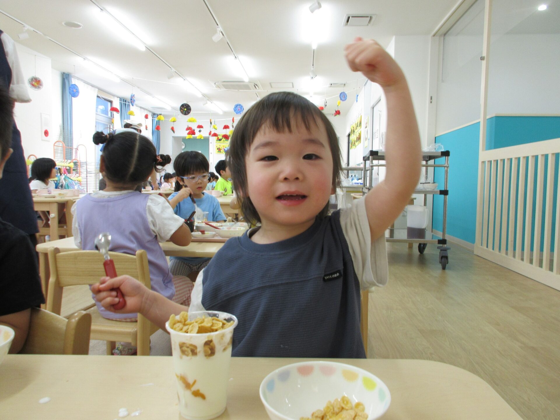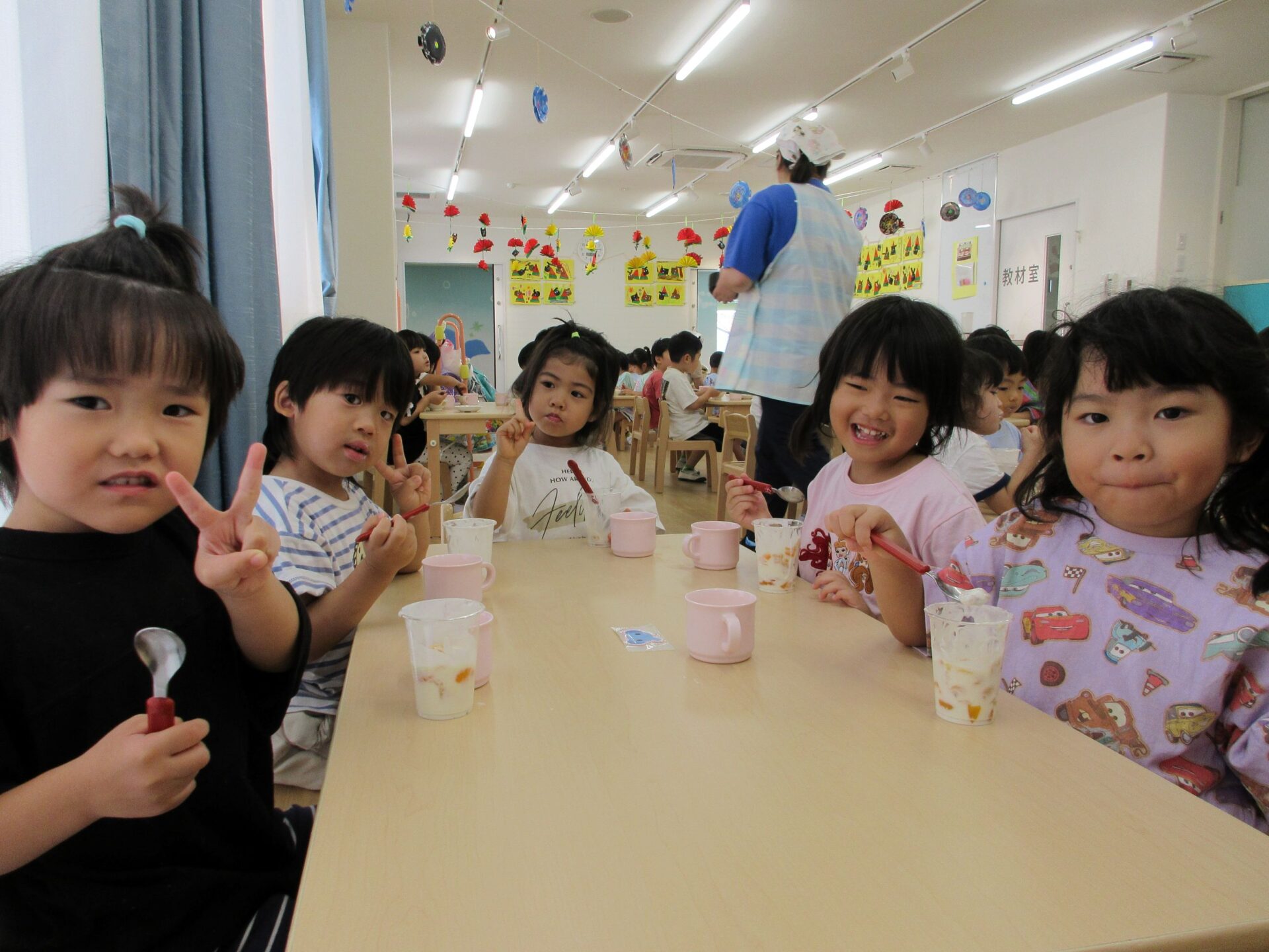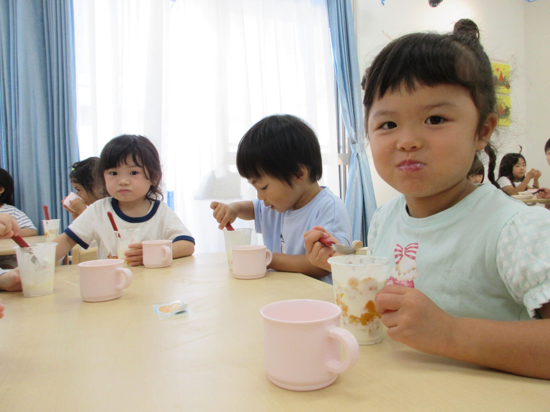 製作でパフェを作っていたので、「きょうはたべれるパフェや~」と、大喜びでした(*’▽’)
