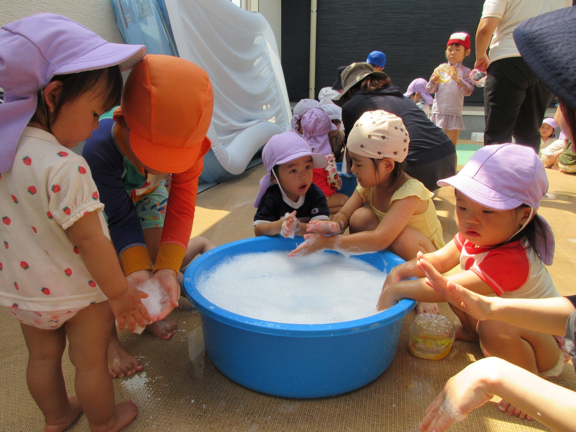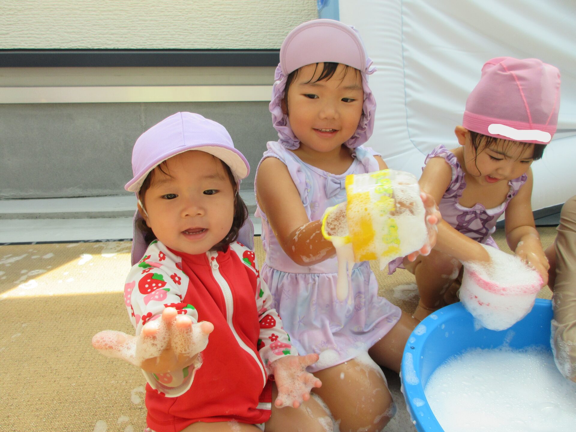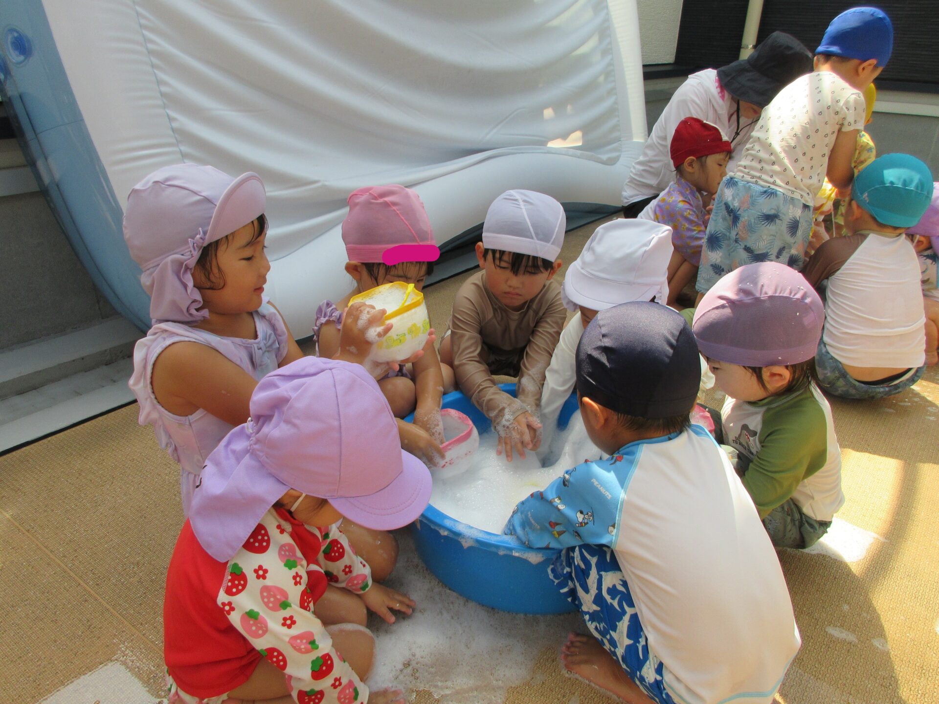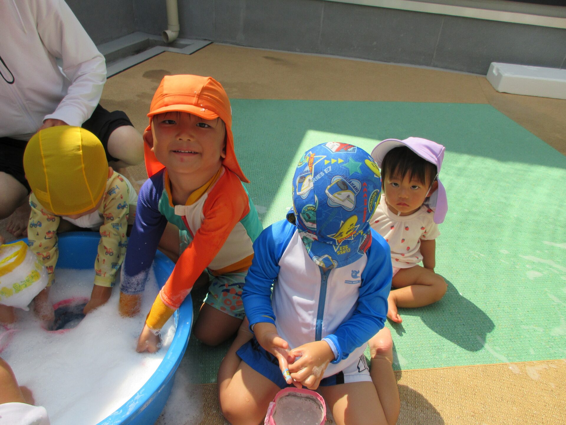 8月20日、だいちぐみとにじぐみがテラスで泡遊びをしました♪