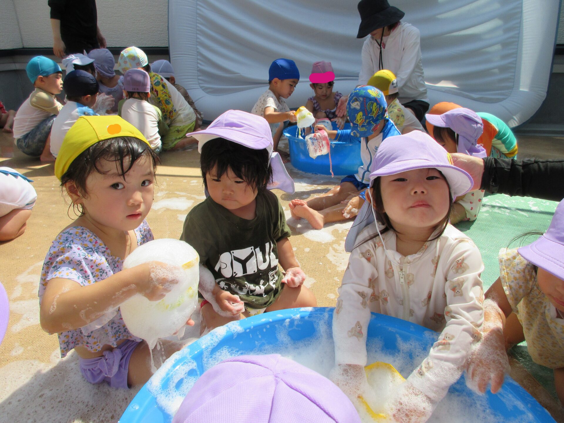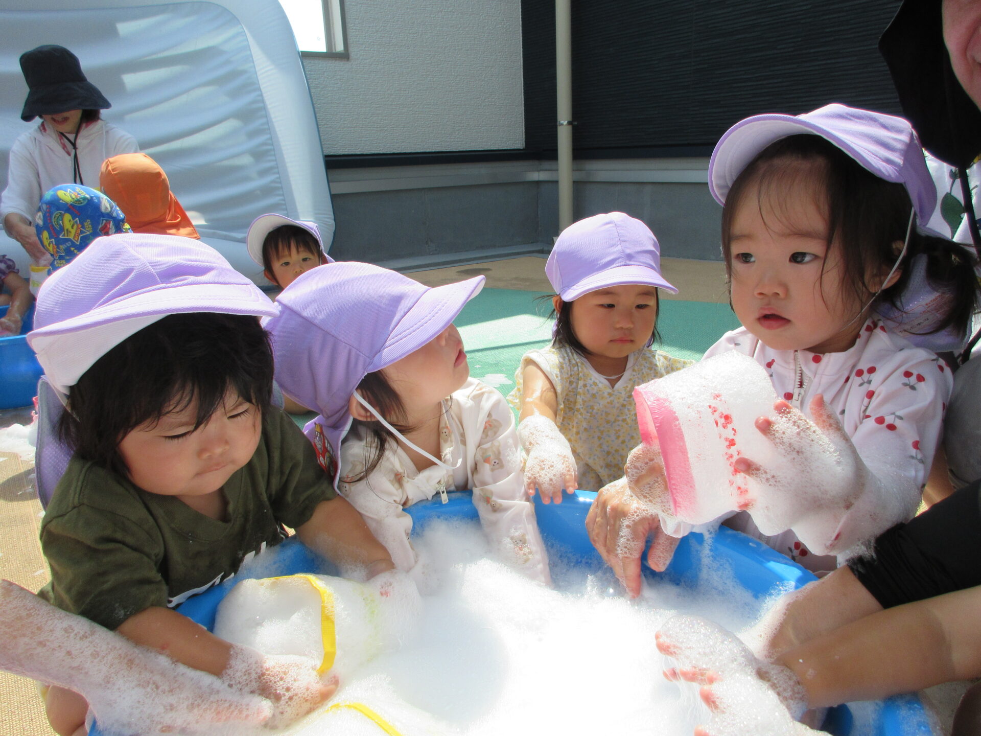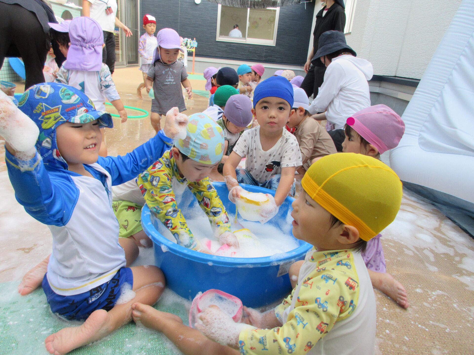 8月20日、だいちぐみとにじぐみがテラスで泡遊びをしました♪
