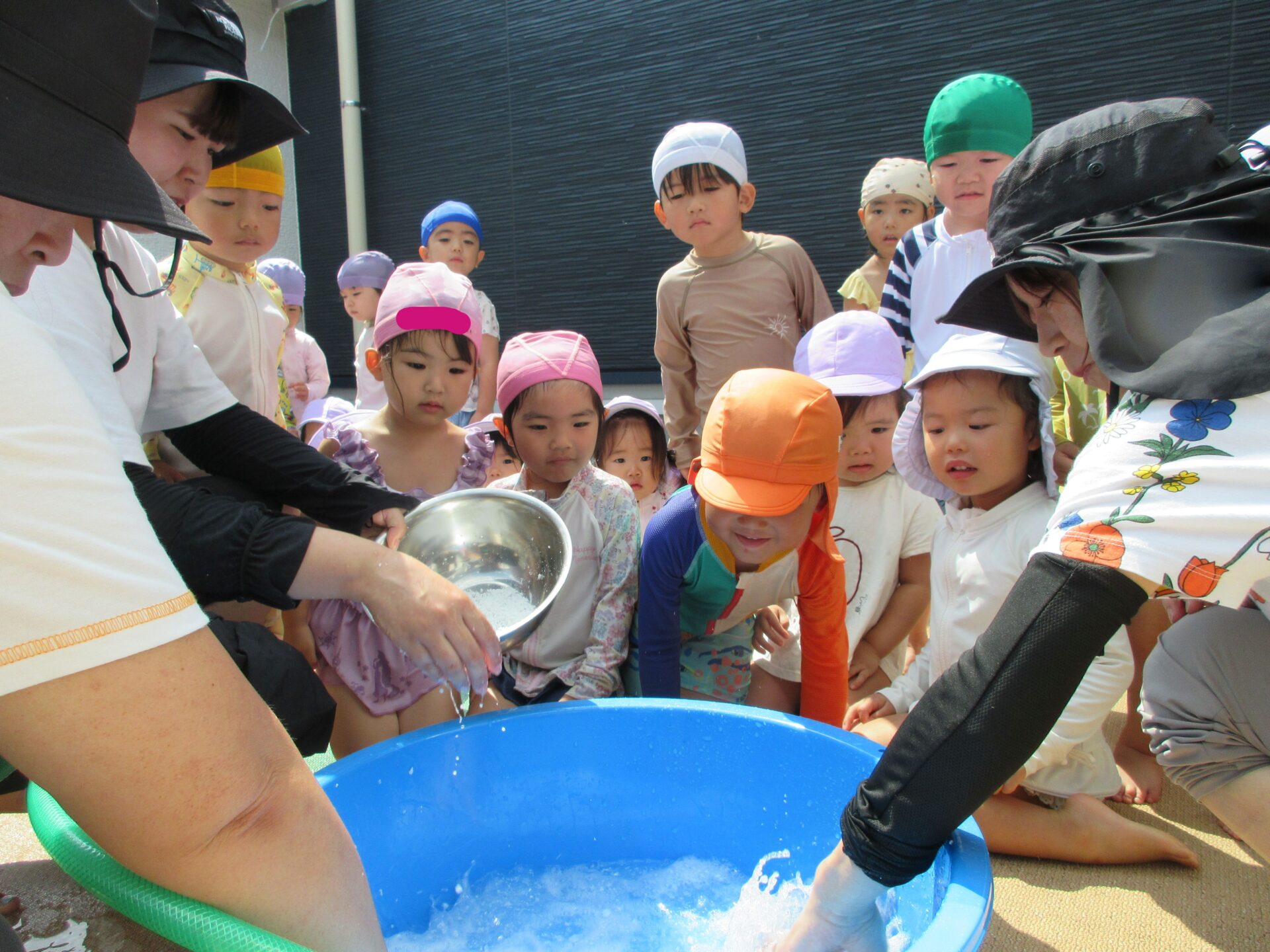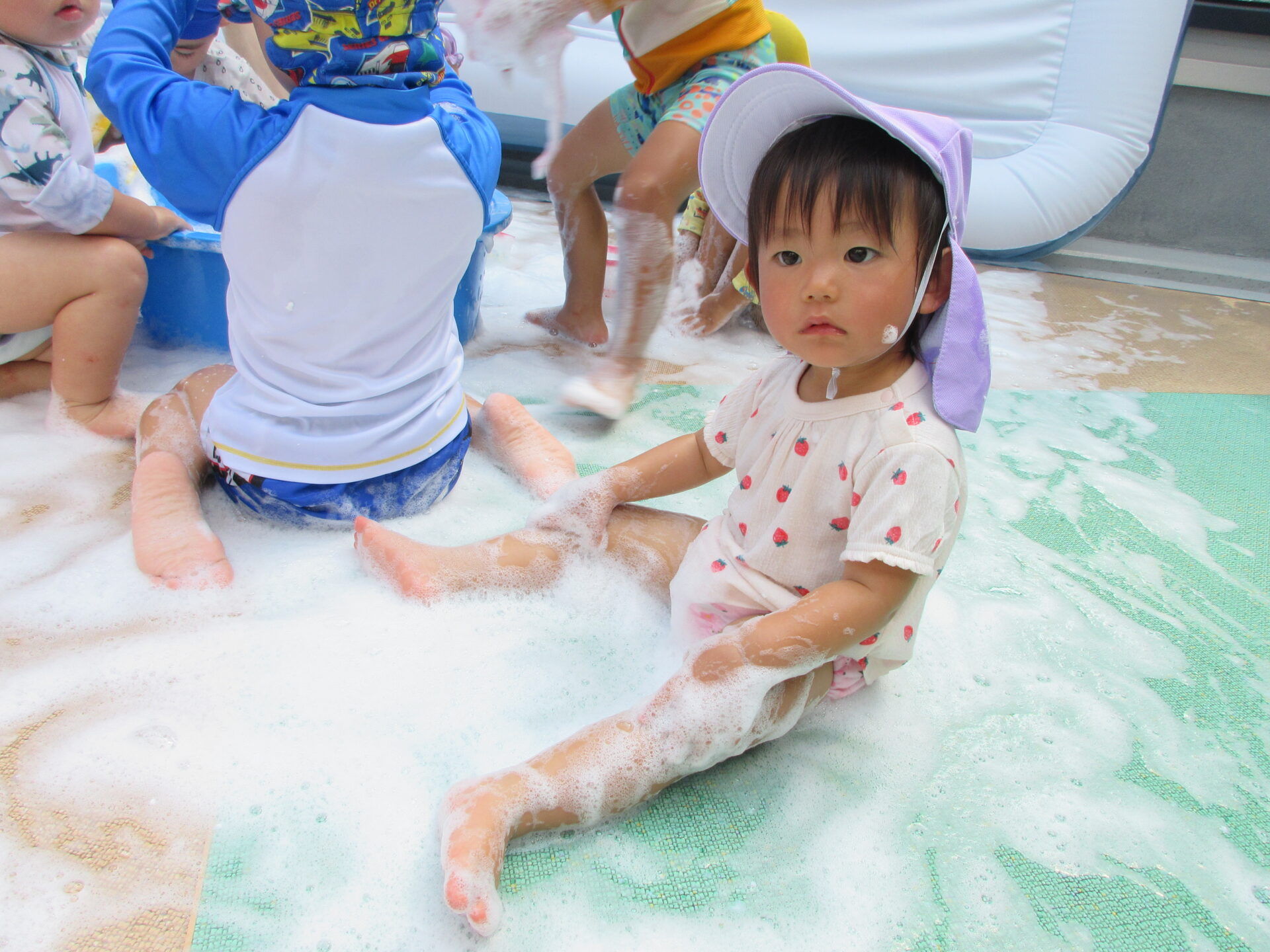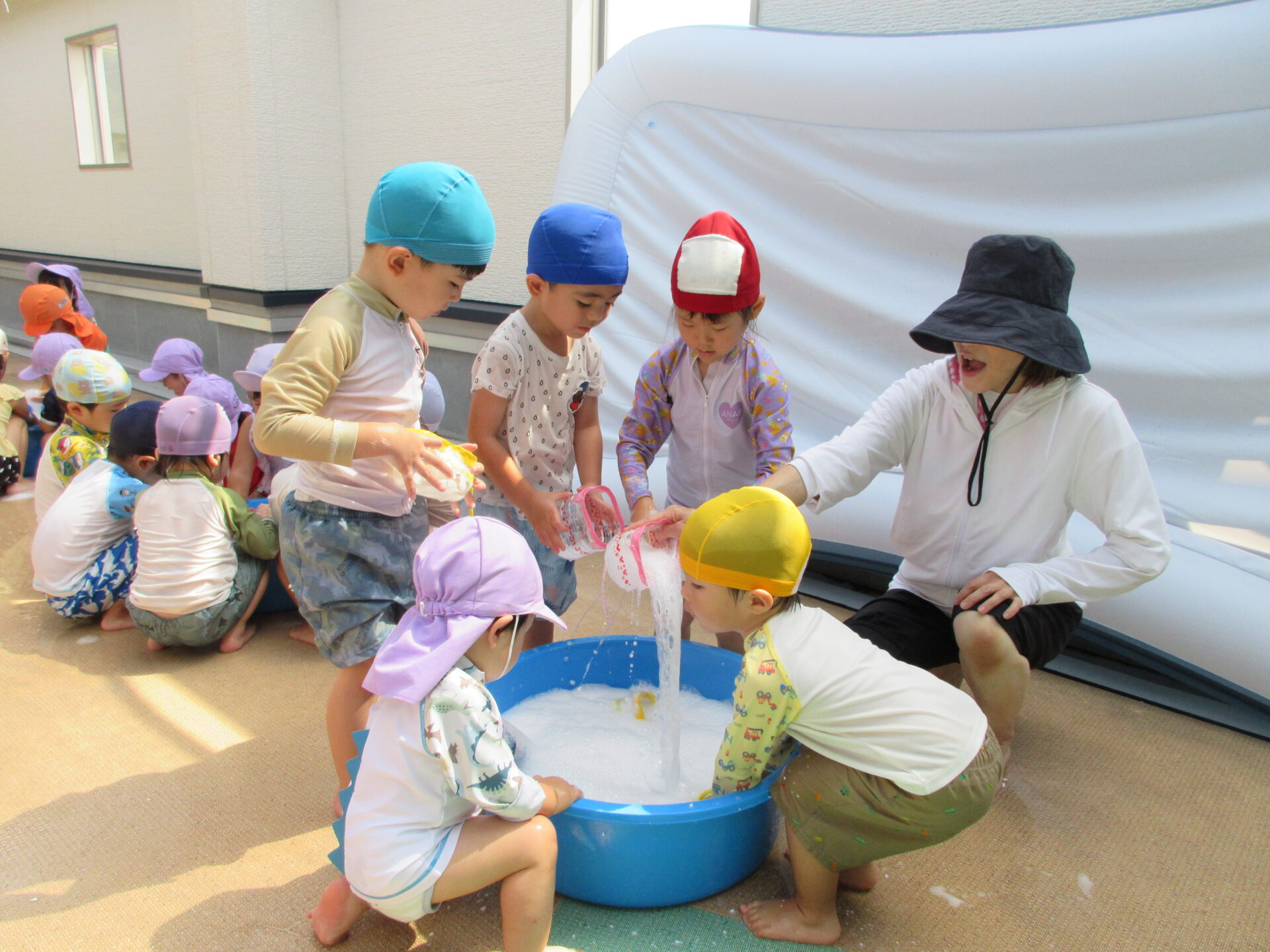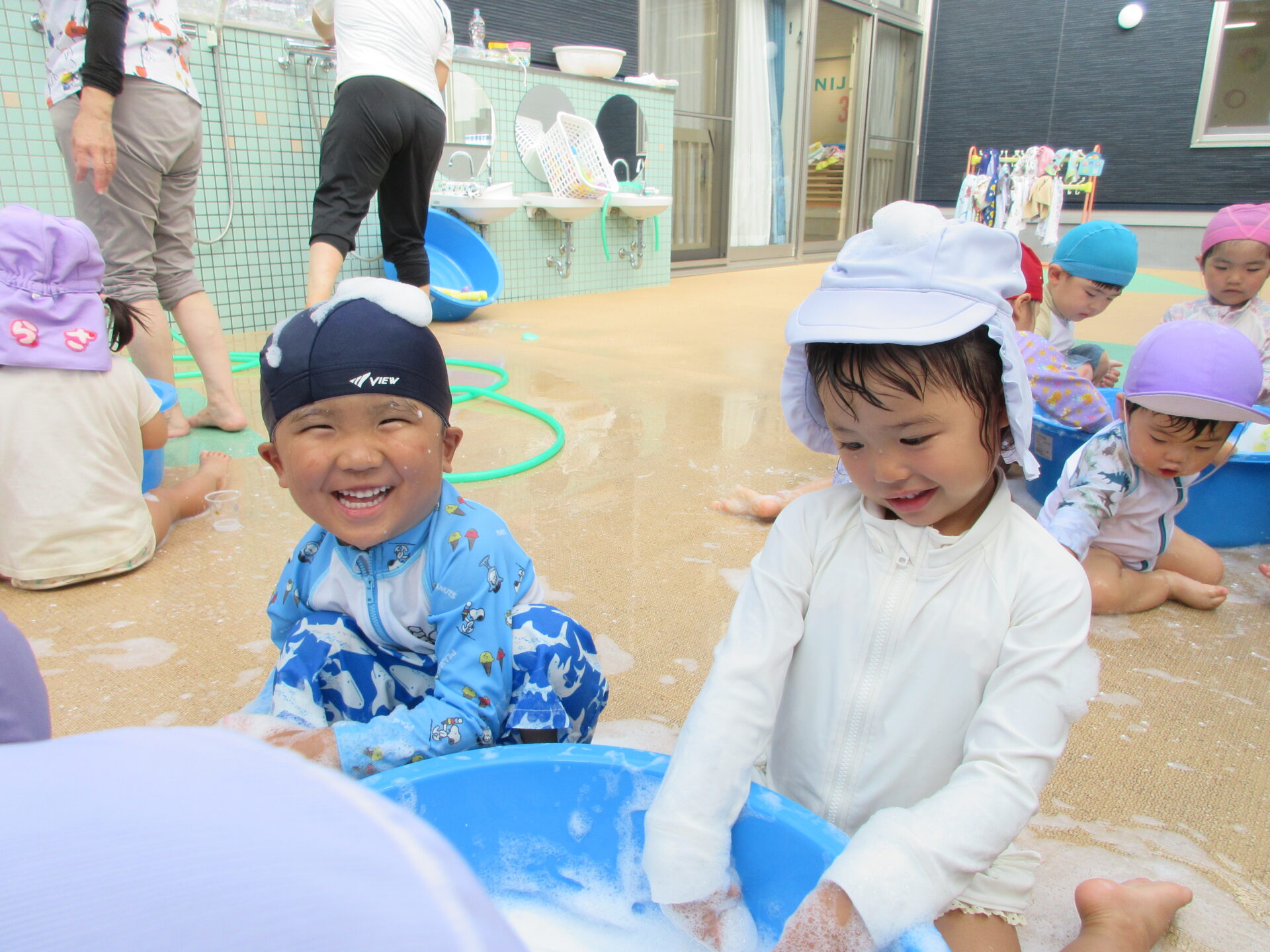 8月20日、だいちぐみとにじぐみがテラスで泡遊びをしました♪