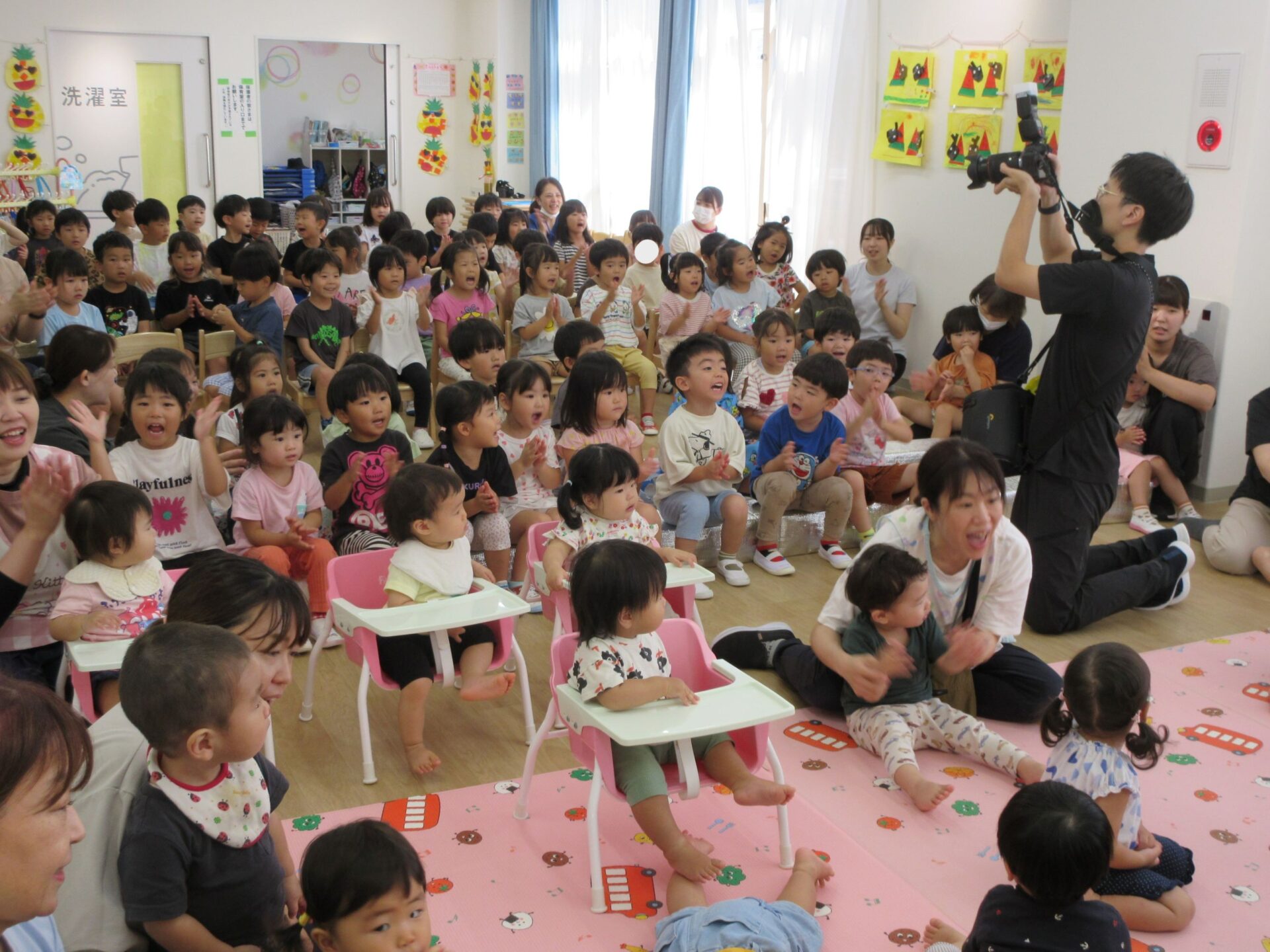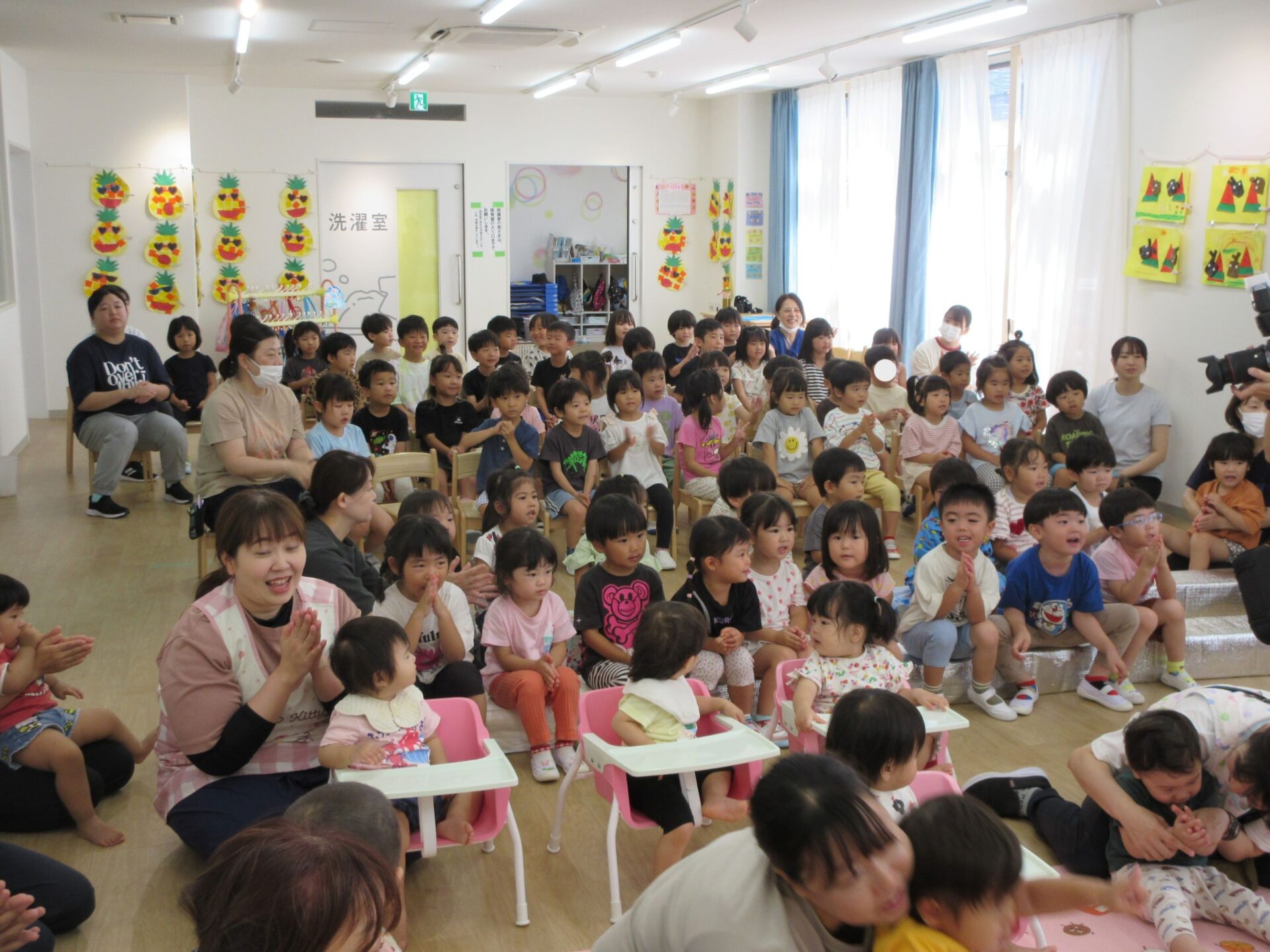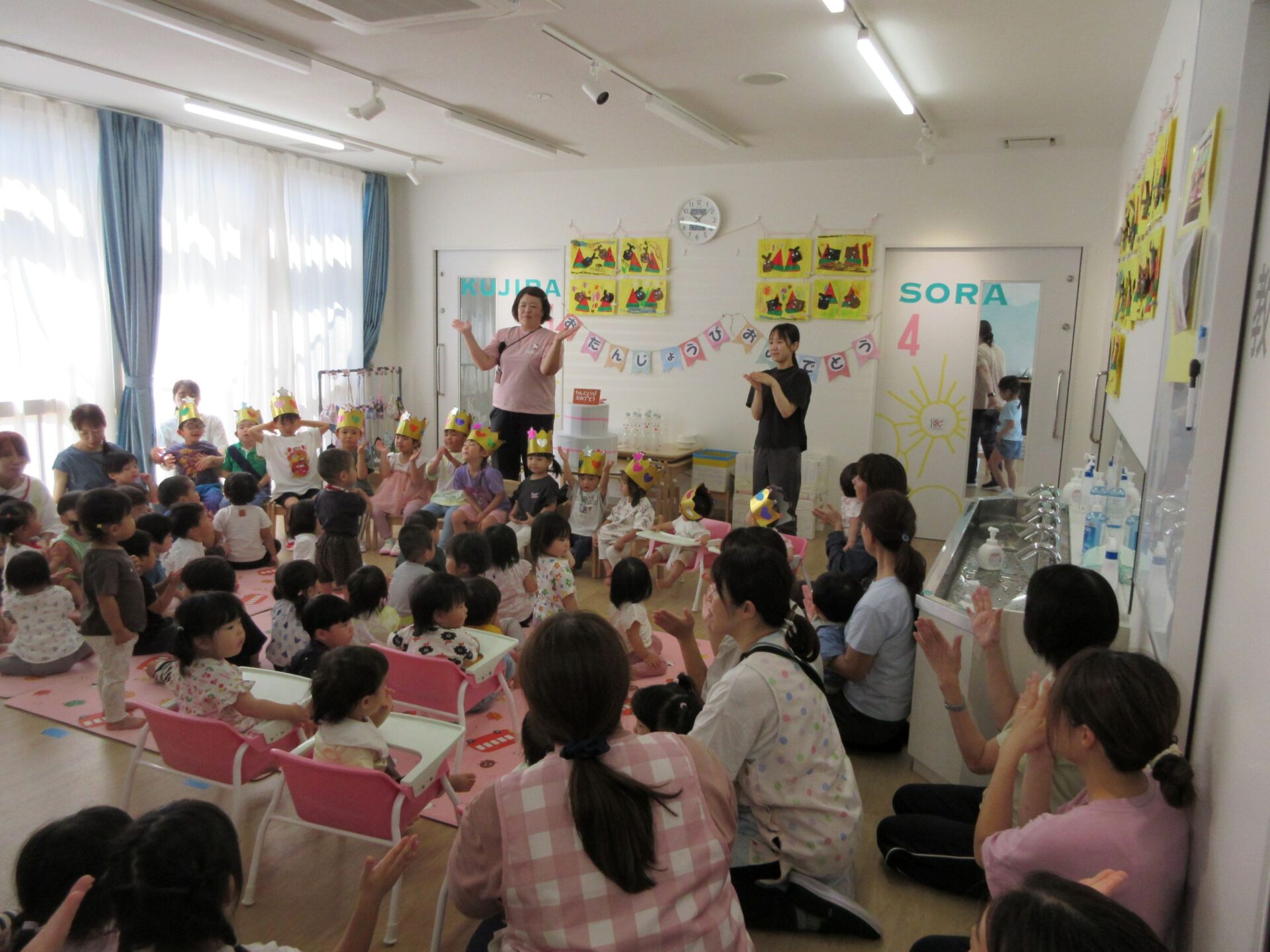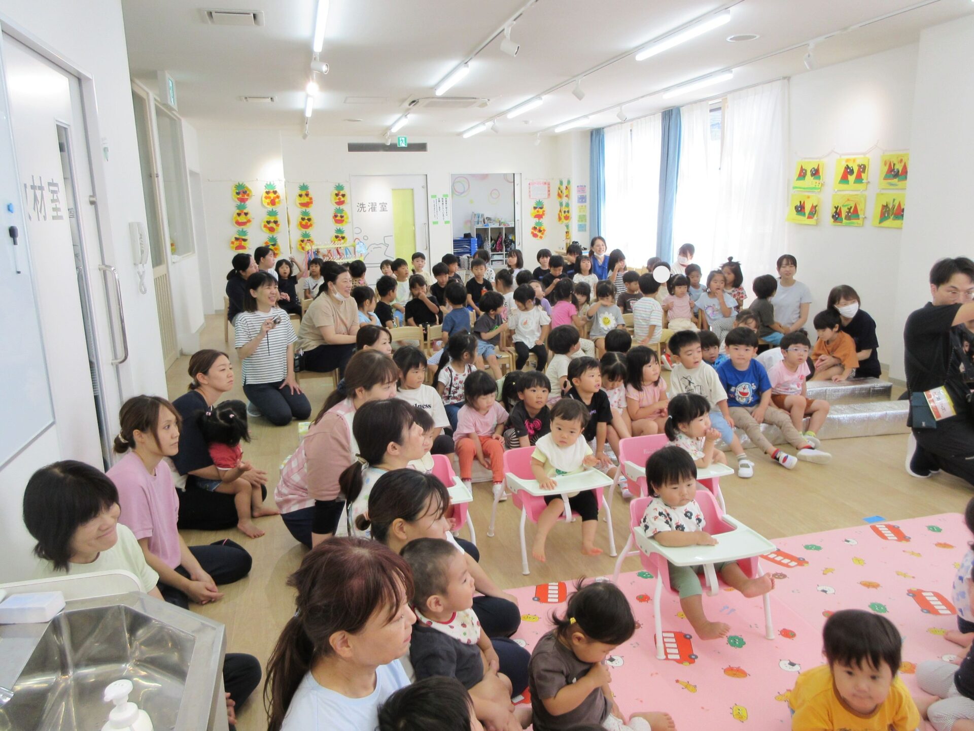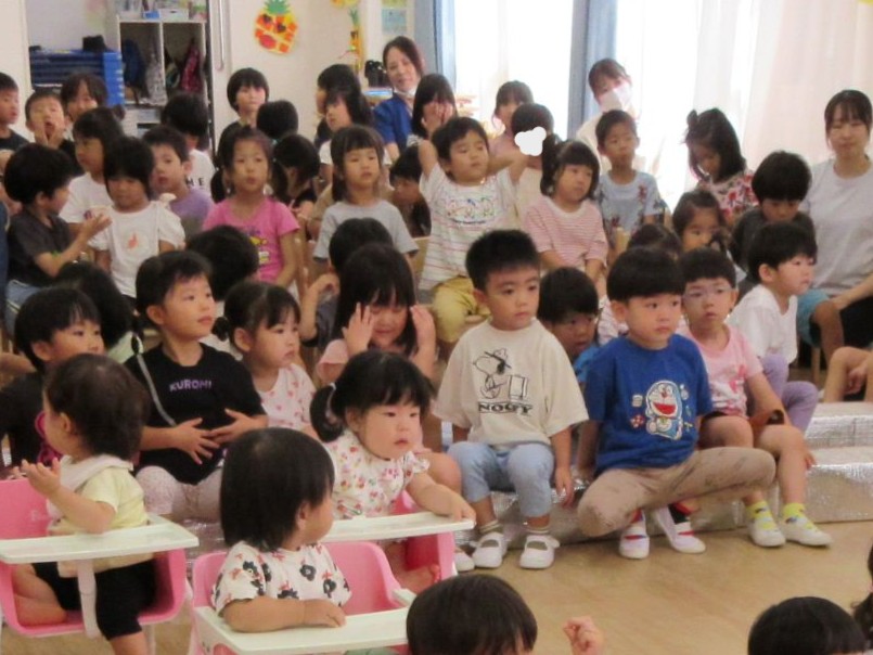 8月21日(木)、2階ランチルームに全クラスが集まり、お誕生会を行いました。