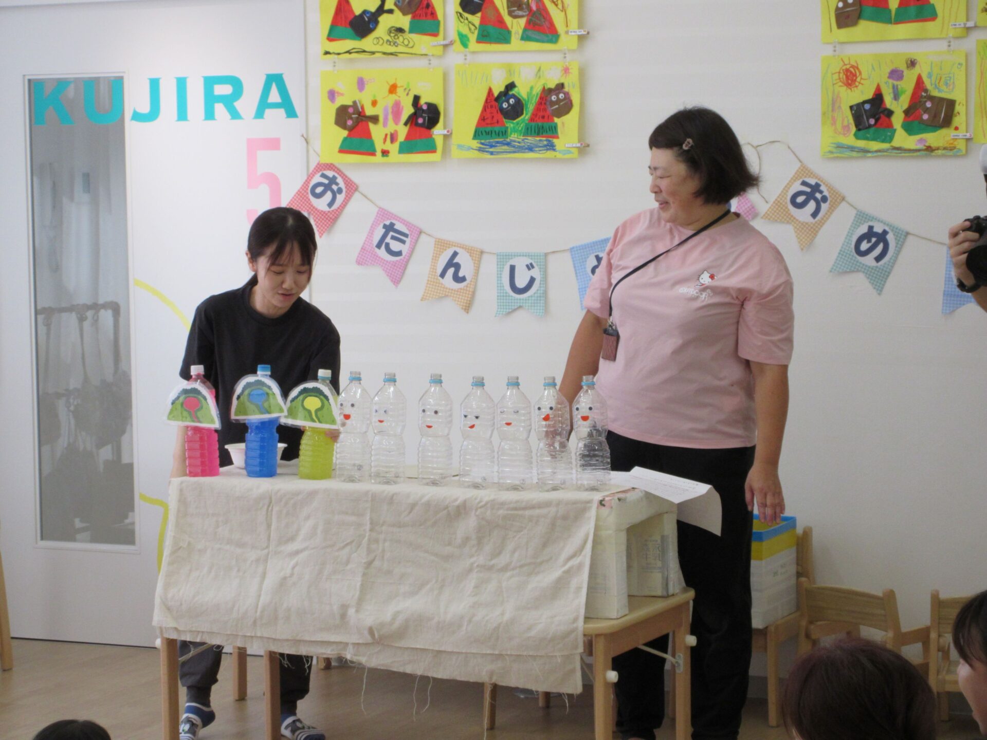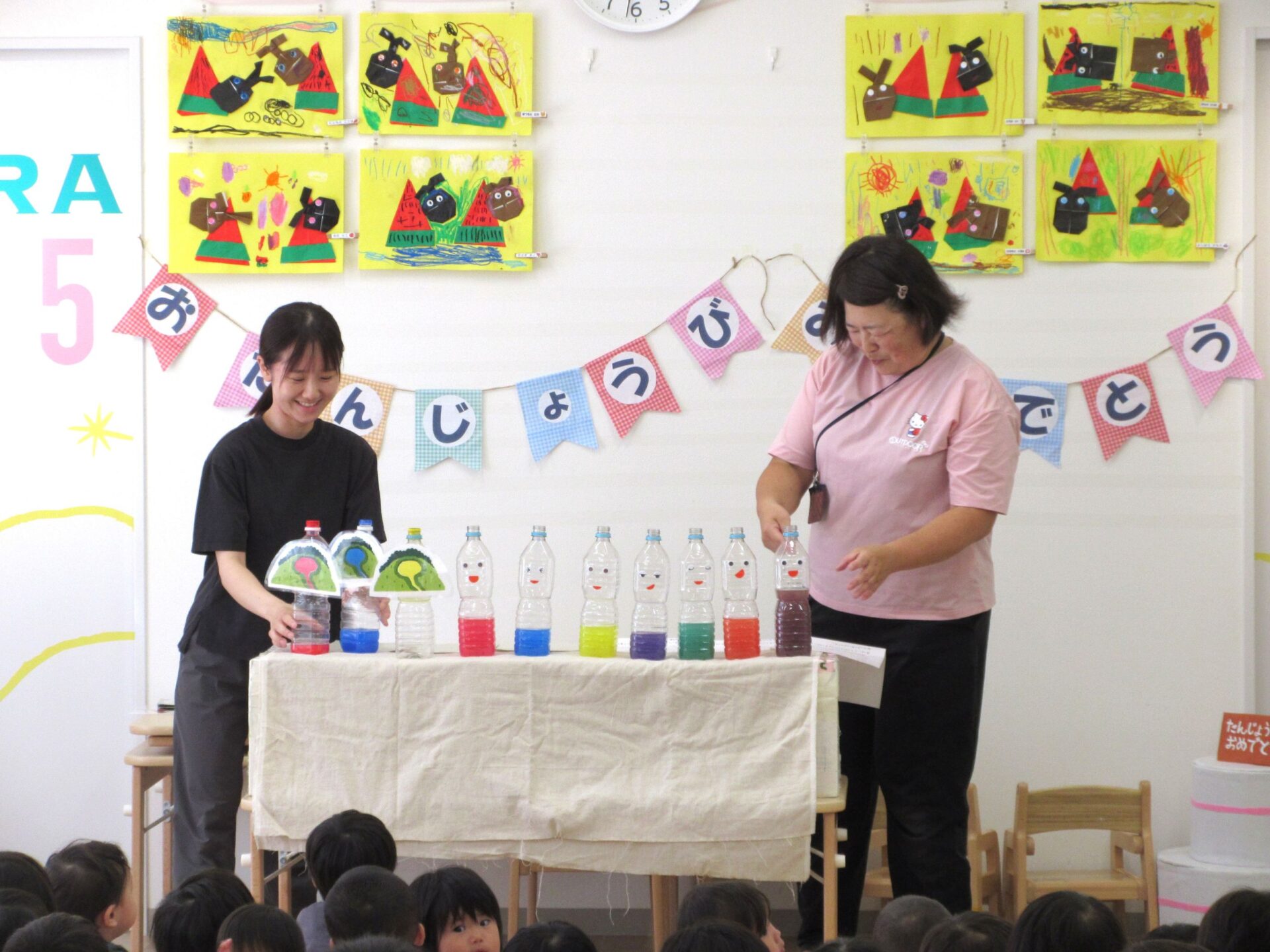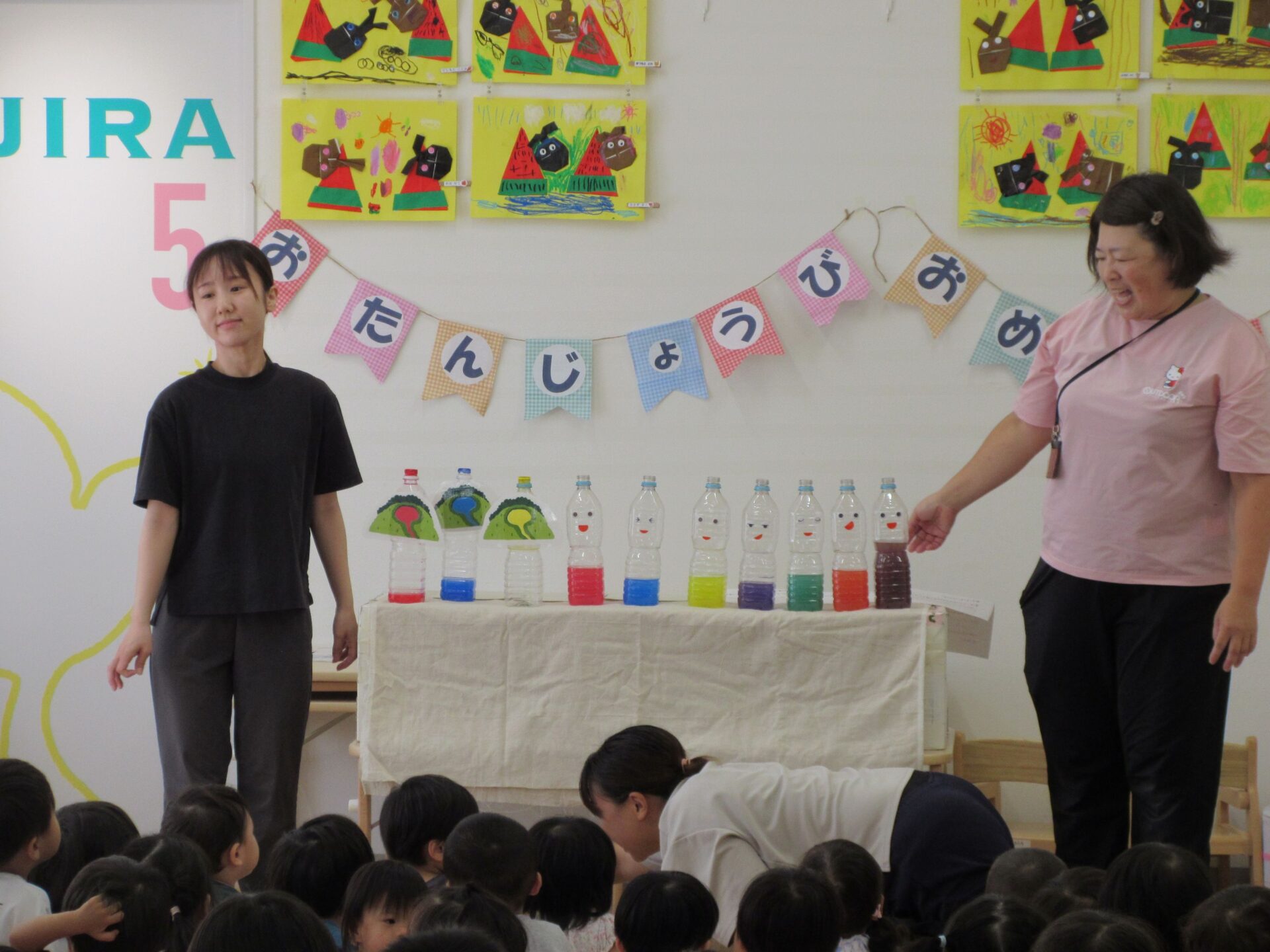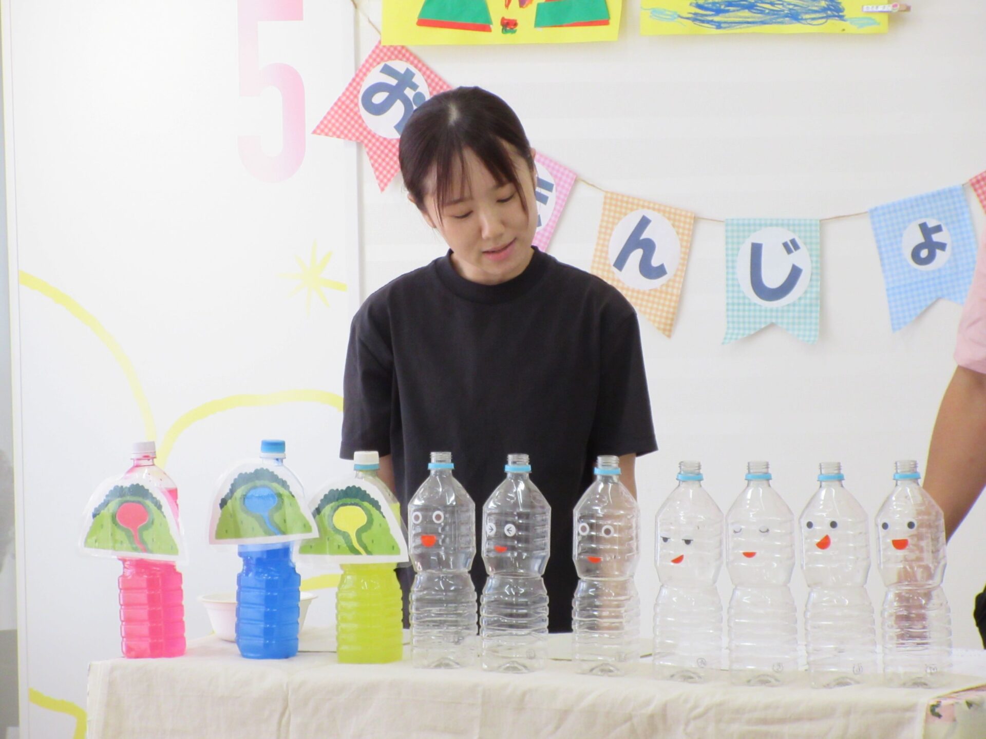 きれいな色の水と、お顔のついたペットボトル、何が始まるのかな。