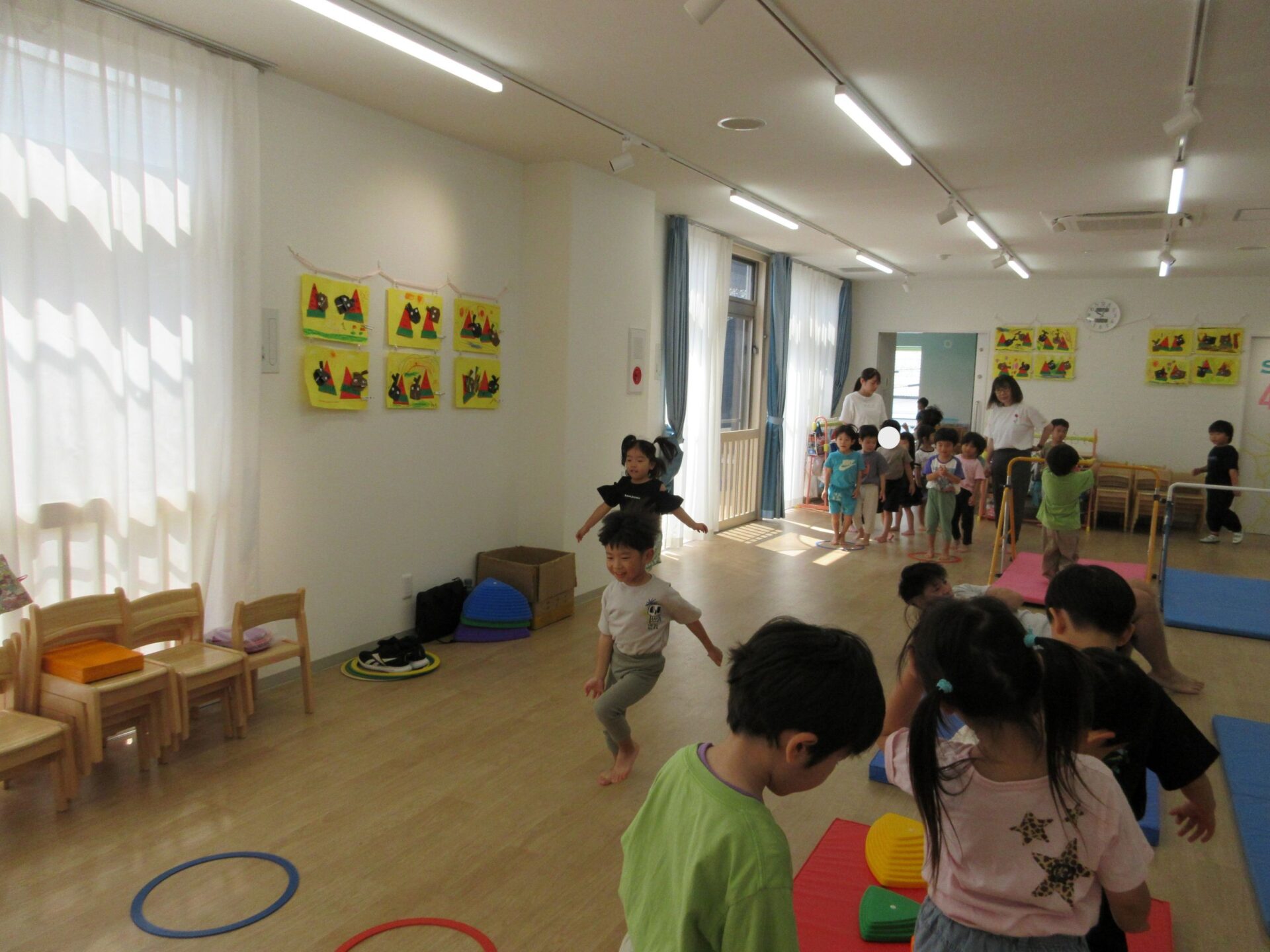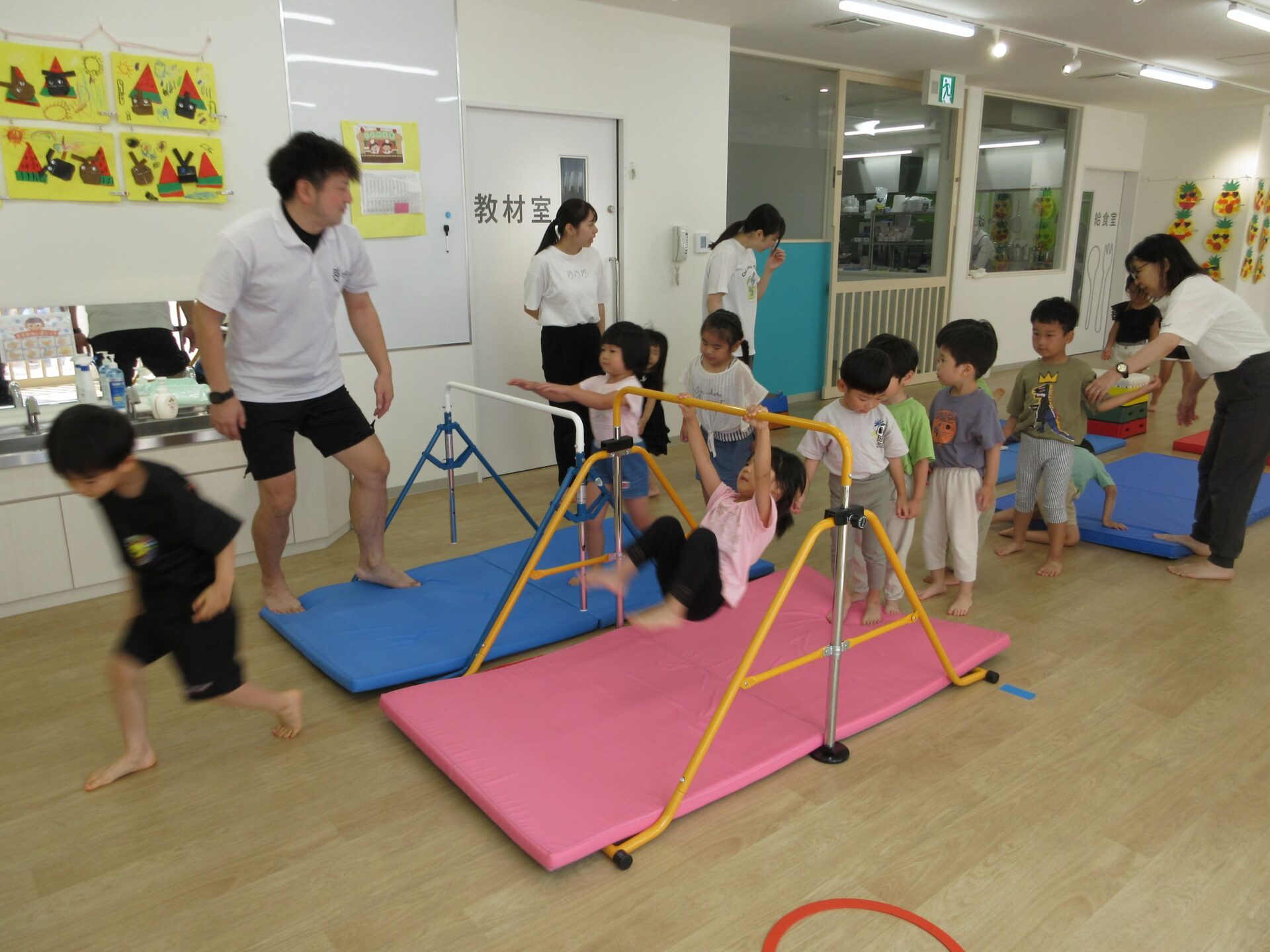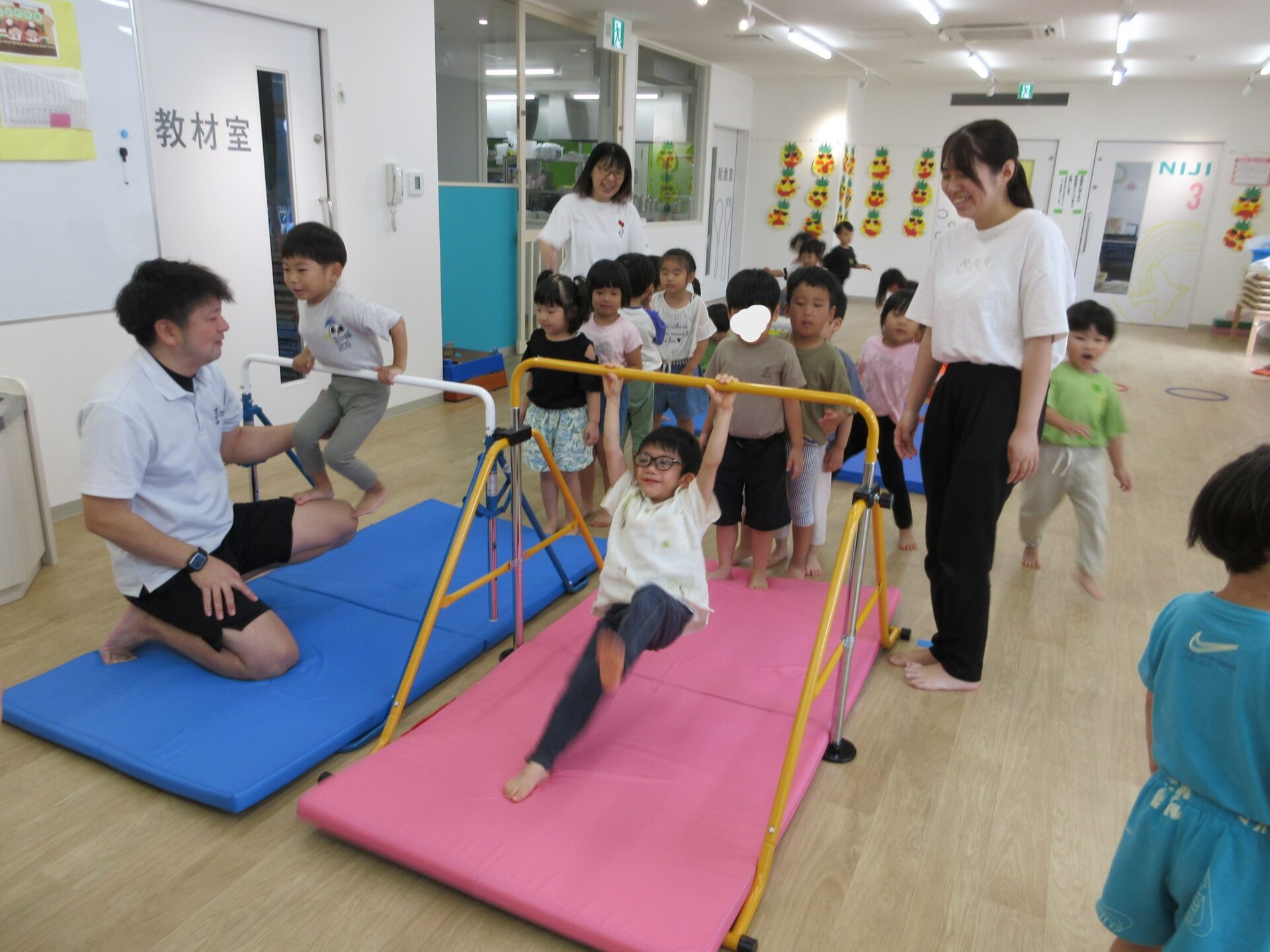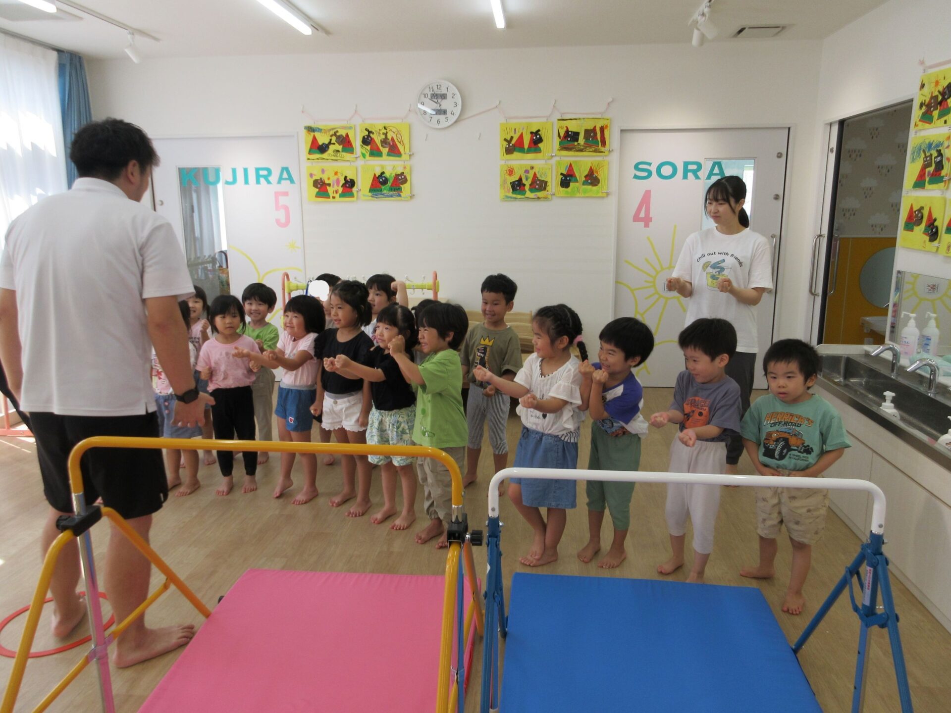 2025.08.28 お知らせ ブログ 運動あそび教室(4歳そら組) 8月20日(水)、10時から4歳そら組の運動遊びの時間が始まりました。 説明や準備運動をして始まりです。 走る、飛び石渡り、跳び箱ジャンプ! それっ! じゃ~んぷ! ジャンプ! スキップもやりましたよ。 上手にできていましたよ。 鉄棒にもぶらさがります。腕を伸ばして。腕を曲げて。 ツバメさん。 説明をしっかり聞いて、何度もチャレンジしたよ。 一覧へ戻る