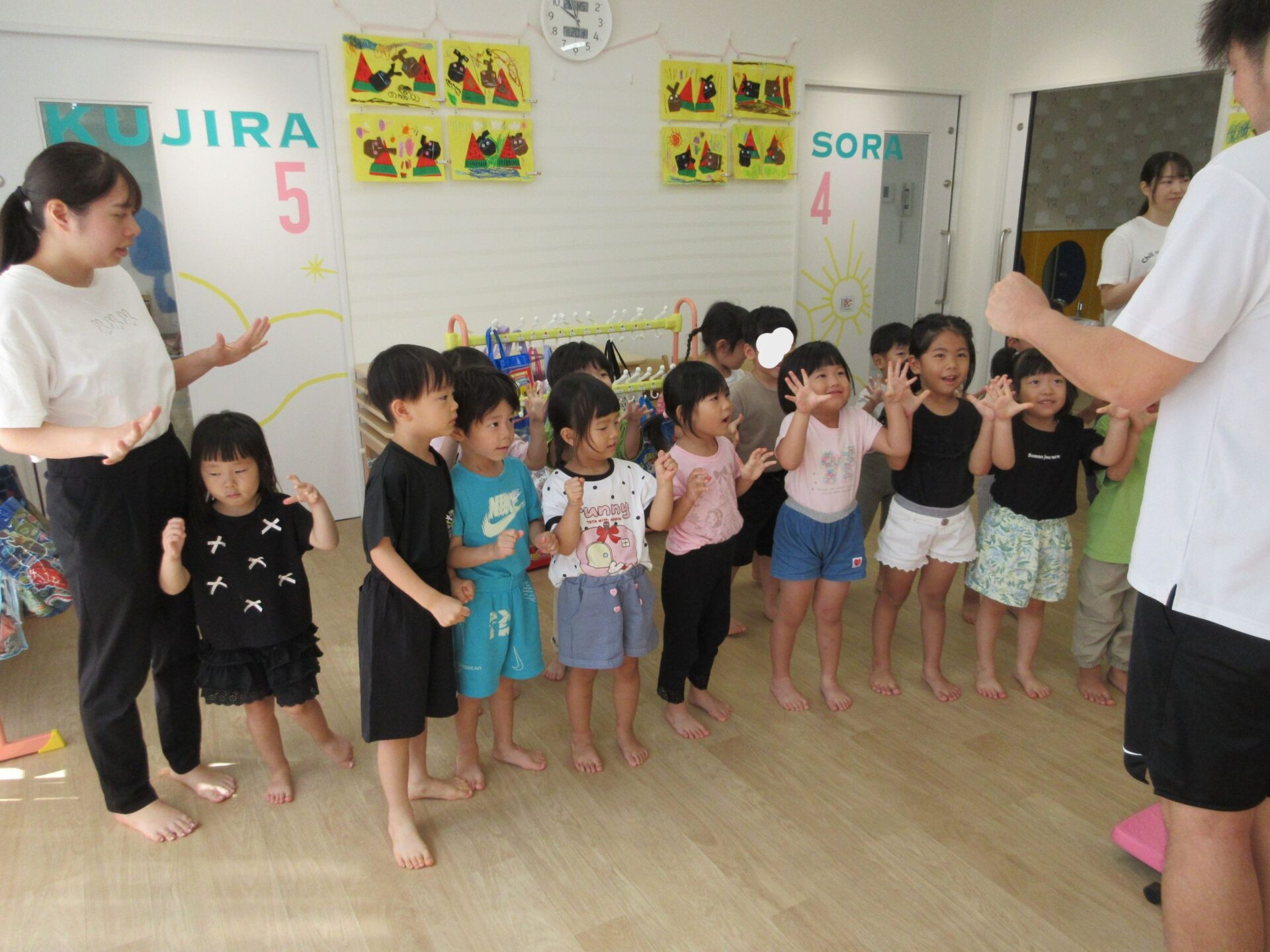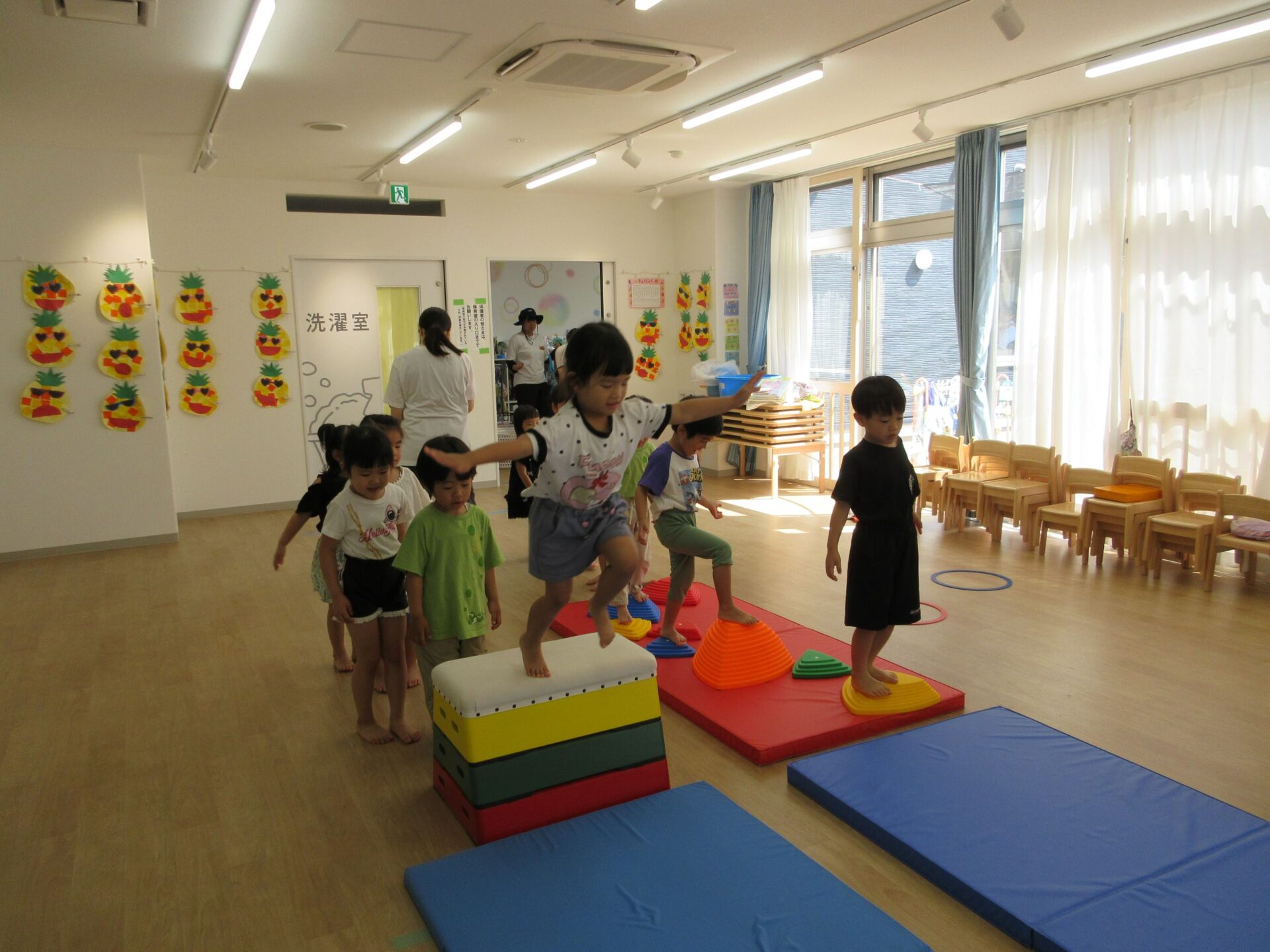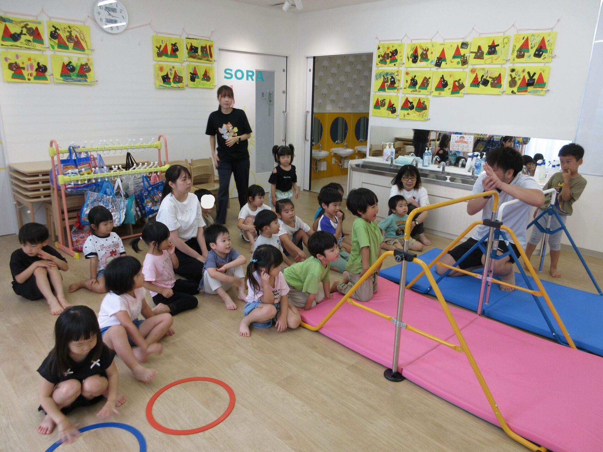 2025.08.28 お知らせ ブログ 運動あそび教室(4歳そら組) 8月20日(水)、10時から4歳そら組の運動遊びの時間が始まりました。 説明や準備運動をして始まりです。 走る、飛び石渡り、跳び箱ジャンプ! それっ! じゃ~んぷ! ジャンプ! スキップもやりましたよ。 上手にできていましたよ。 鉄棒にもぶらさがります。腕を伸ばして。腕を曲げて。 ツバメさん。 説明をしっかり聞いて、何度もチャレンジしたよ。 一覧へ戻る