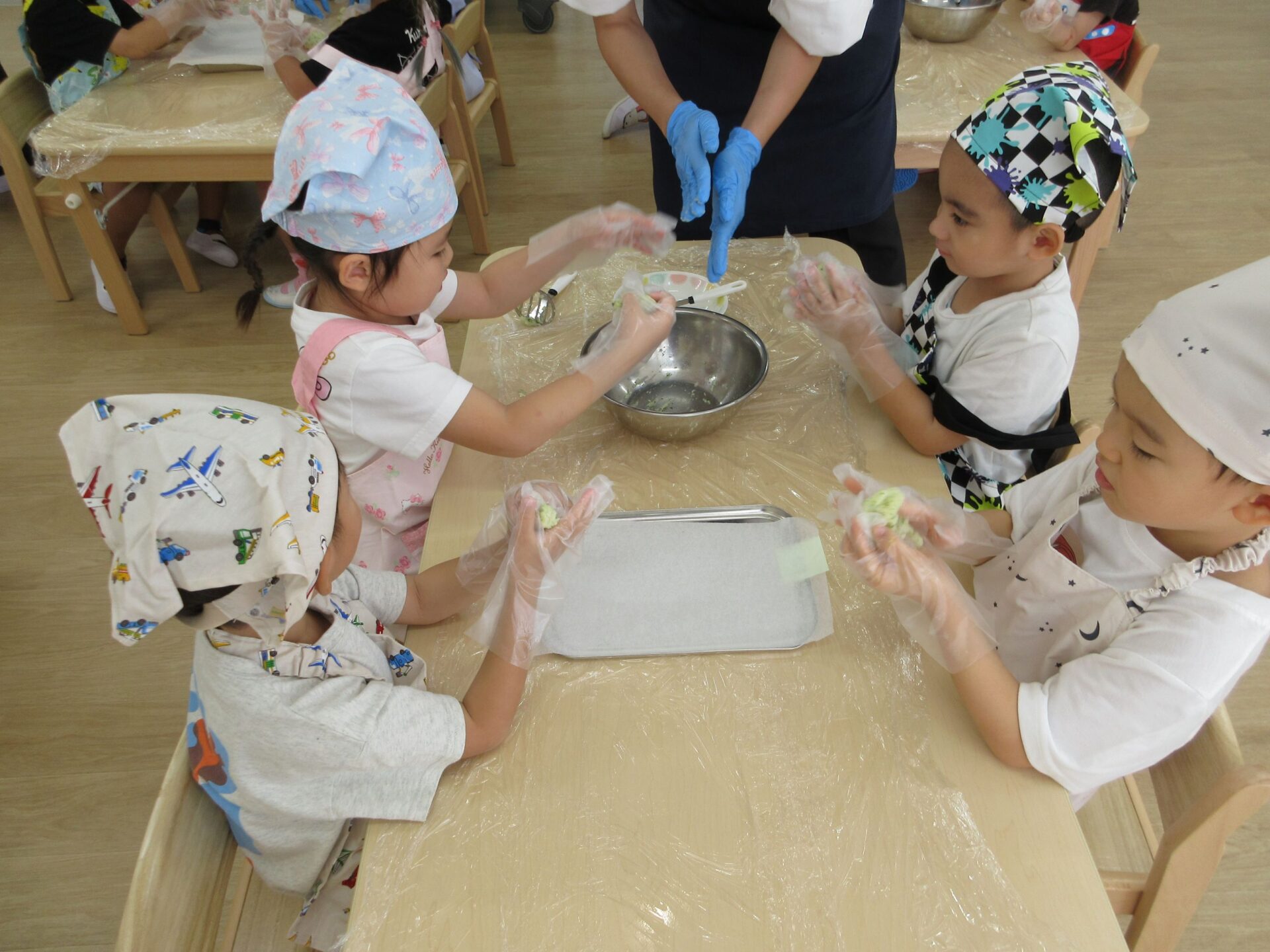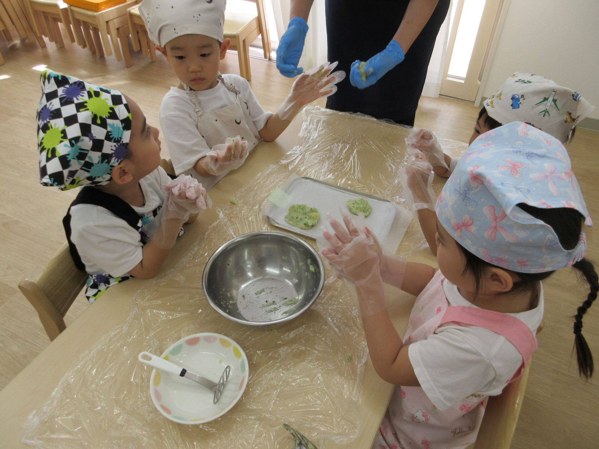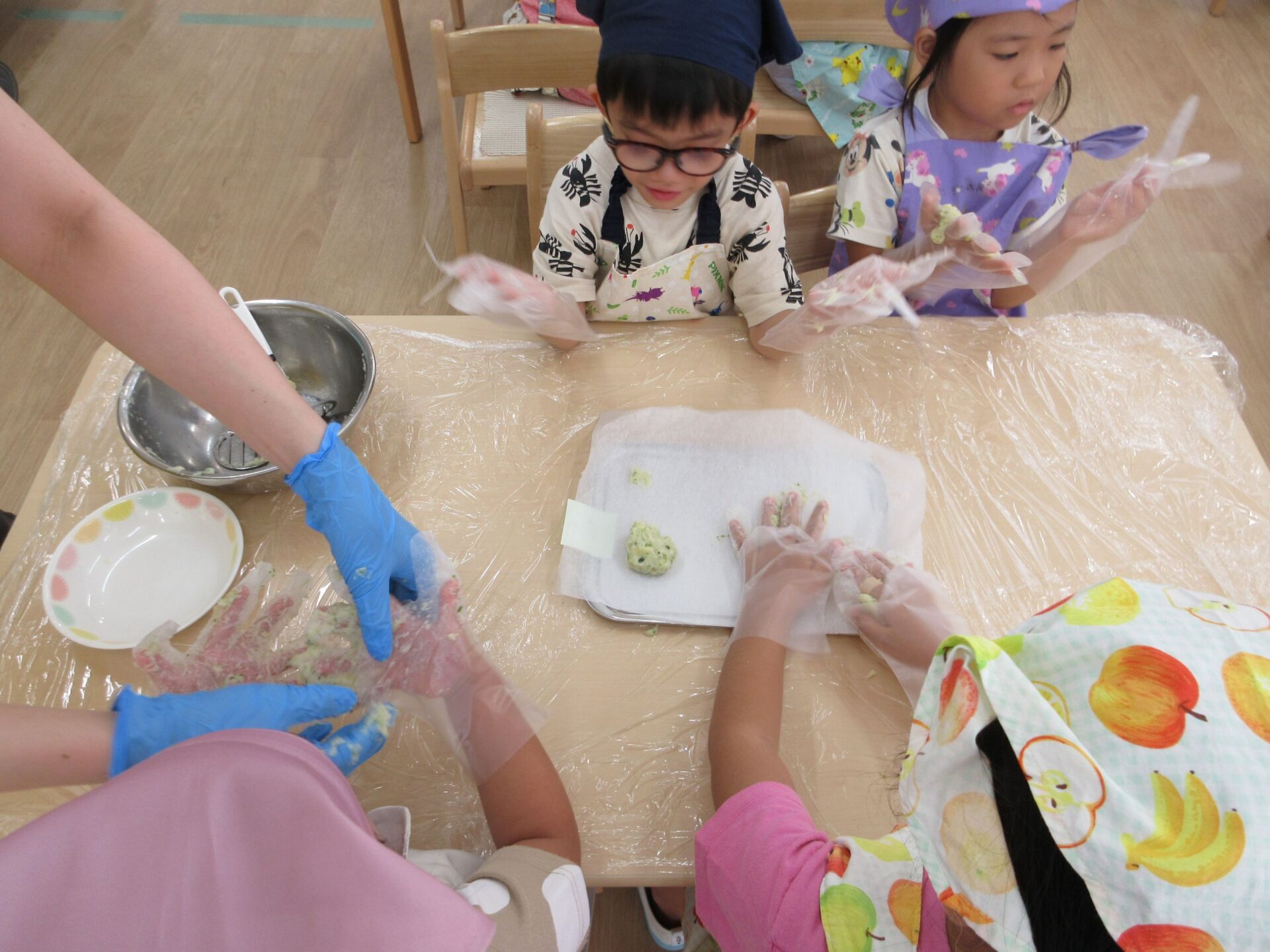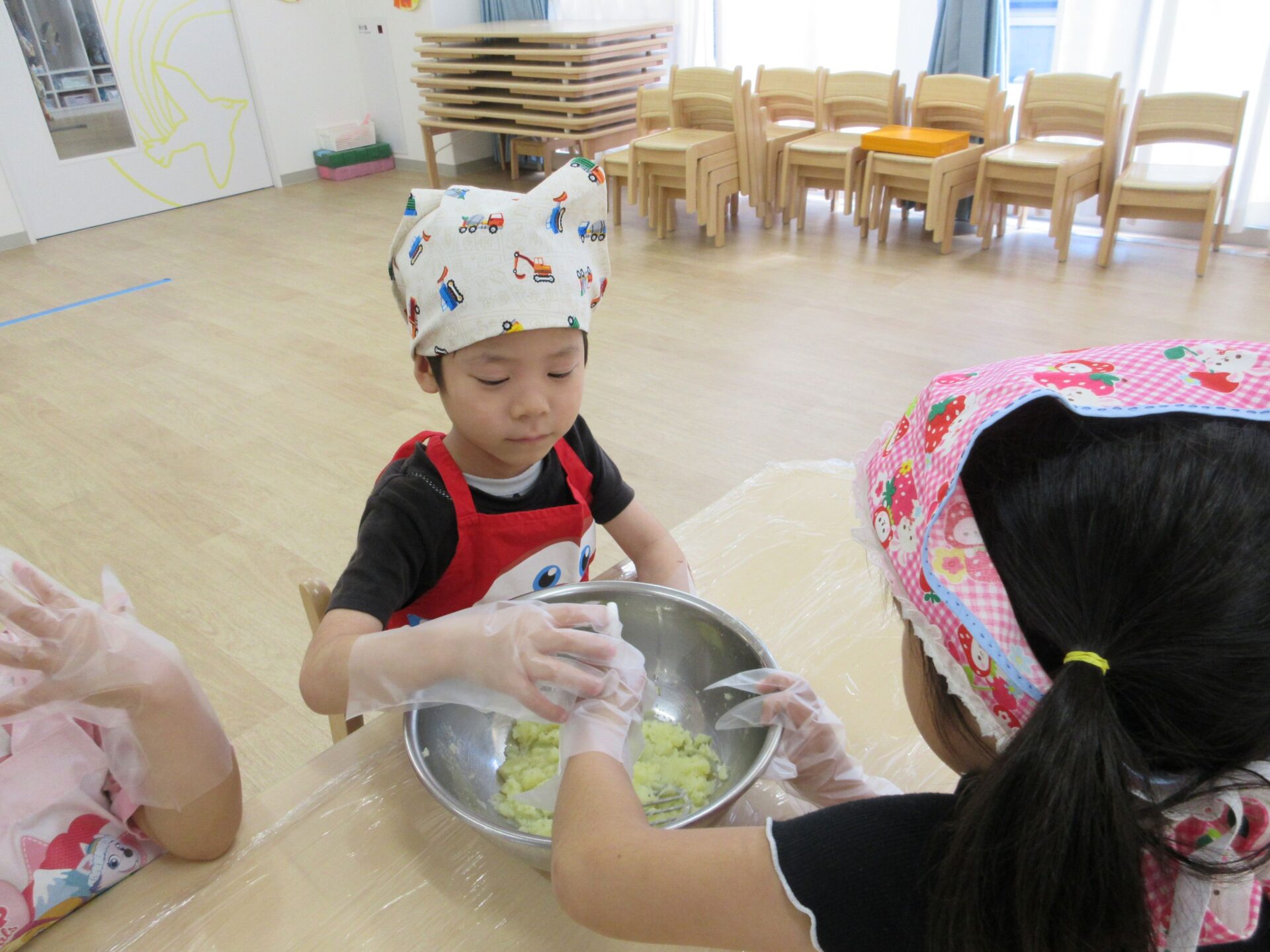 形ができたら、栄養士さんにあずけて、おやつの時間に揚げてもらいます。