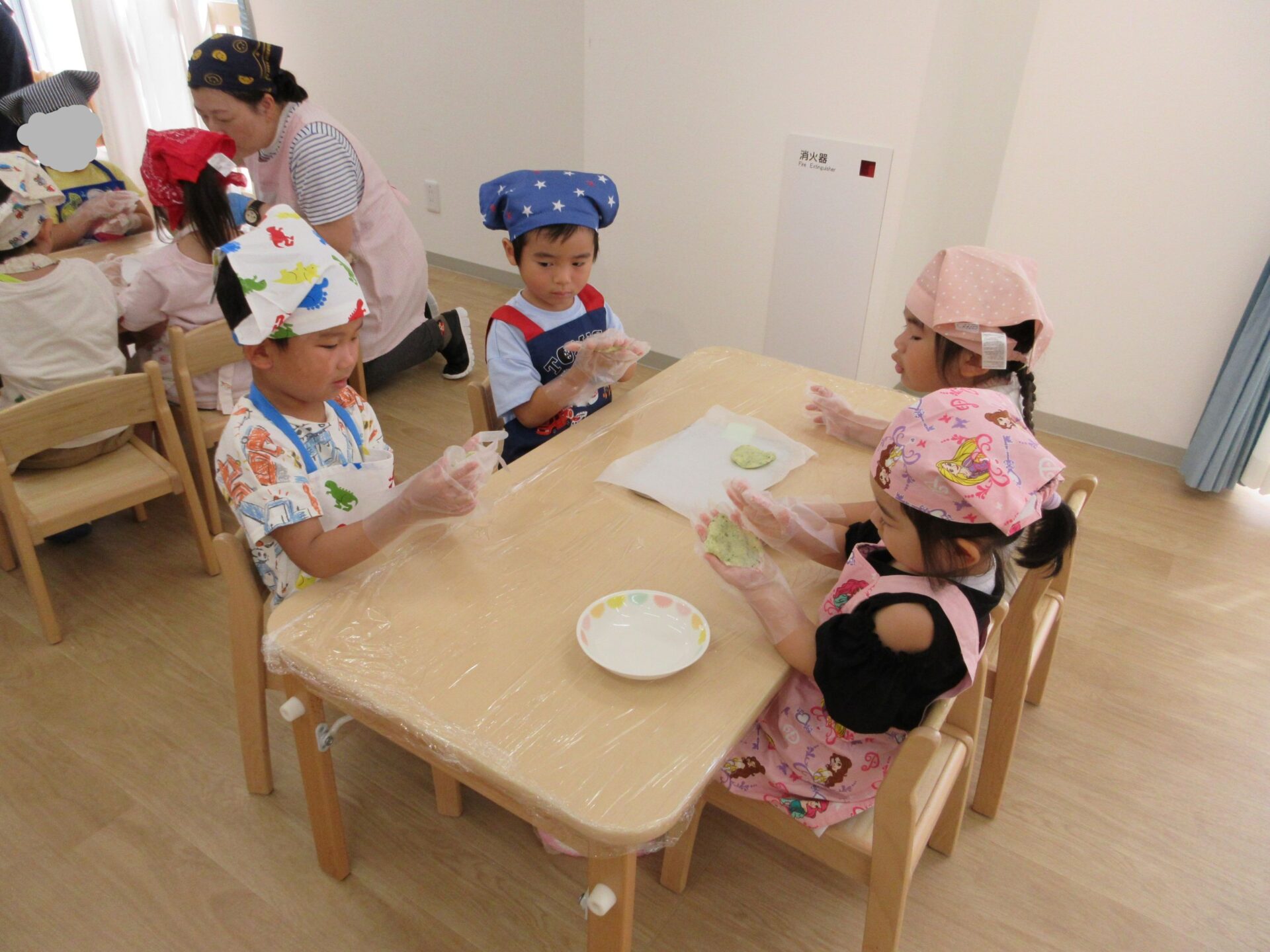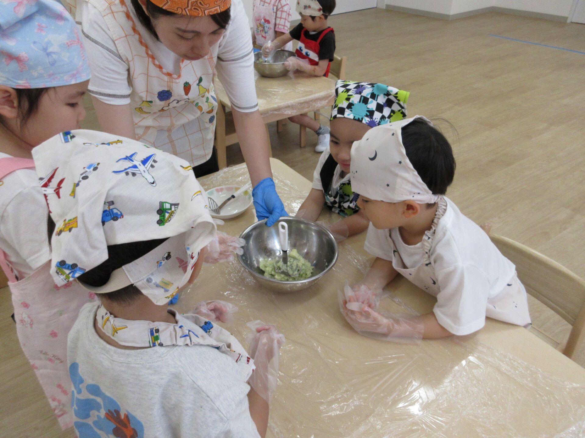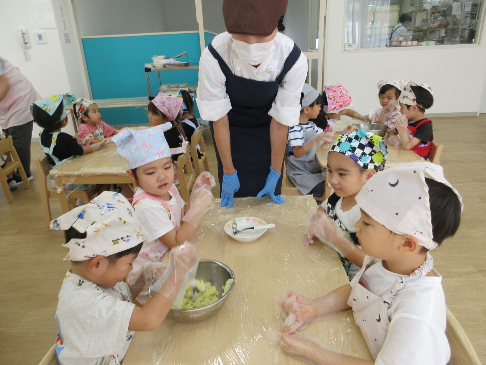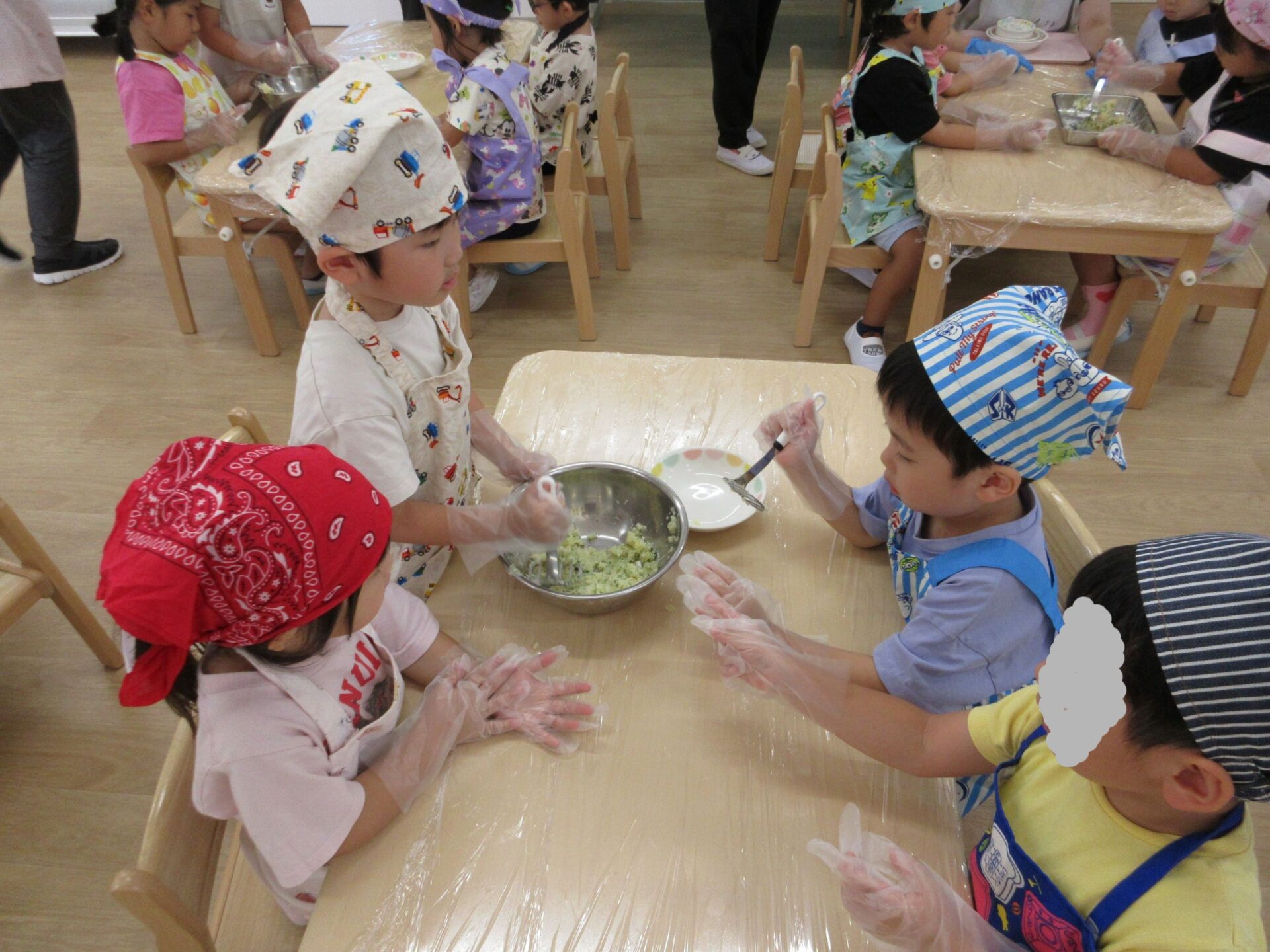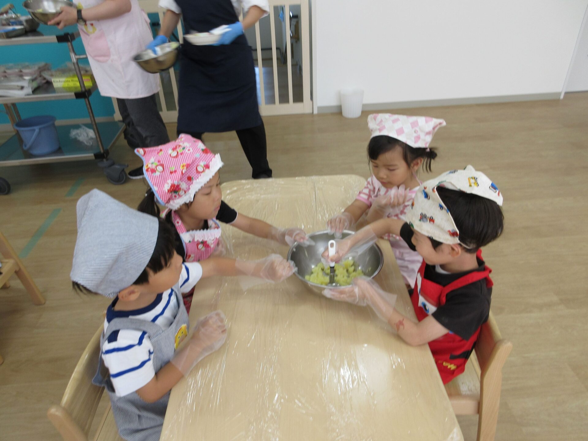 形ができたら、栄養士さんにあずけて、おやつの時間に揚げてもらいます。