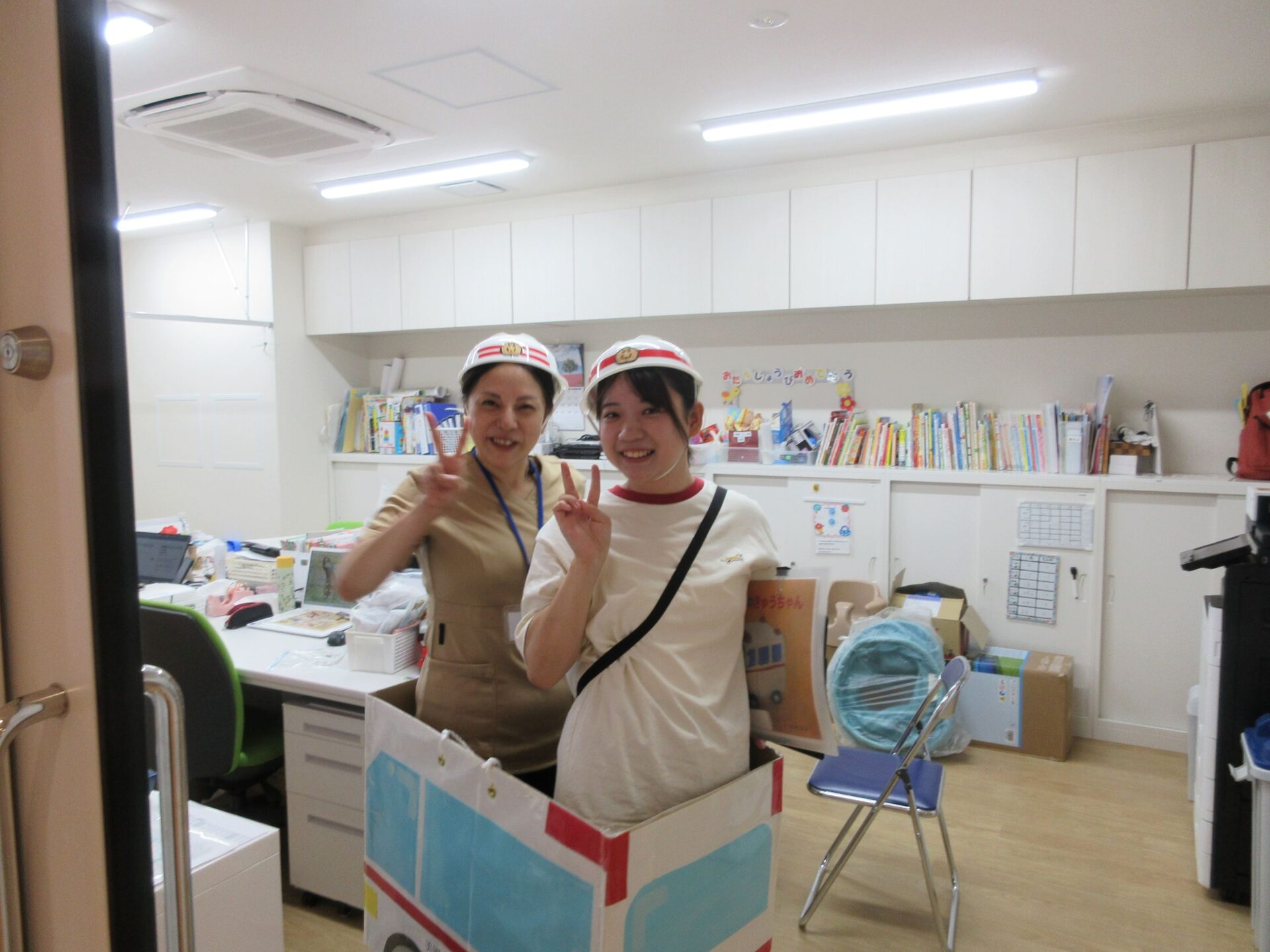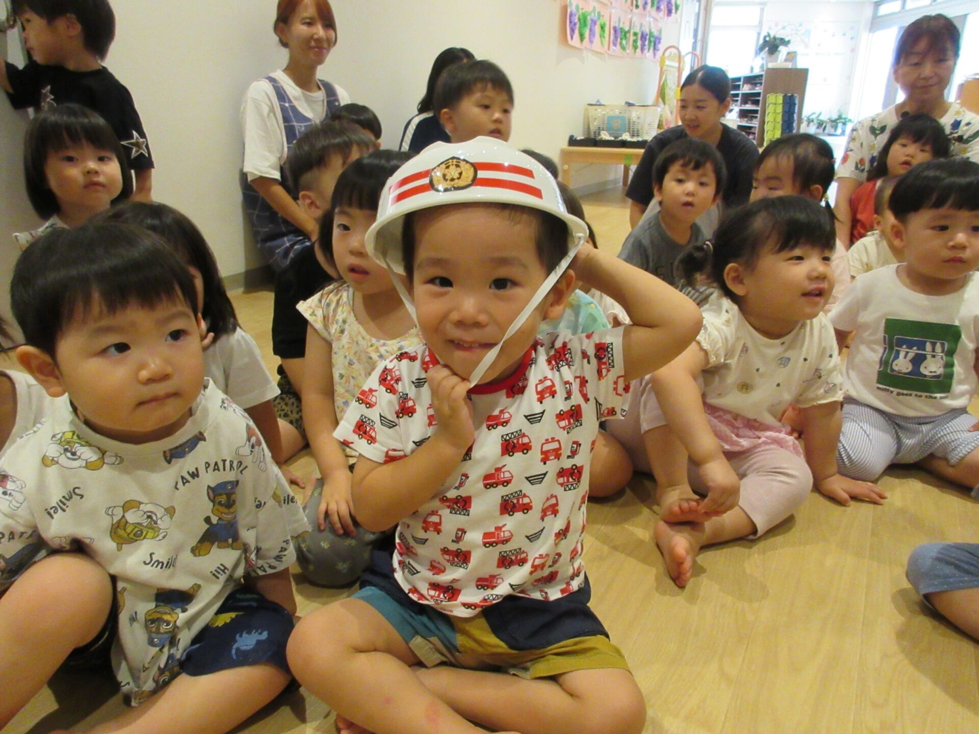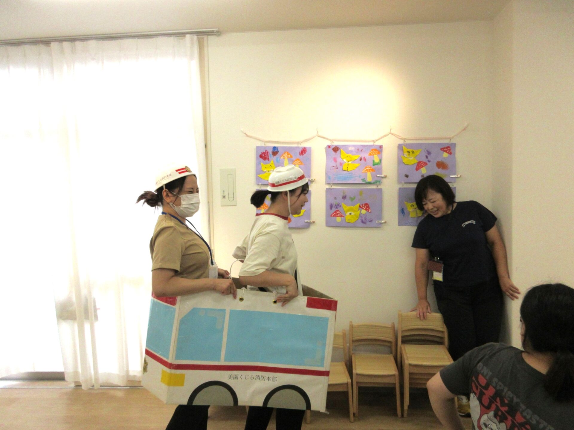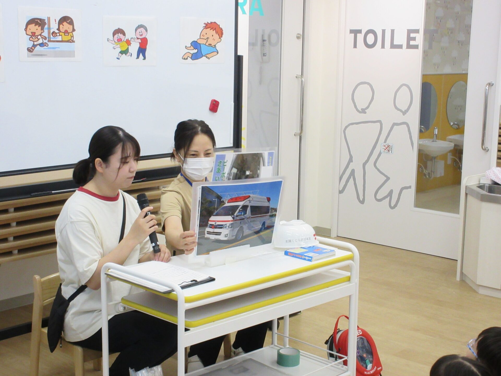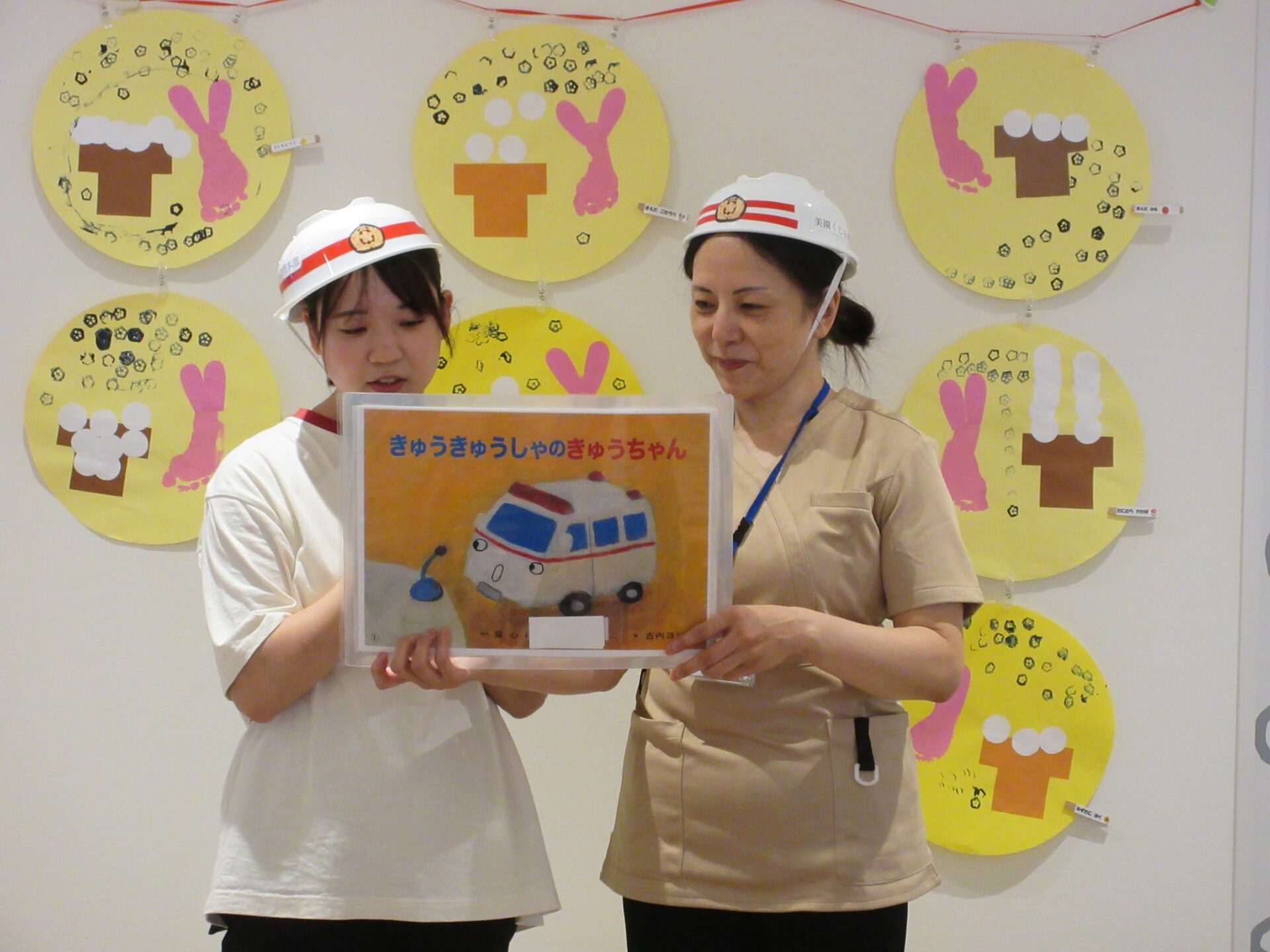 9月9日の救急の日に、看護師2名が企画した救急の日のイベントを行いました。救急隊が救急車で登場!あれっ?ヘルメットが台所にある〇〇みたい・・。
