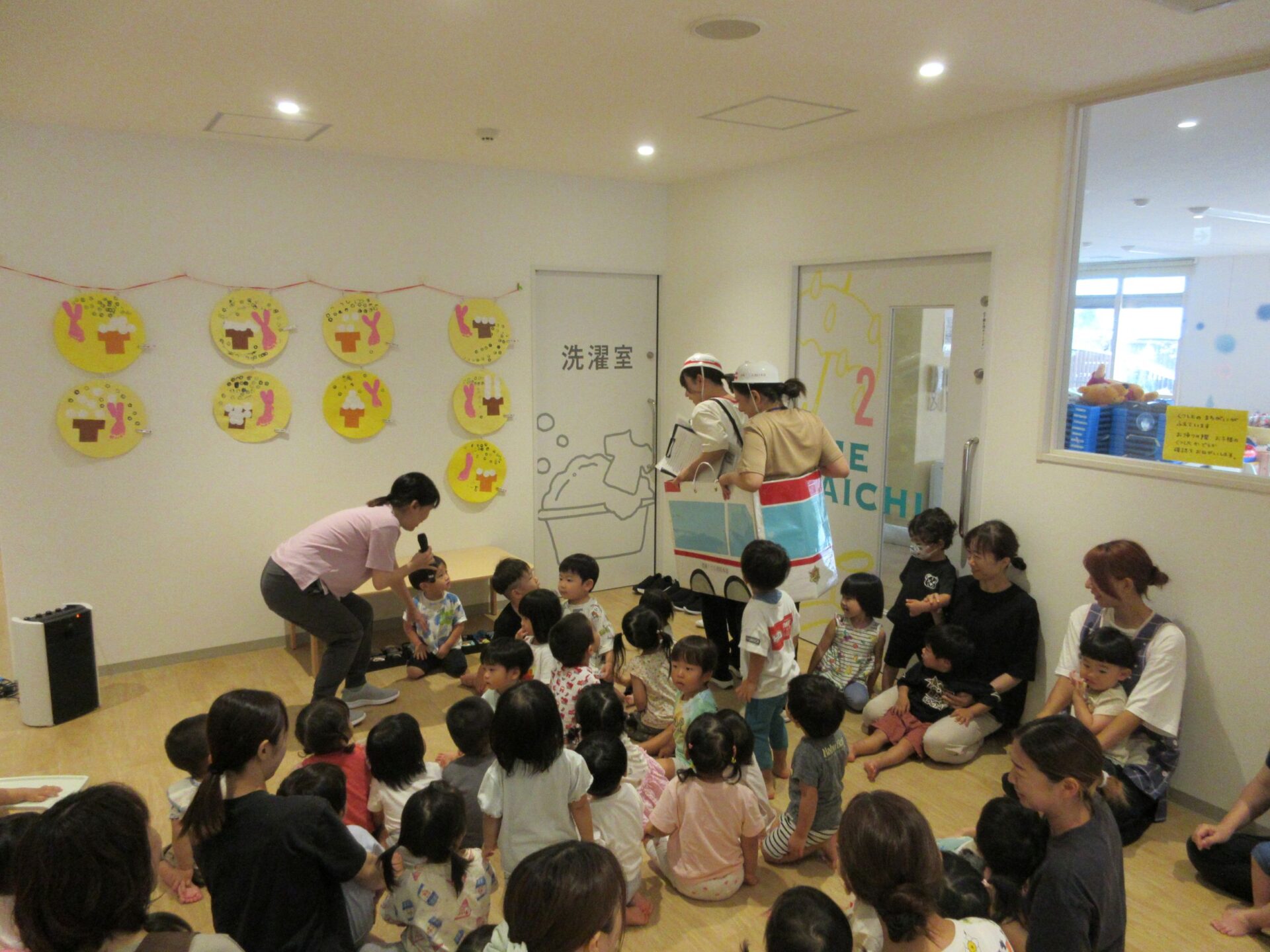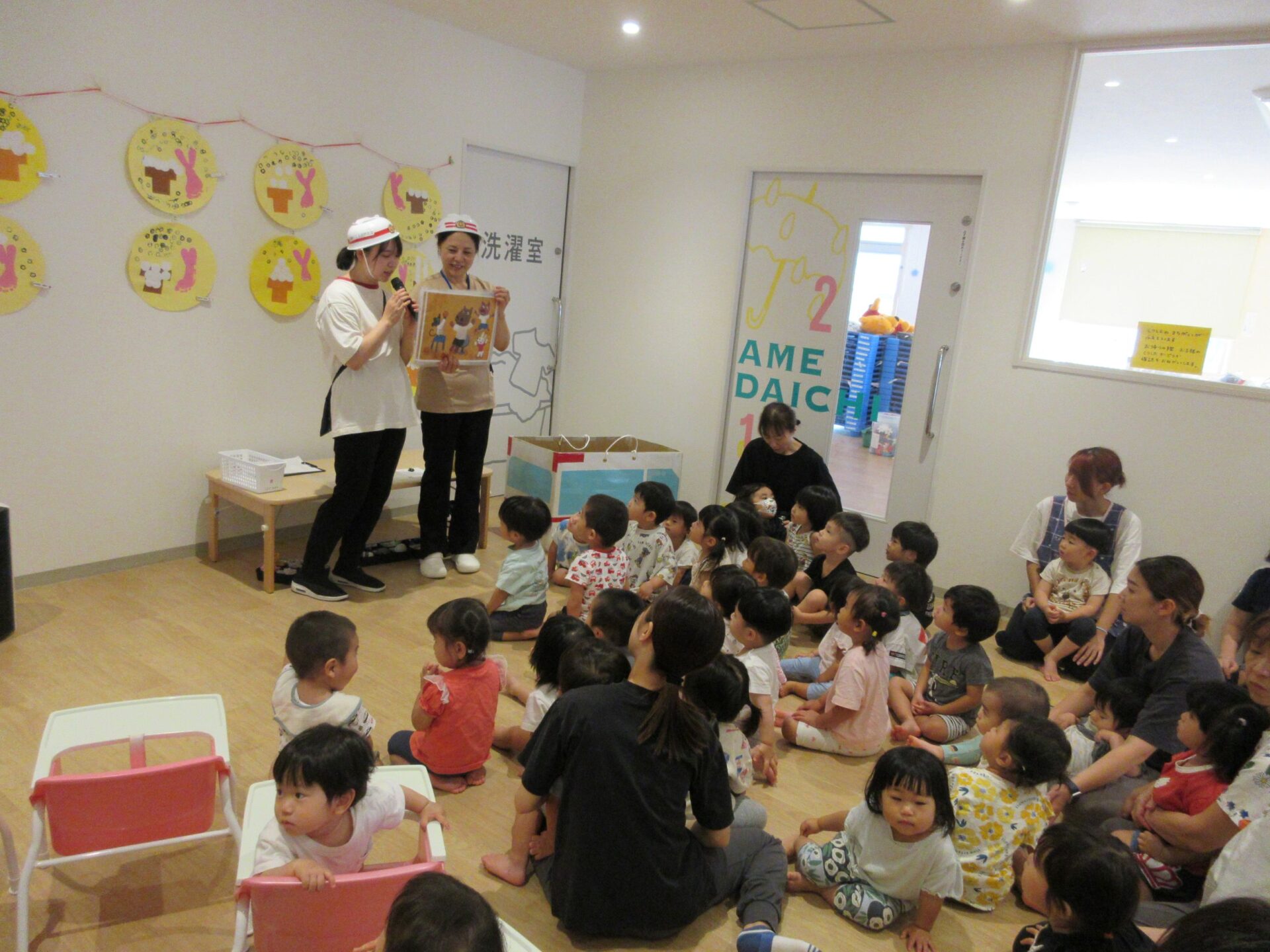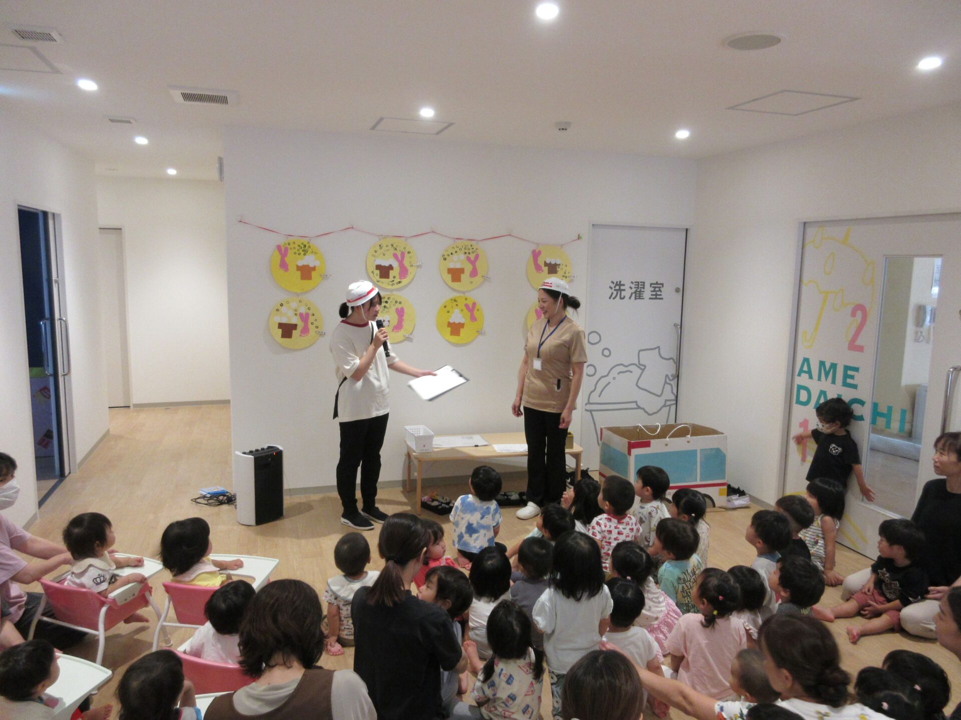 次、1階エントランスで乳児クラスのイベントです。看護師さんがスタンバイ!