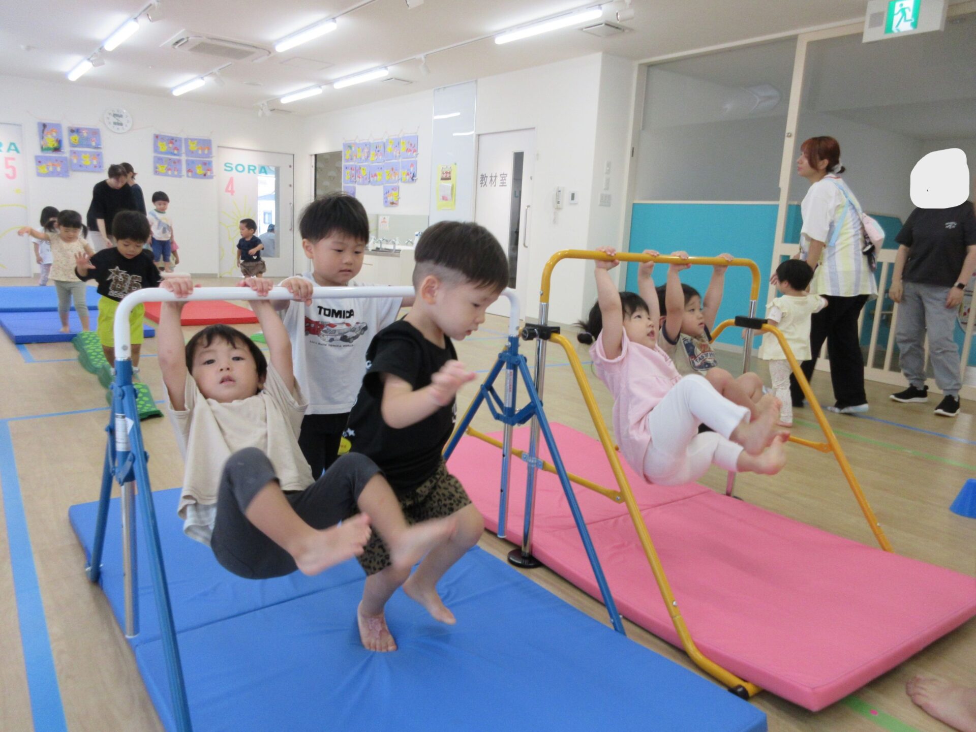 鉄棒にもしっかりぶらさがり、脚をぶらぶらしたり、大きく開いたり。