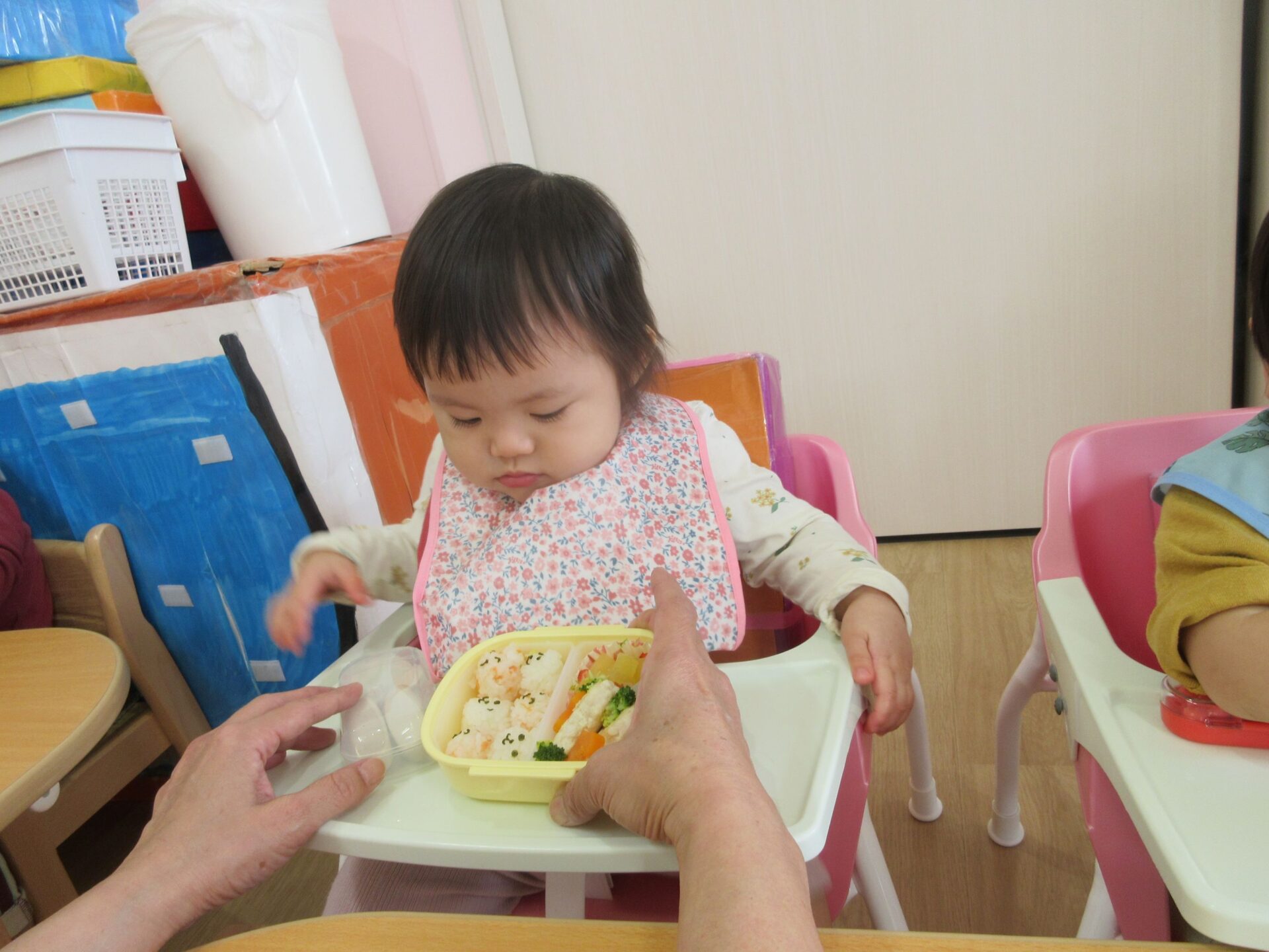 2025.10.27 お知らせ ブログ お弁当おいしかったね(^^♪(0歳 うみ組) お散歩遠足の日(10月21日)、お部屋でお弁当をいただきました! 一緒に眺めている姿がかわいい~(^^♪ は~い!今からいただきま~す♪ じ~っと見つめています(^^♪ じ~~~っ‼ 食べるの楽しみ~っ♪ つまんじゃおうかな~♪ じ~~~っ‼ どれから食べようかな~♪初めてのお散歩遠足、そしてお弁当♪楽しいことがいっぱいでした!みんな喜んで食べていました(^^♪ 一覧へ戻る