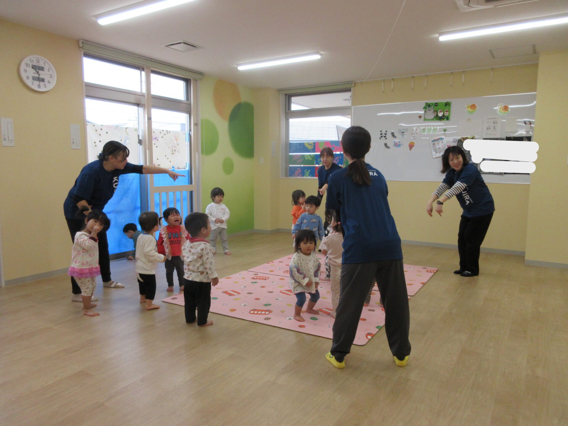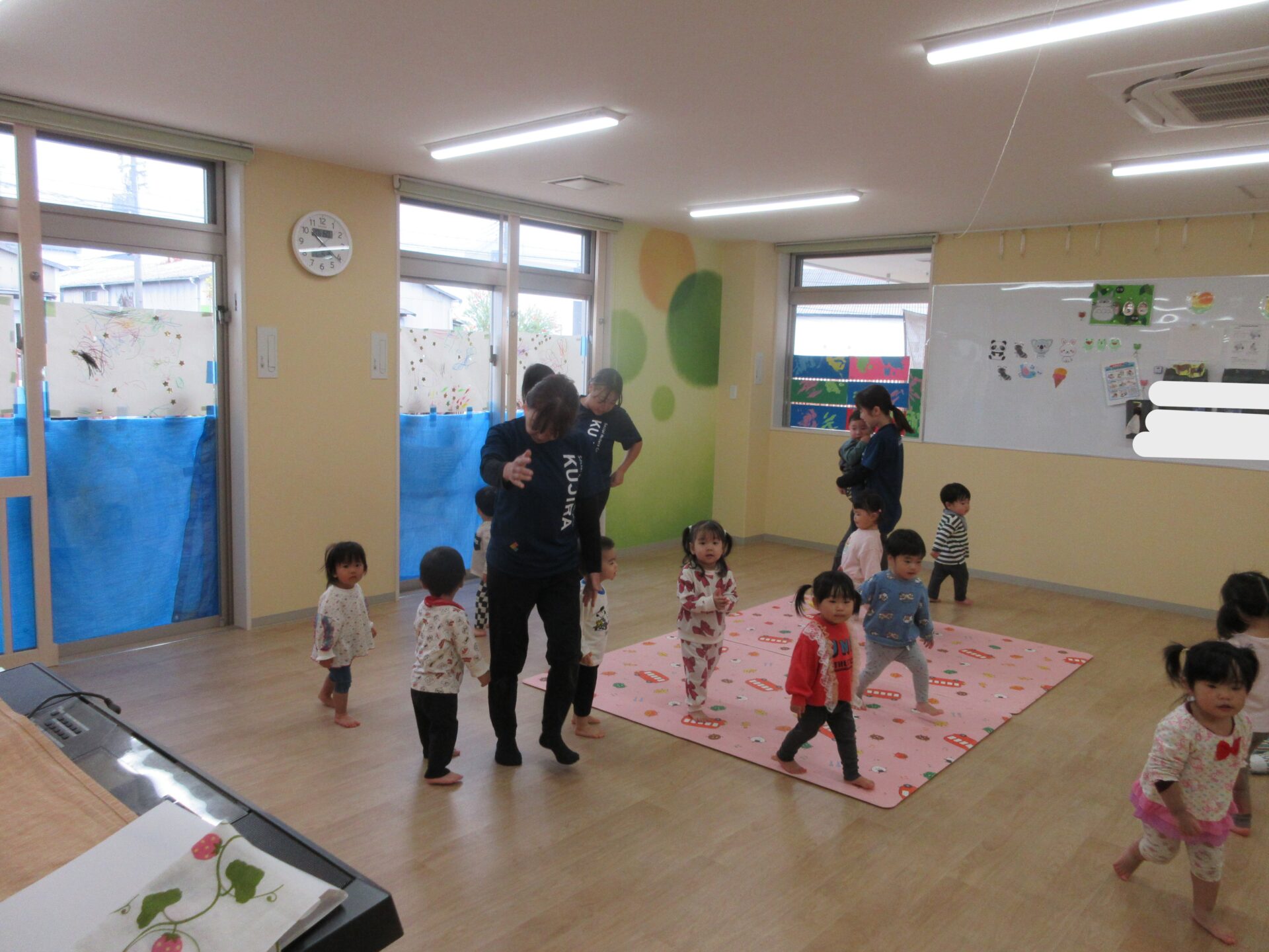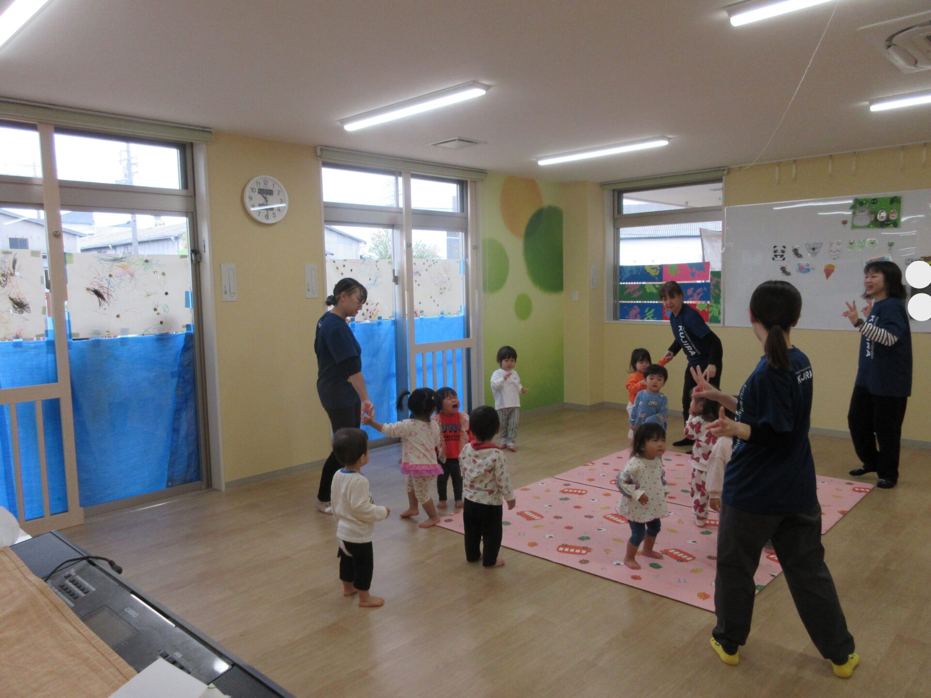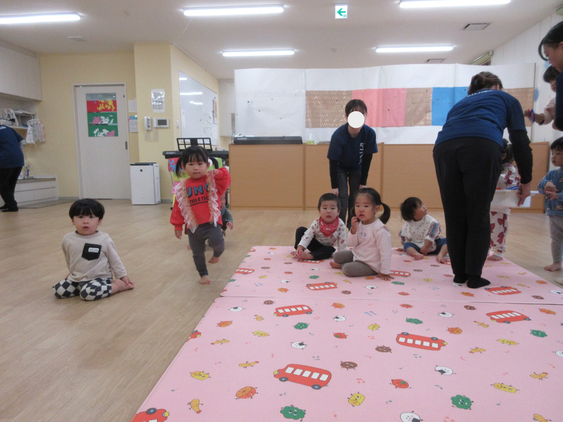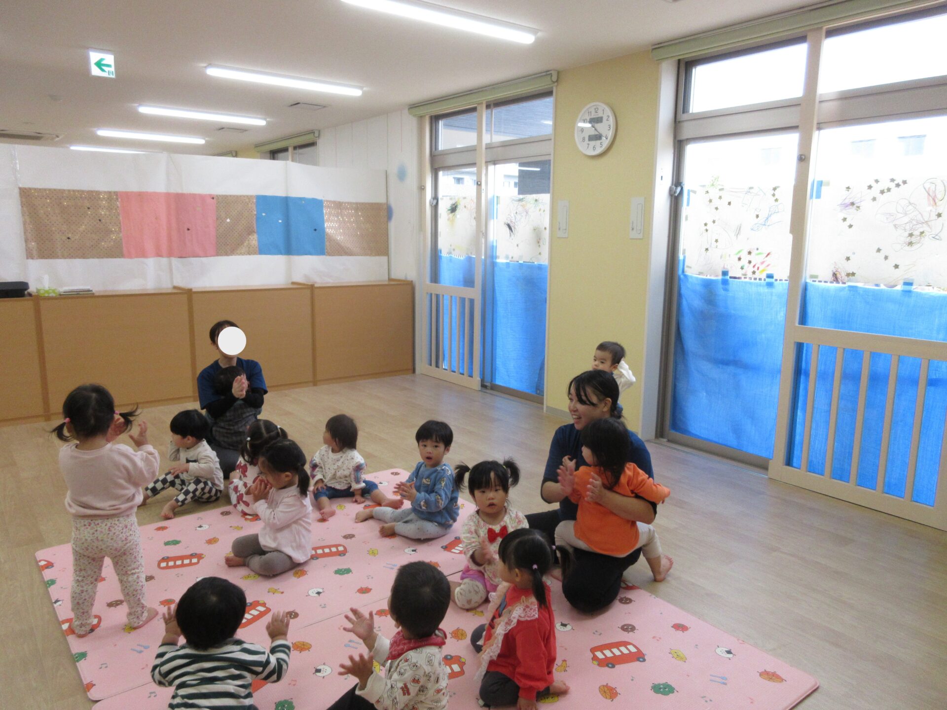 2025.11.17 お知らせ ブログ 保育参観♪ (1歳 だいちぐみ) 11月5日、保育参観がありました!だいちぐみは、お部屋を目隠しして普段の姿を見てもらう参観スタイルにしてみました😊いつもと違う雰囲気に泣きだしてしまう子は担任と一緒に参加しました! 朝の会の様子です。「起きよ~、起きよ~、元気なだいちぐみさ~ん!はーい!」と元気よく朝の会をしていますよ♪ 朝の会の後は体ほぐしをします。ピアノの音に合わせて歩いたり、走ったりと身体を動かすことを楽しんでいます★ エビカニクスの曲に合わせて担任とお友だちと踊りました♪ サーキット遊びの準備の間に絵本を読んだり、手遊びをしています! サーキットの様子が撮れませんでしたが、ウェーブバランスや跳び箱ジャンプ、トンネルでたくさん身体を動かしました!まだまだ順番を理解することが難しいですが、遊びを通して知ってもらえたらと思います😁保護者の皆様、お忙しいなか保育参観にお越しいただきありがとうございました! 一覧へ戻る