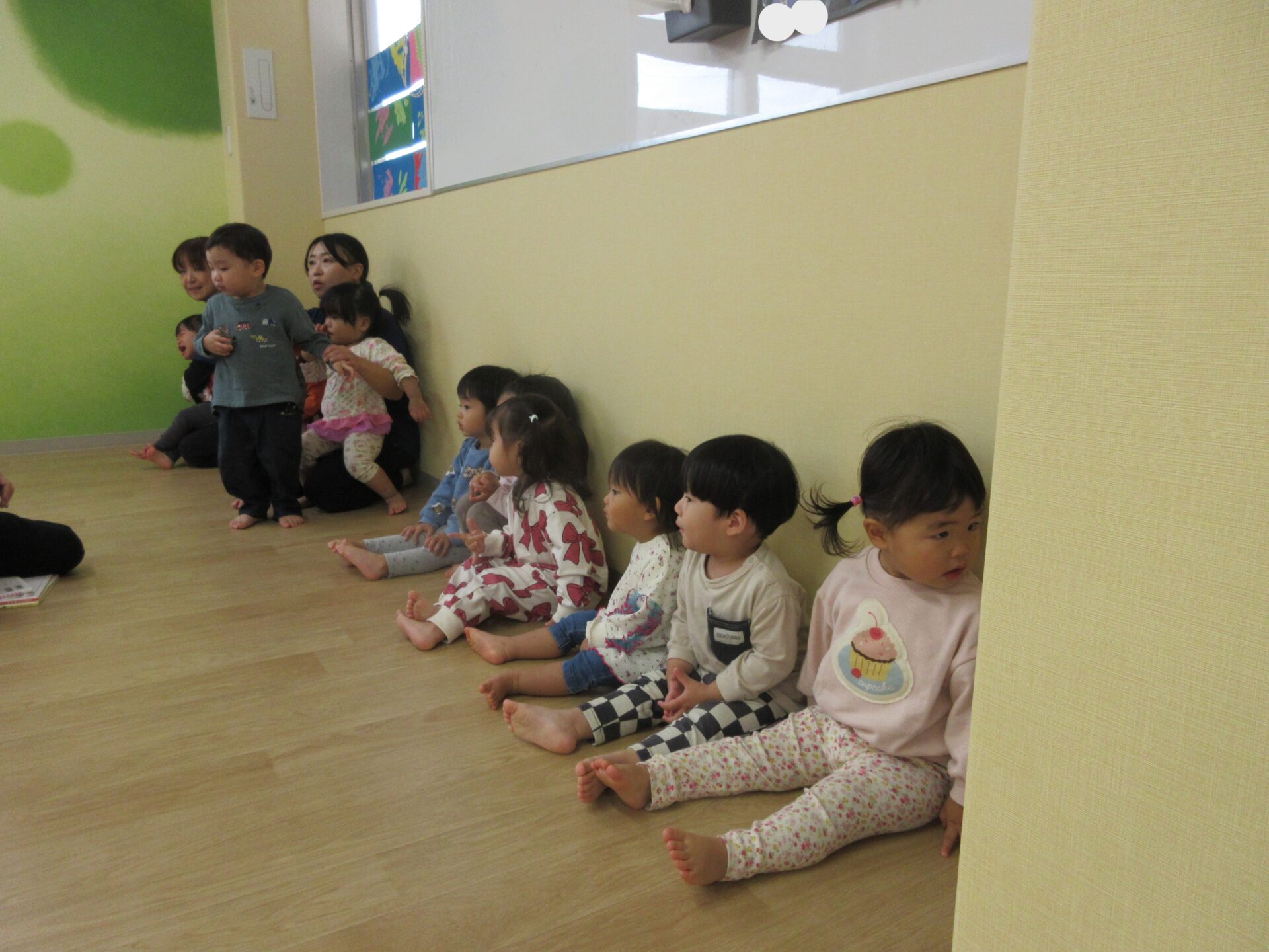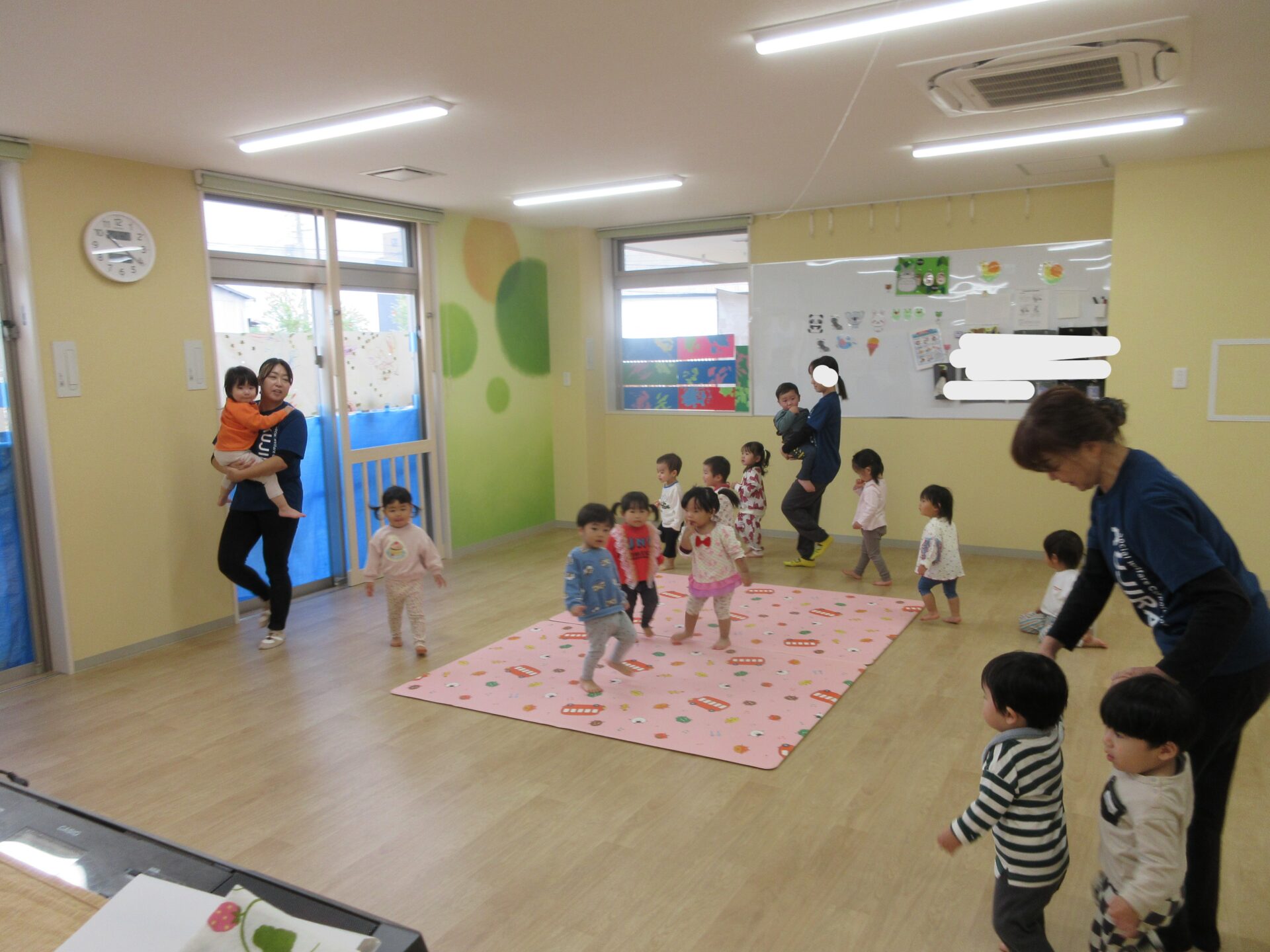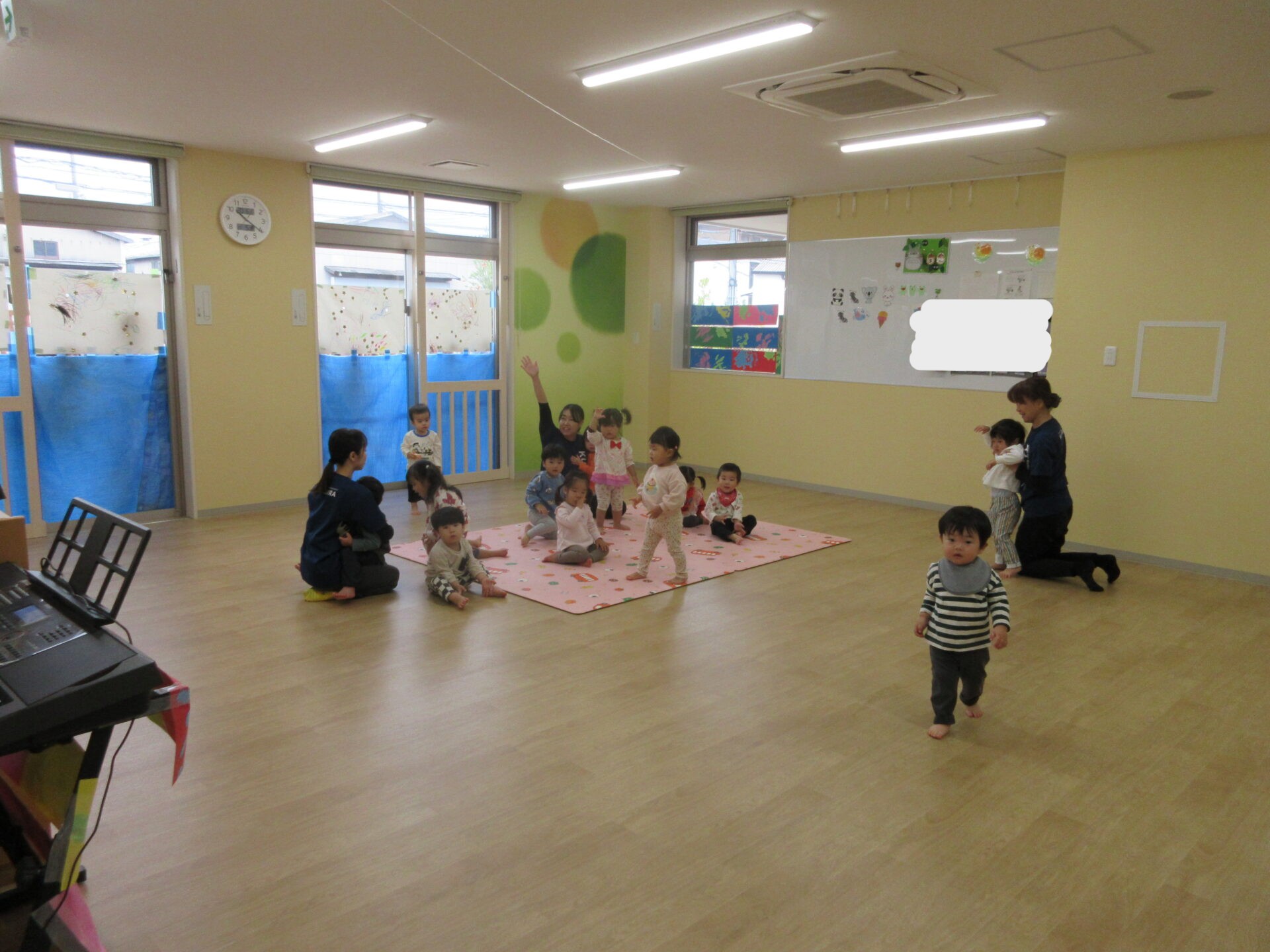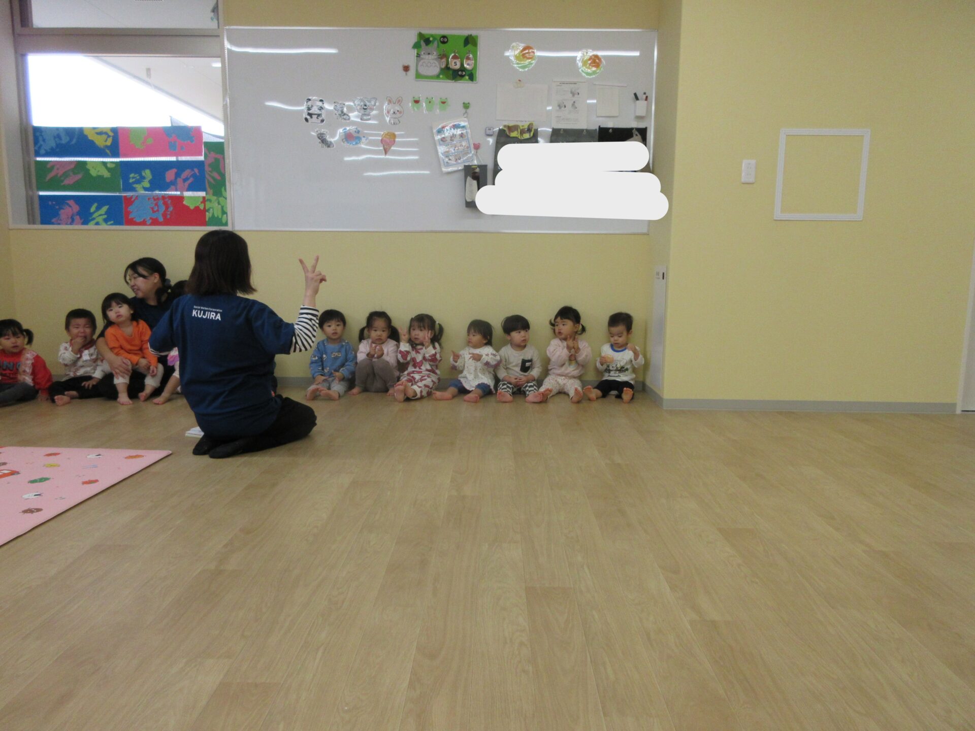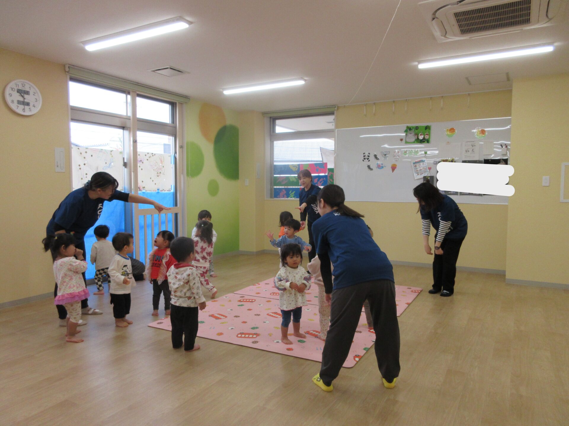 2025.11.17 お知らせ ブログ 保育参観♪ (1歳 だいちぐみ) 11月5日、保育参観がありました!だいちぐみは、お部屋を目隠しして普段の姿を見てもらう参観スタイルにしてみました😊いつもと違う雰囲気に泣きだしてしまう子は担任と一緒に参加しました! 朝の会の様子です。「起きよ~、起きよ~、元気なだいちぐみさ~ん!はーい!」と元気よく朝の会をしていますよ♪ 朝の会の後は体ほぐしをします。ピアノの音に合わせて歩いたり、走ったりと身体を動かすことを楽しんでいます★ エビカニクスの曲に合わせて担任とお友だちと踊りました♪ サーキット遊びの準備の間に絵本を読んだり、手遊びをしています! サーキットの様子が撮れませんでしたが、ウェーブバランスや跳び箱ジャンプ、トンネルでたくさん身体を動かしました!まだまだ順番を理解することが難しいですが、遊びを通して知ってもらえたらと思います😁保護者の皆様、お忙しいなか保育参観にお越しいただきありがとうございました! 一覧へ戻る