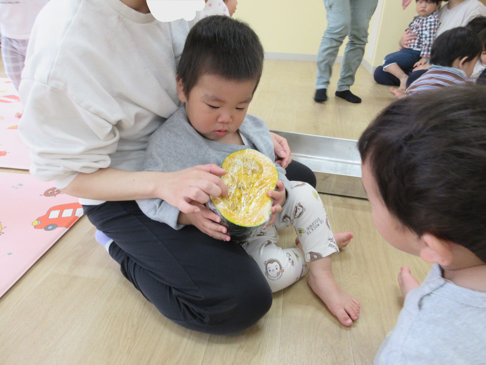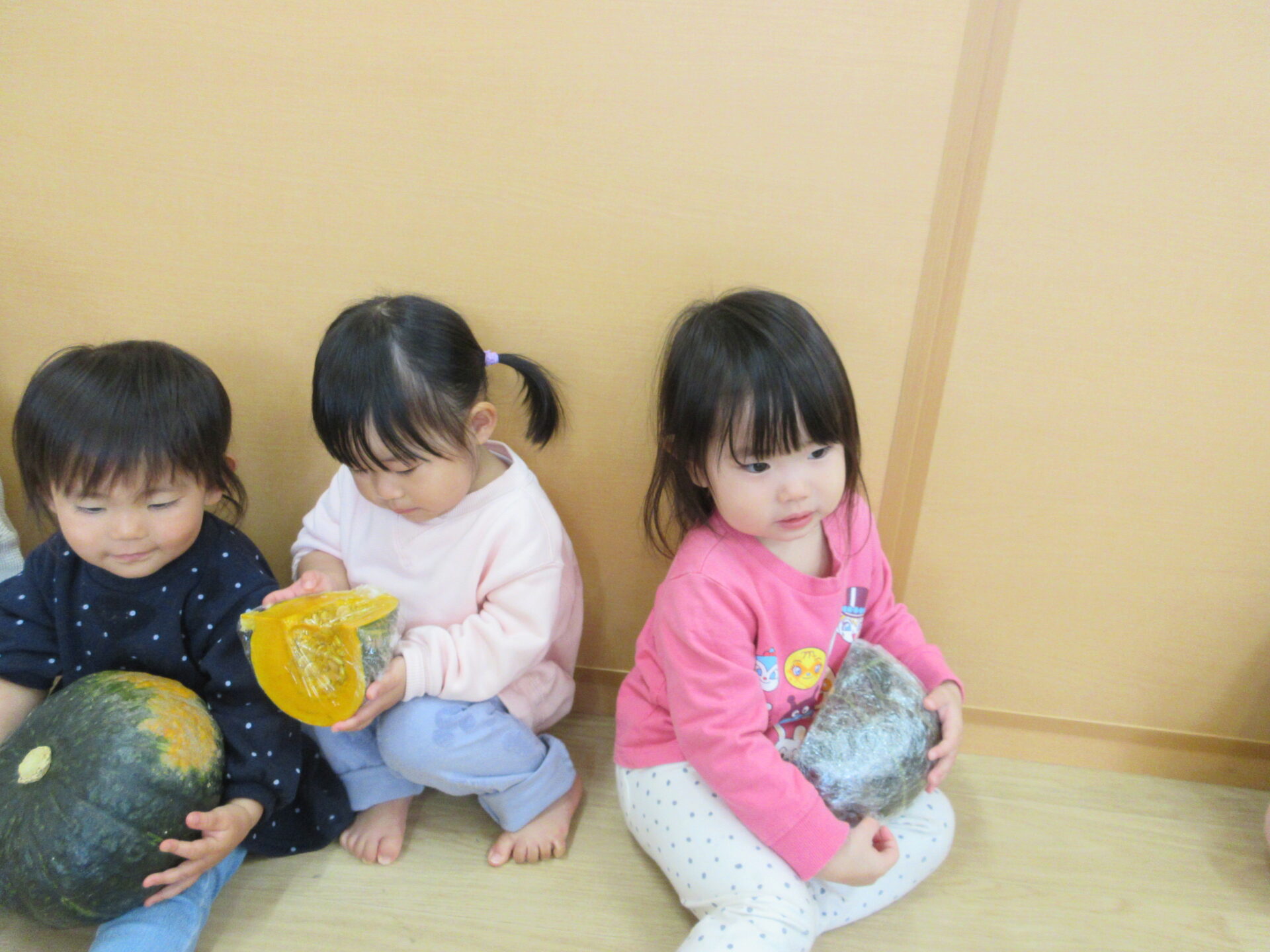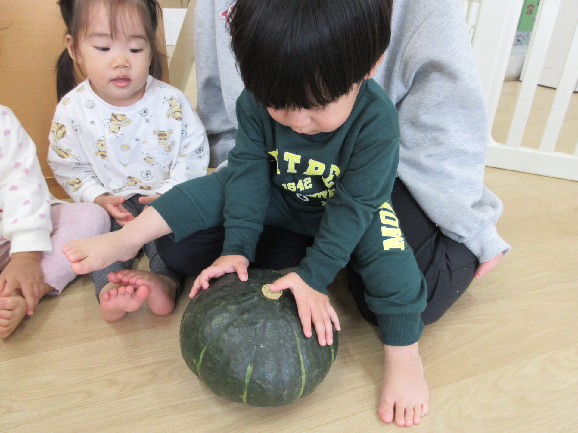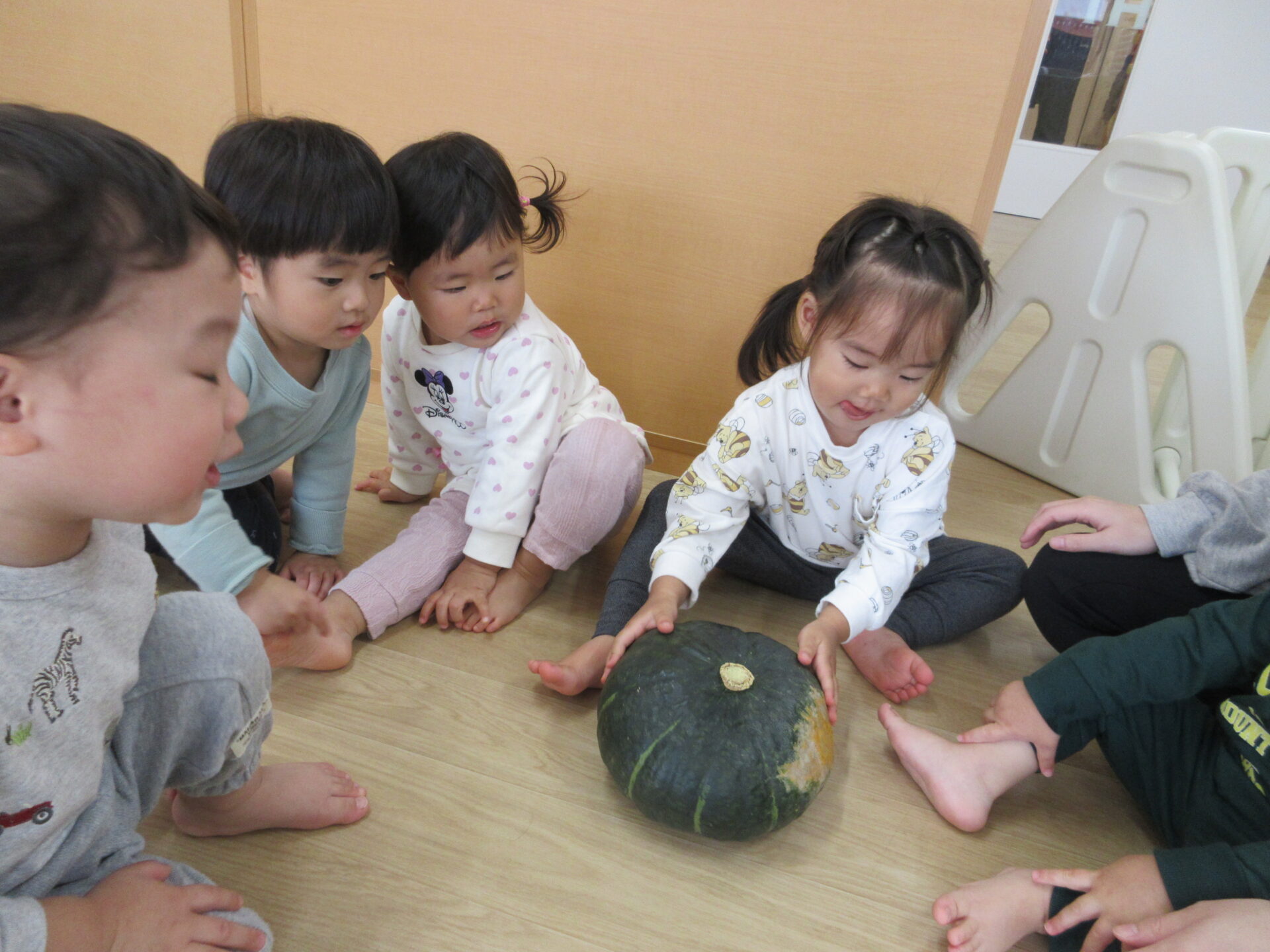 2025.11.17 お知らせ ブログ かぼちゃの感触体験🎃 (1歳 だいちぐみ) 11月6日、かぼちゃの感触体験をしました♪いつも給食のメニューで提供されるときは黄色い姿をしているので、「これは何かな?」と子どもたちに問いかけても、不思議そうにして見ていました😁 大きなかぼちゃを触ってみたり、、、 持ち上げてみたり、、、 いつもの黄色い姿が見えると「かぼちゃだー!」と言って見ている子もいました! 野菜が苦手な子も、野菜の感触体験を通して食べることが好きになってくれたらなと思います☆ 一覧へ戻る