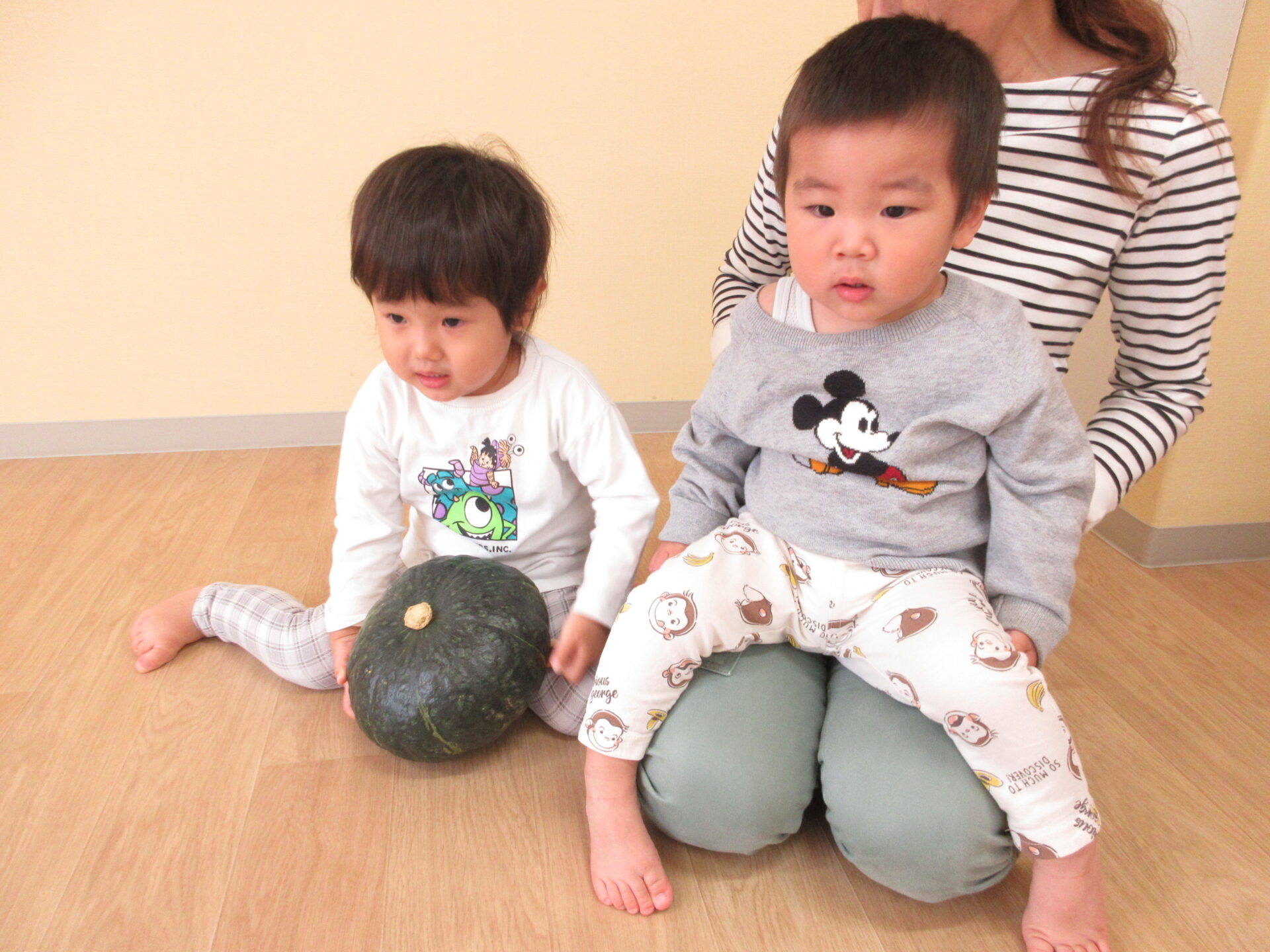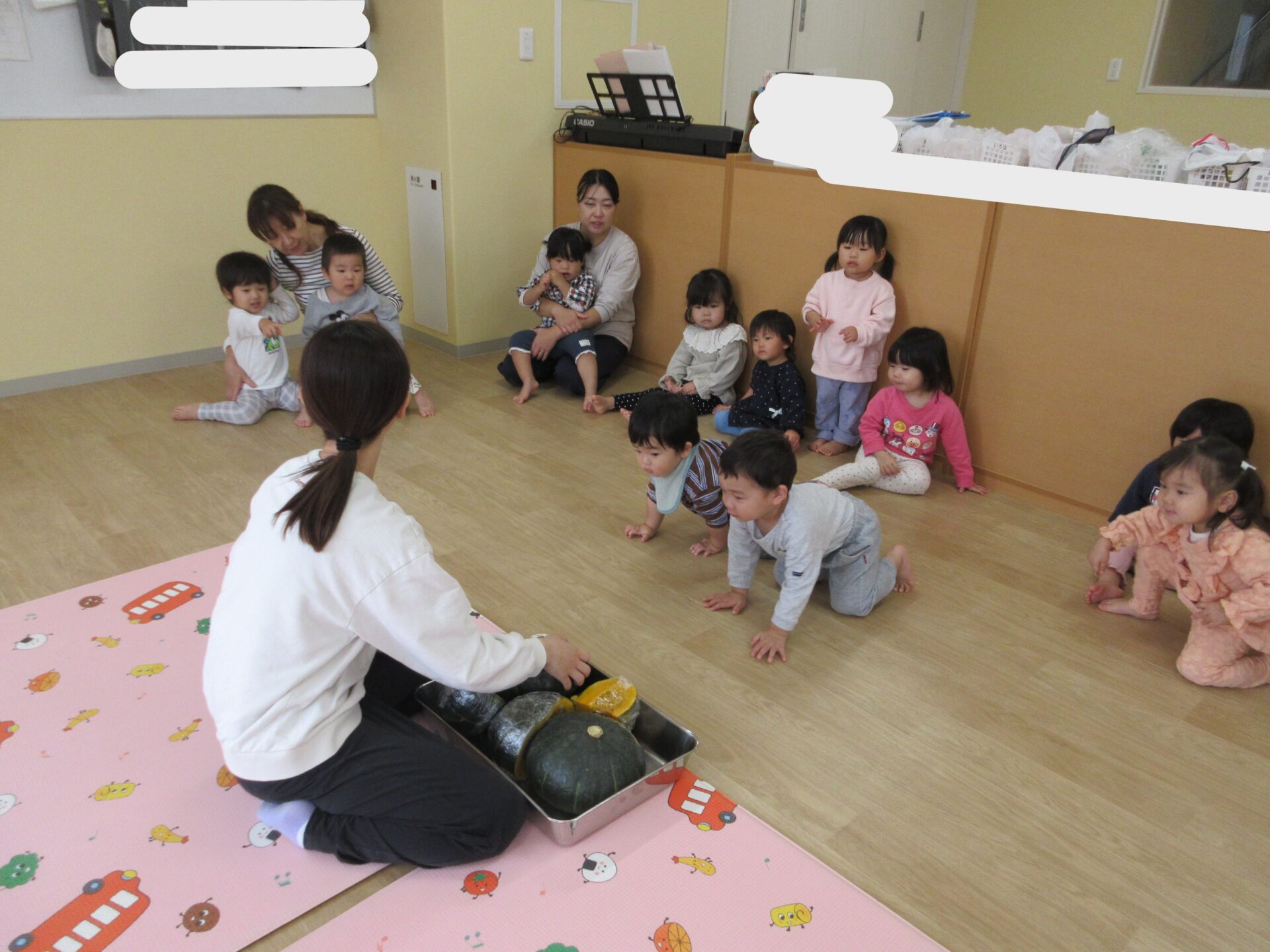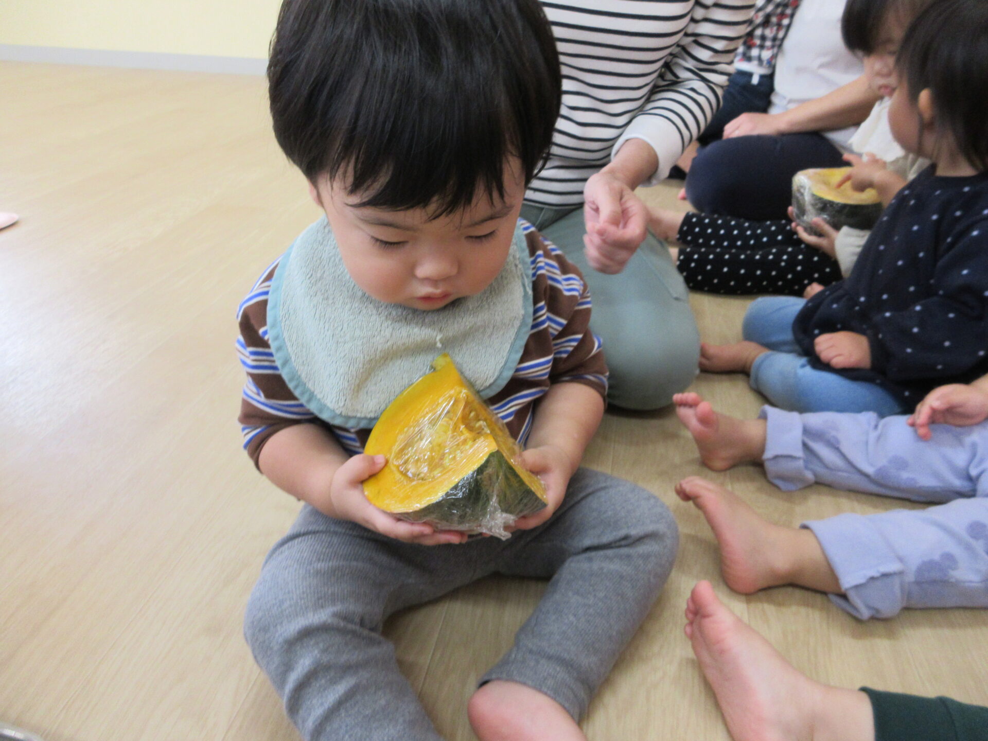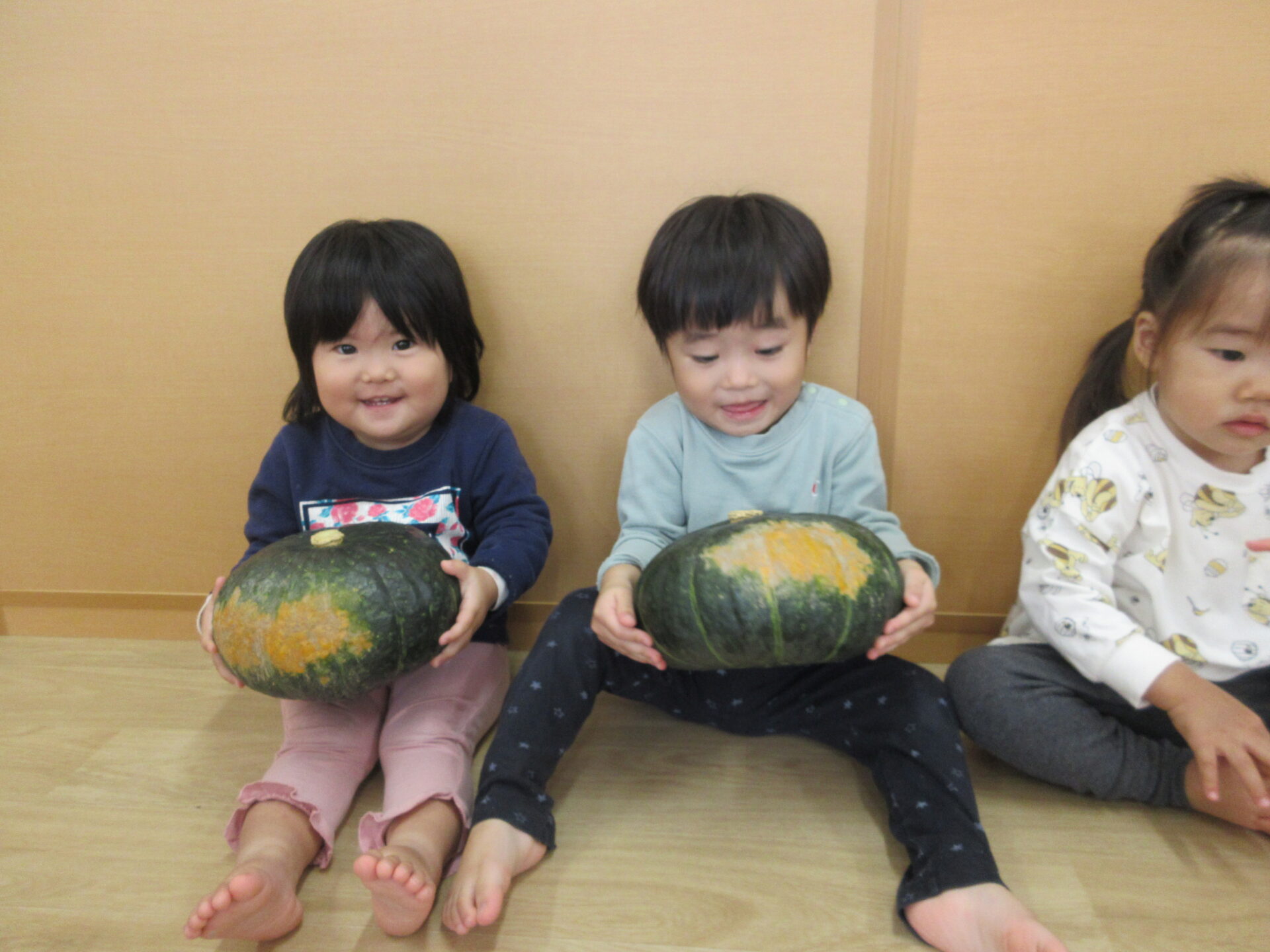 2025.11.17 お知らせ ブログ かぼちゃの感触体験🎃 (1歳 だいちぐみ) 11月6日、かぼちゃの感触体験をしました♪いつも給食のメニューで提供されるときは黄色い姿をしているので、「これは何かな?」と子どもたちに問いかけても、不思議そうにして見ていました😁 大きなかぼちゃを触ってみたり、、、 持ち上げてみたり、、、 いつもの黄色い姿が見えると「かぼちゃだー!」と言って見ている子もいました! 野菜が苦手な子も、野菜の感触体験を通して食べることが好きになってくれたらなと思います☆ 一覧へ戻る